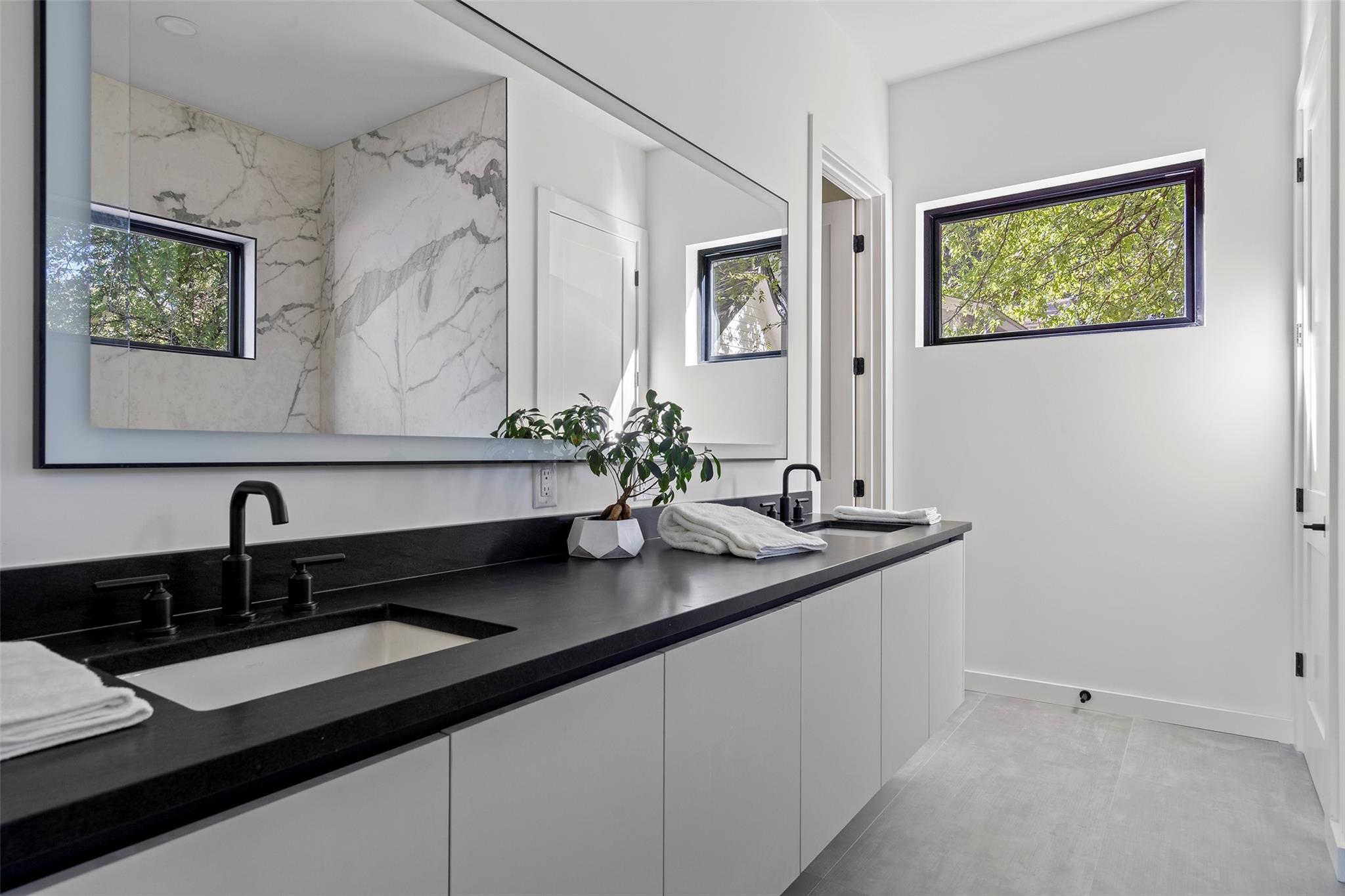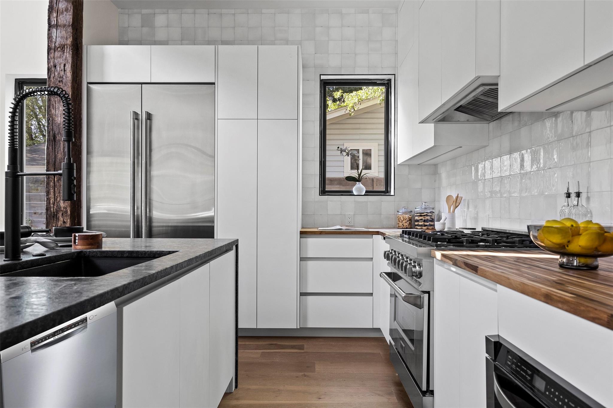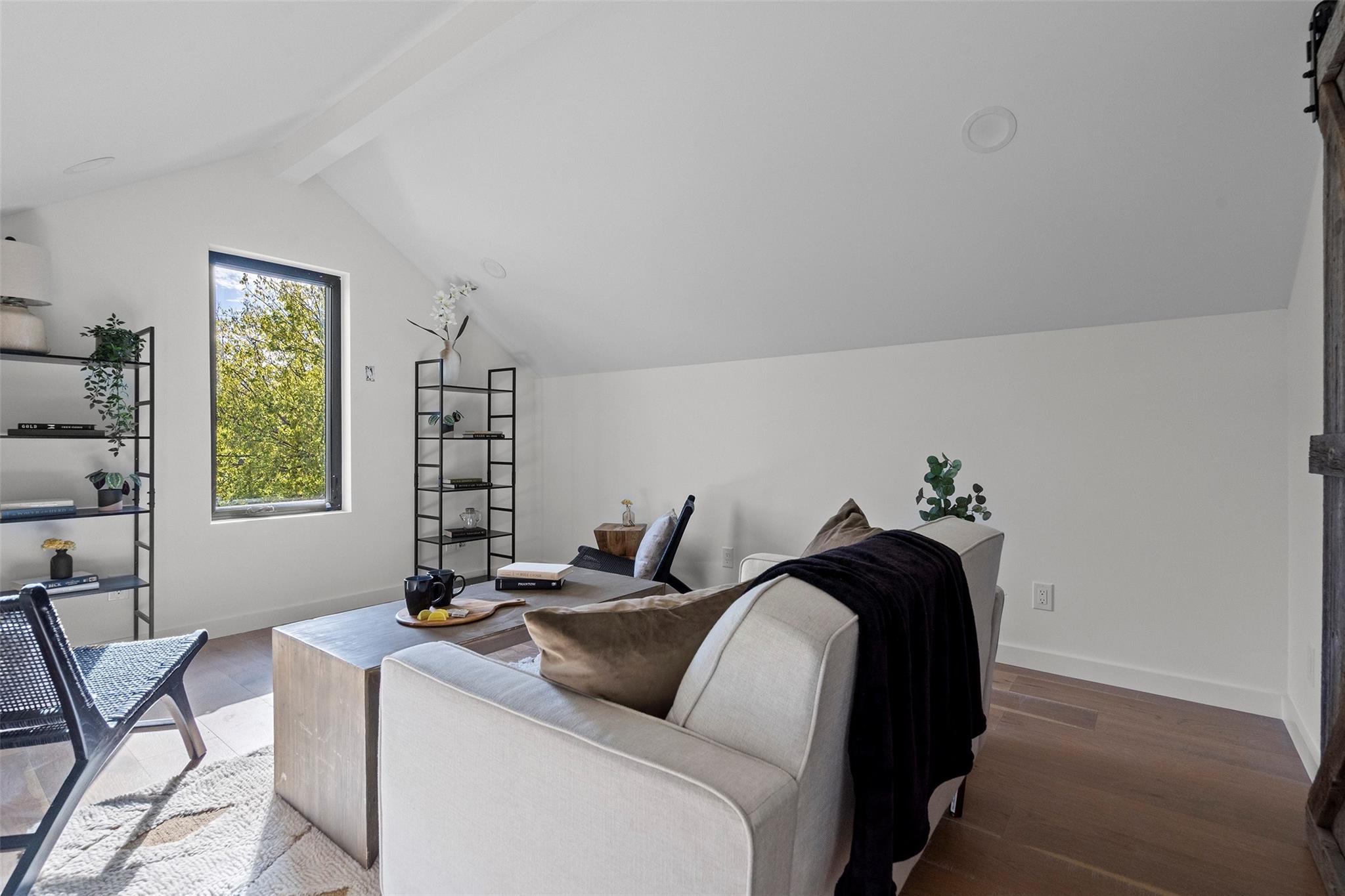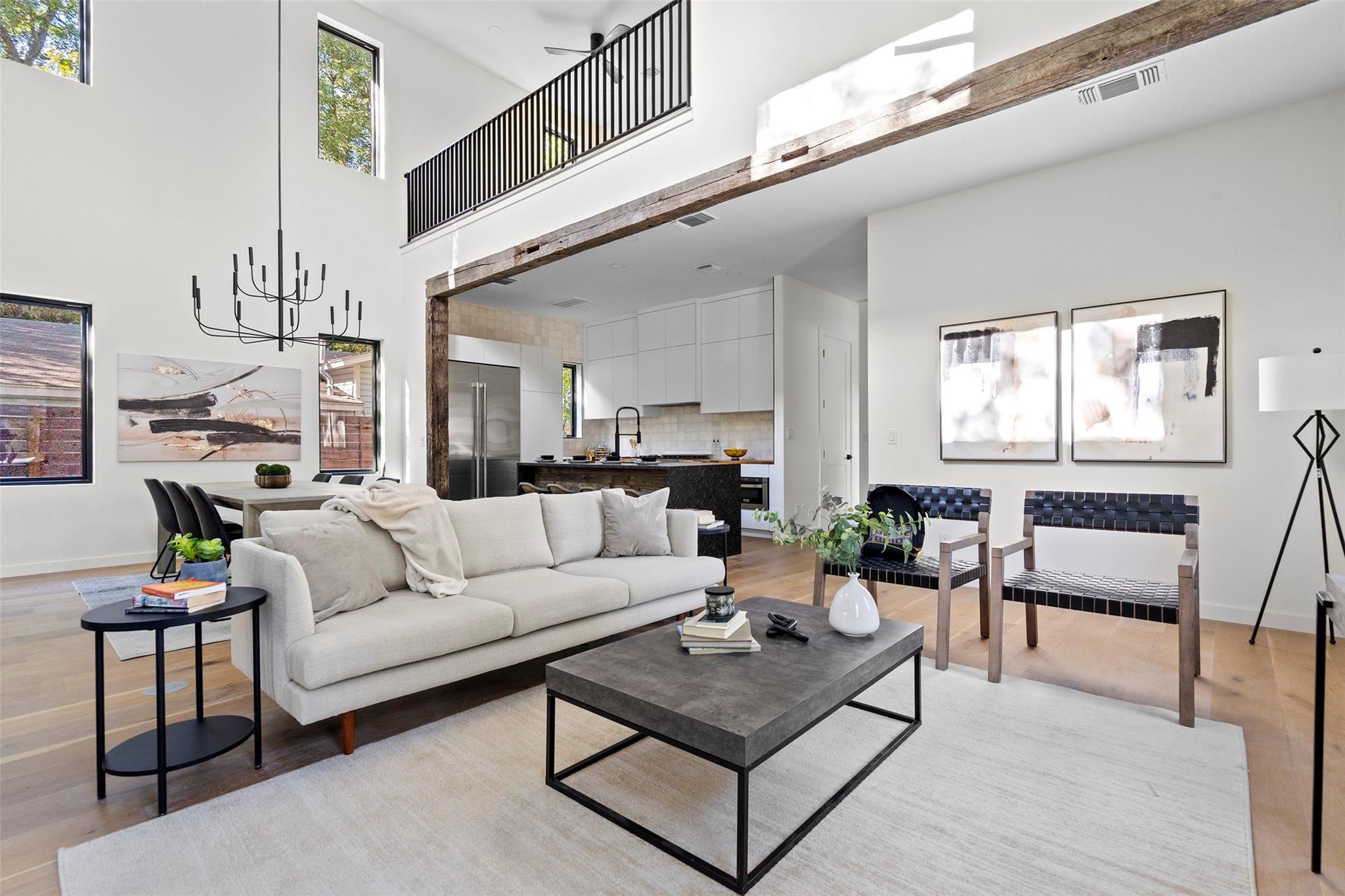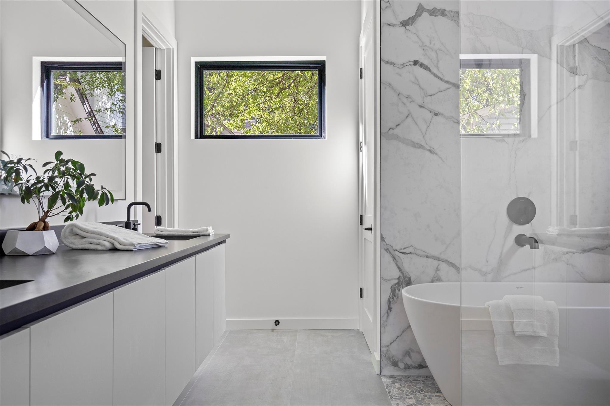 Welcome to the East Austin farm house, and silo! This gorgeous and unique property is situated on just over 1/5 of an acre, and has been designed to create a Texas ranch exterior. The main house is almost 3,100 sq ft and is sided with reclaimed barn wood siding that is believed to be almost a century old. Inside, both the barn and silo are luxury homes with high-end design, finishes and fixtures. The main level in the barn house boasts a primary bedroom with a luxurious spa like marble bathroom. The bathroom has a 9' long floating dual vanity and wet room with an oversized soaking tub. The primary suite is finished with a custom designed closet and convenient in-closet stackable washer and dryer. The remainder of the main level includes a Chef's kitchen, huge screened in porch, living and dining rooms. The kitchen has a stunning JennAir refrigerator, 6-burner stainless gas range, and eat-in island with leathered granite waterfall counter tops. The rest of the kitchen has butcher block counter tops, a cream Zelige tile backsplash and an enormous 25' reclaimed support beam which add to the rustic and modern aesthetic. On the second story, you will find a loft space overlooking the great room and dining area, along with three large bedrooms, each with an en suite bathroom. The third level offers a media room that is pre-wired & a bonus space with full bathroom. Bring your imagination for the bonus space, it could make a great play space, studio, library or more. The silo on the property is the guest house/casita, and is an awesome space which spans almost 700 square feet. Current design has the space utilized as a home gym with a galley kitchen, and the upstairs as a large home office. It is versatile extra space that can work around your life, and can also easily be redesigned as a fully functioning standalone apartment or AirBnb. Come embrace the vibrant East Austin lifestyle in this thoughtfully designed slice of country, in the city.