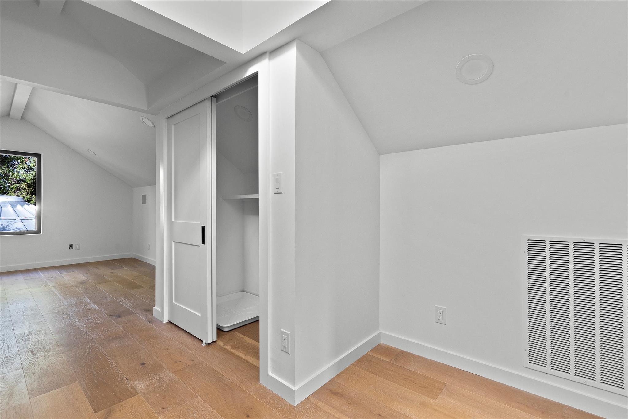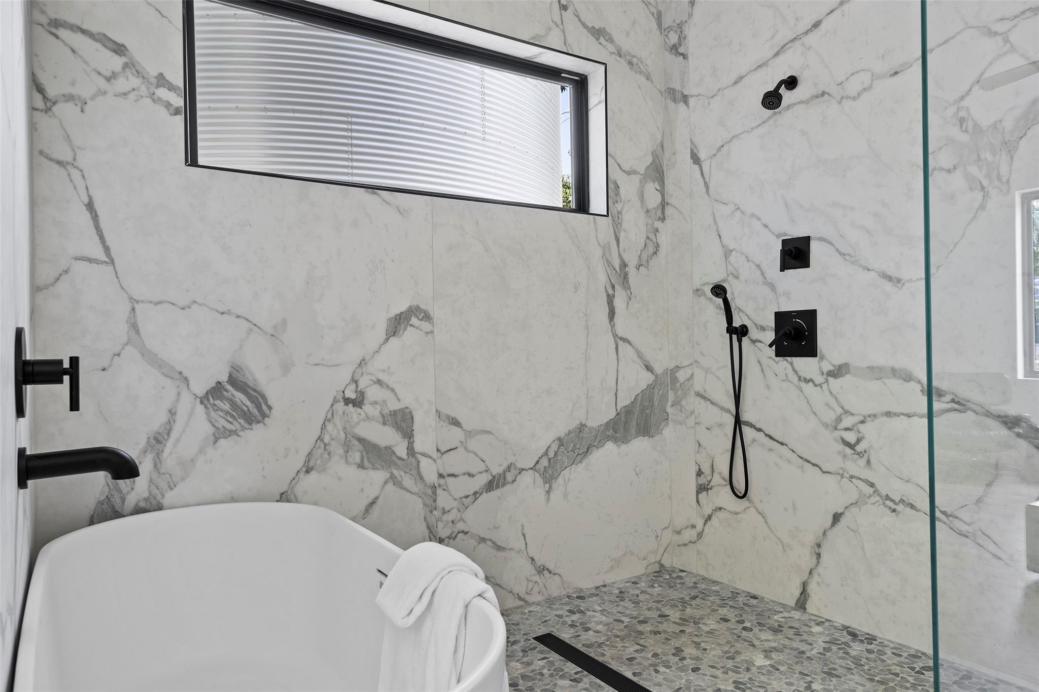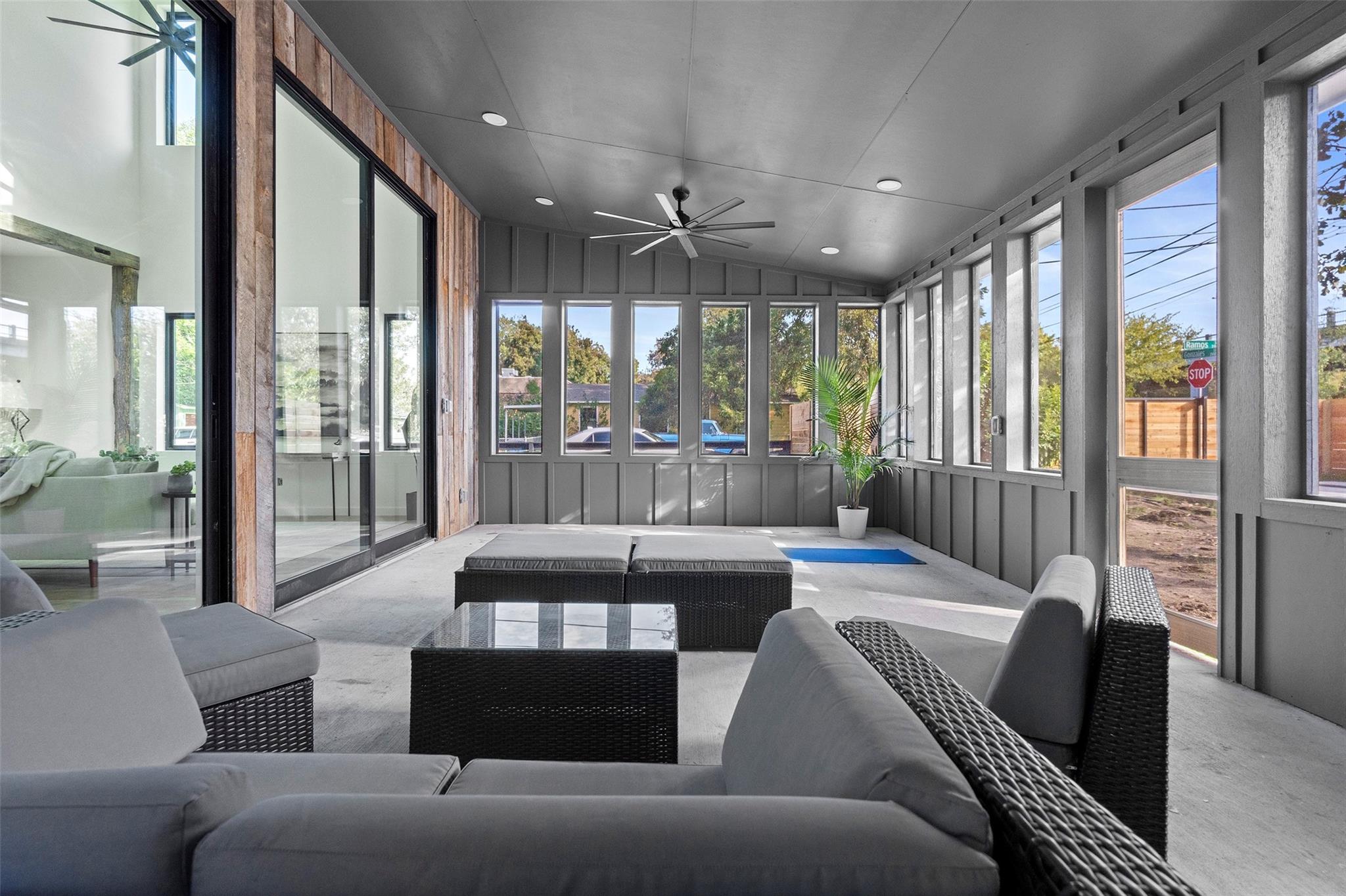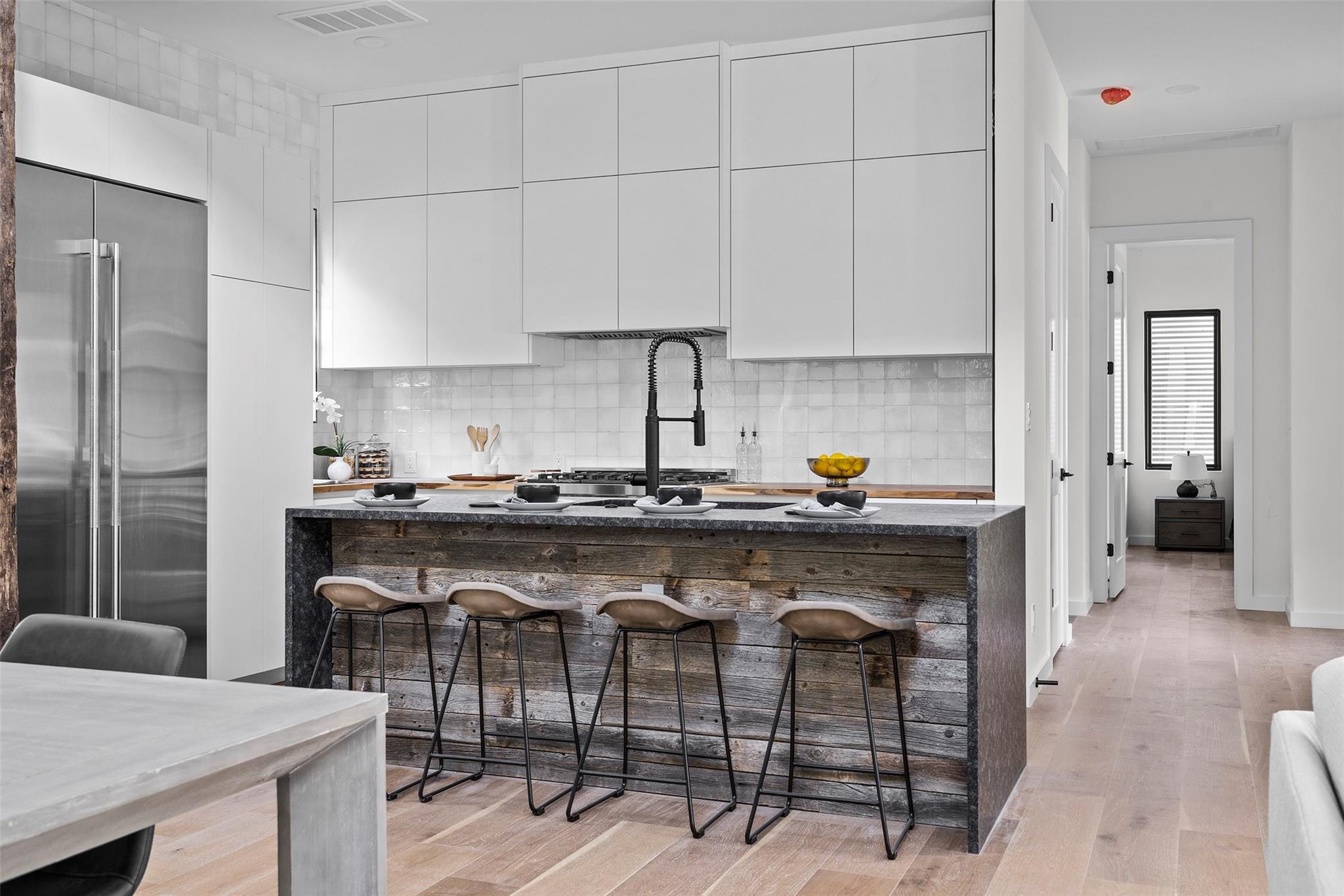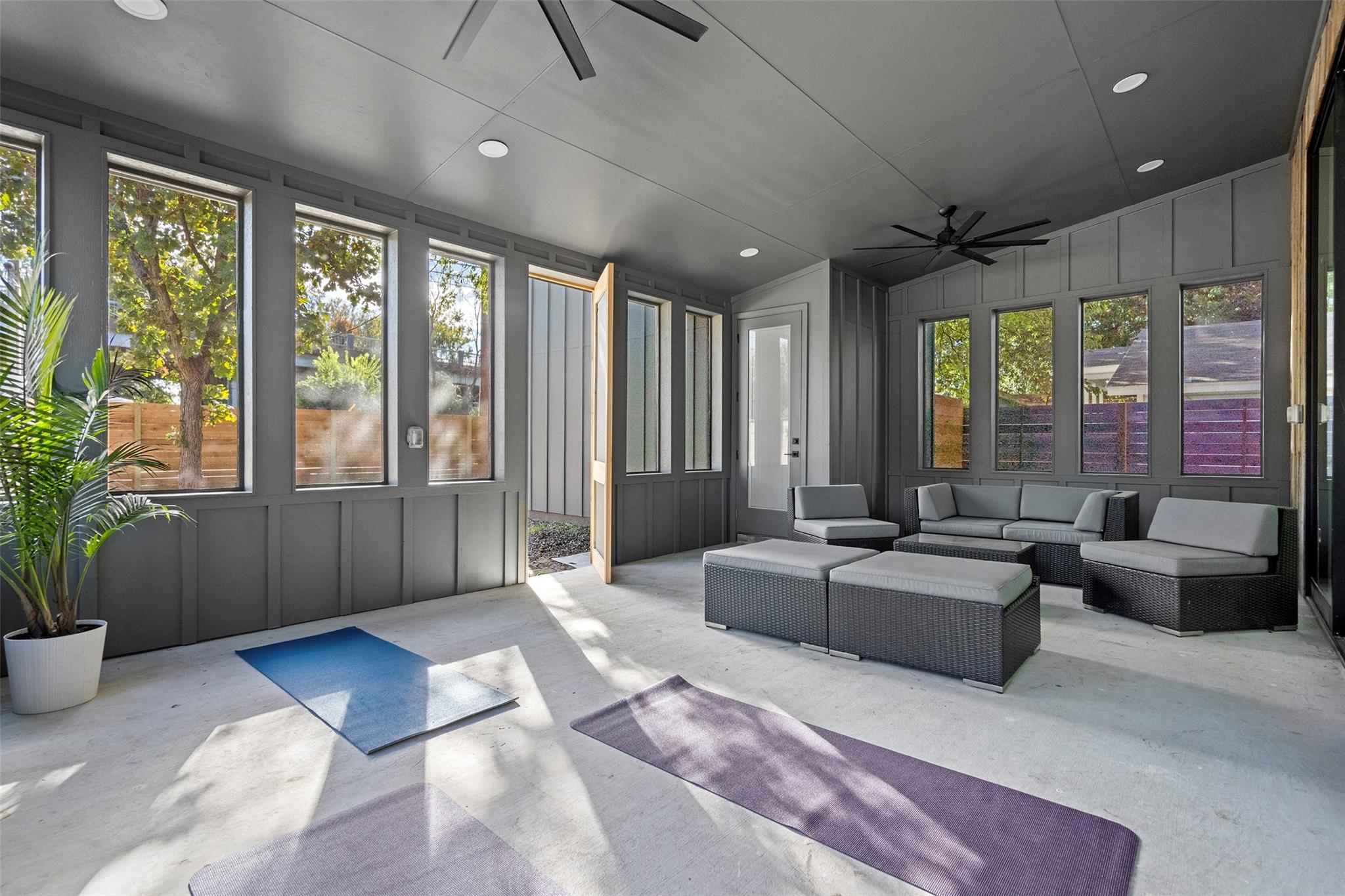 Welcome to the East Austin farm house, and silo! This gorgeous and unique property is situated on just over 1/5 of an acre, and has been designed to create a Texas ranch exterior. The main house is almost 3,100 sq ft and is sided with reclaimed barn wood siding that is believed to be almost a century old. Inside, both the barn and silo are luxury homes with high-end design, finishes and fixtures. The main level in the barn house boasts a primary bedroom with a luxurious spa like marble bathroom. The bathroom has a 9' long floating dual vanity and wet room with an oversized soaking tub. The primary suite is finished with a custom designed closet and convenient in-closet stackable washer and dryer. The remainder of the main level includes a Chef's kitchen, huge screened in porch, living and dining rooms. The kitchen has a stunning JennAir refrigerator, 6-burner stainless gas range, and eat-in island with leathered granite waterfall counter tops. The rest of the kitchen has butcher block counter tops, a cream Zelige tile backsplash and an enormous 25' reclaimed support beam which add to the rustic and modern aesthetic. On the second story, you will find a loft space overlooking the great room and dining area, along with three large bedrooms, each with an en suite bathroom. The third level offers a media room that is pre-wired & a bonus space with full bathroom. Bring your imagination for the bonus space, it could make a great play space, studio, library or more. The silo on the property is the guest house/casita, and is an awesome space which spans almost 700 square feet. Current design has the space utilized as a home gym with a galley kitchen, and the upstairs as a large home office. It is versatile extra space that can work around your life, and can also easily be redesigned as a fully functioning standalone apartment or AirBnb. Come embrace the vibrant East Austin lifestyle in this thoughtfully designed slice of country, in the city.
