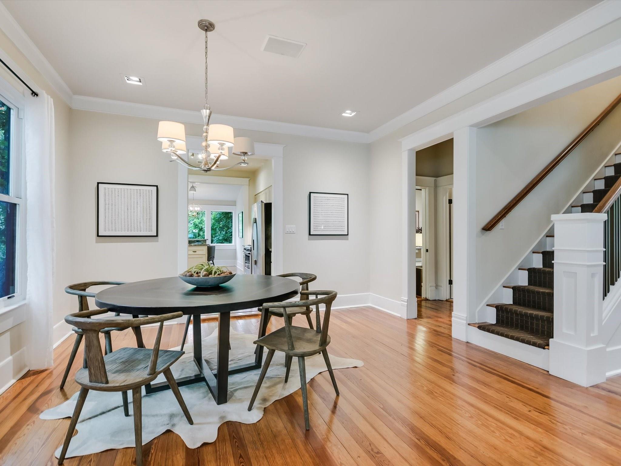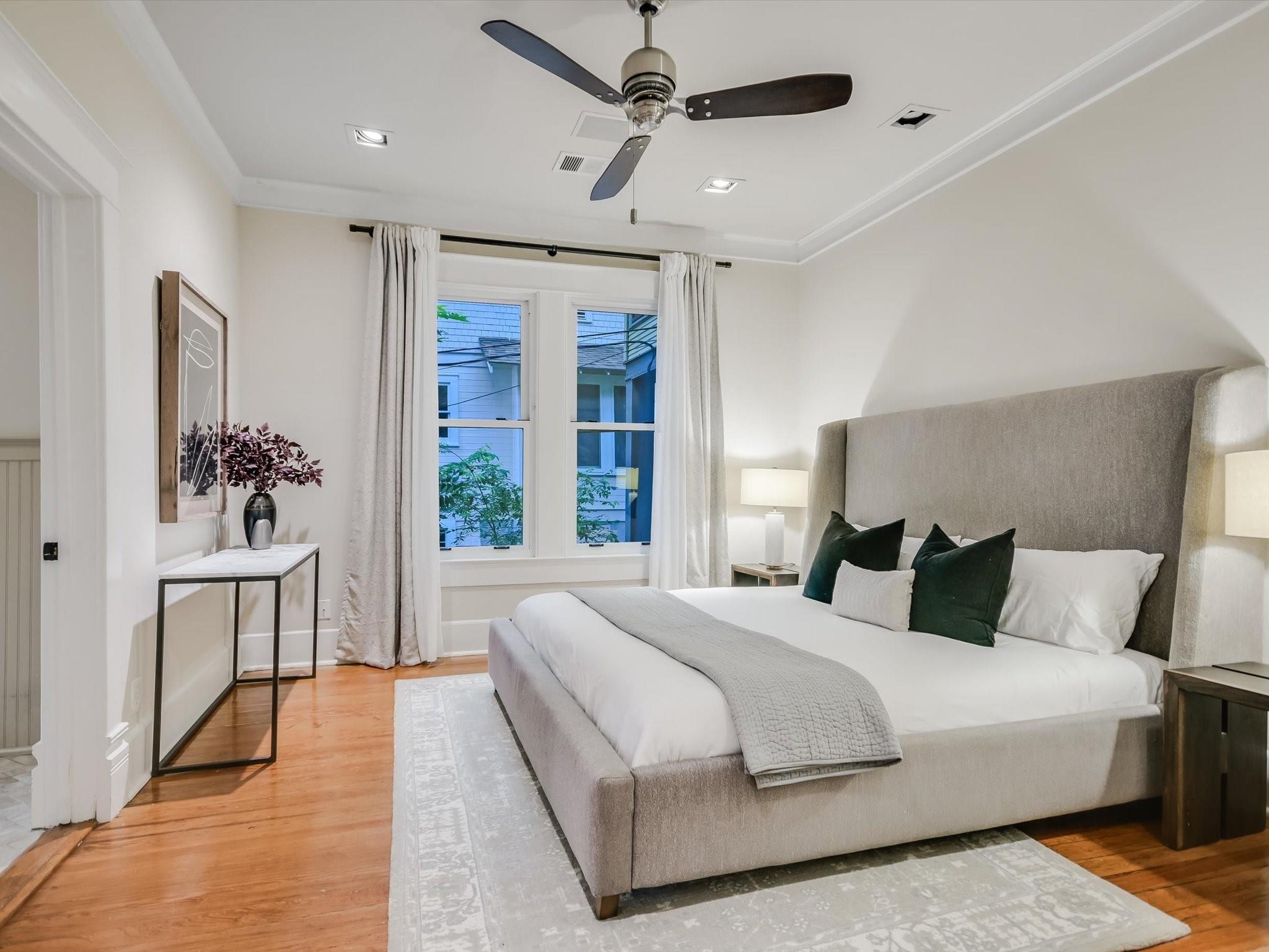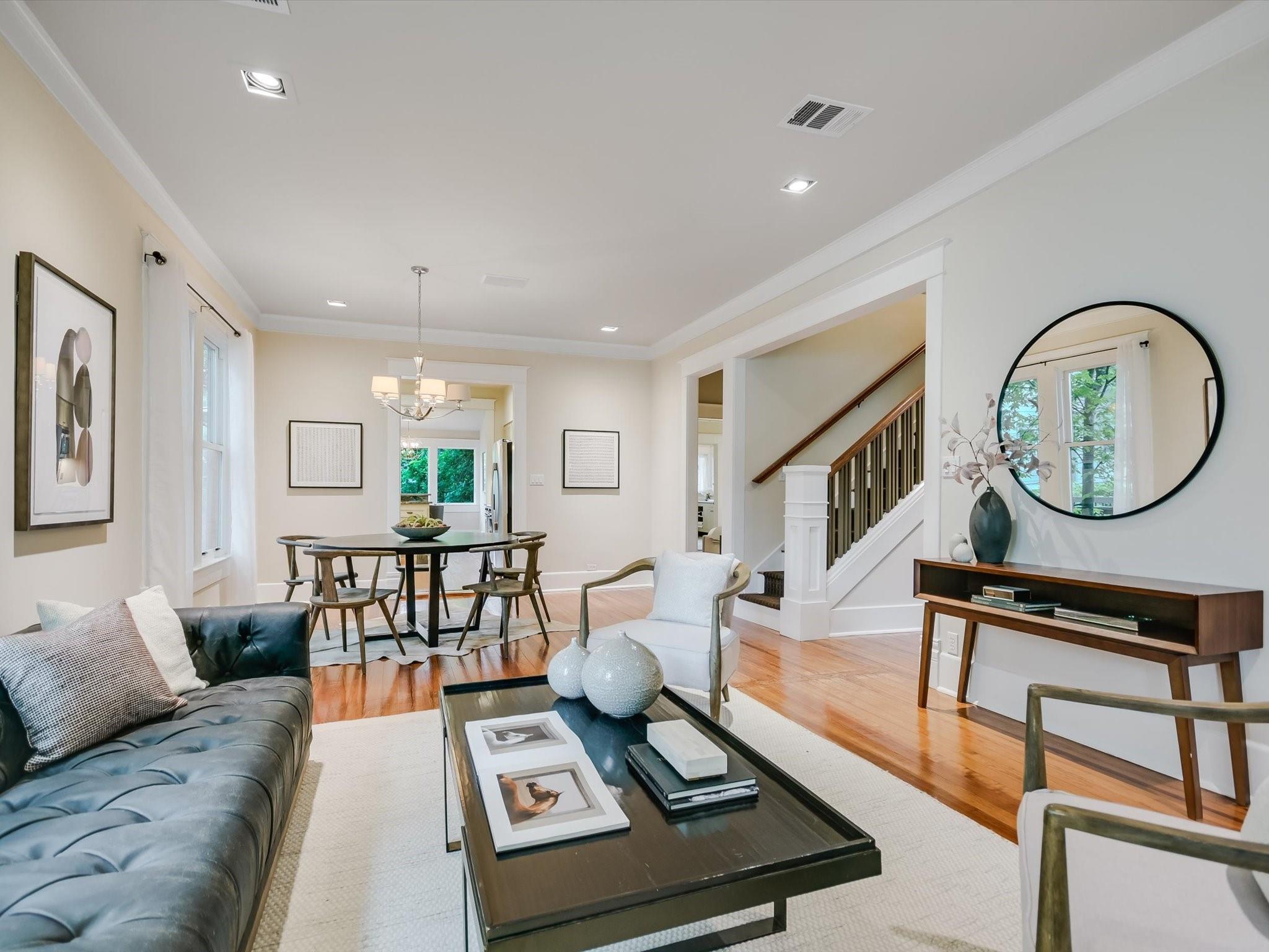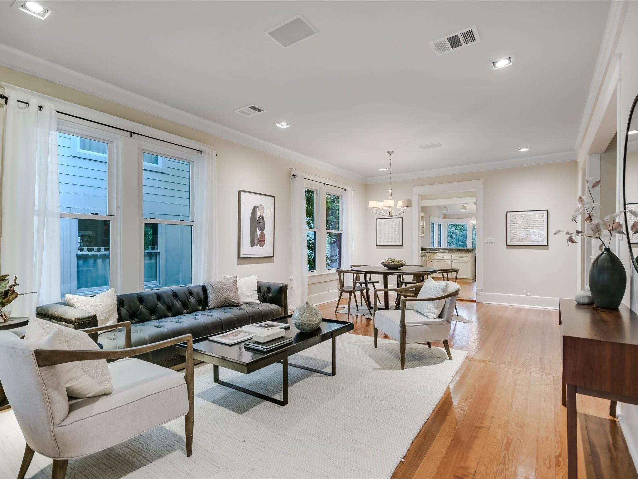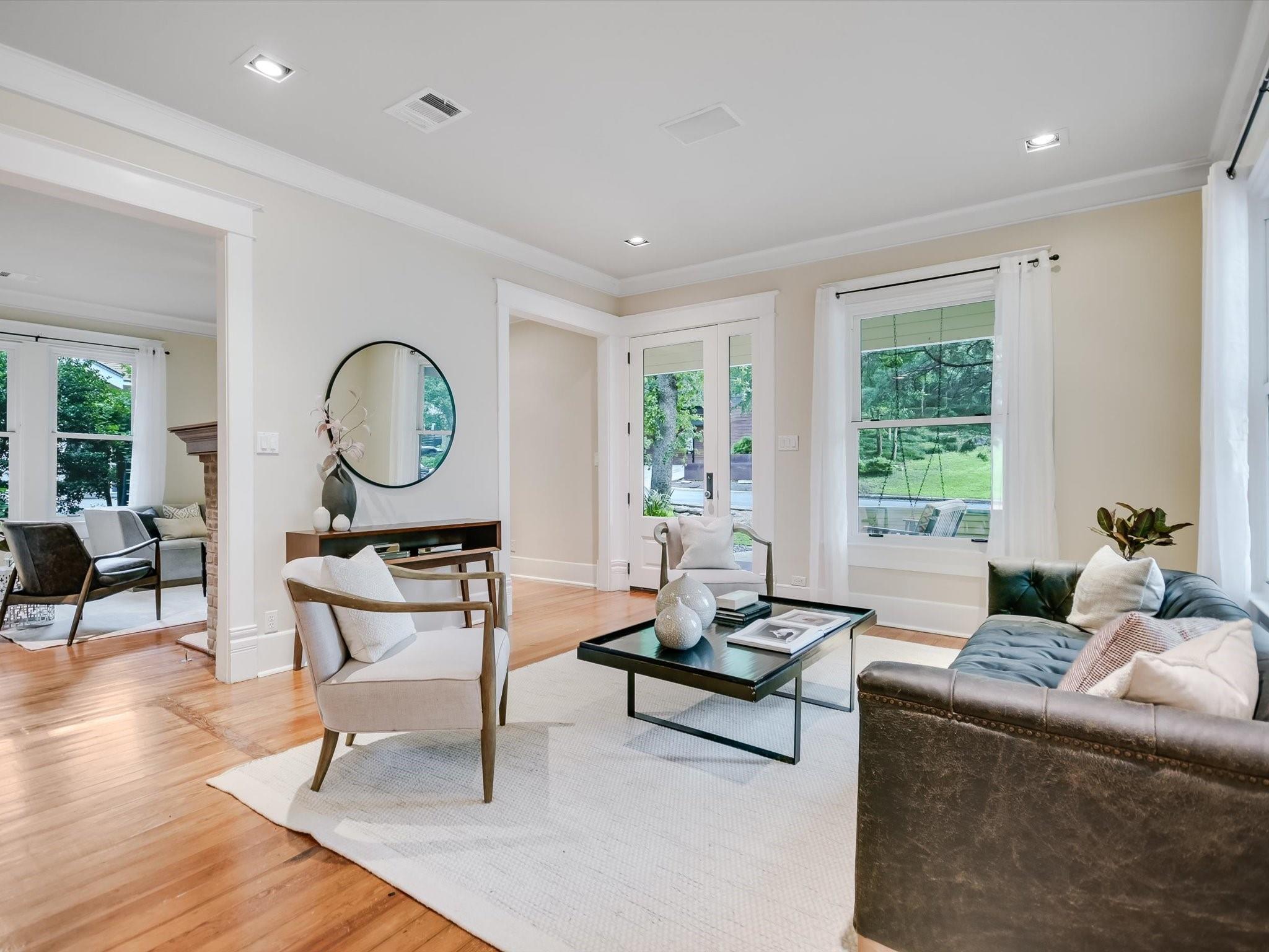 Sited on a spacious lot in charming Clarksville, this 1930 Craftsman captures the essence of period authenticity while offering modern amenities for comfortable living. Well maintained and thoughtfully updated throughout the years, 617 Oakland has architectural integrity without sacrificing convenience. A long gallery porch welcomes you into a highly functional interior with multiple light-filled living and dining spaces, original hardwood floors and craftsman millwork. An updated dine-in kitchen with granite counters and stainless steel appliances and a dedicated office space both offer bright treetop views. Also located on the main level is the primary suite complete with a fully renovated bathroom and walk-in closet. Rounding out the first floor spaces is a powder room and laundry facilities. The second level has two generously sized bedrooms that share a stylish, marble accented bathroom. In addition to the main residence, a modern one bedroom guest apartment (complete with kitchen and full bath) can be accessed through the backyard. This bright, modern space lends itself to any number of live/work or income generating scenarios. Exterior features include mature, low maintenance landscaping, full irrigation, ample storage and off-street parking. 617 Oakland has a true sense of place, and within walking distance you'll find a vibrant array of local shops, trendy restaurants and cultural attractions. Equal parts charm and convenience and anchored in a gem of a neighborhood, this special home is an ideal jumping off point to experience an authentic Austin lifestyle.