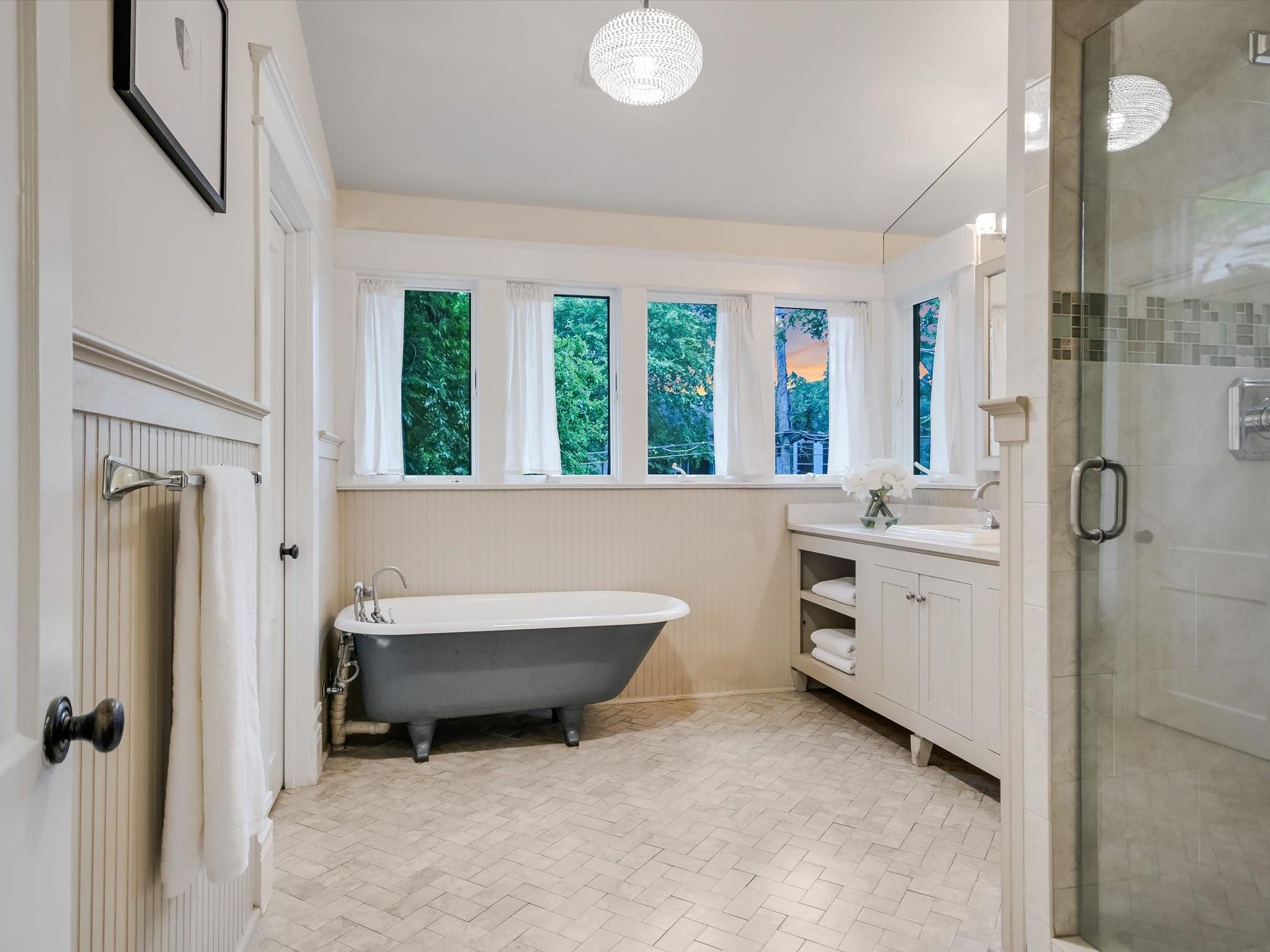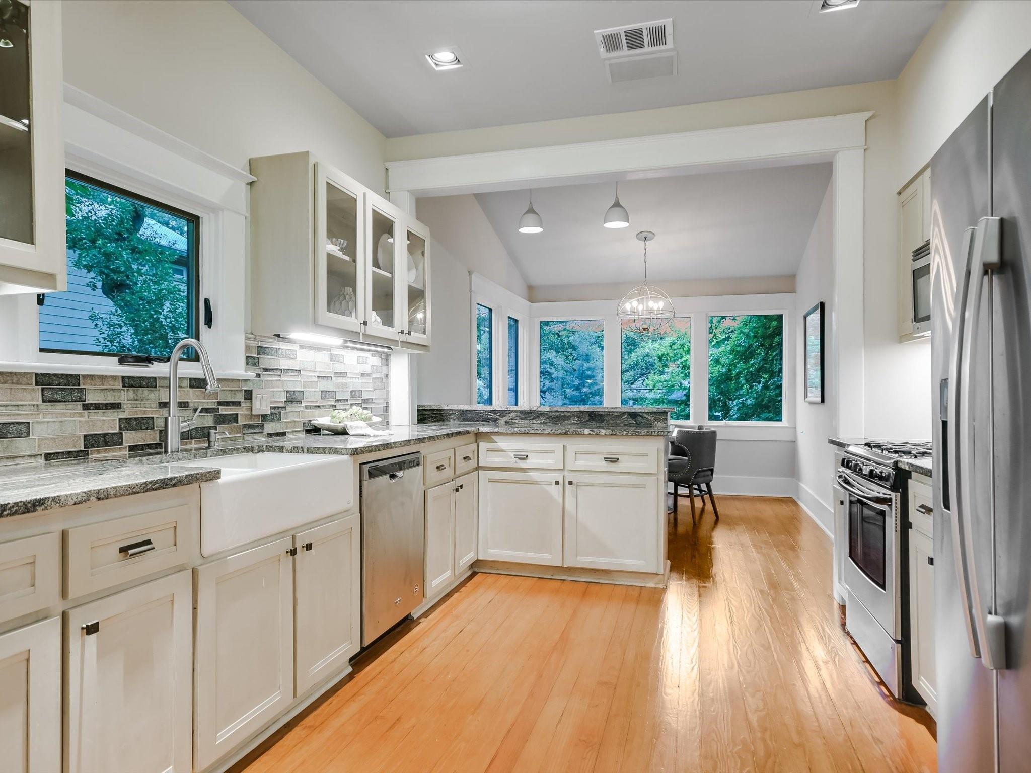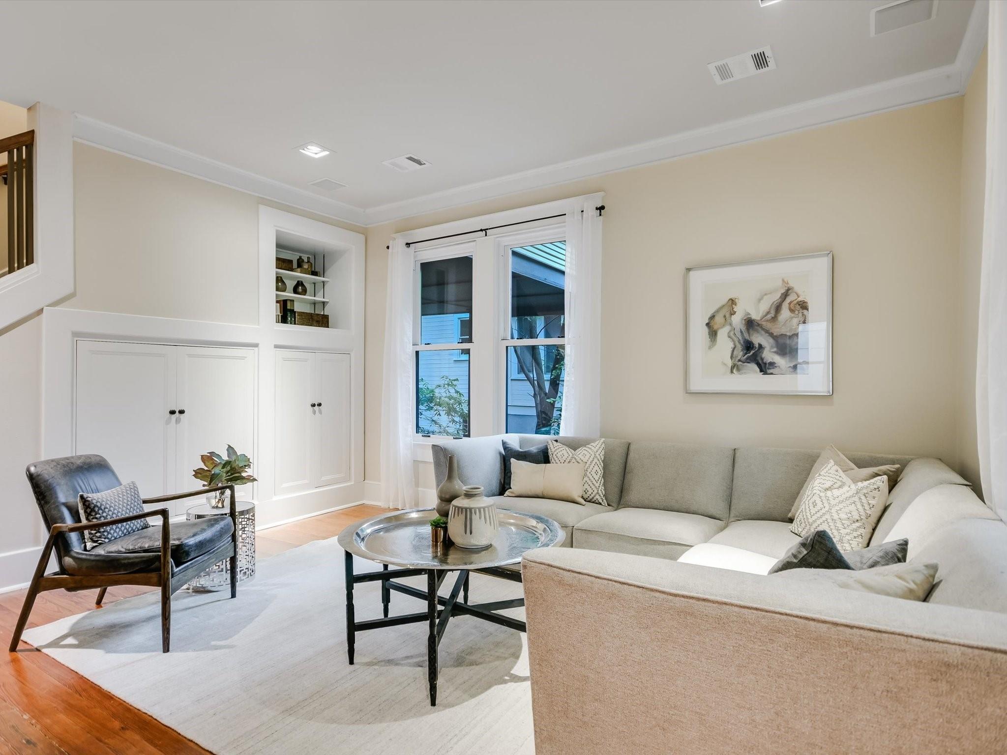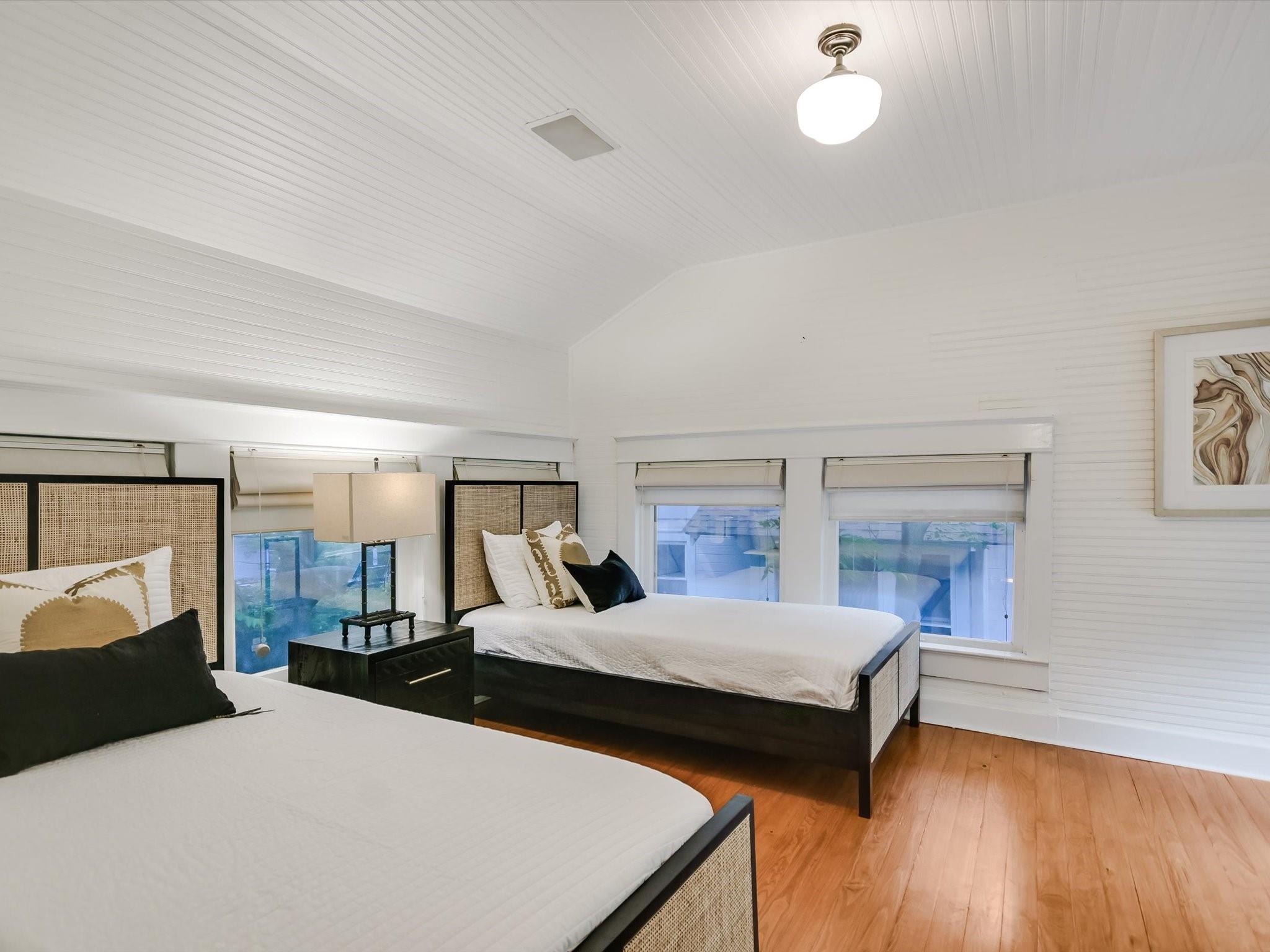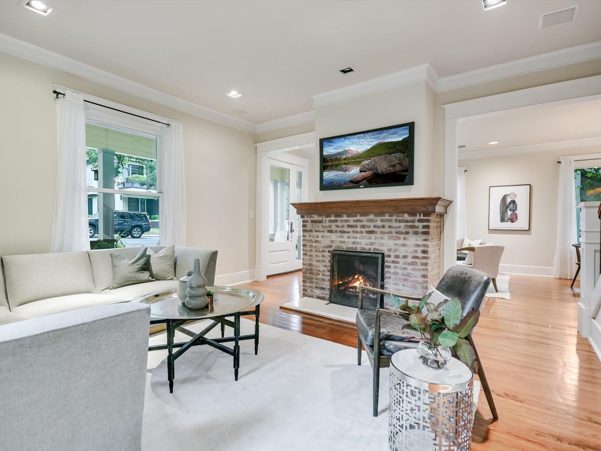 Sited on a spacious lot in charming Clarksville, this 1930 Craftsman captures the essence of period authenticity while offering modern amenities for comfortable living. Well maintained and thoughtfully updated throughout the years, 617 Oakland has architectural integrity without sacrificing convenience. A long gallery porch welcomes you into a highly functional interior with multiple light-filled living and dining spaces, original hardwood floors and craftsman millwork. An updated dine-in kitchen with granite counters and stainless steel appliances and a dedicated office space both offer bright treetop views. Also located on the main level is the primary suite complete with a fully renovated bathroom and walk-in closet. Rounding out the first floor spaces is a powder room and laundry facilities. The second level has two generously sized bedrooms that share a stylish, marble accented bathroom. In addition to the main residence, a modern one bedroom guest apartment (complete with kitchen and full bath) can be accessed through the backyard. This bright, modern space lends itself to any number of live/work or income generating scenarios. Exterior features include mature, low maintenance landscaping, full irrigation, ample storage and off-street parking. 617 Oakland has a true sense of place, and within walking distance you'll find a vibrant array of local shops, trendy restaurants and cultural attractions. Equal parts charm and convenience and anchored in a gem of a neighborhood, this special home is an ideal jumping off point to experience an authentic Austin lifestyle.