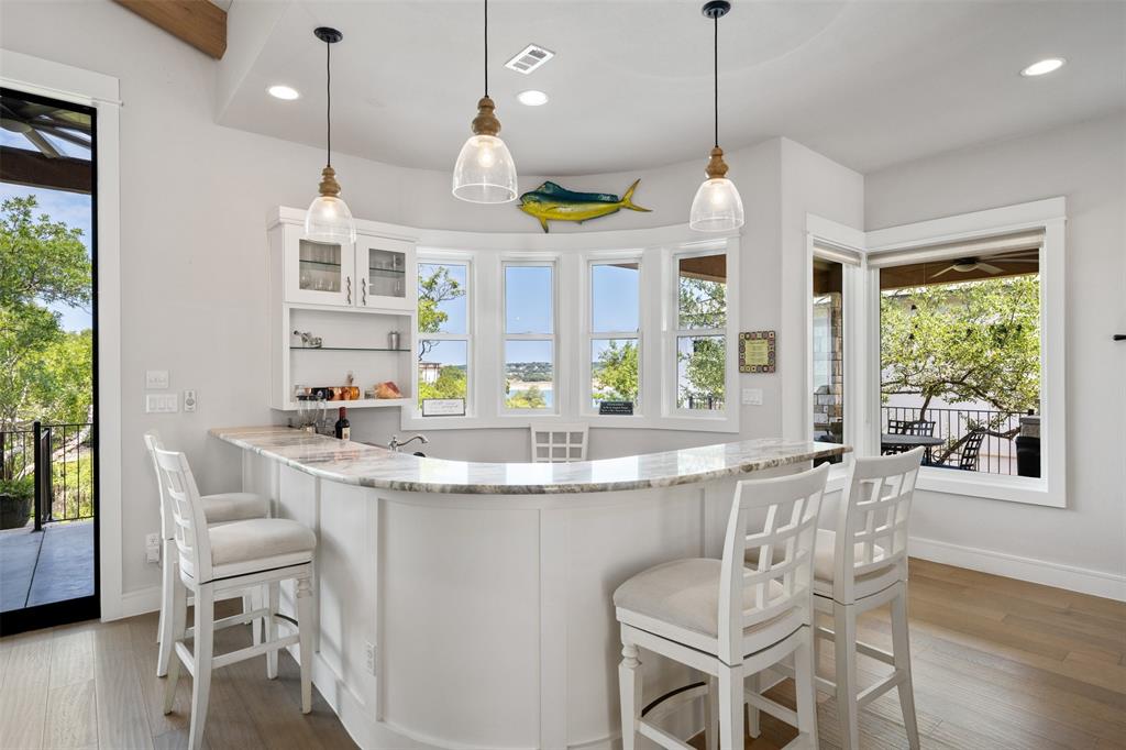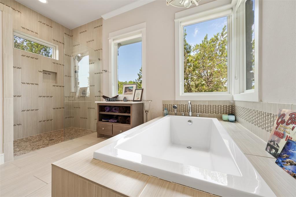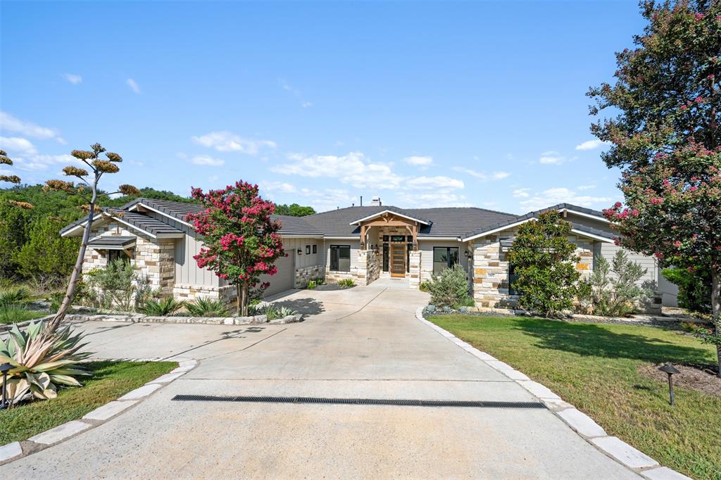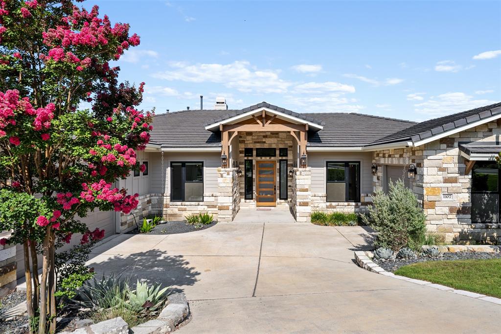 Stunning single story custom home on a large waterfront lot in prestigious Lakeway neighborhood! Awesome outdoor living space includes covered patio, pool with spa, fire pit, pass through bar, and built-in grilling area all with hill country and lake views. Steps to the dock are adjacent to seasonal stream. Gorgeous interior features in a bright and open floor plan with walls of windows. Soaring beamed ceilings, wood floors, built-ins, spacious rooms and wonderful storage spaces both inside and out. Gourmet kitchen has stunning cabinetry and granite countertops along with center island all open to the wet bar and expansive living room. Enjoy a master suite with private relaxing en suite bathroom, soaking tub, walk-in shower, separate vanities, huge closet and patio access. Private office and media room. Some community amenities may require memberships. Lake Travis levels fluctuate and cove is currently dry.