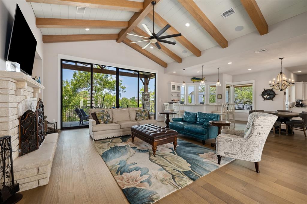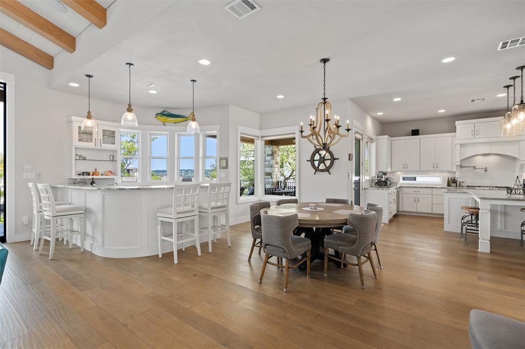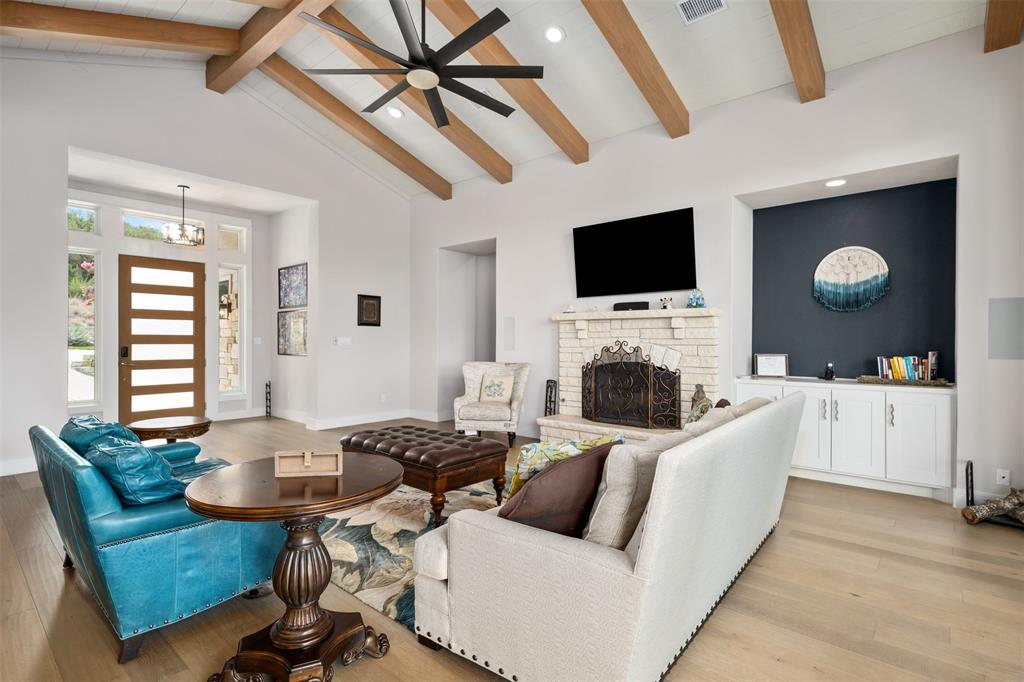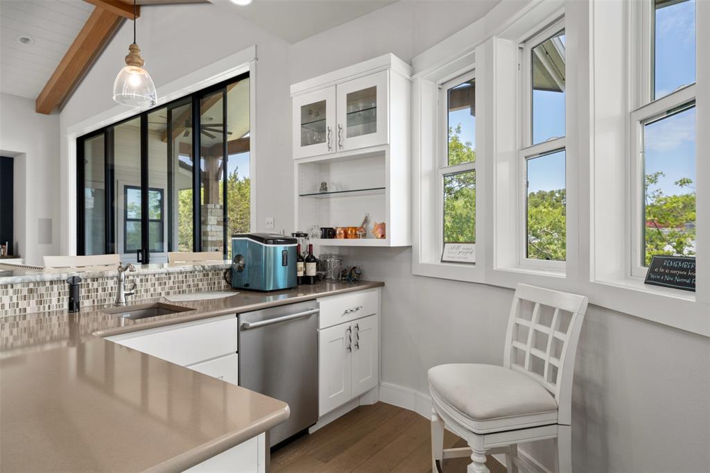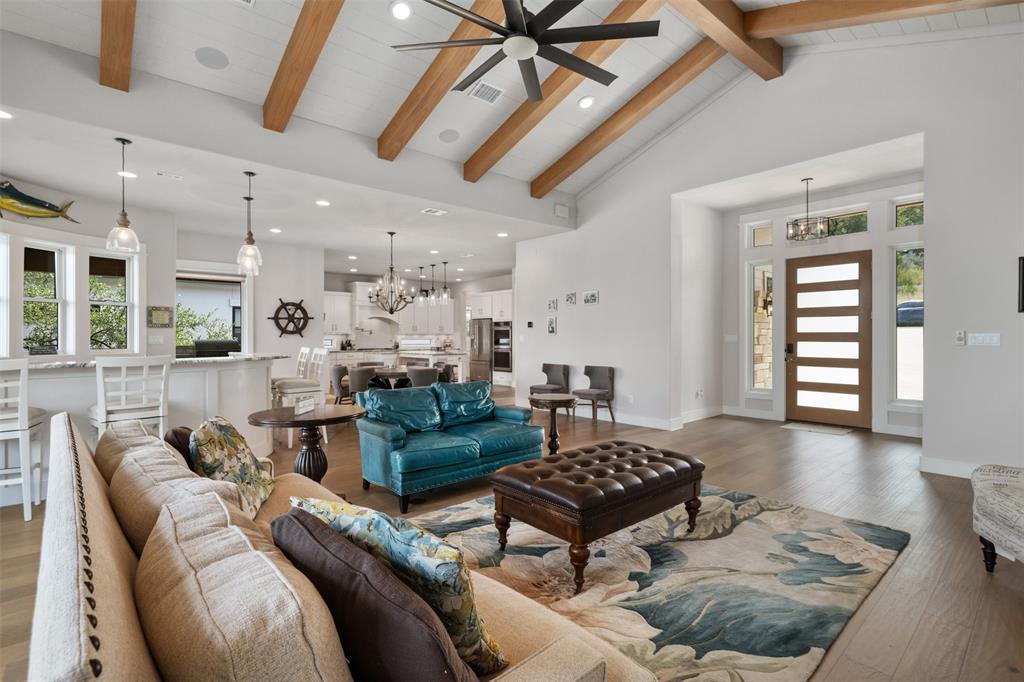 Stunning single story custom home on a large waterfront lot in prestigious Lakeway neighborhood! Awesome outdoor living space includes covered patio, pool with spa, fire pit, pass through bar, and built-in grilling area all with hill country and lake views. Steps to the dock are adjacent to seasonal stream. Gorgeous interior features in a bright and open floor plan with walls of windows. Soaring beamed ceilings, wood floors, built-ins, spacious rooms and wonderful storage spaces both inside and out. Gourmet kitchen has stunning cabinetry and granite countertops along with center island all open to the wet bar and expansive living room. Enjoy a master suite with private relaxing en suite bathroom, soaking tub, walk-in shower, separate vanities, huge closet and patio access. Private office and media room. Some community amenities may require memberships. Lake Travis levels fluctuate and cove is currently dry.