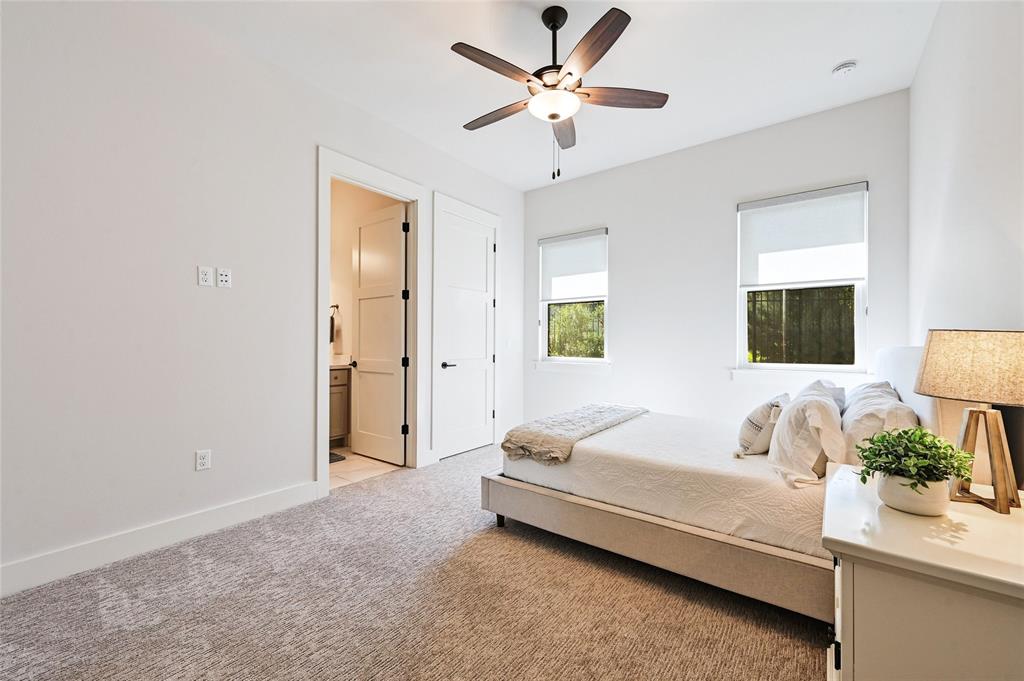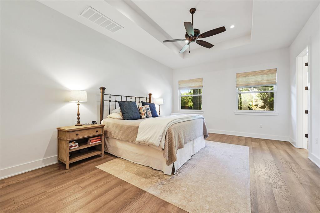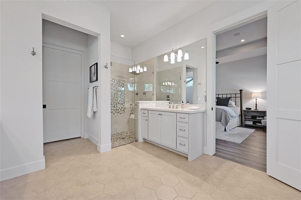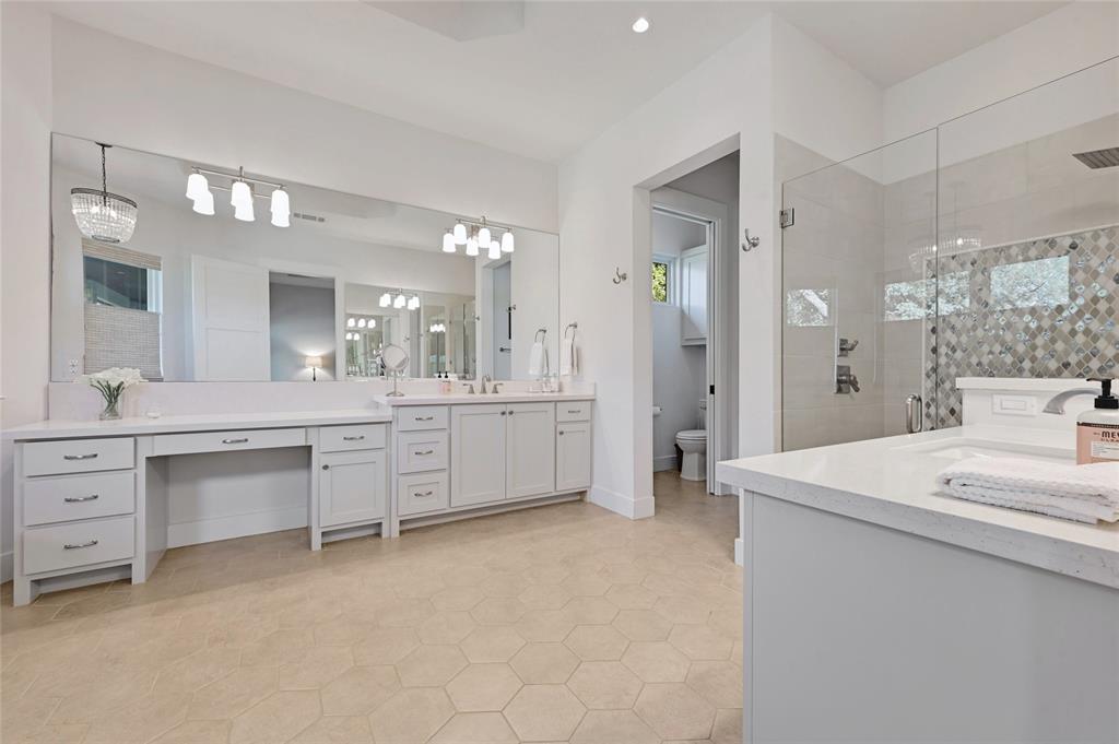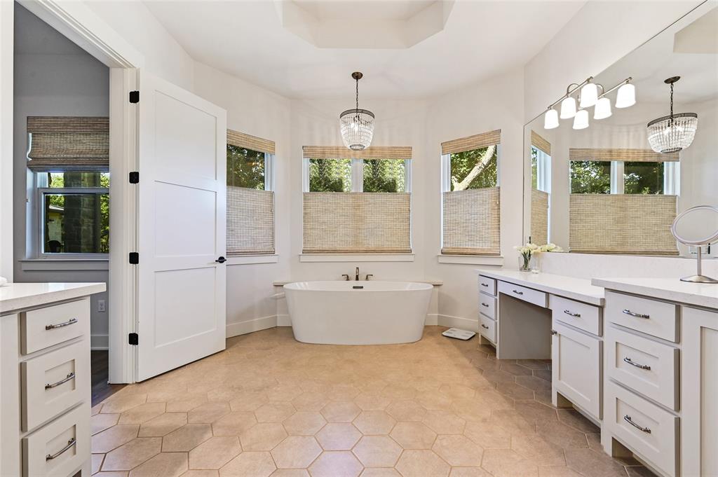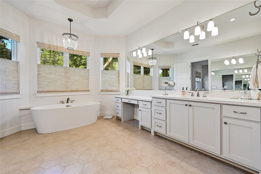 Luxury master bathroom suite includes dual custom vanities with plenty of cabinets and drawer space, free-standing soaking tub, a shower system with body jets, and large master closet with multiple level shelves, hanging space, built-in ironing board, and built-in 8-drawer dresser.