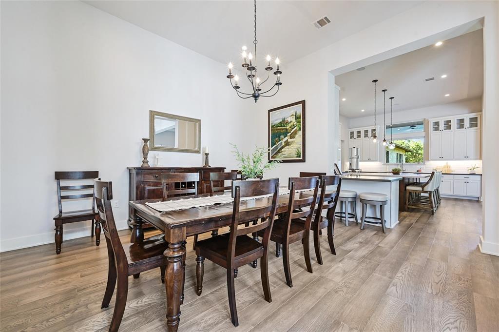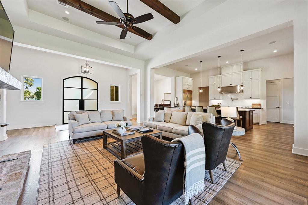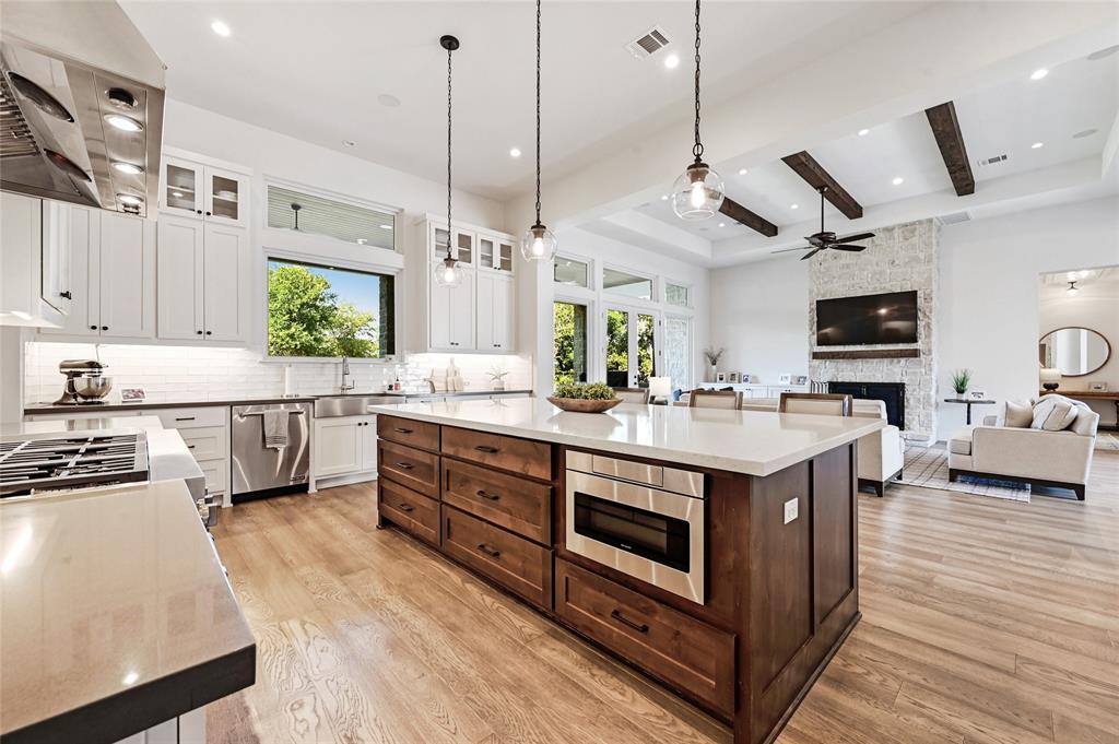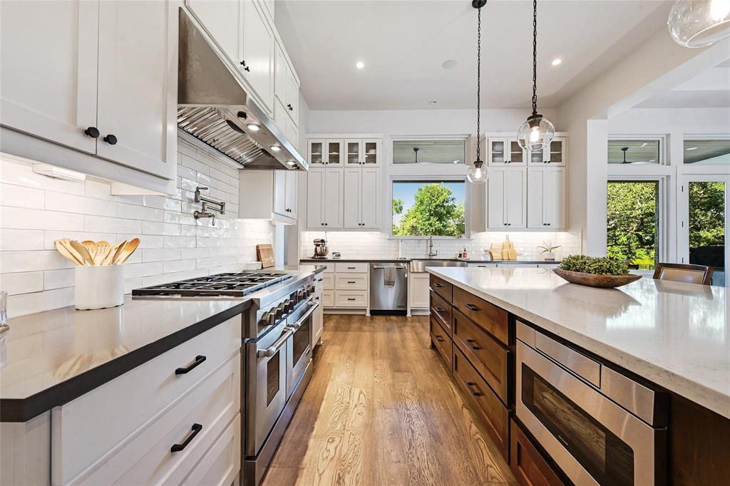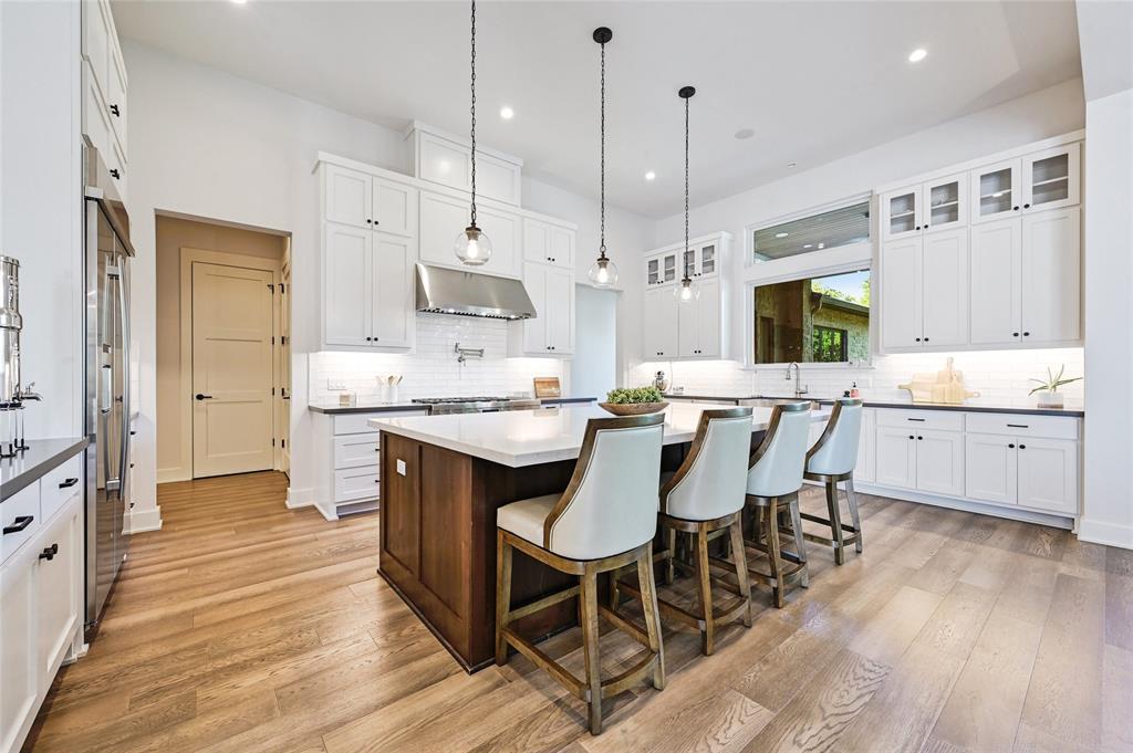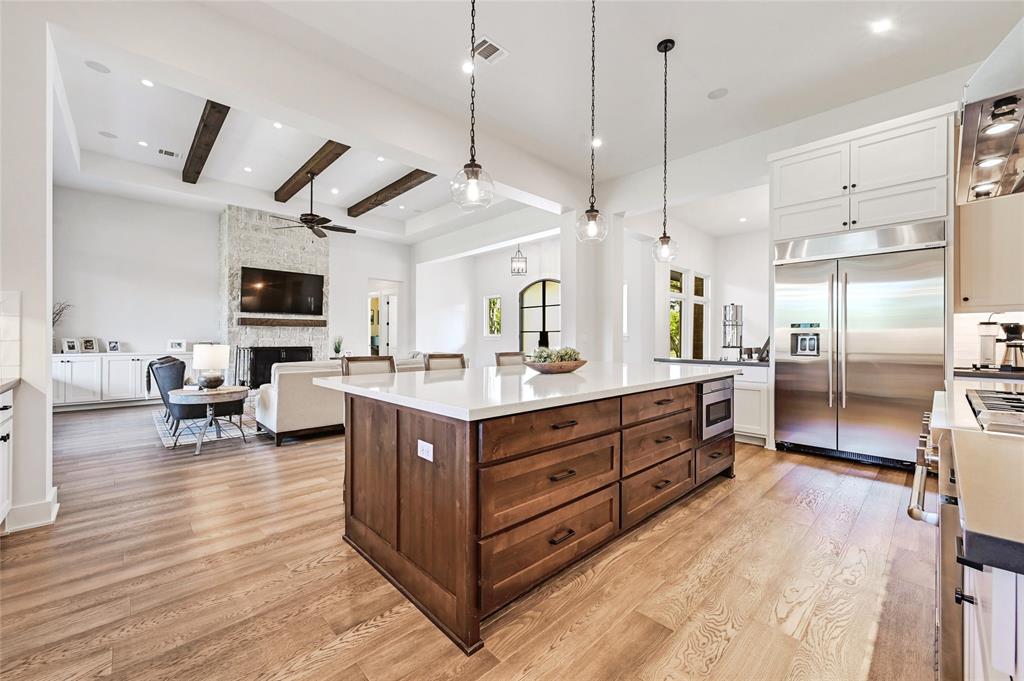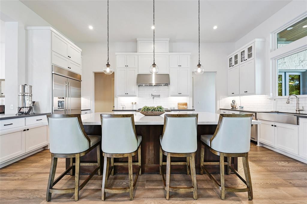 The gourmet kitchen has custom shaker-style soft-close cabinetry, Silestone countertops, under-cabinet lighting and outlets, Jenn-Air appliances including a built-in side-by-side refrigerator, commercial style 6-burner range plus griddle, double ovens, commercial style canopy range hood, 6-cycle pro-dishwasher, drawer-style built in microwave, stainless steel deep sink with apron, and pot filler above range, oversized island with space for lots of extra seating in the kitchen.