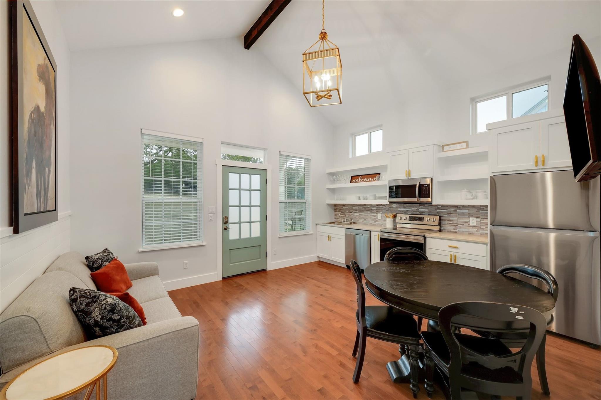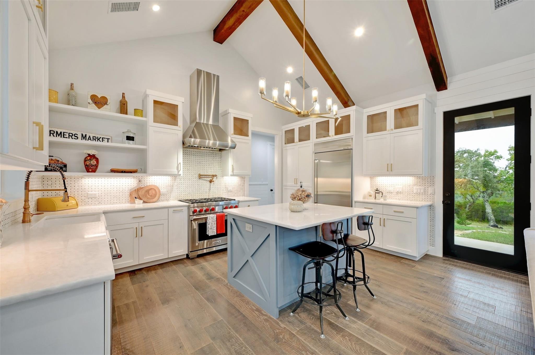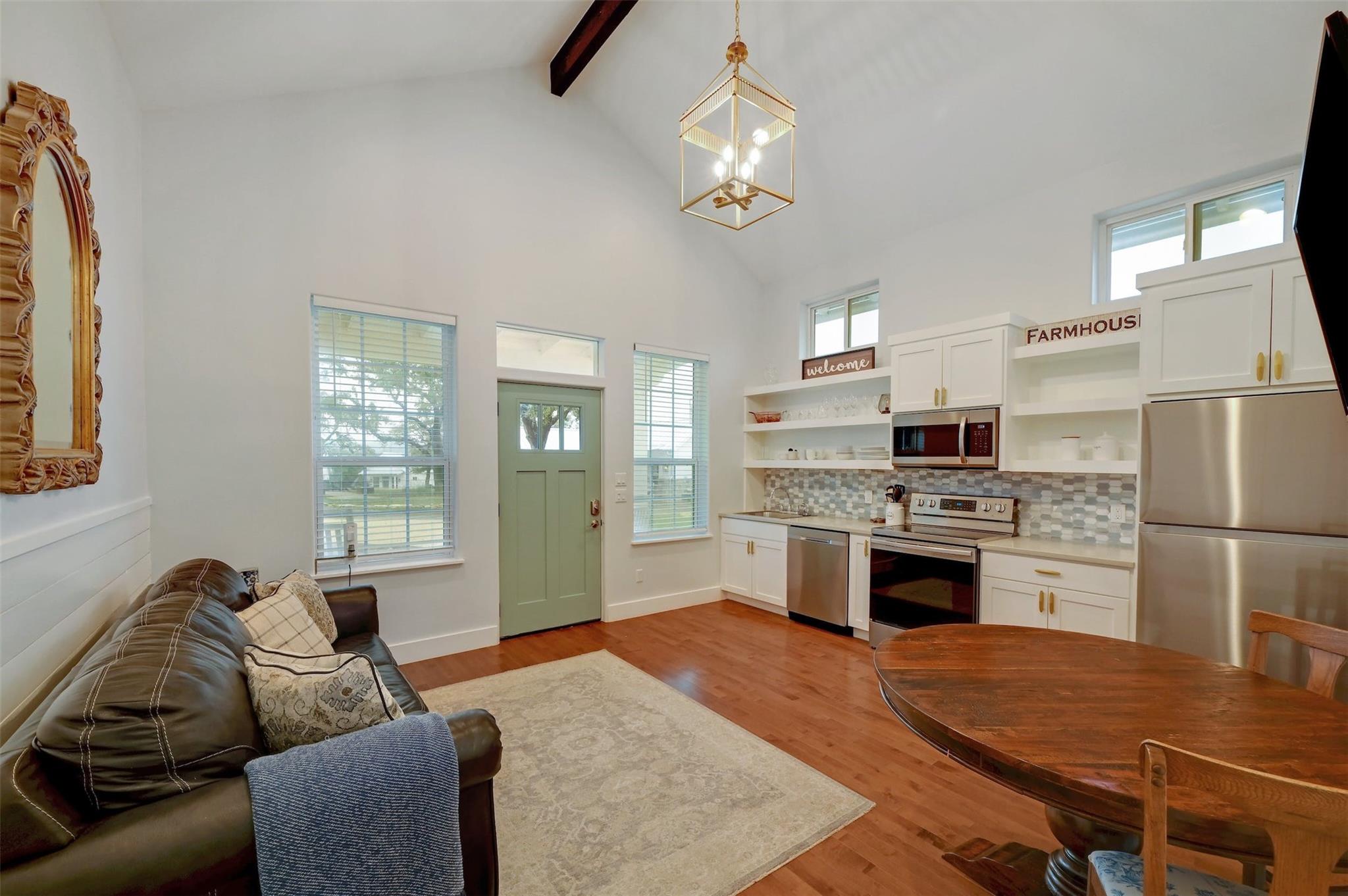 | Interior Features | Breakfast Bar, Ceiling Fan(s), Beamed Ceilings, Cathedral Ceiling(s), High Ceilings, Quartz Counters, Double Vanity, Electric Dryer Hookup, Eat-in Kitchen, Kitchen Island, No Interior Steps, Open Floorplan, Primary Bedroom on Main, Recessed Lighting, Walk-In Closet(s), Washer Hookup | |