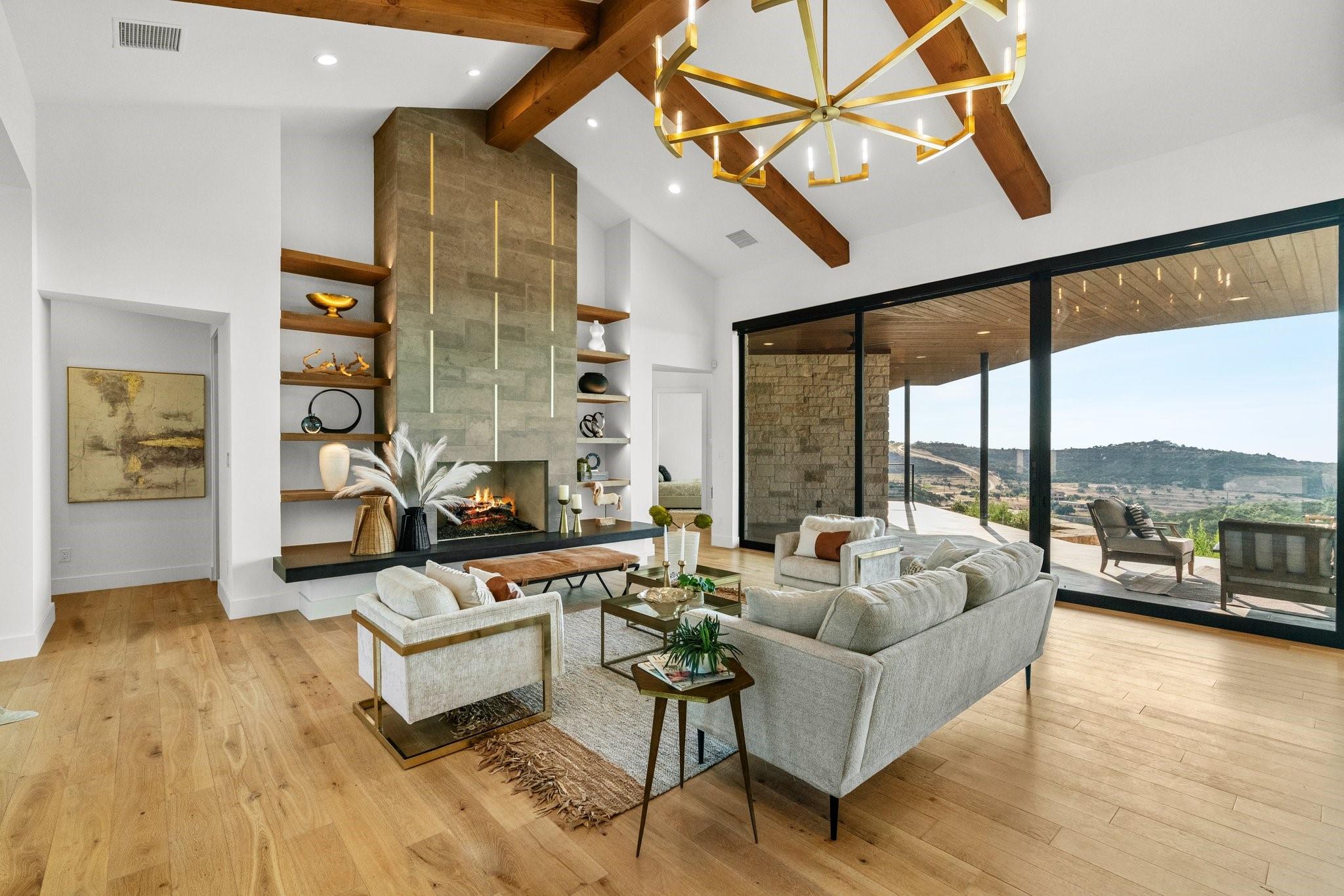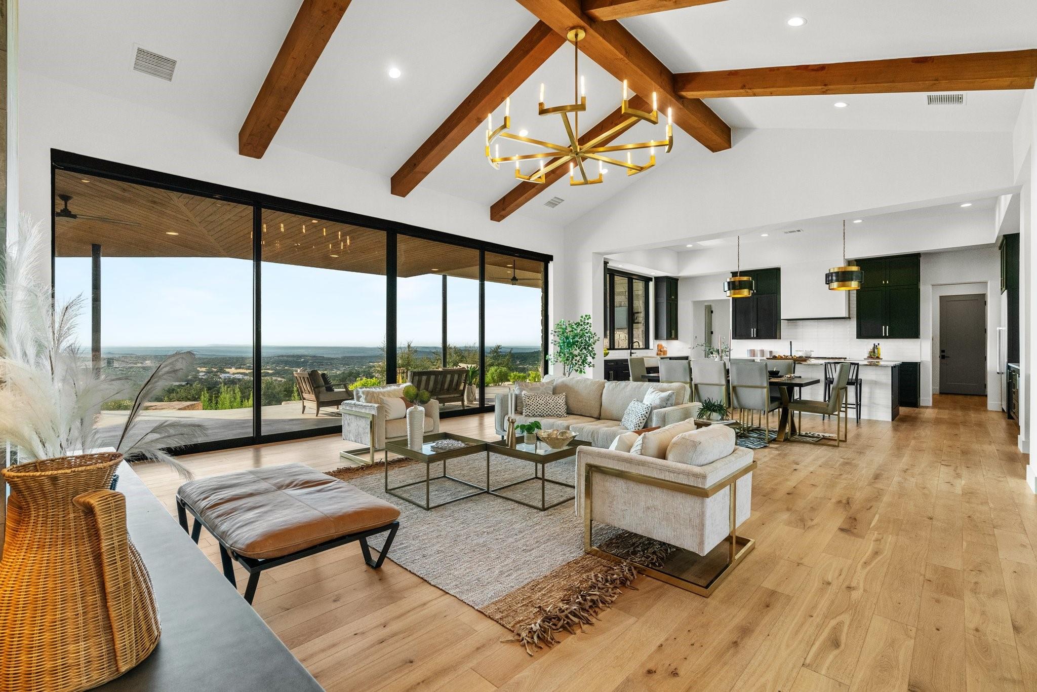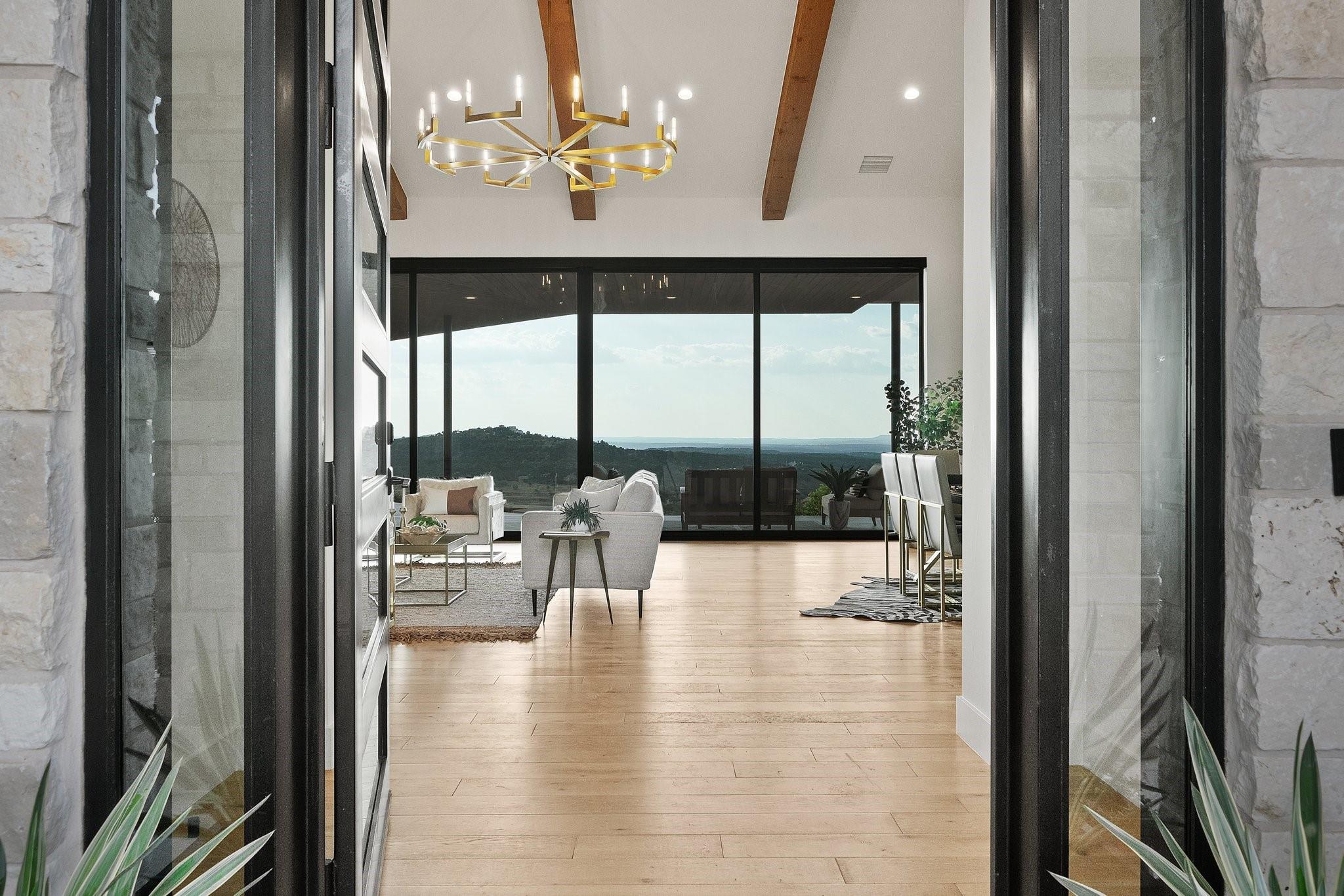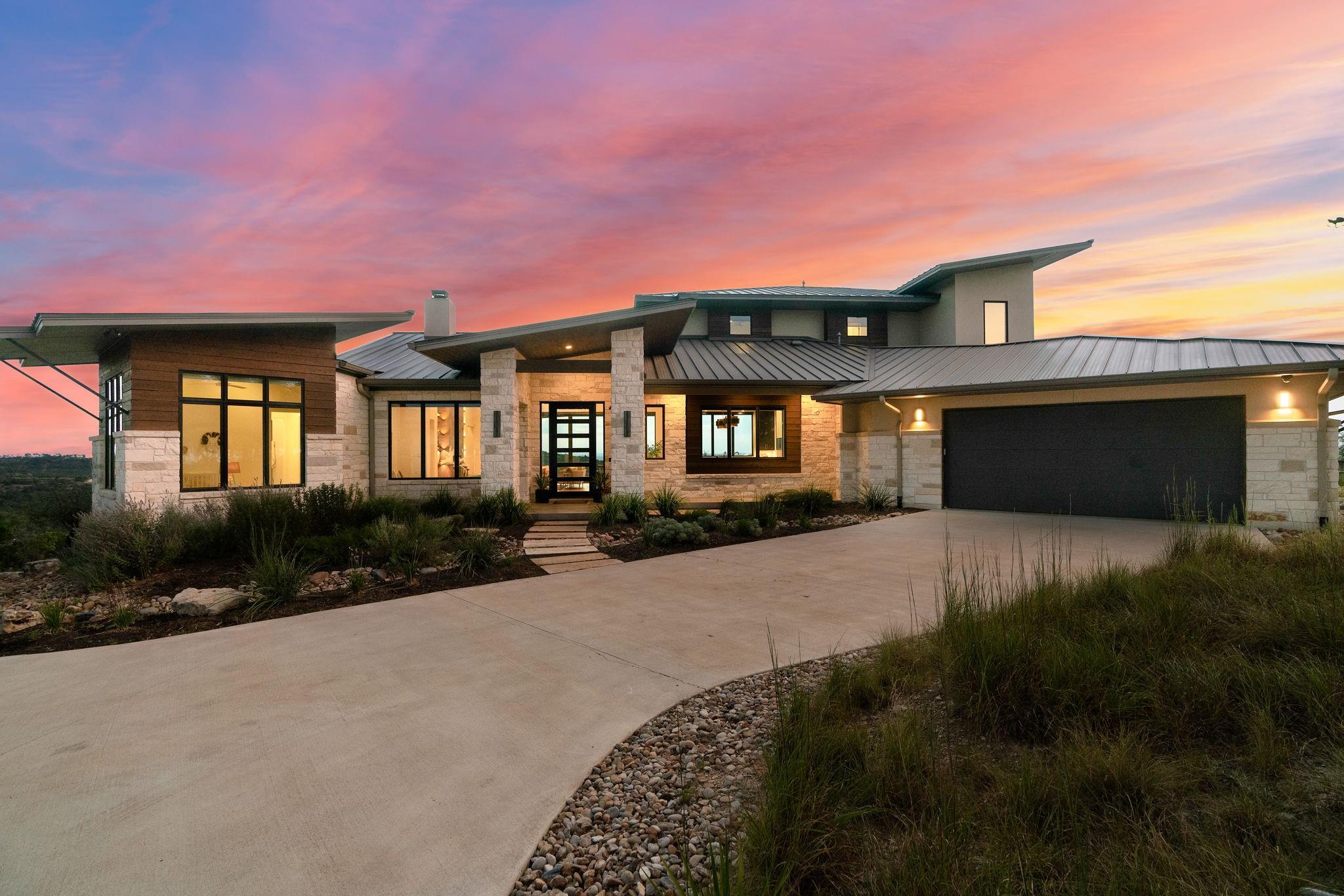 Stunning modern masterpiece graciously nestled atop 28+ private acres with breathtaking panoramic views of the Texas Hill Country. Built in 2018 by the renowned John Siemering Custom Homes. A brilliantly designed gourmet-style kitchen is the heart of this exquisite home and a culinary enthusiast's dream, featuring top-of-the-line stainless Thermador appliances, a 6-burner gas range with a griddle and double ovens, custom commercial-grade vent hood, side-by-side built-in fridge and freezer, two deep oversized sinks, a wine fridge, large walk-in pantry, and an abundance of gorgeous custom black cabinetry with elegant brass hardware creating an eye-catching contrast against the crisp white walls and clean lines of the designer backsplash. The generous granite island serves as the centerpiece of this gorgeous kitchen, providing a dreamy space for cooking, entertaining and gathering with family and friends. The kitchen and dining flow easily into the main living spaces which are beautifully enhanced by soaring wood-beamed ceilings, white oak hardwood floors, a stunning fireplace with custom stone hearth and hand-crafted built-ins, adding warmth and refinement. Bathed in natural light with an abundance of windows and floor-to-ceiling glass doors, spectacular views of the tranquil rolling hills can be seen for miles and miles. Practicality and efficiency are paramount in this extraordinary property, equipped with a deep water well, a whole-house reverse osmosis and water purification system, three zoned HVAC systems, tankless hot water heaters, motorized shades throughout, custom AV wiring for sound, data and security, highly-efficient foam insulation. With almost 29 unobstructed acres, there are endless opportunities for further enhancements such as a pool, extended outdoor living spaces, a guesthouse, sport courts, a barndominium, barns, a workshop, additional garage space for the car enthusiast, and more. No HOA. Low tax rate. Dripping Springs ISD.