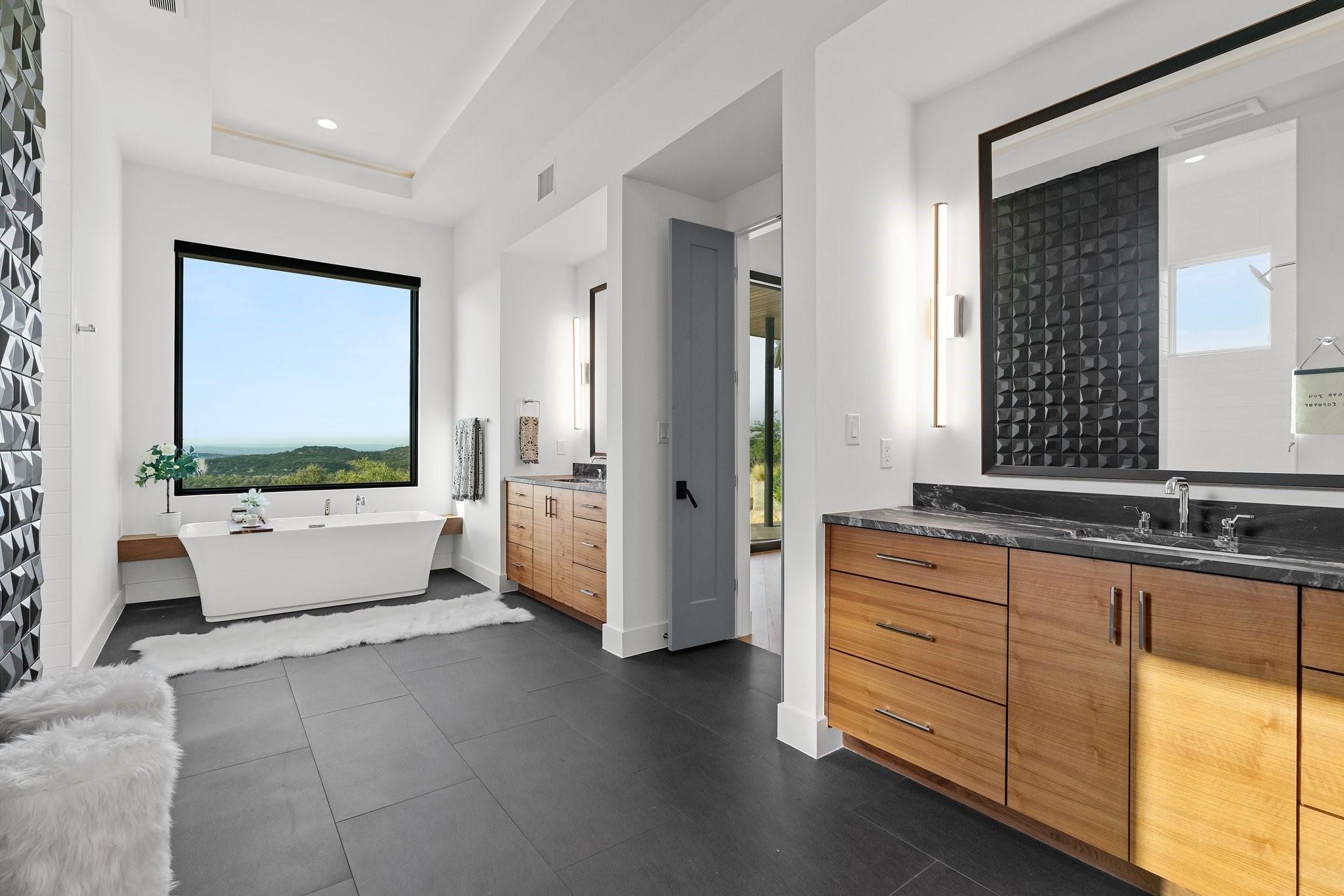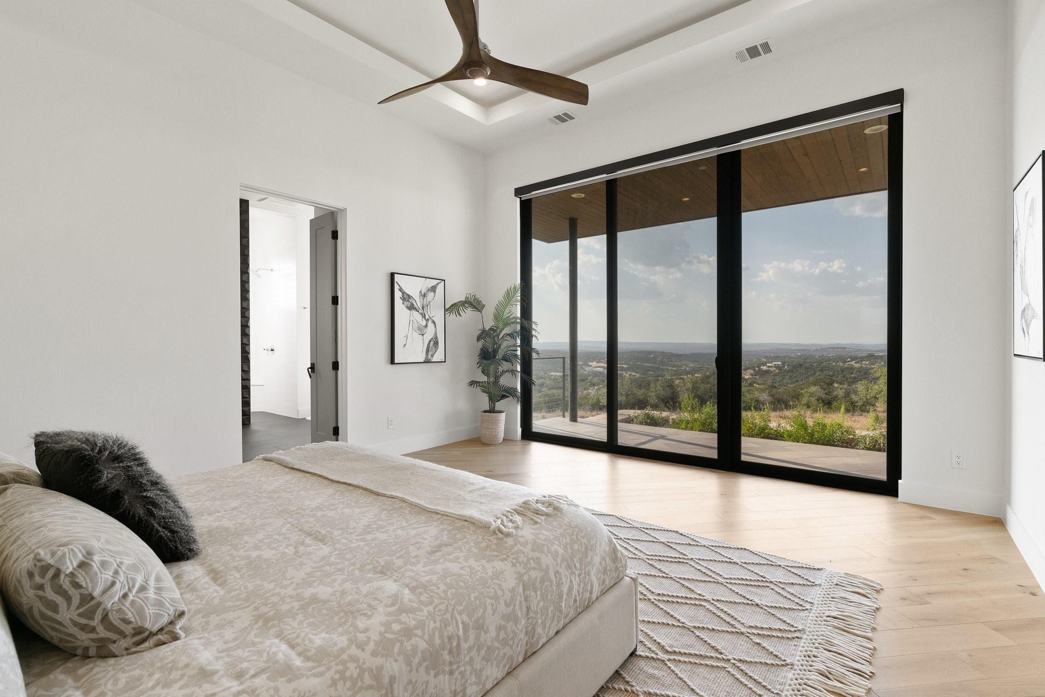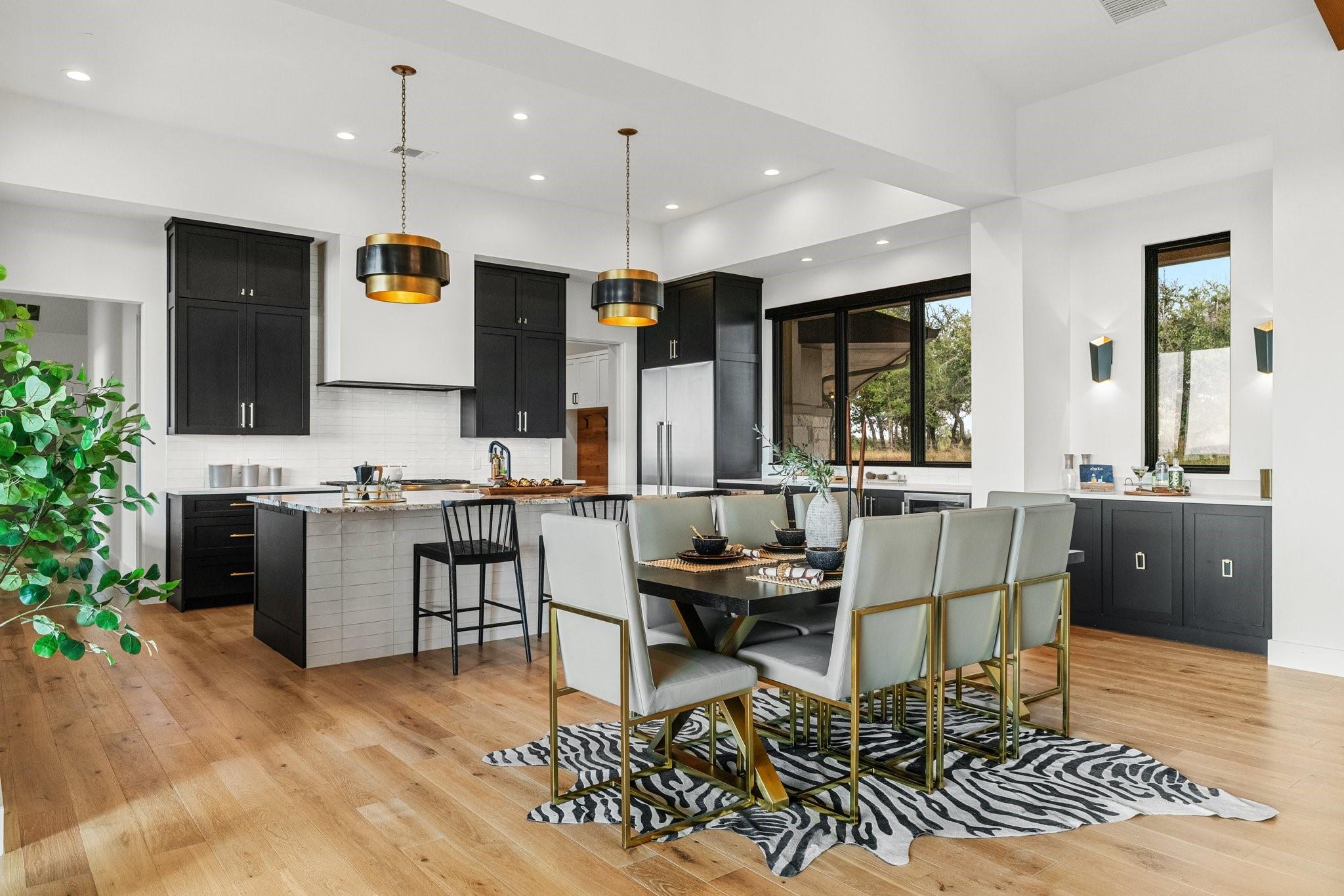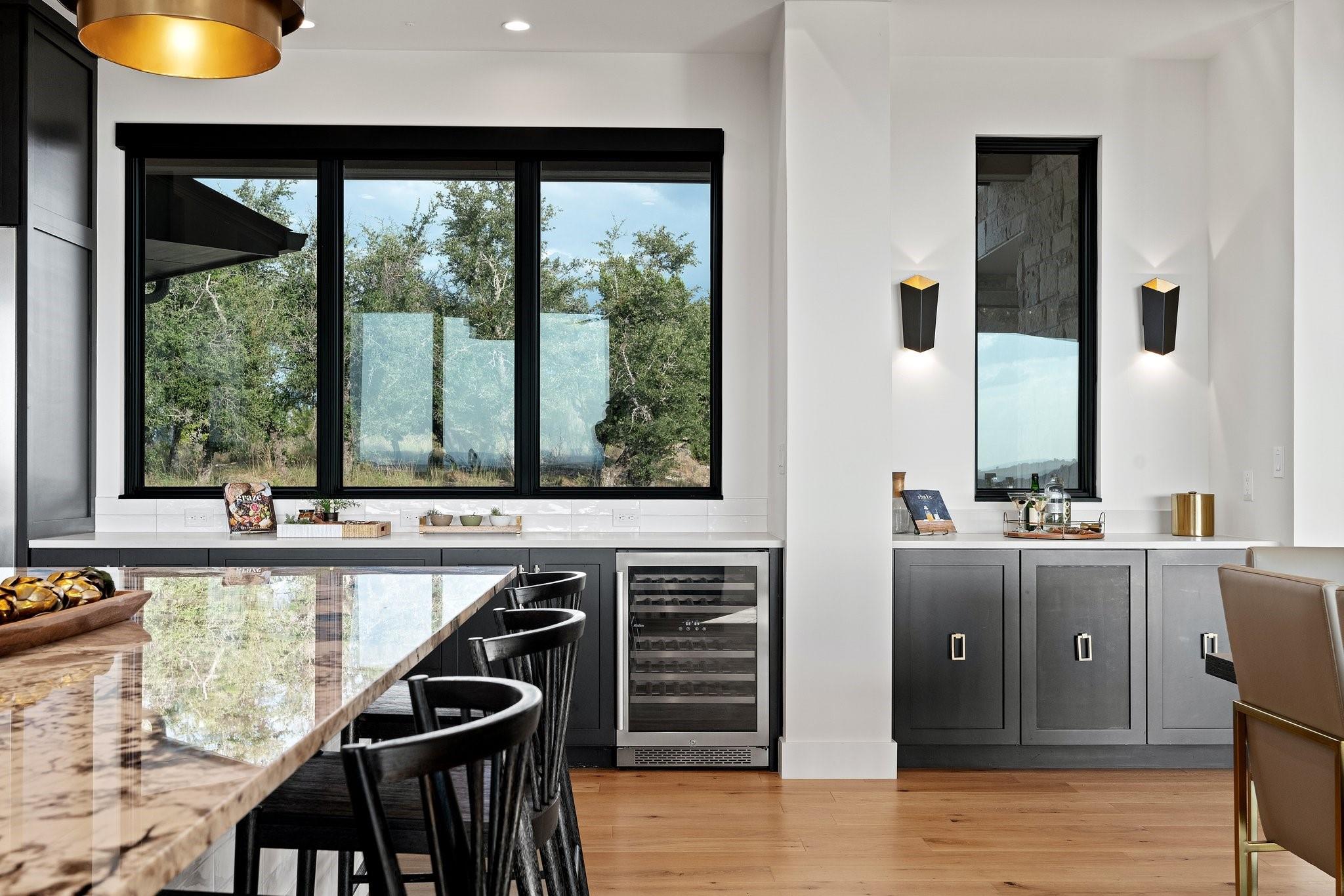 Stunning modern masterpiece graciously nestled atop 28+ private acres with breathtaking panoramic views of the Texas Hill Country. Built in 2018 by the renowned John Siemering Custom Homes. A brilliantly designed gourmet-style kitchen is the heart of this exquisite home and a culinary enthusiast's dream, featuring top-of-the-line stainless Thermador appliances, a 6-burner gas range with a griddle and double ovens, custom commercial-grade vent hood, side-by-side built-in fridge and freezer, two deep oversized sinks, a wine fridge, large walk-in pantry, and an abundance of gorgeous custom black cabinetry with elegant brass hardware creating an eye-catching contrast against the crisp white walls and clean lines of the designer backsplash. The generous granite island serves as the centerpiece of this gorgeous kitchen, providing a dreamy space for cooking, entertaining and gathering with family and friends. The kitchen and dining flow easily into the main living spaces which are beautifully enhanced by soaring wood-beamed ceilings, white oak hardwood floors, a stunning fireplace with custom stone hearth and hand-crafted built-ins, adding warmth and refinement. Bathed in natural light with an abundance of windows and floor-to-ceiling glass doors, spectacular views of the tranquil rolling hills can be seen for miles and miles. Practicality and efficiency are paramount in this extraordinary property, equipped with a deep water well, a whole-house reverse osmosis and water purification system, three zoned HVAC systems, tankless hot water heaters, motorized shades throughout, custom AV wiring for sound, data and security, highly-efficient foam insulation. With almost 29 unobstructed acres, there are endless opportunities for further enhancements such as a pool, extended outdoor living spaces, a guesthouse, sport courts, a barndominium, barns, a workshop, additional garage space for the car enthusiast, and more. No HOA. Low tax rate. Dripping Springs ISD.