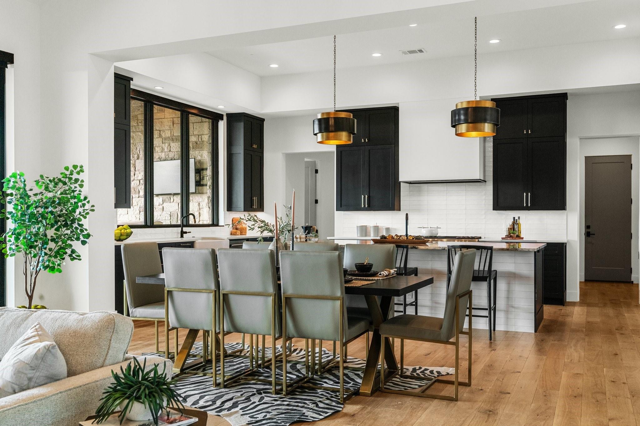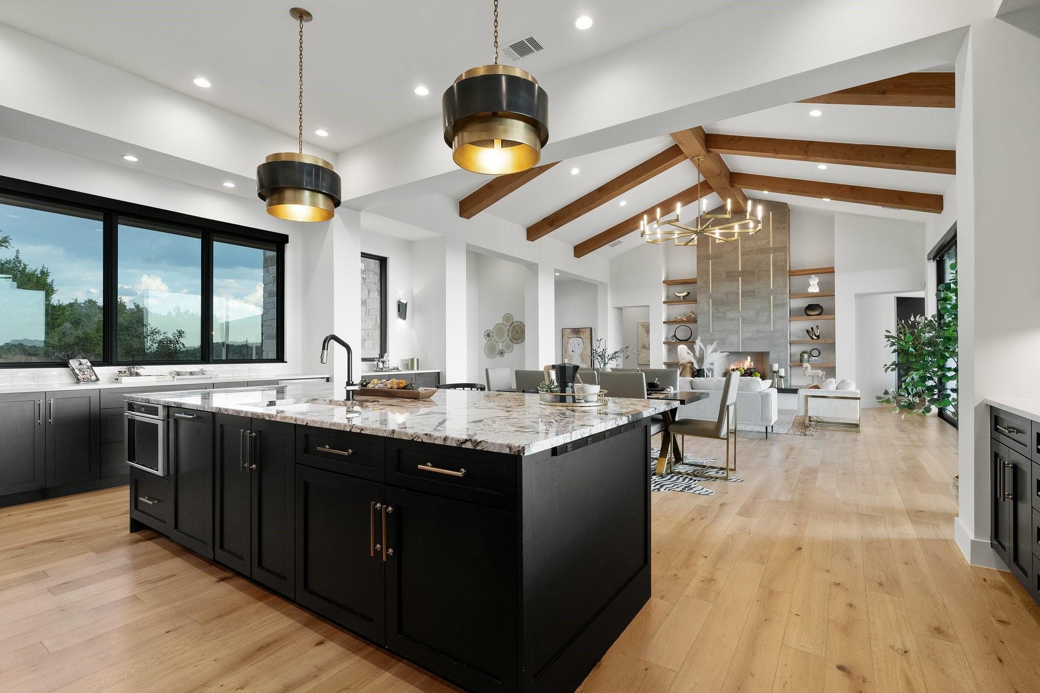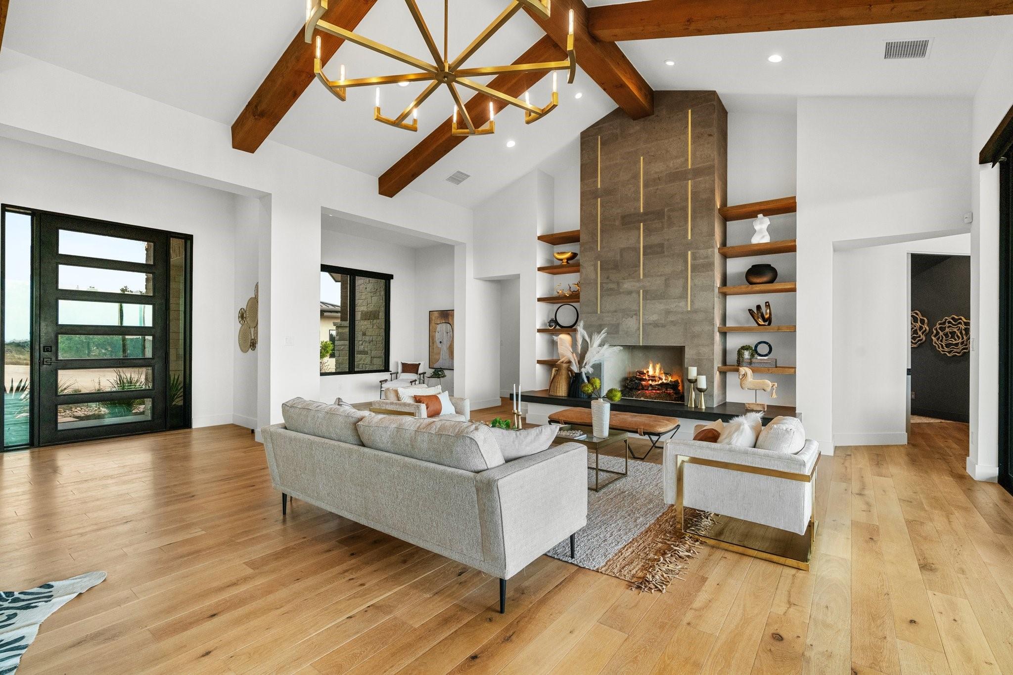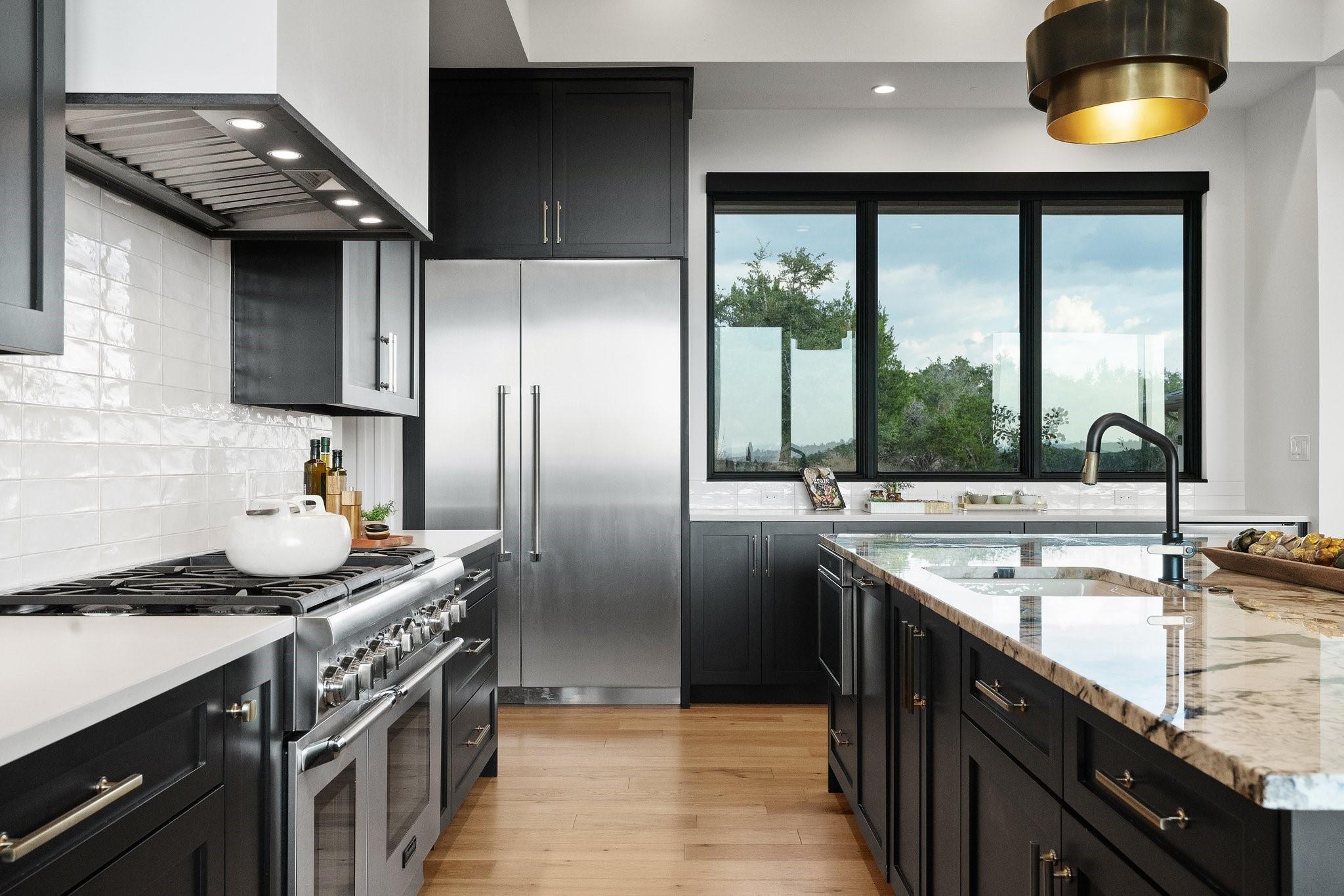 Stunning modern masterpiece graciously nestled atop 28+ private acres with breathtaking panoramic views of the Texas Hill Country. Built in 2018 by the renowned John Siemering Custom Homes. A brilliantly designed gourmet-style kitchen is the heart of this exquisite home and a culinary enthusiast's dream, featuring top-of-the-line stainless Thermador appliances, a 6-burner gas range with a griddle and double ovens, custom commercial-grade vent hood, side-by-side built-in fridge and freezer, two deep oversized sinks, a wine fridge, large walk-in pantry, and an abundance of gorgeous custom black cabinetry with elegant brass hardware creating an eye-catching contrast against the crisp white walls and clean lines of the designer backsplash. The generous granite island serves as the centerpiece of this gorgeous kitchen, providing a dreamy space for cooking, entertaining and gathering with family and friends. The kitchen and dining flow easily into the main living spaces which are beautifully enhanced by soaring wood-beamed ceilings, white oak hardwood floors, a stunning fireplace with custom stone hearth and hand-crafted built-ins, adding warmth and refinement. Bathed in natural light with an abundance of windows and floor-to-ceiling glass doors, spectacular views of the tranquil rolling hills can be seen for miles and miles. Practicality and efficiency are paramount in this extraordinary property, equipped with a deep water well, a whole-house reverse osmosis and water purification system, three zoned HVAC systems, tankless hot water heaters, motorized shades throughout, custom AV wiring for sound, data and security, highly-efficient foam insulation. With almost 29 unobstructed acres, there are endless opportunities for further enhancements such as a pool, extended outdoor living spaces, a guesthouse, sport courts, a barndominium, barns, a workshop, additional garage space for the car enthusiast, and more. No HOA. Low tax rate. Dripping Springs ISD.