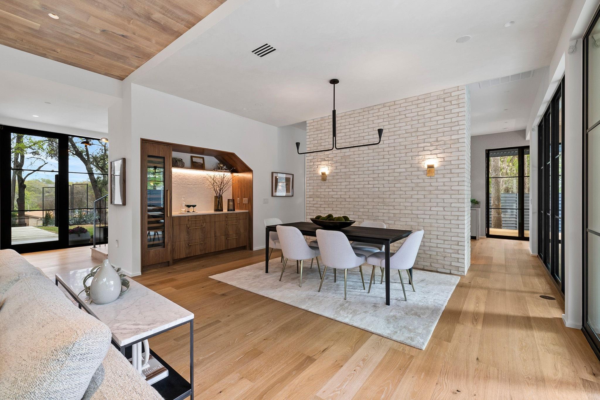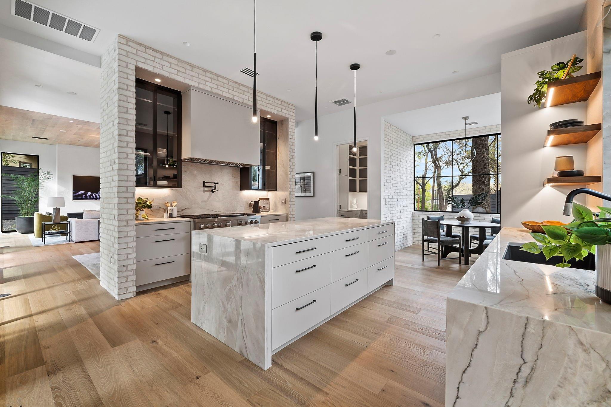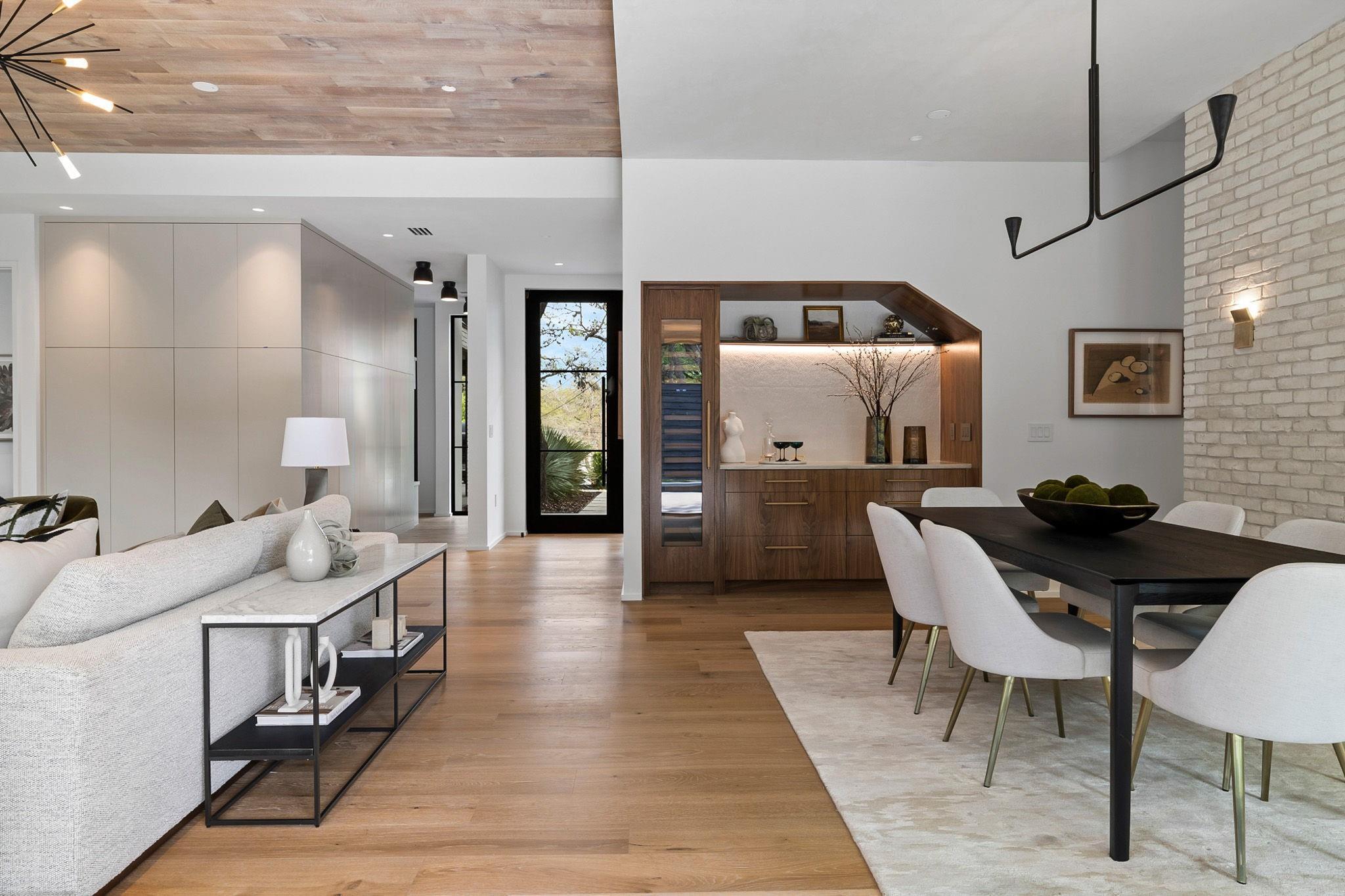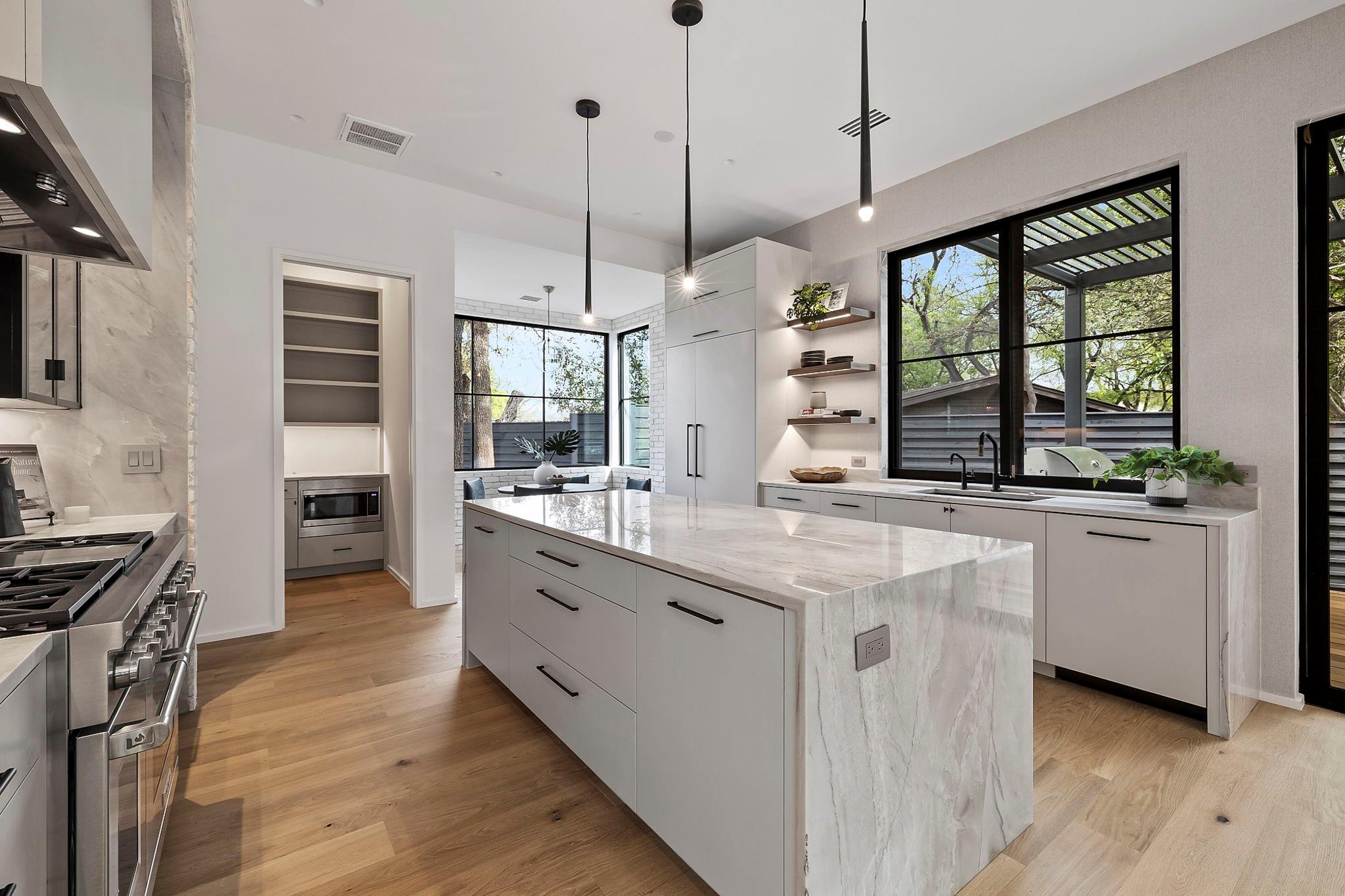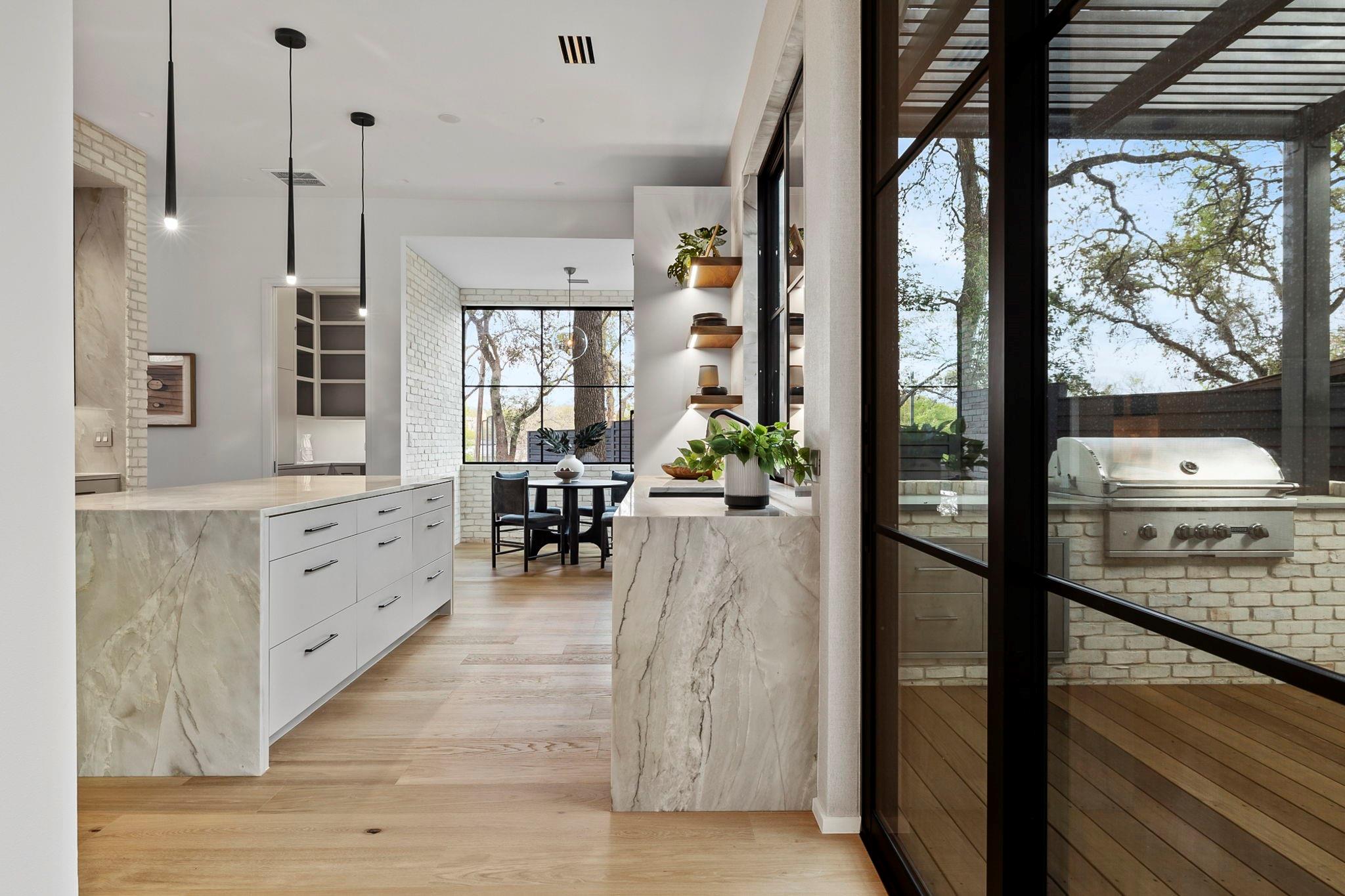 This timeless, transitional-modern property from Mosier Luxury Homes melds sophisticated finishes with discerning design. Stunning epicurean kitchen with state-of-the-art Wolf/SubZero appliances, custom cabinetry brilliantly illuminated by Restoration Hardware pendants, and Denali Quartzite throughout the kitchen including range walls, waterfalls, and pantry. The dining room is enhanced by a gorgeous backdrop of brick harmonized with Kelly Wearstler and Peter Bristol lighting. A sophisticated custom wet bar is elevated by SubZero wine storage with dual temp zones and Wi-Fi-enabled features. Escape to the primary suite located on the main level with private access to the pool and outdoor living retreat. Tranquil owner’s bath with designer tile, an elegant quartzite vanity, a free-standing soaking tub, and a spacious walk-in shower surrounded by natural light from the oversized window. A flex room plus 3 bedrooms are located on the 2nd floor and an incredible indoor/outdoor bonus space featuring a balcony nestled among the tree tops spans the third level. A beautifully constructed, peaceful retreat with close proximity to downtown and walking distance to Lady Bird Lake, close to the famed Muni golf course, a flagship new HEB, and Barton Springs. Zoned to esteemed Tarrytown schools.. The perfect blend of luxury and functionality - A MUST SEE!