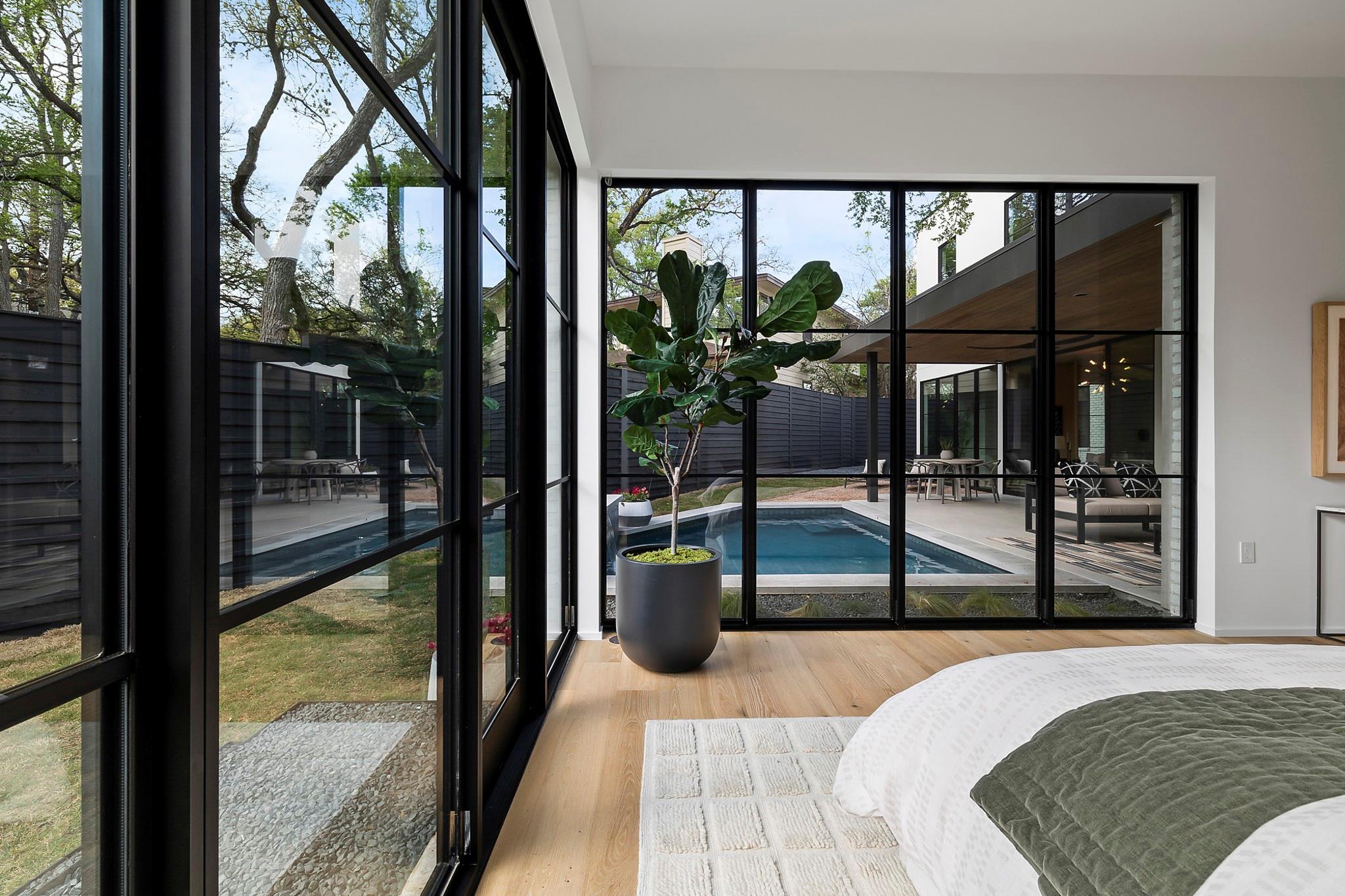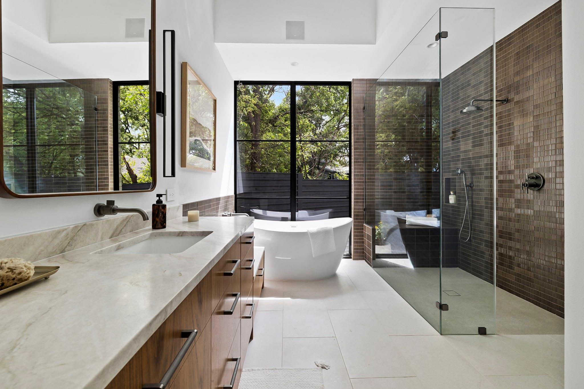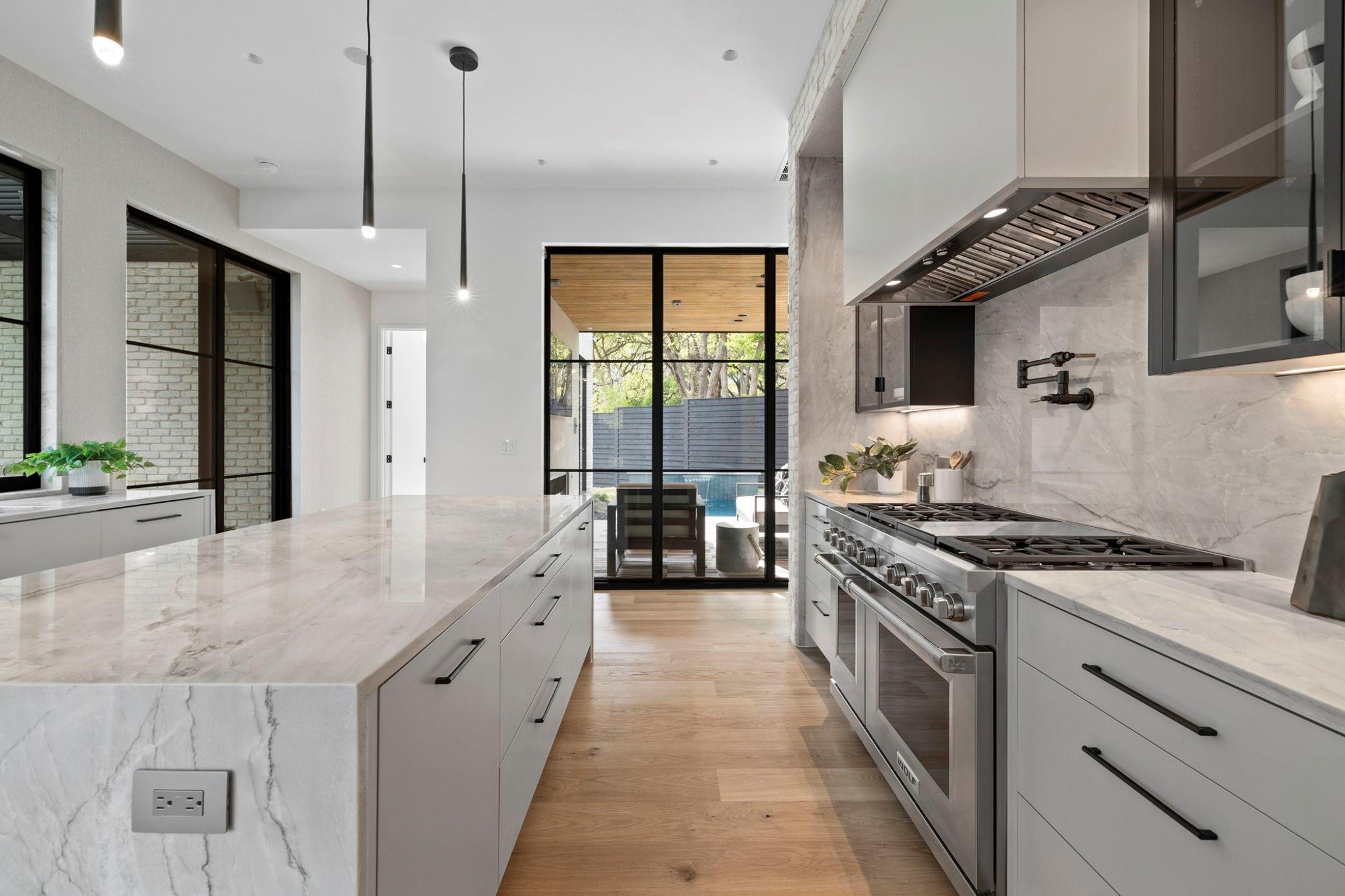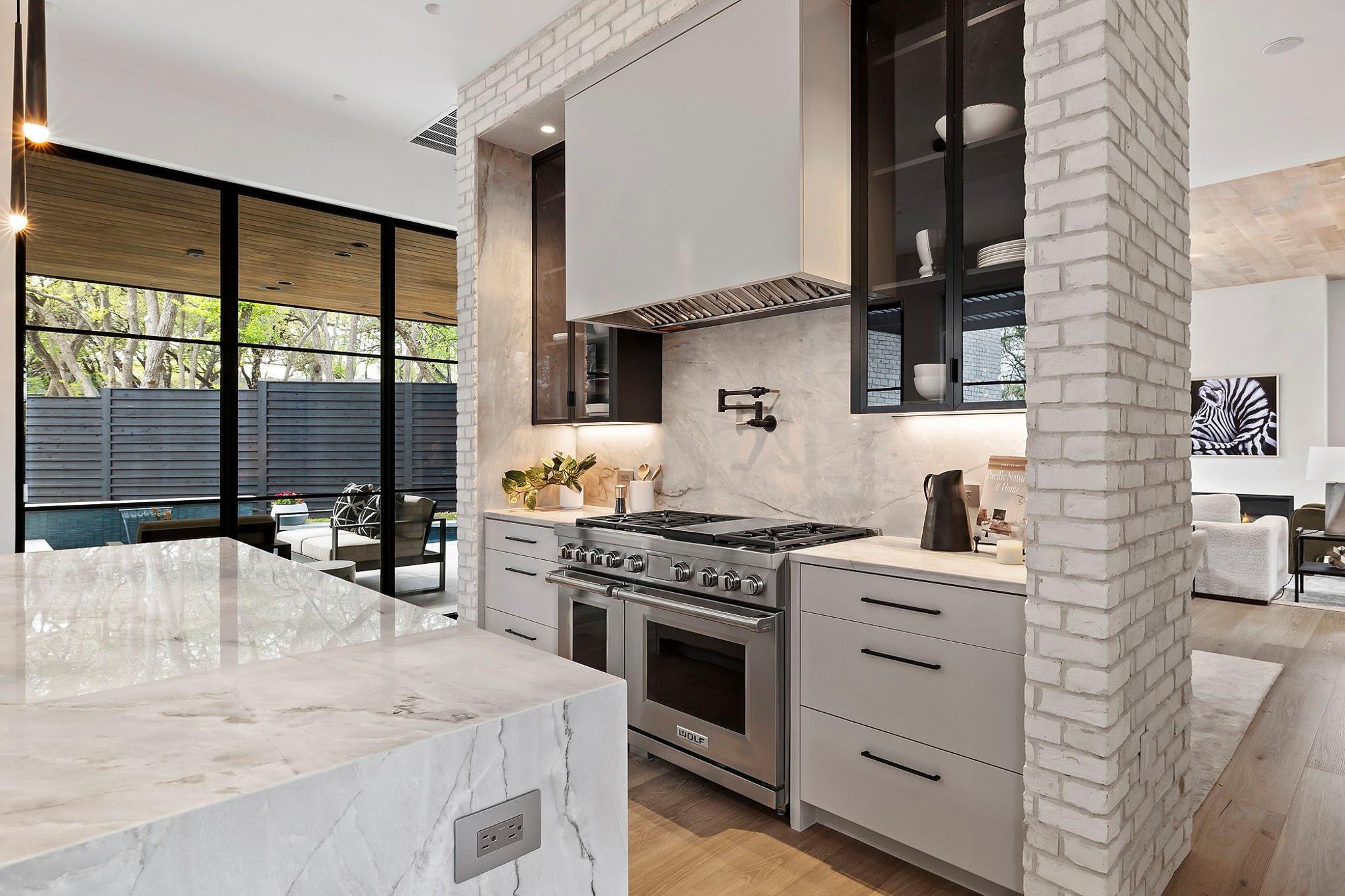 This timeless, transitional-modern property from Mosier Luxury Homes melds sophisticated finishes with discerning design. Stunning epicurean kitchen with state-of-the-art Wolf/SubZero appliances, custom cabinetry brilliantly illuminated by Restoration Hardware pendants, and Denali Quartzite throughout the kitchen including range walls, waterfalls, and pantry. The dining room is enhanced by a gorgeous backdrop of brick harmonized with Kelly Wearstler and Peter Bristol lighting. A sophisticated custom wet bar is elevated by SubZero wine storage with dual temp zones and Wi-Fi-enabled features. Escape to the primary suite located on the main level with private access to the pool and outdoor living retreat. Tranquil owner’s bath with designer tile, an elegant quartzite vanity, a free-standing soaking tub, and a spacious walk-in shower surrounded by natural light from the oversized window. A flex room plus 3 bedrooms are located on the 2nd floor and an incredible indoor/outdoor bonus space featuring a balcony nestled among the tree tops spans the third level. A beautifully constructed, peaceful retreat with close proximity to downtown and walking distance to Lady Bird Lake, close to the famed Muni golf course, a flagship new HEB, and Barton Springs. Zoned to esteemed Tarrytown schools.. The perfect blend of luxury and functionality - A MUST SEE!