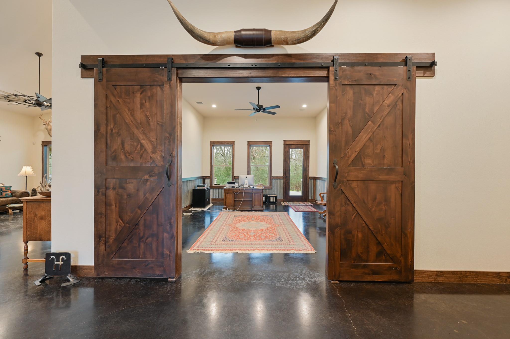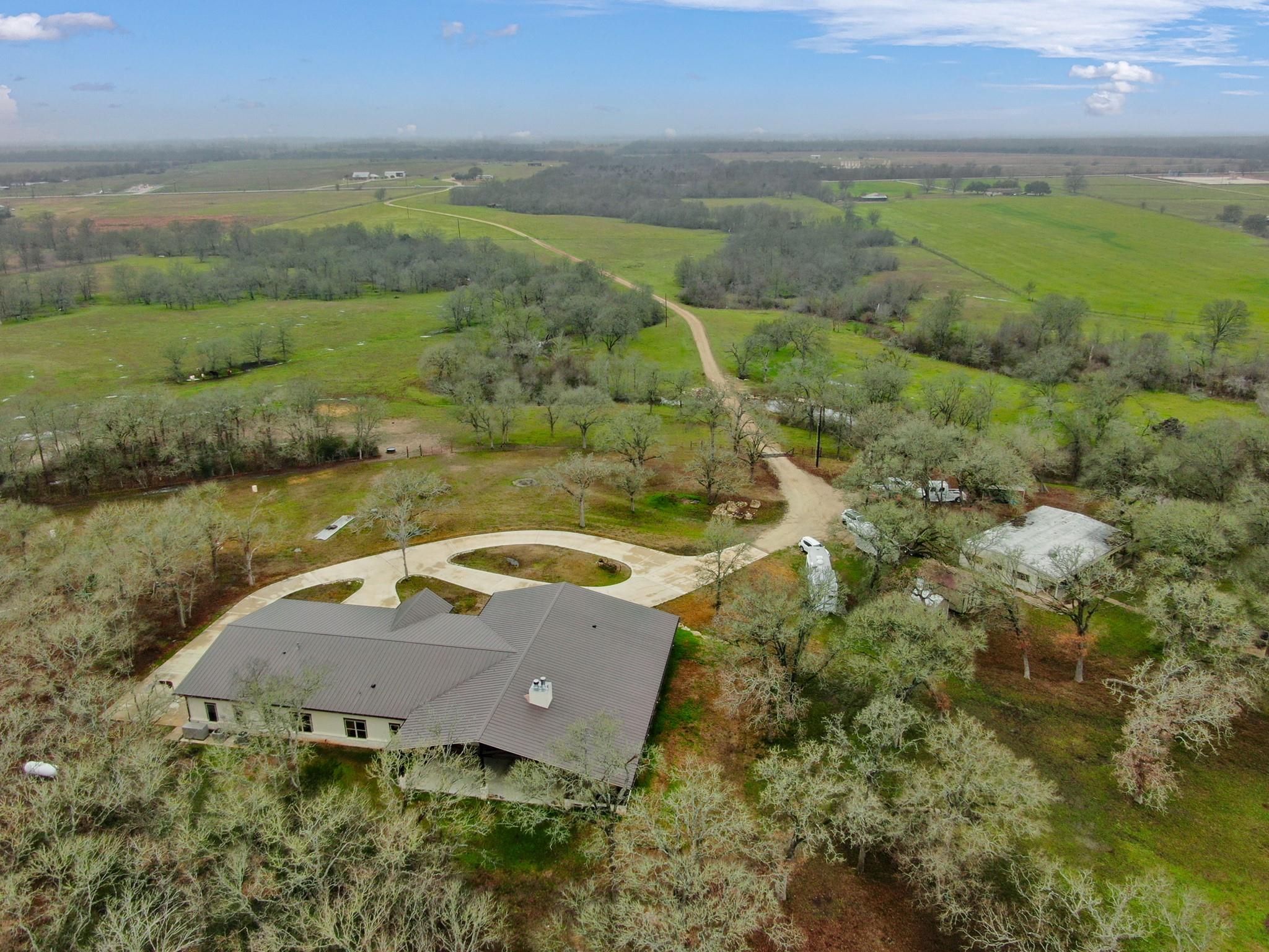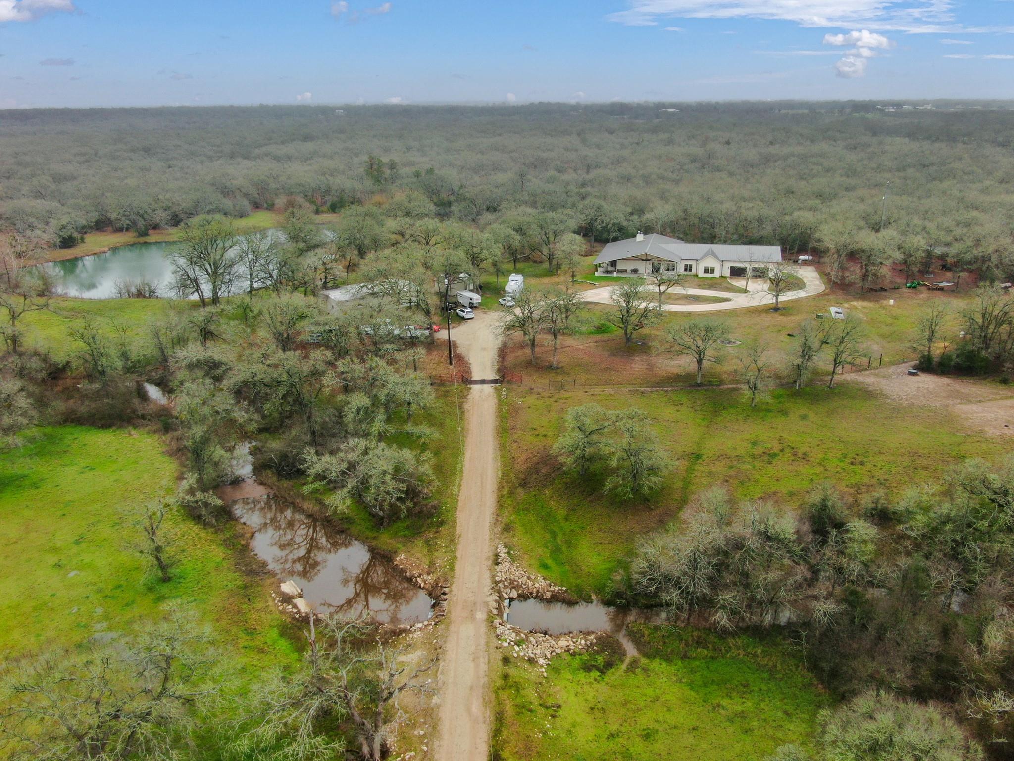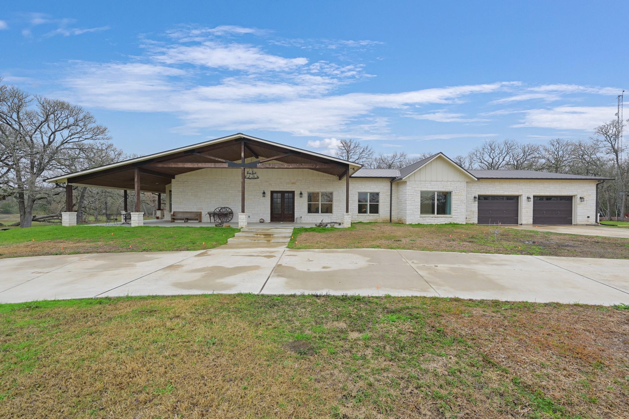 Sincerely stunning & one of a kind custom country home on 114 acres provides you luxury living at its finest! With open and wooded areas, wildlife or livestock lovers will be right at home! This rural stunner was built in 2018, and you will find no detail left undone in this gorgeous open concept 4 bedroom, 4.5 bath home. You will love the stained concrete flooring, high ceilings, stone accents, upscale finishes, indoor and outdoor fireplaces, ample windows that provide natural light and views for days! Entertainers dream high end appliances, wet bar with “sonic ice” and giant eating bar! The bonus room is perfect for a game room or office and you will love all of the barn doors! There are ADA features including large doorways/hallways & walk in shower access! The massive pantry, mud room, laundry room & hidden safe room make this home check all the boxes. Along with the interior elegance, fall in love with nature while you enjoy paved driveway access, 4 car garage with additional storage space, porches all around, fenced yard, outdoor kitchen & additional 1920 sqft 2/1 bath Barndo guest house, lake and stocked ponds & plenty of outside space for breathing room. Cattle or horse ranch dreams are found here!!