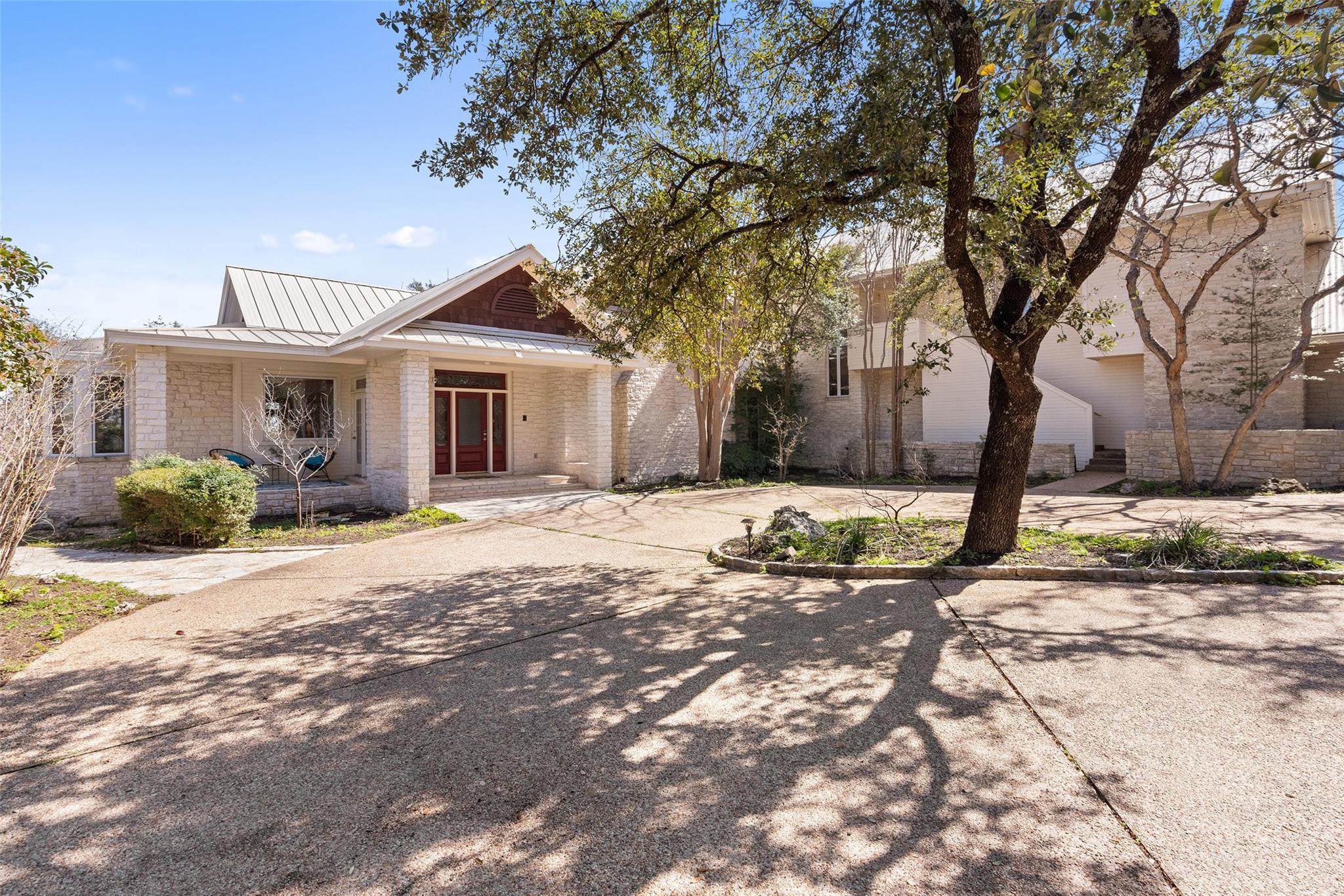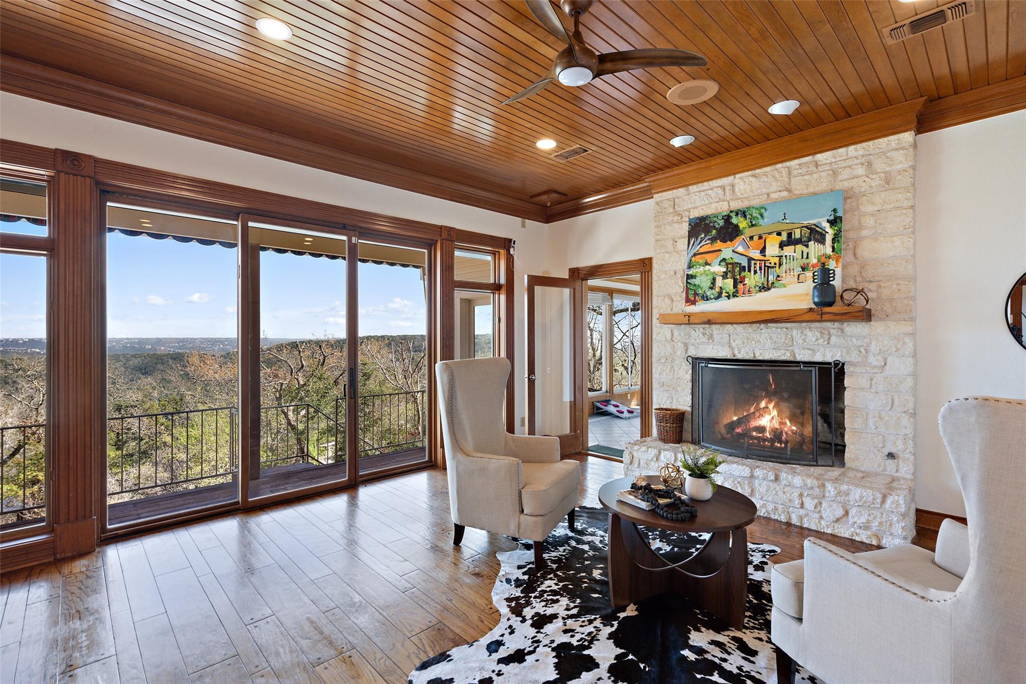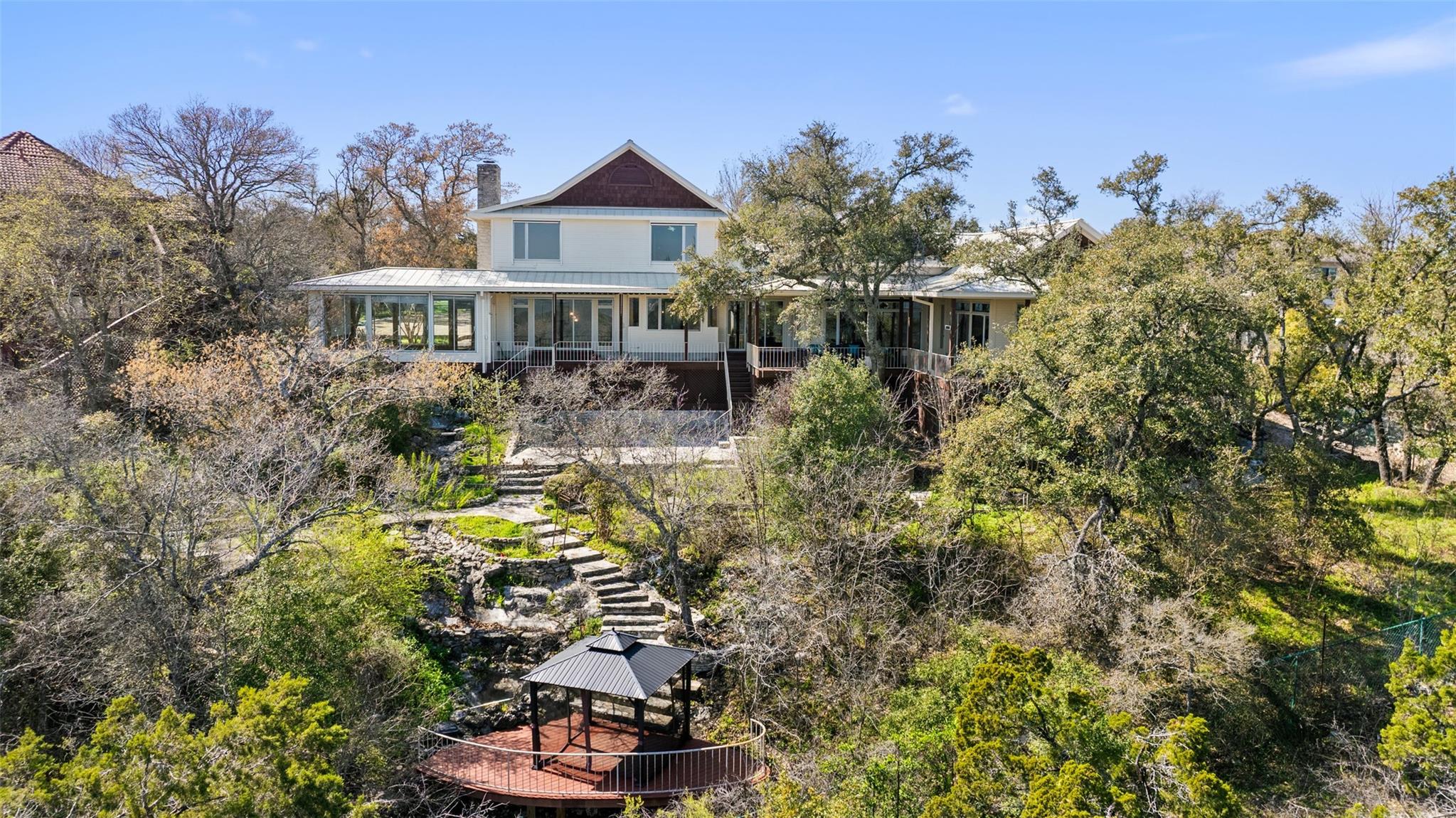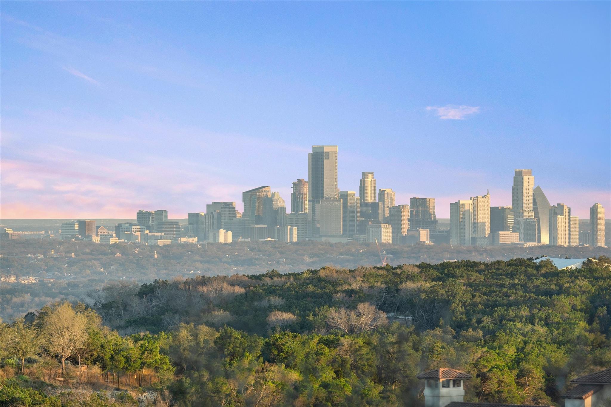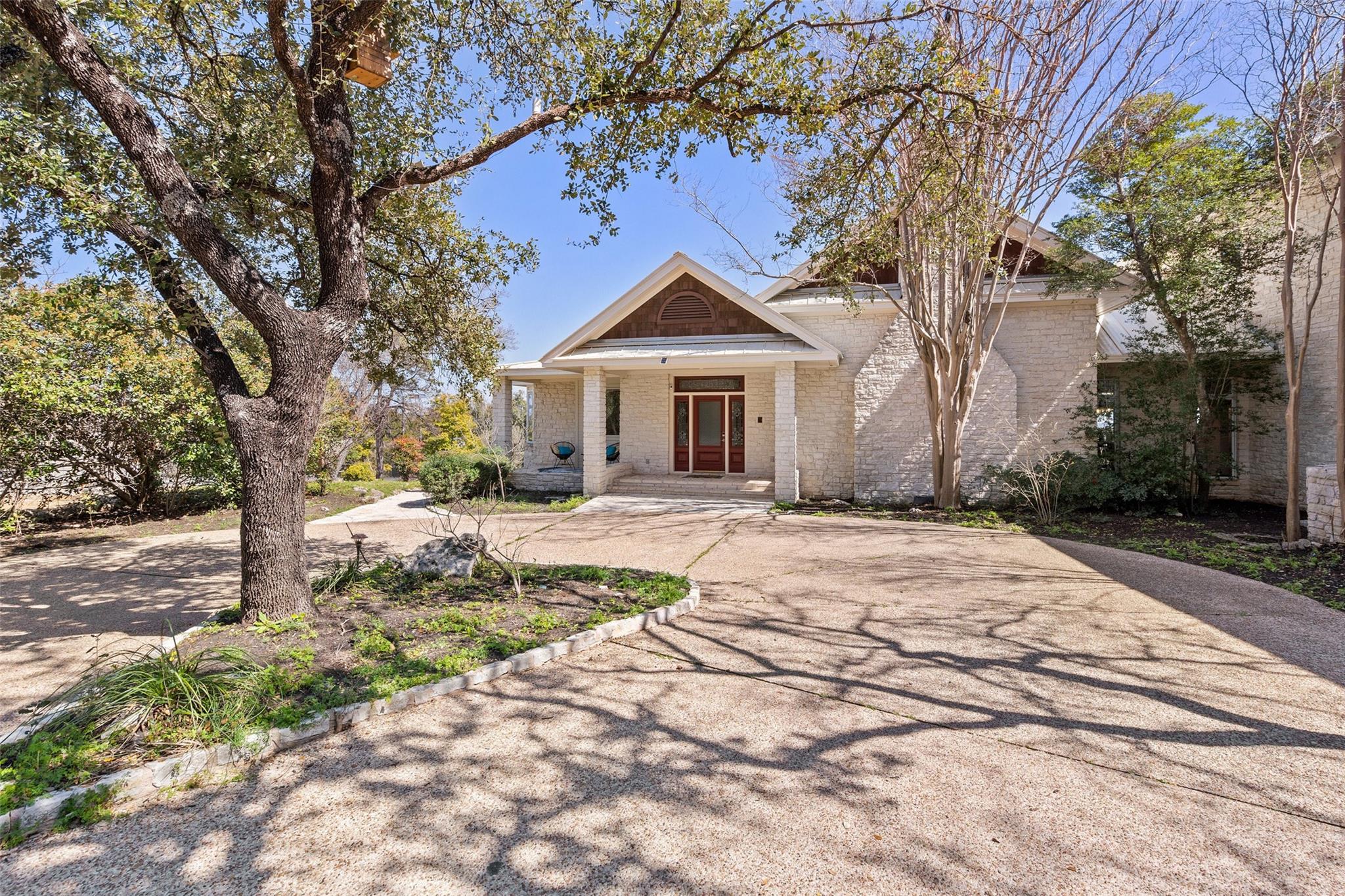 Nestled on a 1.6-acre lot in the coveted 78730 zip code, this breathtaking 5-bed/3.5 & 1/4-bath residence is the epitome of luxury living with unmatched hill country and downtown skyline views. As you approach this stunning home, a circular driveway embraced by tall trees leads you to a front porch and private entrance. Step inside to find elegant stone flooring in the entryway, seamlessly transitioning to rich wood flooring throughout the common areas. The home boasts a solar system, a full back wall of panoramic windows, high beamed cathedral ceilings, recessed lighting, and a stone-built wood/gas fireplace. Adjacent to the gourmet kitchen, opposite the great room is an additional cozy living area with its own fireplace. The kitchen is equipped with stainless steel appliances and dual center islands. Recessed lighting, granite countertops, stylish light fixtures, and a butler's pantry complete this chef's dream. Both the dining area and kitchen are bathed in natural light, offering serene hill country views. Step out onto the wrap-around balcony, with exterior steps descending to the backyard, a private oasis adorned with tall trees, native landscaping, a koi pond, and a gazebo, perfect for entertaining or tranquil relaxation. A sunroom and a greenhouse, both with tile flooring provide additional space for relaxation and protecting your plants. The owner's suite is spacious with a ceiling fan, slate flooring, and panoramic views. The en-suite bath features dual vanities, a deep jetted soaking tub, and a large walk-in shower. 2 secondary bedrooms are situated on the 2nd level, each with large windows that invite ample light. There is a mother-in-law suite on the 2nd level accessed from a private entrance off the drive, complete with a full kitchen and 2 bedrooms, ideal for guests or as an income-generating rental. This property is more than a home; it's a lifestyle, offering a rare combination of privacy, luxury, and natural beauty.