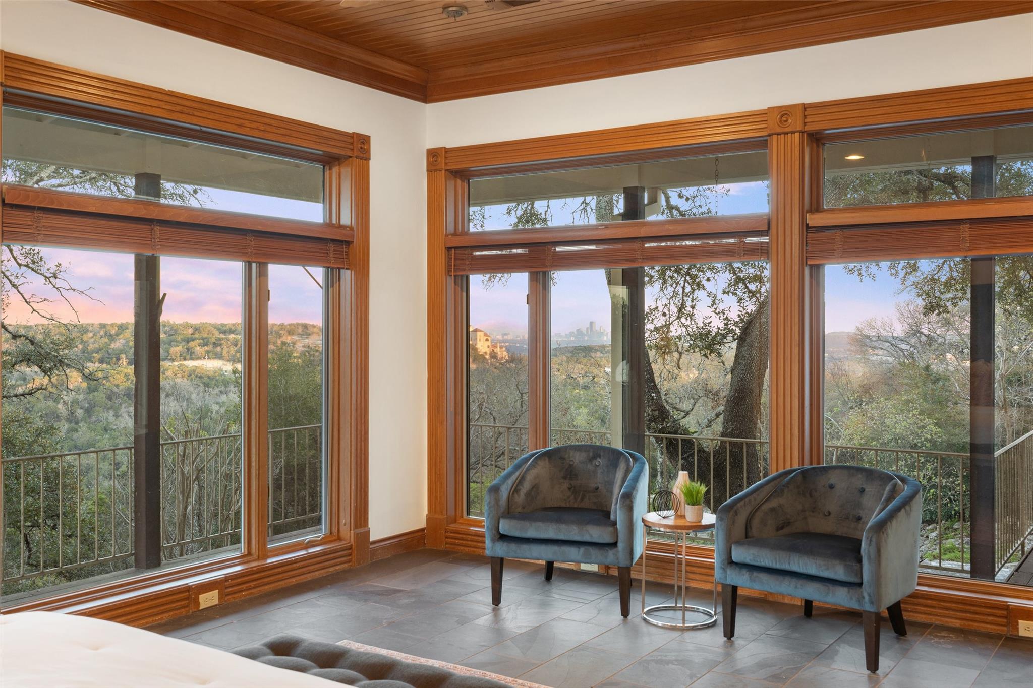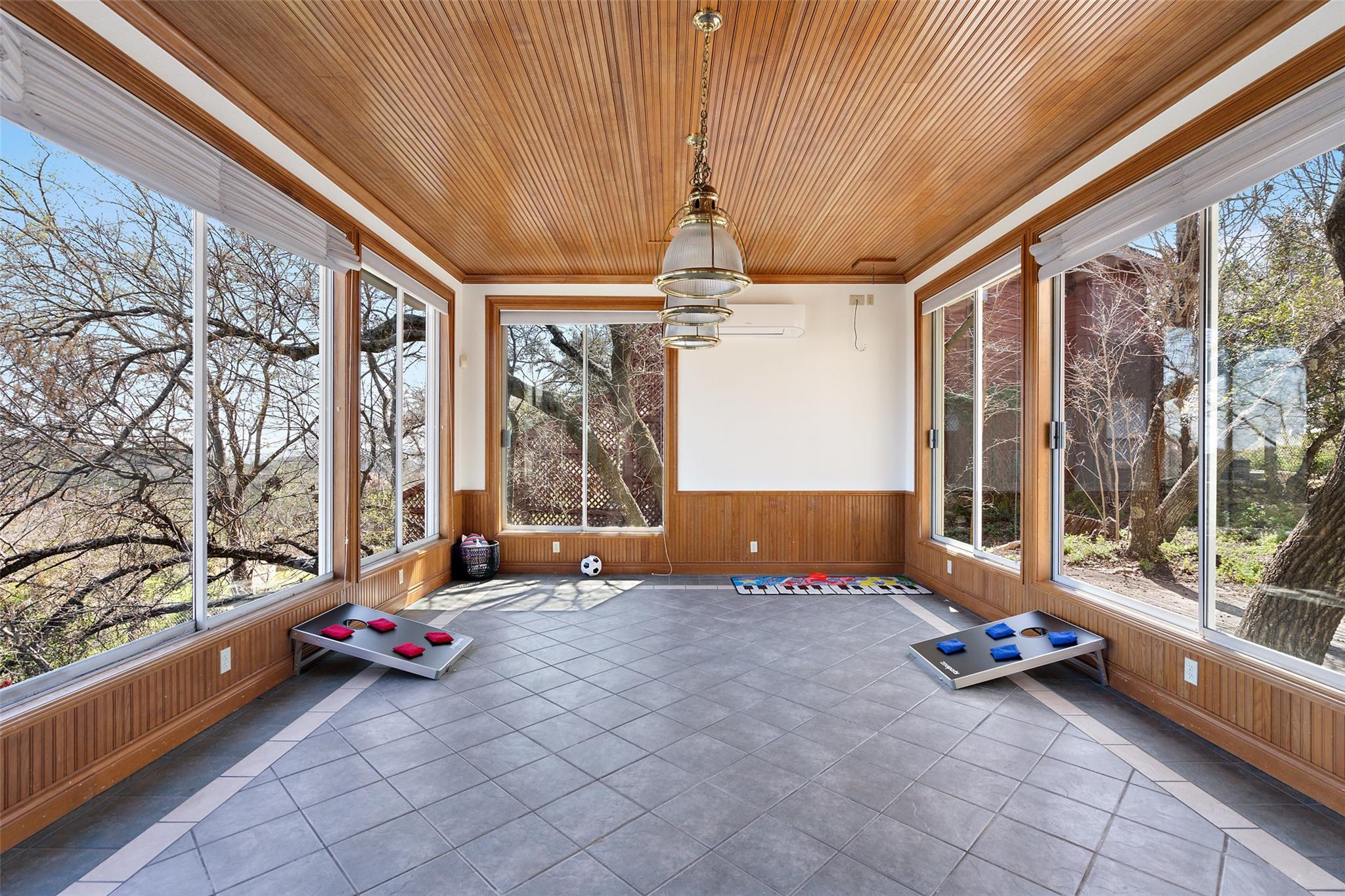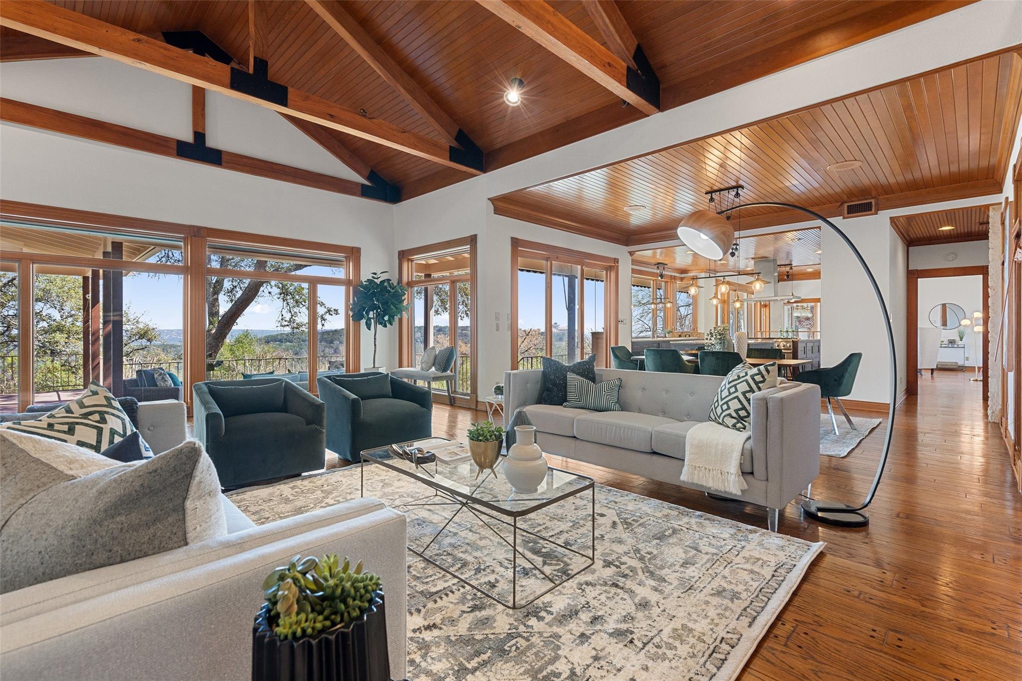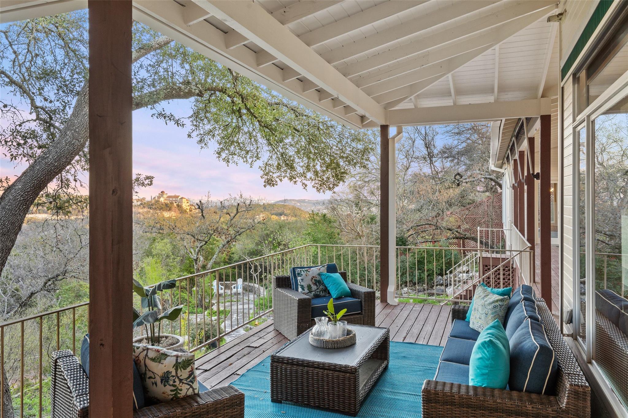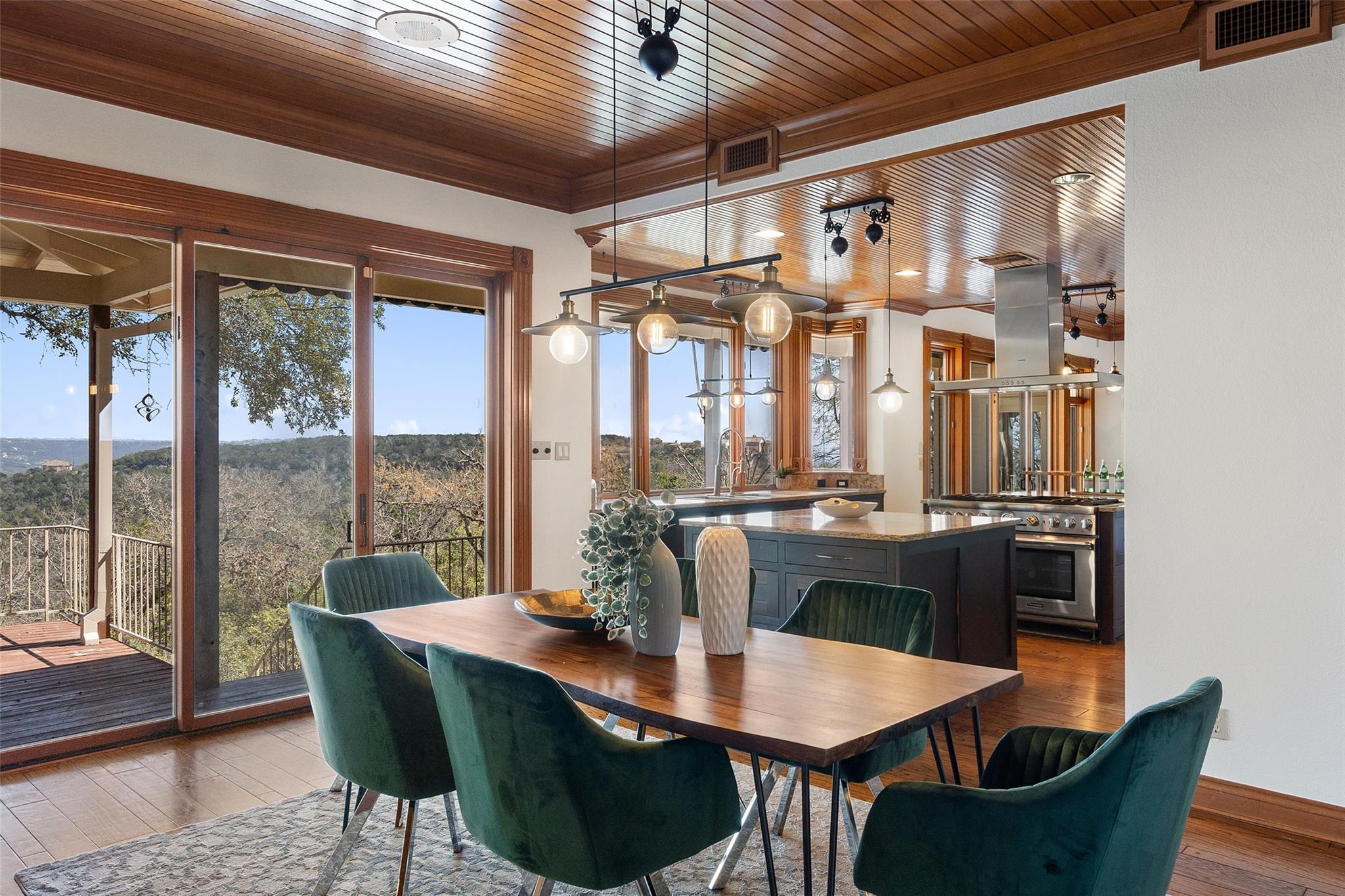 Nestled on a 1.6-acre lot in the coveted 78730 zip code, this breathtaking 5-bed/3.5 & 1/4-bath residence is the epitome of luxury living with unmatched hill country and downtown skyline views. As you approach this stunning home, a circular driveway embraced by tall trees leads you to a front porch and private entrance. Step inside to find elegant stone flooring in the entryway, seamlessly transitioning to rich wood flooring throughout the common areas. The home boasts a solar system, a full back wall of panoramic windows, high beamed cathedral ceilings, recessed lighting, and a stone-built wood/gas fireplace. Adjacent to the gourmet kitchen, opposite the great room is an additional cozy living area with its own fireplace. The kitchen is equipped with stainless steel appliances and dual center islands. Recessed lighting, granite countertops, stylish light fixtures, and a butler's pantry complete this chef's dream. Both the dining area and kitchen are bathed in natural light, offering serene hill country views. Step out onto the wrap-around balcony, with exterior steps descending to the backyard, a private oasis adorned with tall trees, native landscaping, a koi pond, and a gazebo, perfect for entertaining or tranquil relaxation. A sunroom and a greenhouse, both with tile flooring provide additional space for relaxation and protecting your plants. The owner's suite is spacious with a ceiling fan, slate flooring, and panoramic views. The en-suite bath features dual vanities, a deep jetted soaking tub, and a large walk-in shower. 2 secondary bedrooms are situated on the 2nd level, each with large windows that invite ample light. There is a mother-in-law suite on the 2nd level accessed from a private entrance off the drive, complete with a full kitchen and 2 bedrooms, ideal for guests or as an income-generating rental. This property is more than a home; it's a lifestyle, offering a rare combination of privacy, luxury, and natural beauty.