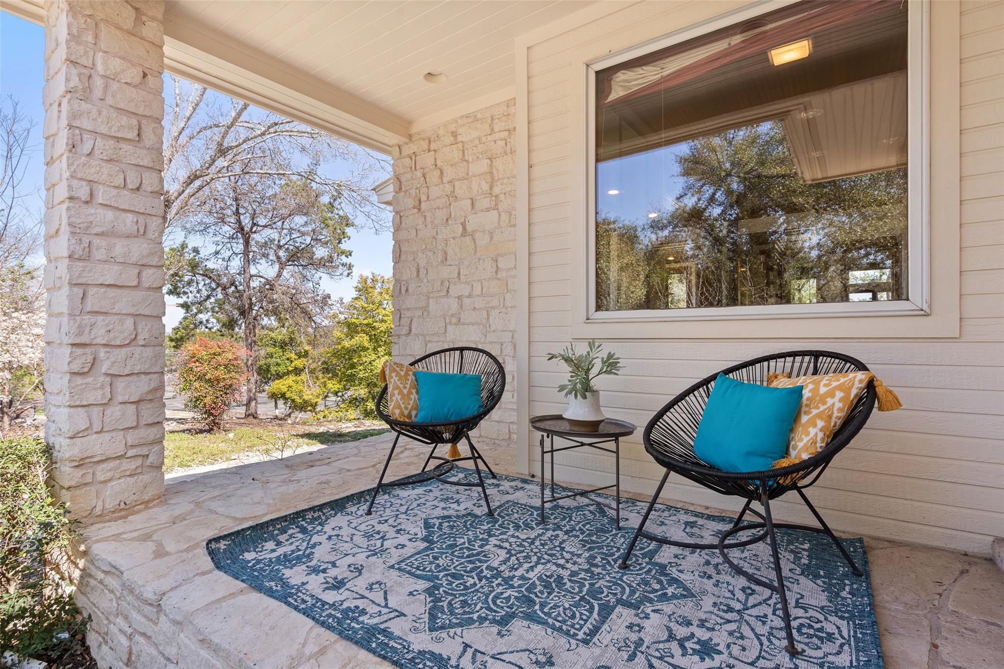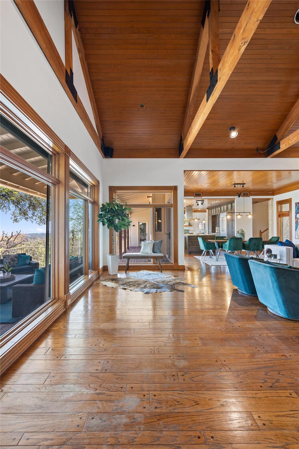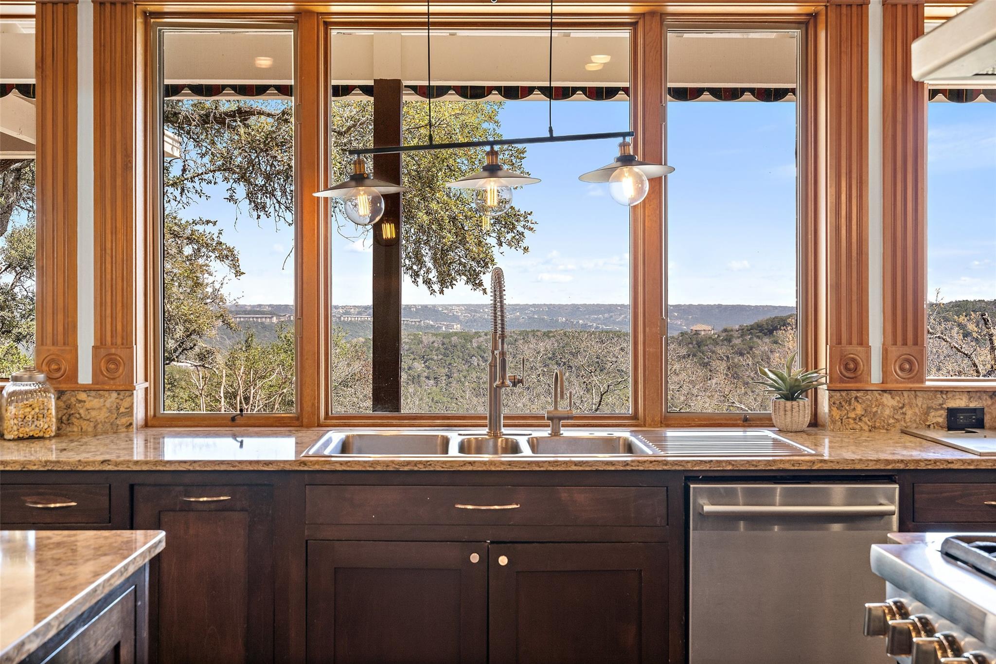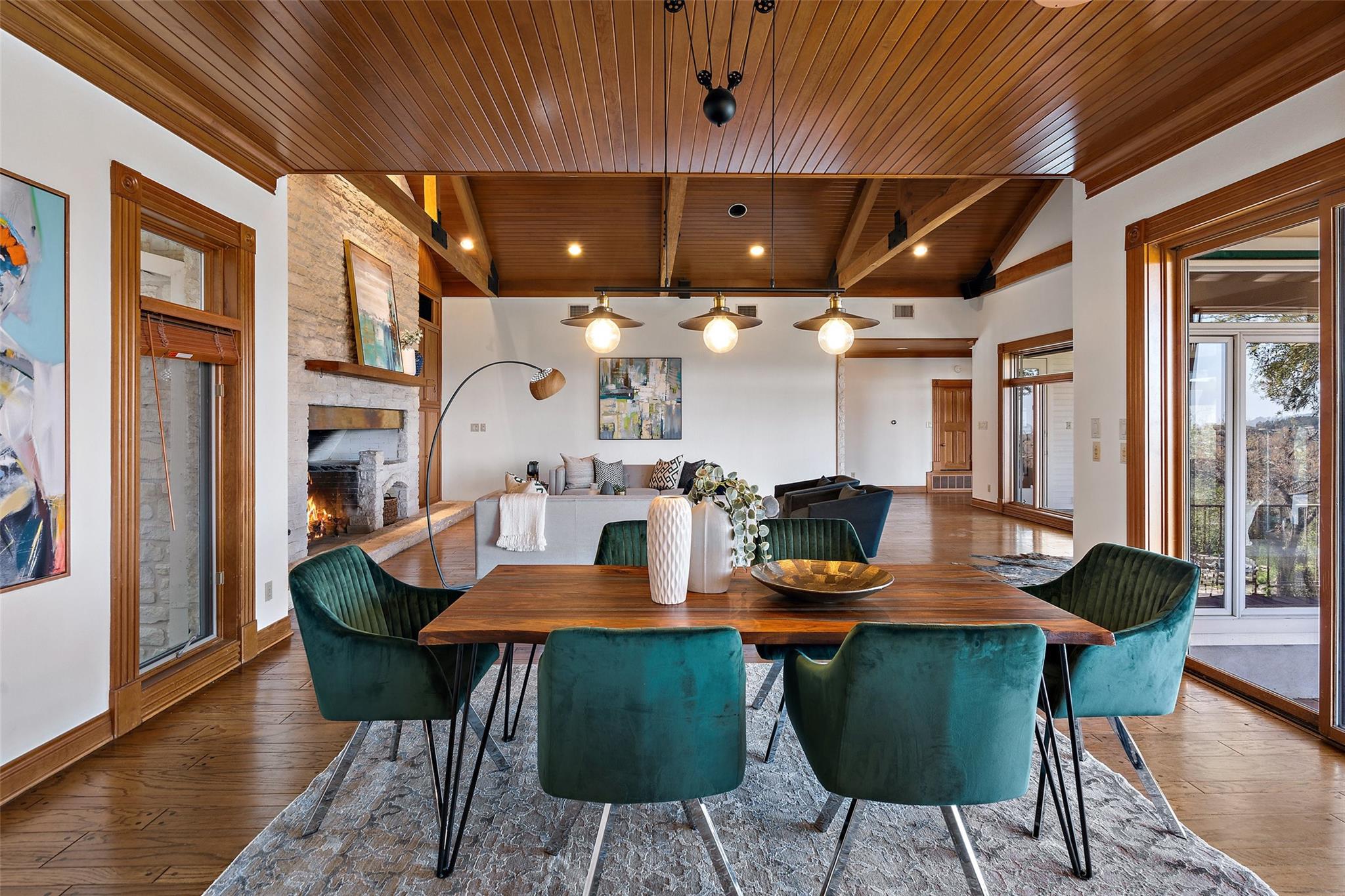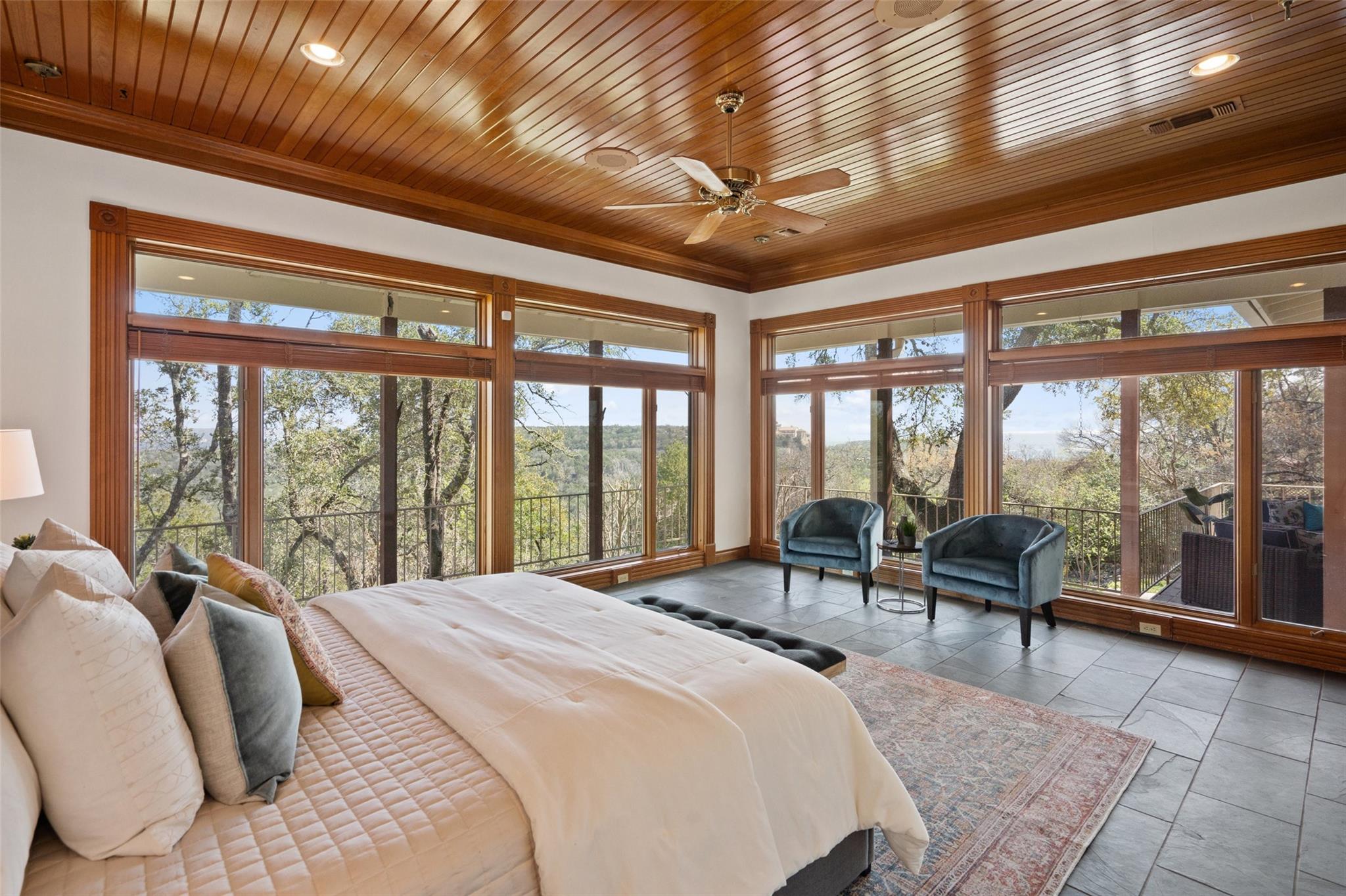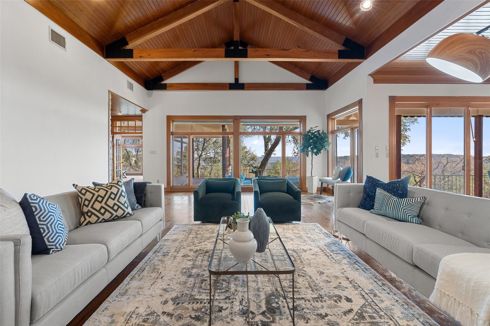 Nestled on a 1.6-acre lot in the coveted 78730 zip code, this breathtaking 5-bed/3.5 & 1/4-bath residence is the epitome of luxury living with unmatched hill country and downtown skyline views. As you approach this stunning home, a circular driveway embraced by tall trees leads you to a front porch and private entrance. Step inside to find elegant stone flooring in the entryway, seamlessly transitioning to rich wood flooring throughout the common areas. The home boasts a solar system, a full back wall of panoramic windows, high beamed cathedral ceilings, recessed lighting, and a stone-built wood/gas fireplace. Adjacent to the gourmet kitchen, opposite the great room is an additional cozy living area with its own fireplace. The kitchen is equipped with stainless steel appliances and dual center islands. Recessed lighting, granite countertops, stylish light fixtures, and a butler's pantry complete this chef's dream. Both the dining area and kitchen are bathed in natural light, offering serene hill country views. Step out onto the wrap-around balcony, with exterior steps descending to the backyard, a private oasis adorned with tall trees, native landscaping, a koi pond, and a gazebo, perfect for entertaining or tranquil relaxation. A sunroom and a greenhouse, both with tile flooring provide additional space for relaxation and protecting your plants. The owner's suite is spacious with a ceiling fan, slate flooring, and panoramic views. The en-suite bath features dual vanities, a deep jetted soaking tub, and a large walk-in shower. 2 secondary bedrooms are situated on the 2nd level, each with large windows that invite ample light. There is a mother-in-law suite on the 2nd level accessed from a private entrance off the drive, complete with a full kitchen and 2 bedrooms, ideal for guests or as an income-generating rental. This property is more than a home; it's a lifestyle, offering a rare combination of privacy, luxury, and natural beauty.
