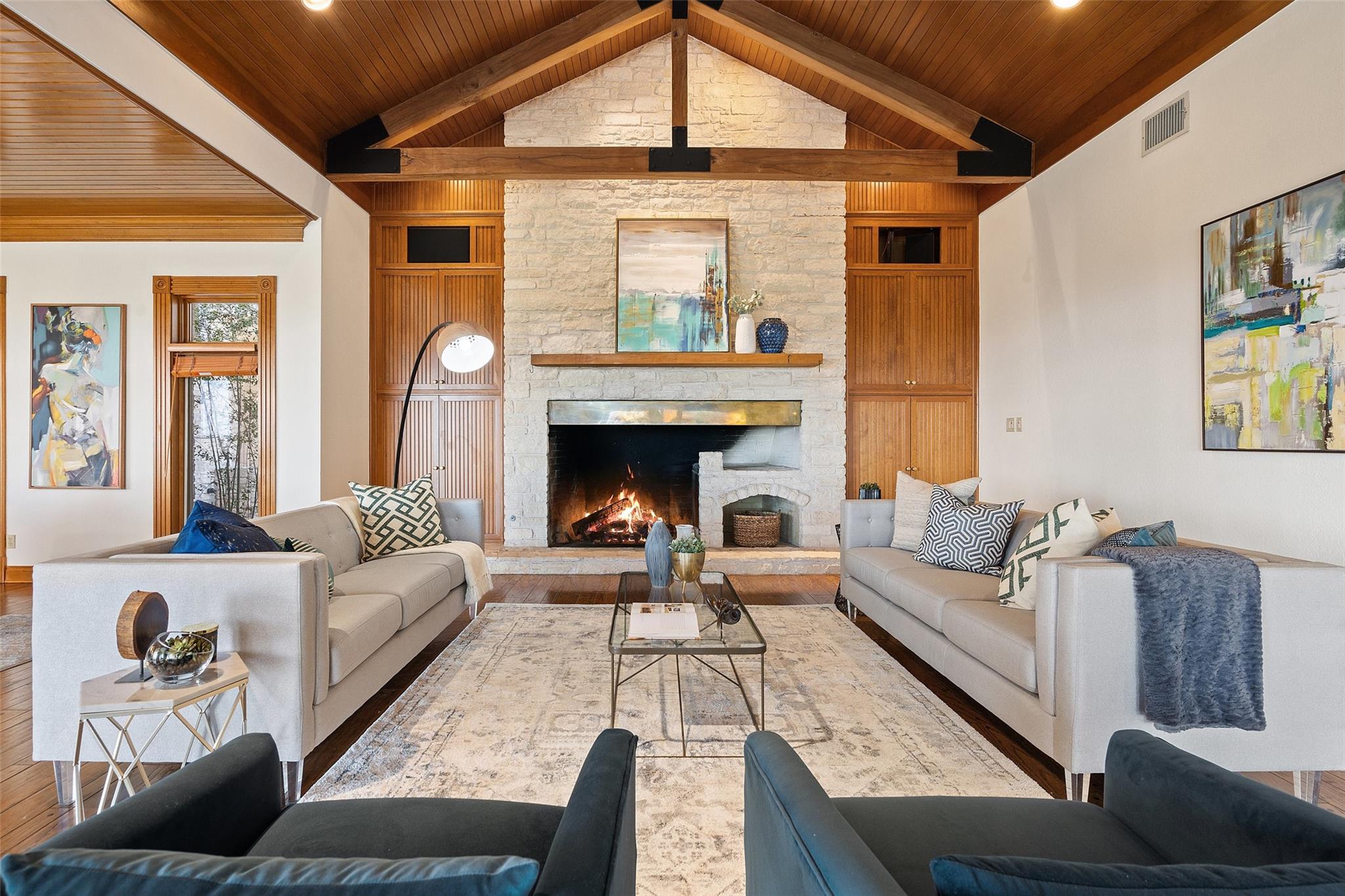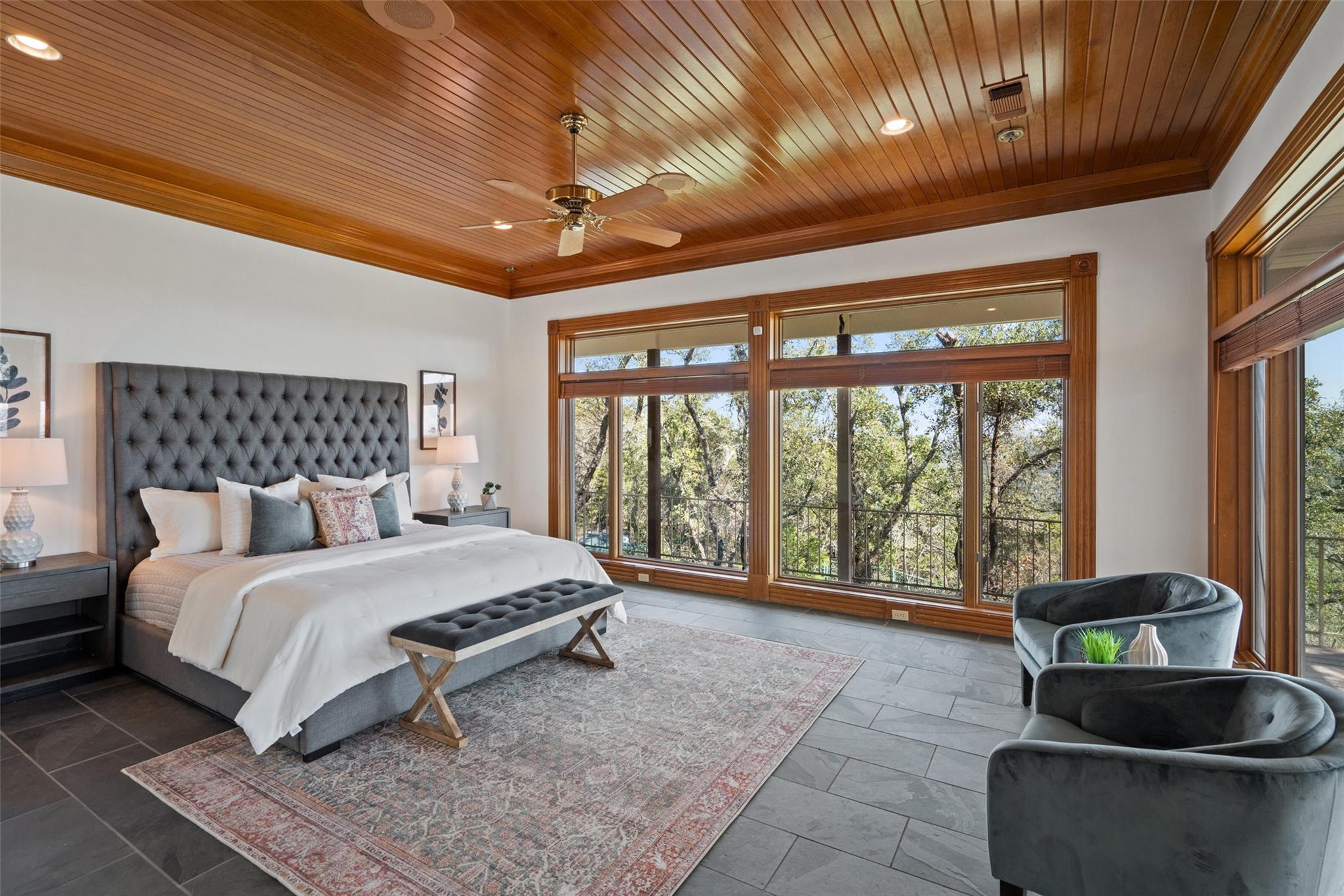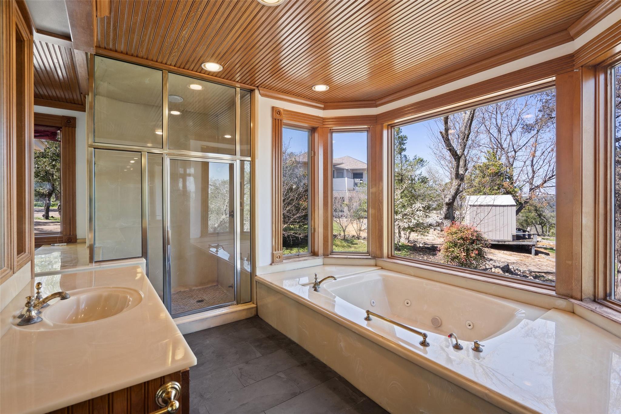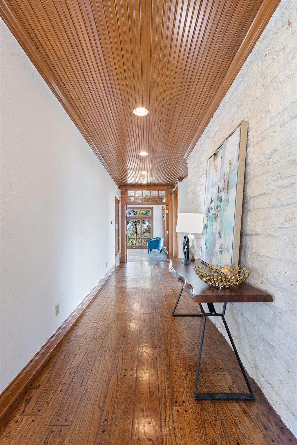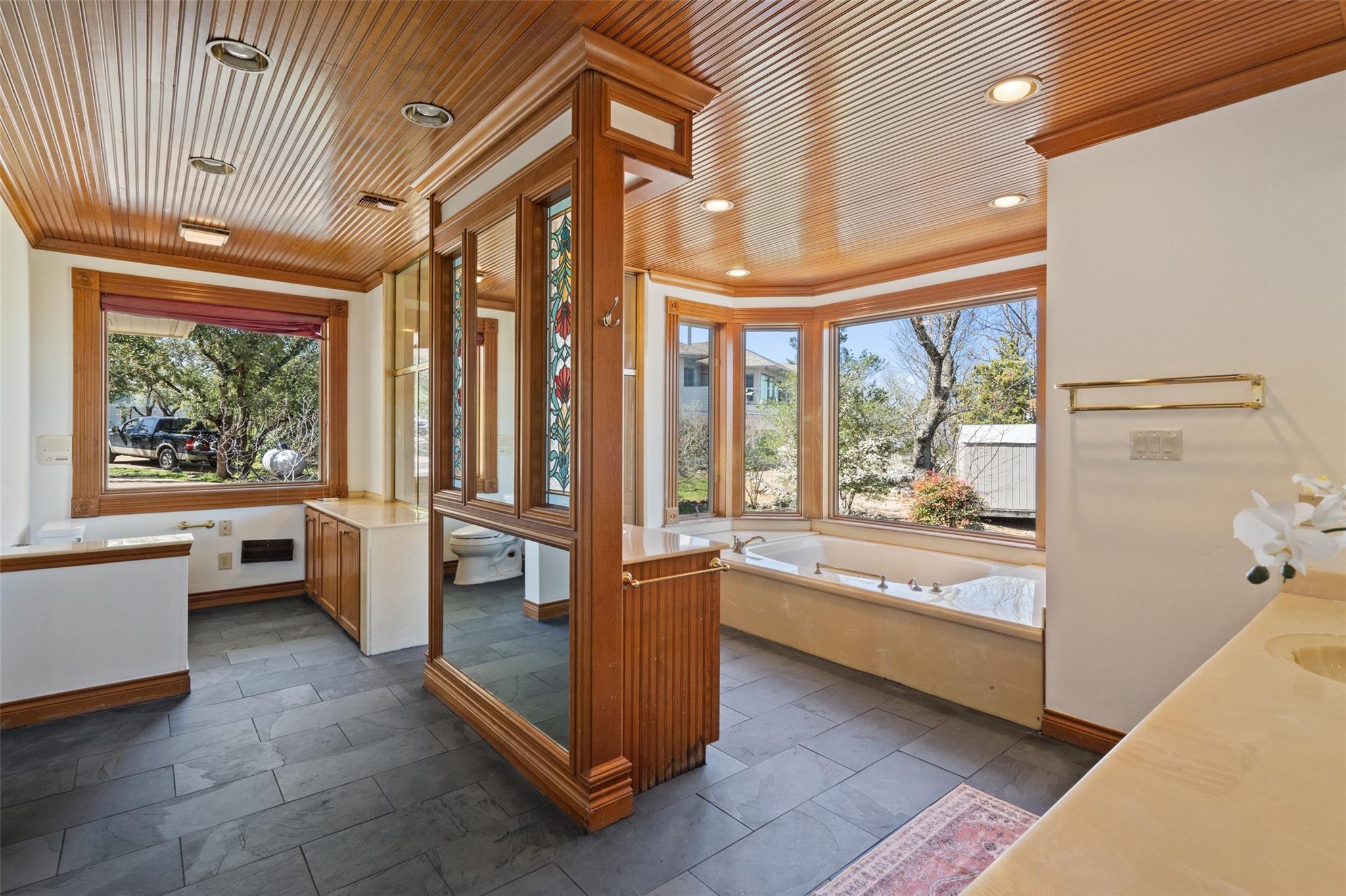 Nestled on a 1.6-acre lot in the coveted 78730 zip code, this breathtaking 5-bed/3.5 & 1/4-bath residence is the epitome of luxury living with unmatched hill country and downtown skyline views. As you approach this stunning home, a circular driveway embraced by tall trees leads you to a front porch and private entrance. Step inside to find elegant stone flooring in the entryway, seamlessly transitioning to rich wood flooring throughout the common areas. The home boasts a solar system, a full back wall of panoramic windows, high beamed cathedral ceilings, recessed lighting, and a stone-built wood/gas fireplace. Adjacent to the gourmet kitchen, opposite the great room is an additional cozy living area with its own fireplace. The kitchen is equipped with stainless steel appliances and dual center islands. Recessed lighting, granite countertops, stylish light fixtures, and a butler's pantry complete this chef's dream. Both the dining area and kitchen are bathed in natural light, offering serene hill country views. Step out onto the wrap-around balcony, with exterior steps descending to the backyard, a private oasis adorned with tall trees, native landscaping, a koi pond, and a gazebo, perfect for entertaining or tranquil relaxation. A sunroom and a greenhouse, both with tile flooring provide additional space for relaxation and protecting your plants. The owner's suite is spacious with a ceiling fan, slate flooring, and panoramic views. The en-suite bath features dual vanities, a deep jetted soaking tub, and a large walk-in shower. 2 secondary bedrooms are situated on the 2nd level, each with large windows that invite ample light. There is a mother-in-law suite on the 2nd level accessed from a private entrance off the drive, complete with a full kitchen and 2 bedrooms, ideal for guests or as an income-generating rental. This property is more than a home; it's a lifestyle, offering a rare combination of privacy, luxury, and natural beauty.