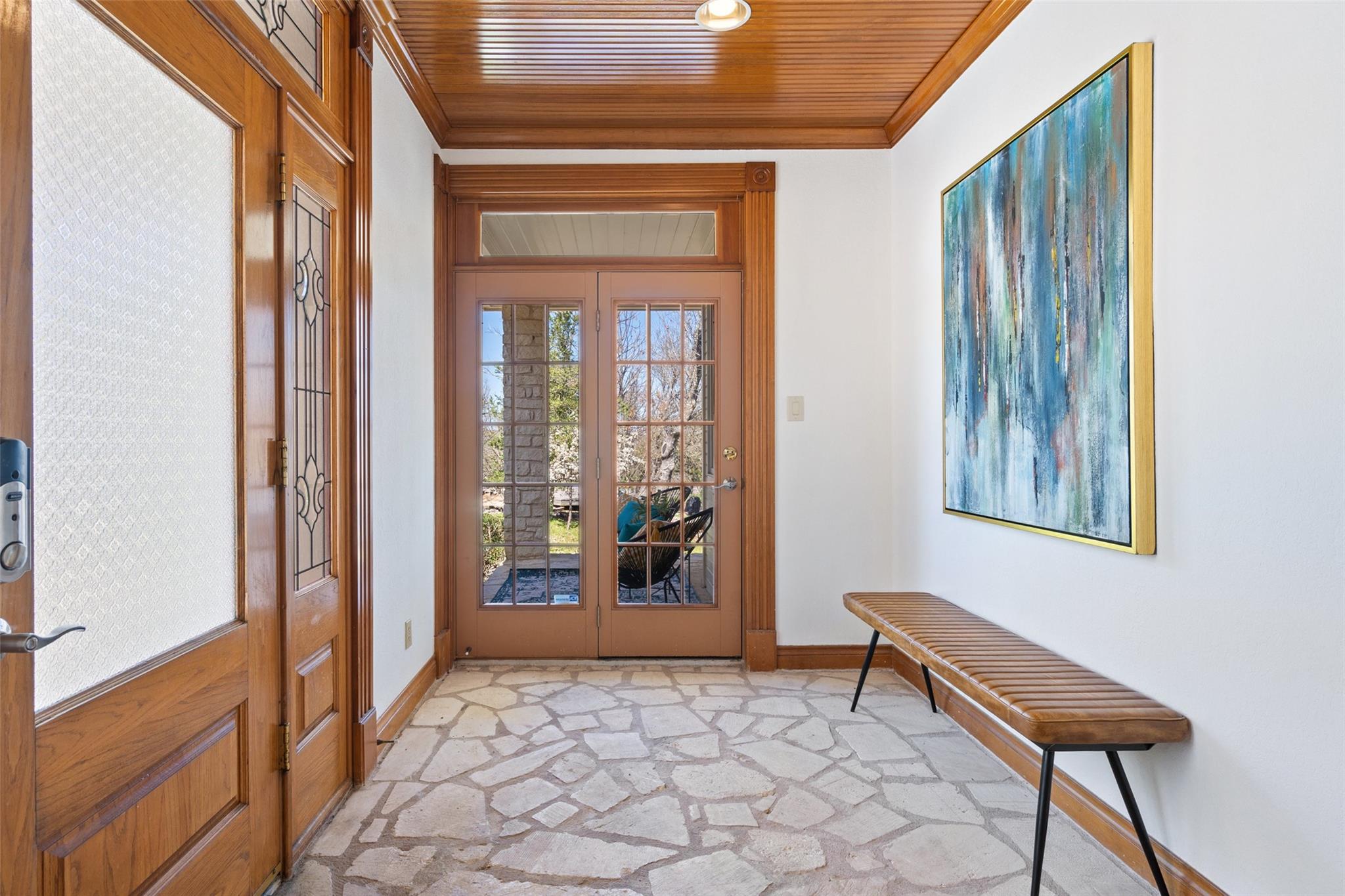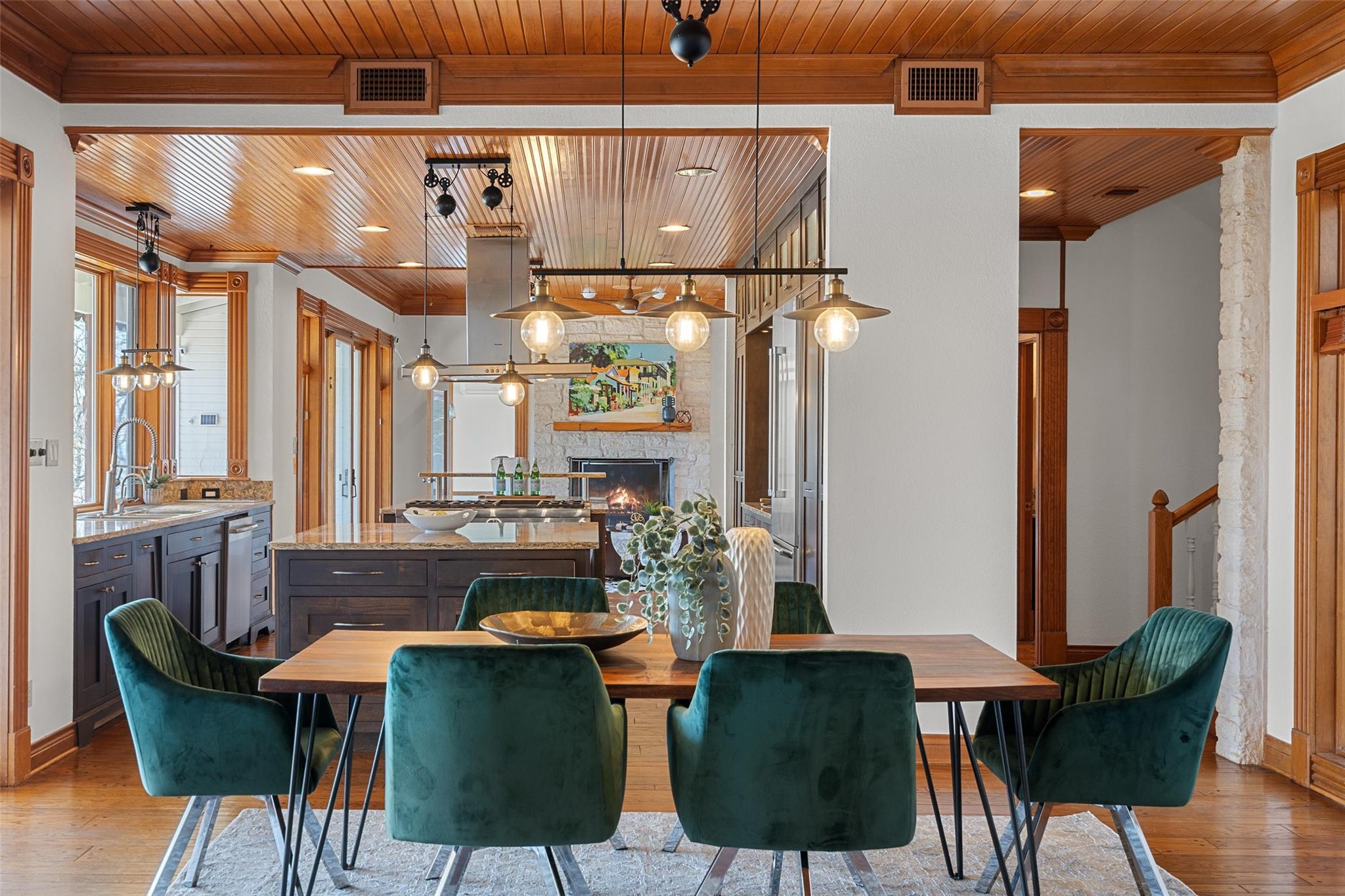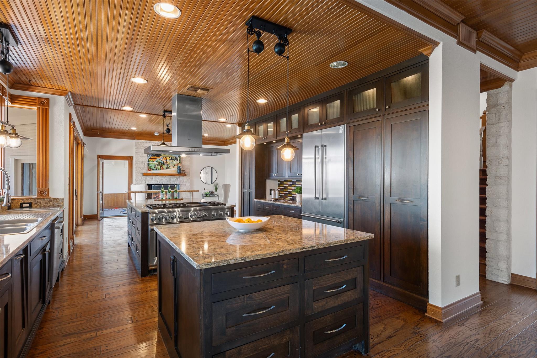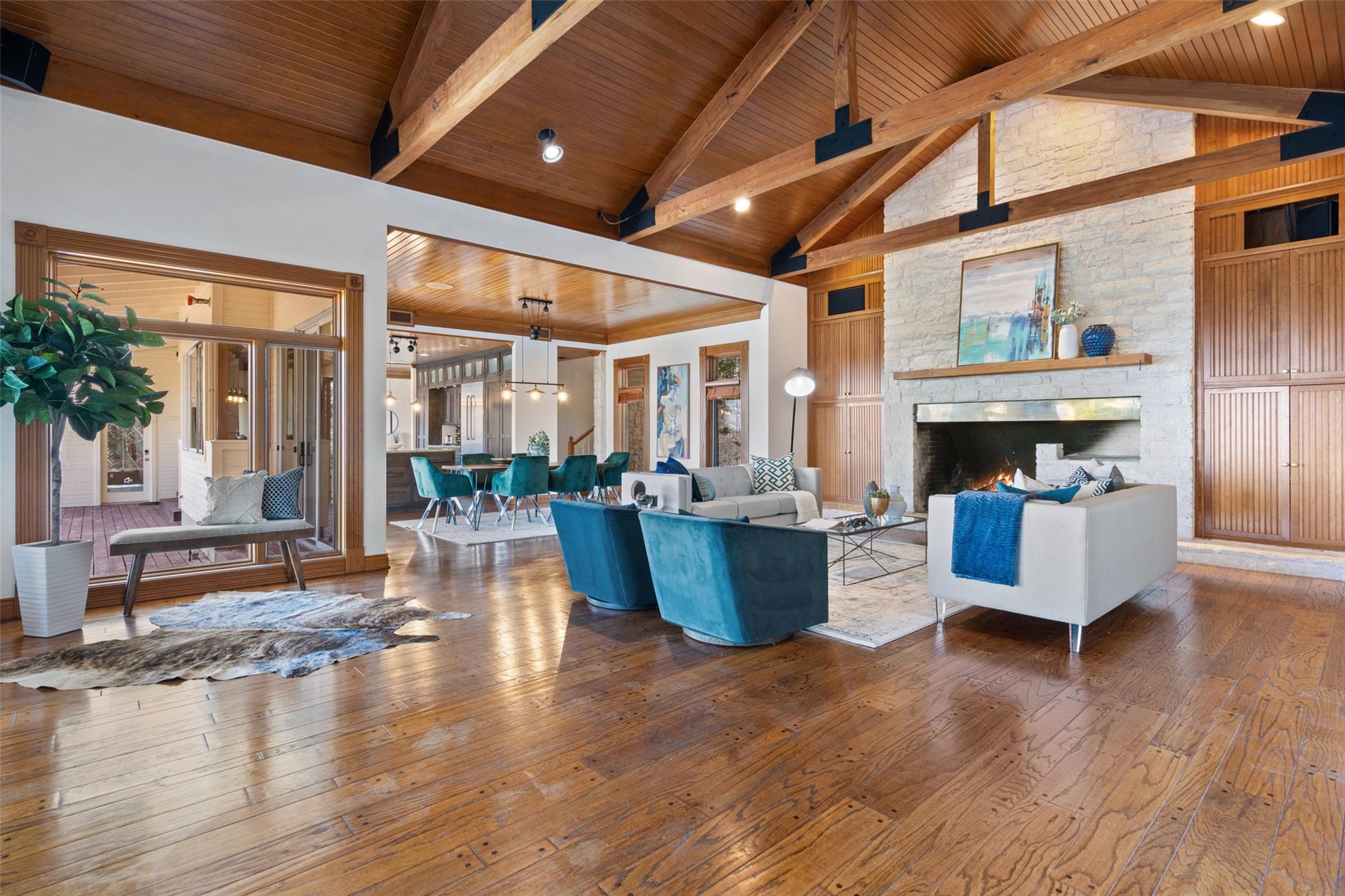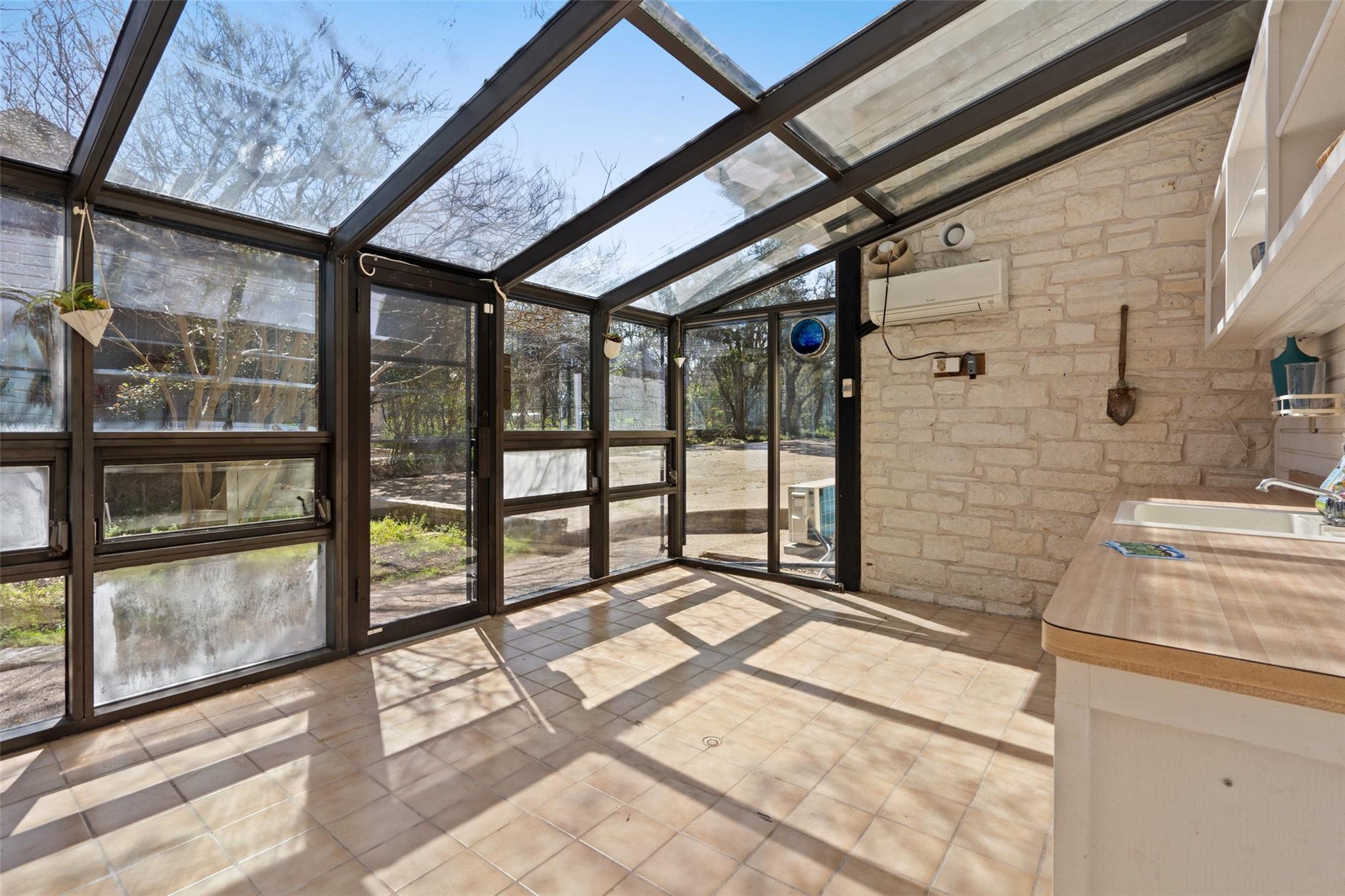 Nestled on a 1.6-acre lot in the coveted 78730 zip code, this breathtaking 5-bed/3.5 & 1/4-bath residence is the epitome of luxury living with unmatched hill country and downtown skyline views. As you approach this stunning home, a circular driveway embraced by tall trees leads you to a front porch and private entrance. Step inside to find elegant stone flooring in the entryway, seamlessly transitioning to rich wood flooring throughout the common areas. The home boasts a solar system, a full back wall of panoramic windows, high beamed cathedral ceilings, recessed lighting, and a stone-built wood/gas fireplace. Adjacent to the gourmet kitchen, opposite the great room is an additional cozy living area with its own fireplace. The kitchen is equipped with stainless steel appliances and dual center islands. Recessed lighting, granite countertops, stylish light fixtures, and a butler's pantry complete this chef's dream. Both the dining area and kitchen are bathed in natural light, offering serene hill country views. Step out onto the wrap-around balcony, with exterior steps descending to the backyard, a private oasis adorned with tall trees, native landscaping, a koi pond, and a gazebo, perfect for entertaining or tranquil relaxation. A sunroom and a greenhouse, both with tile flooring provide additional space for relaxation and protecting your plants. The owner's suite is spacious with a ceiling fan, slate flooring, and panoramic views. The en-suite bath features dual vanities, a deep jetted soaking tub, and a large walk-in shower. 2 secondary bedrooms are situated on the 2nd level, each with large windows that invite ample light. There is a mother-in-law suite on the 2nd level accessed from a private entrance off the drive, complete with a full kitchen and 2 bedrooms, ideal for guests or as an income-generating rental. This property is more than a home; it's a lifestyle, offering a rare combination of privacy, luxury, and natural beauty.