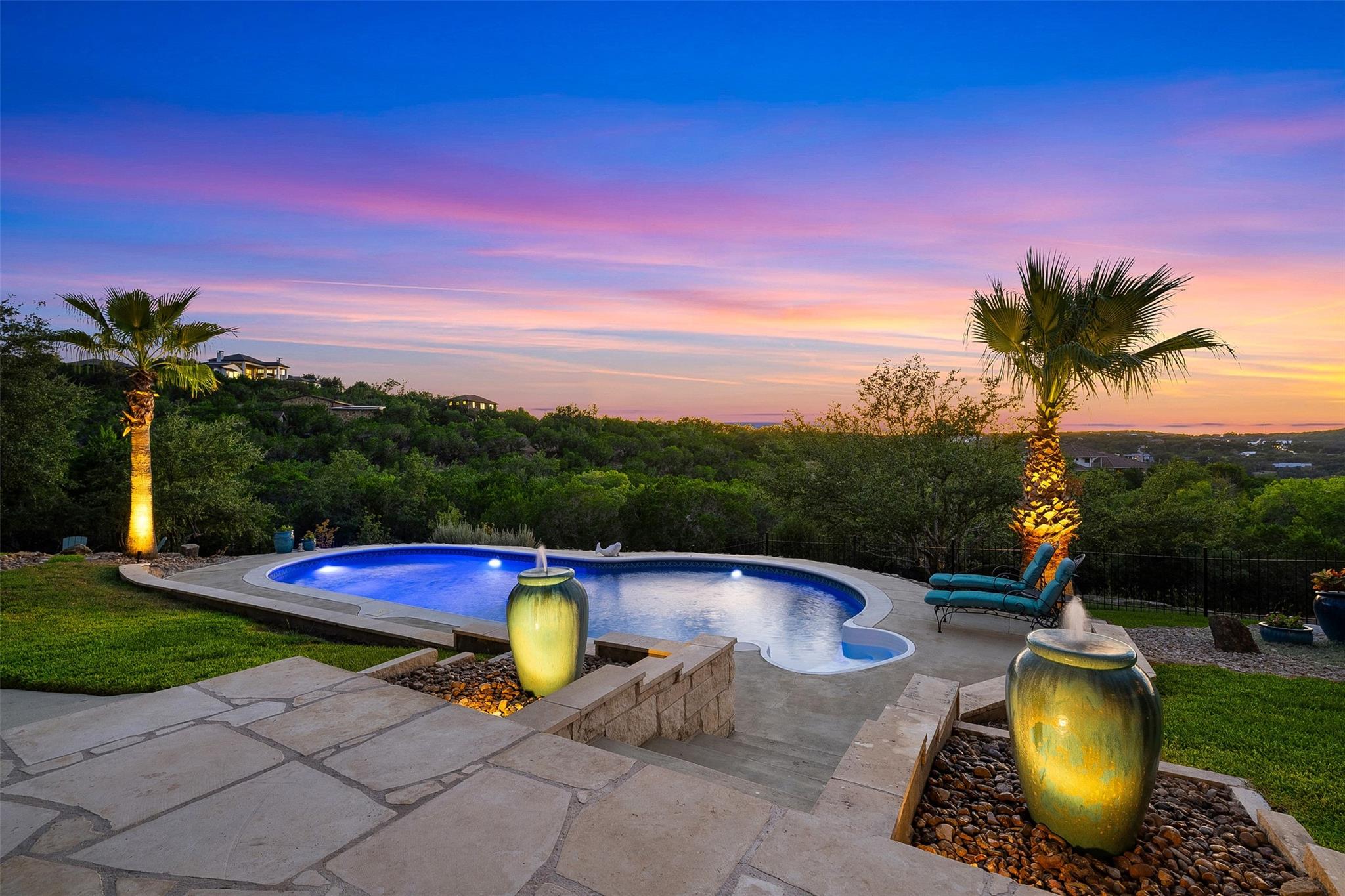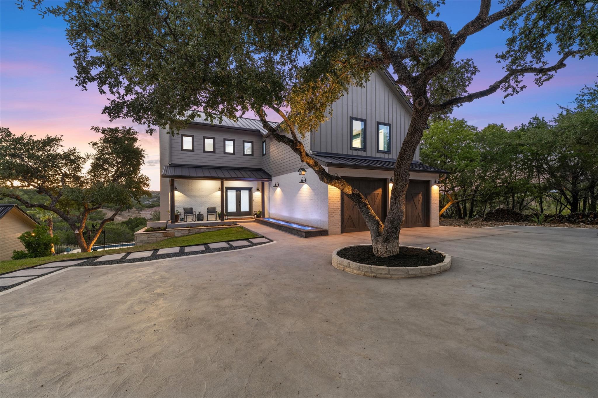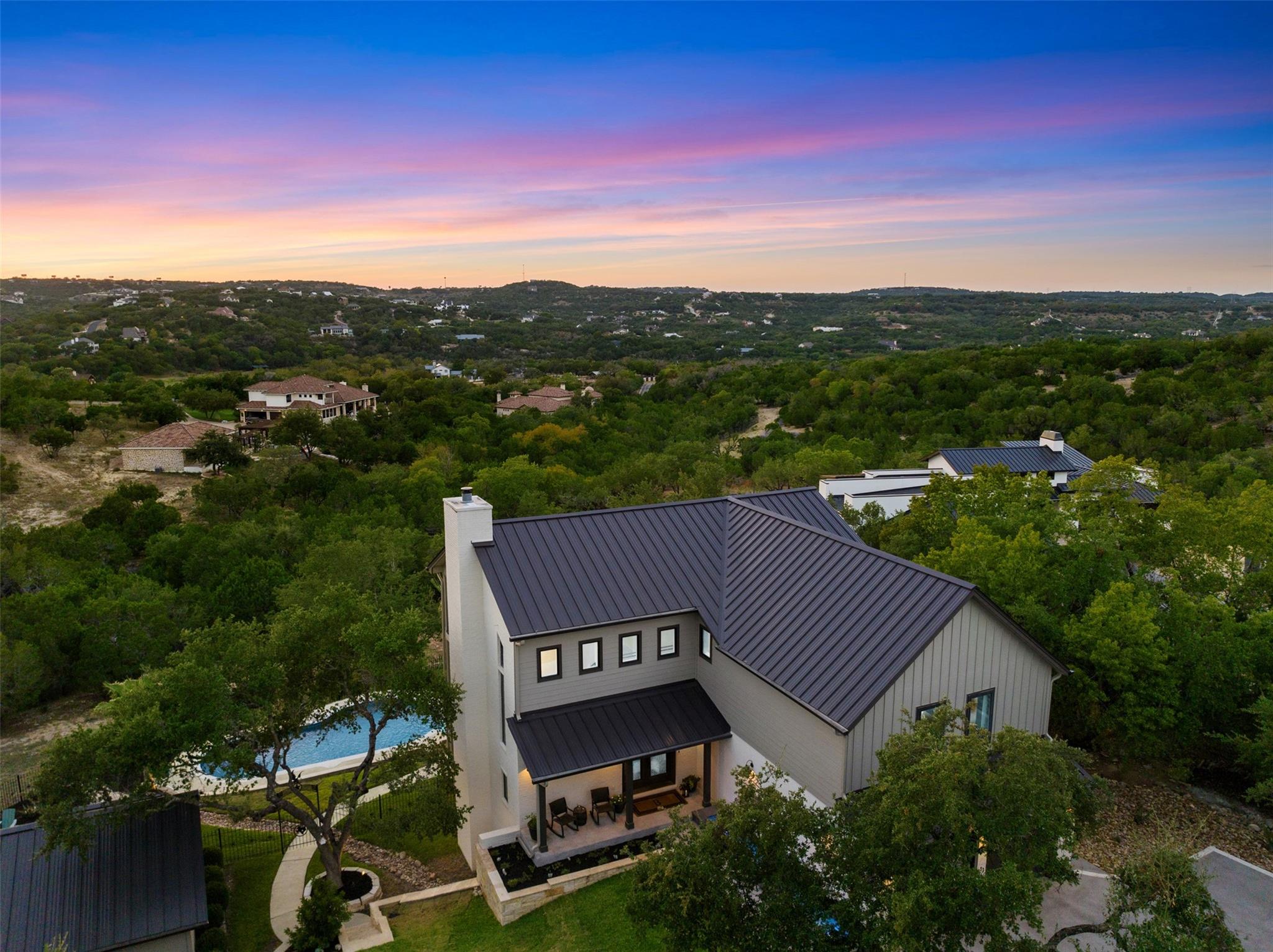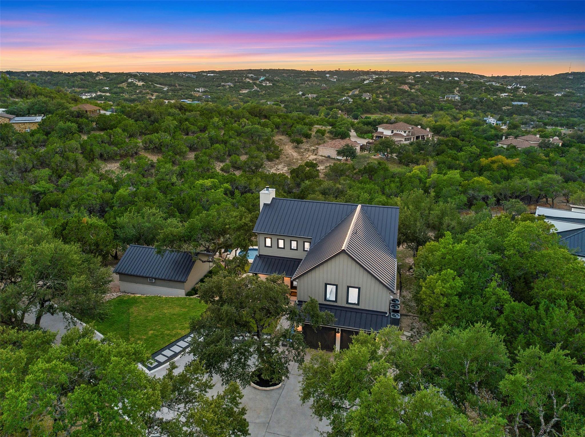 This Stunning Spicewood Estate Offers A Spectacular Show Of Color, Nature, & Beauty! This Hill Country Dream Home is tucked away on 1.5 acres at the end of a quiet cul-de-sac with fabulous curb appeal that provides an idyllic setting of majestic trees with sprawling branches framing the front of the home and a breathtaking backdrop of enchanting rolling hills as far as the eye can see. Exceptional architecture and designer details were carefully considered during the recent renovation including meticulous landscaping with an illuminating light display, a serene water fountain across the walkway to the front door, and an inviting porch that leads you inside to an open living, dining, and kitchen anchored by a wall of windows overlooking jaw dropping views and a backyard paradise. The outdoor oasis includes a resort-like saltwater pool, fountains, palm trees, a pergola for cookouts, and a cozy fire pit for stargazing on cool nights. Warmth and ambiance exudes throughout the main level with a wood burning fireplace. The chef's gourmet kitchen boasts top-of-the-line-appliances, a large center island, and a massive pantry. Relax on the balcony while watching colorful sunsets and an abundance of wildlife. Find serenity while listening to the sounds of trickling water from the fountains and a creek below. The romantic owner's retreat capitalizes on views from an outdoor seating area as well as windows above the oversized tub and shower in the spa-like en-suite bathroom. Football games and movies are bigger than life in a theater room equipped with surround sound and a 110' screen. A HEOS system was installed with multiple speakers throughout to allow music to be played anywhere inside or outside the home. A second 2.5 car garage with an AC unit was built to house multiple cars, a workshop, a gym, or can be easily transformed into a guest quarters. This 5 bed/4.5 bath home is located so close to town, yet feels miles away. It is truly one of a kind! 1.7 tax rate. LTISD.