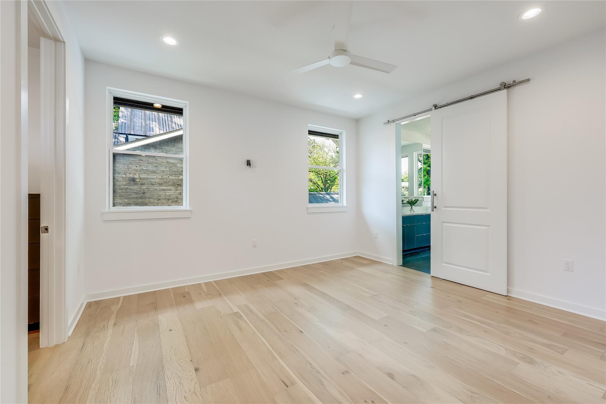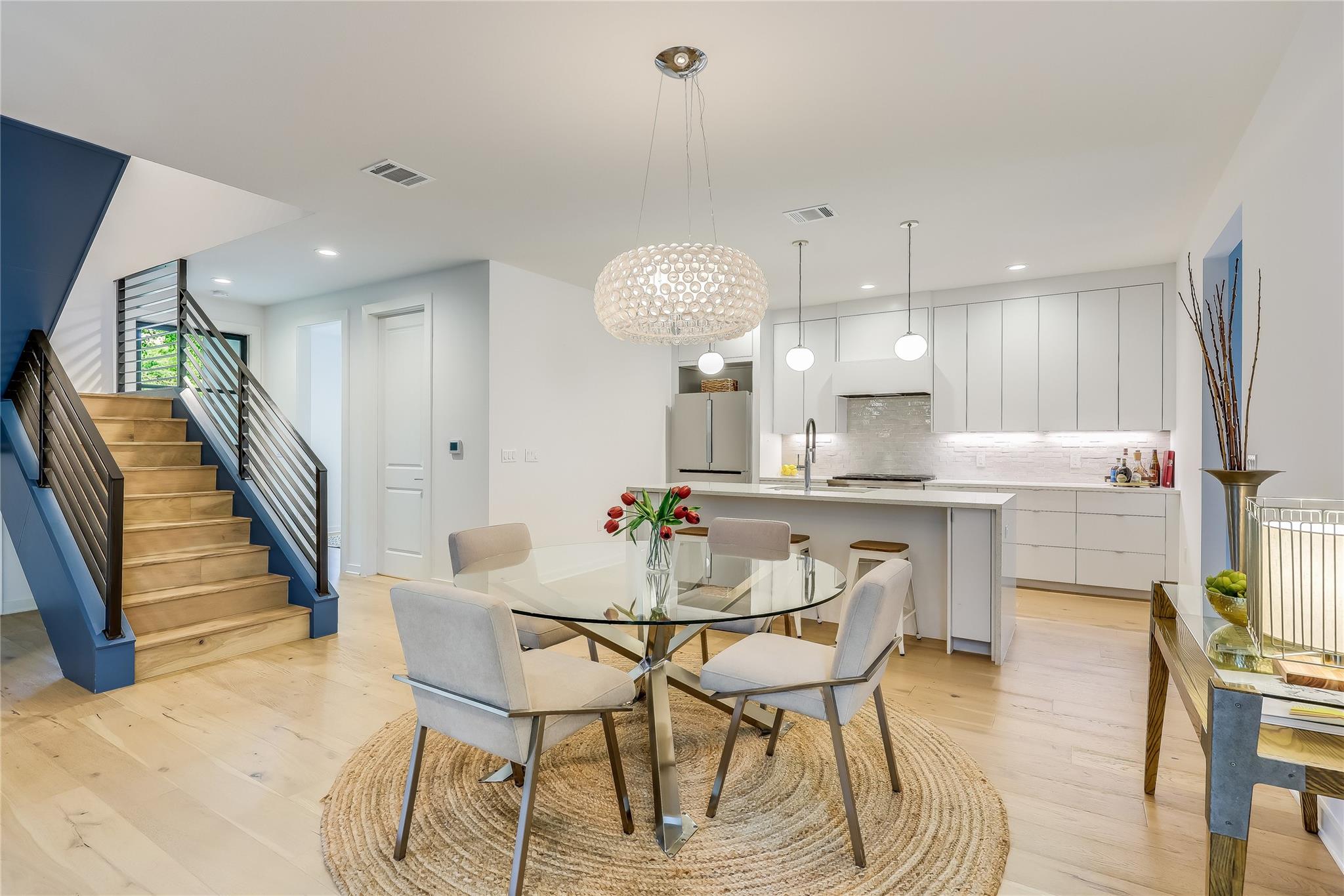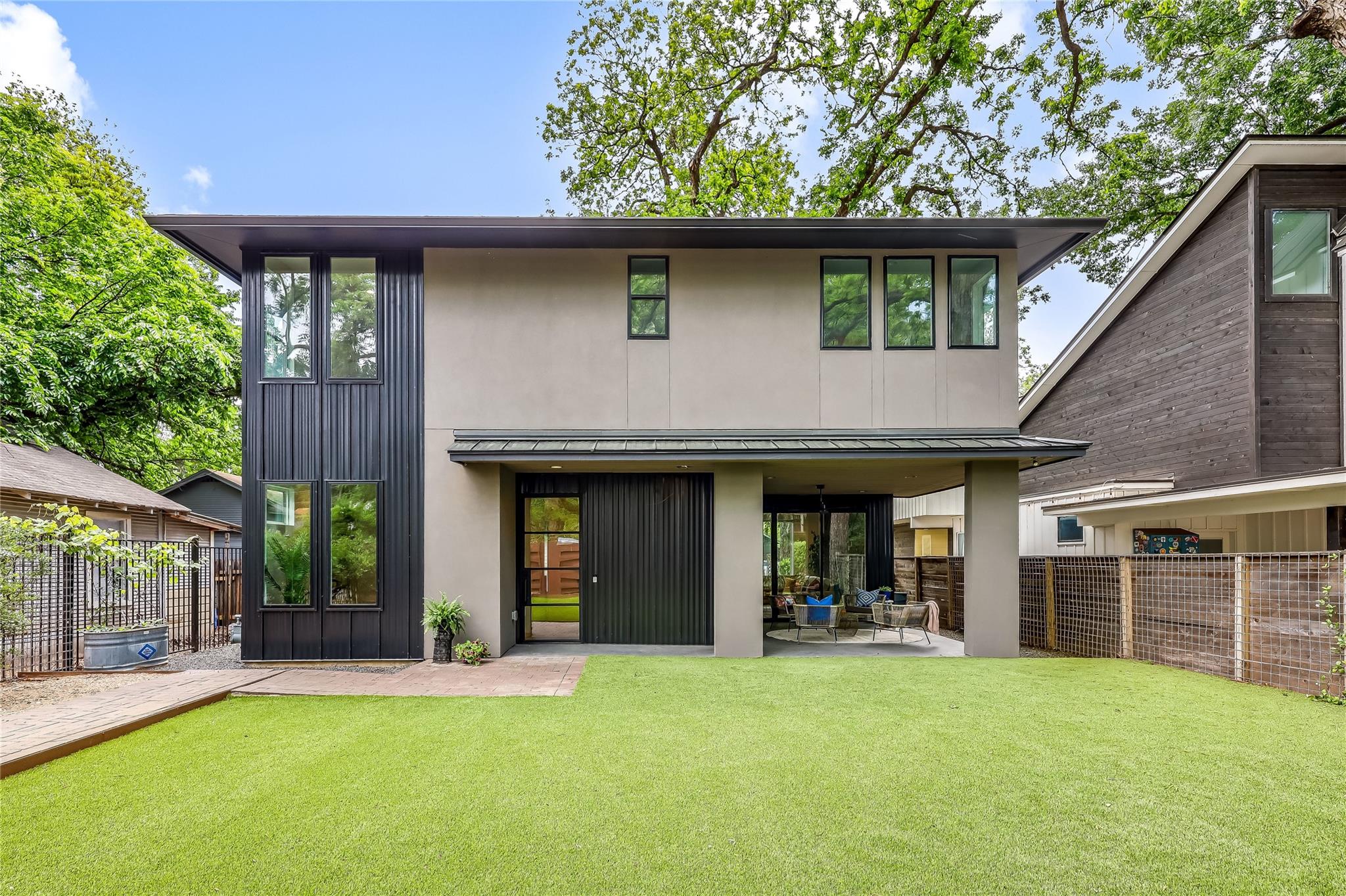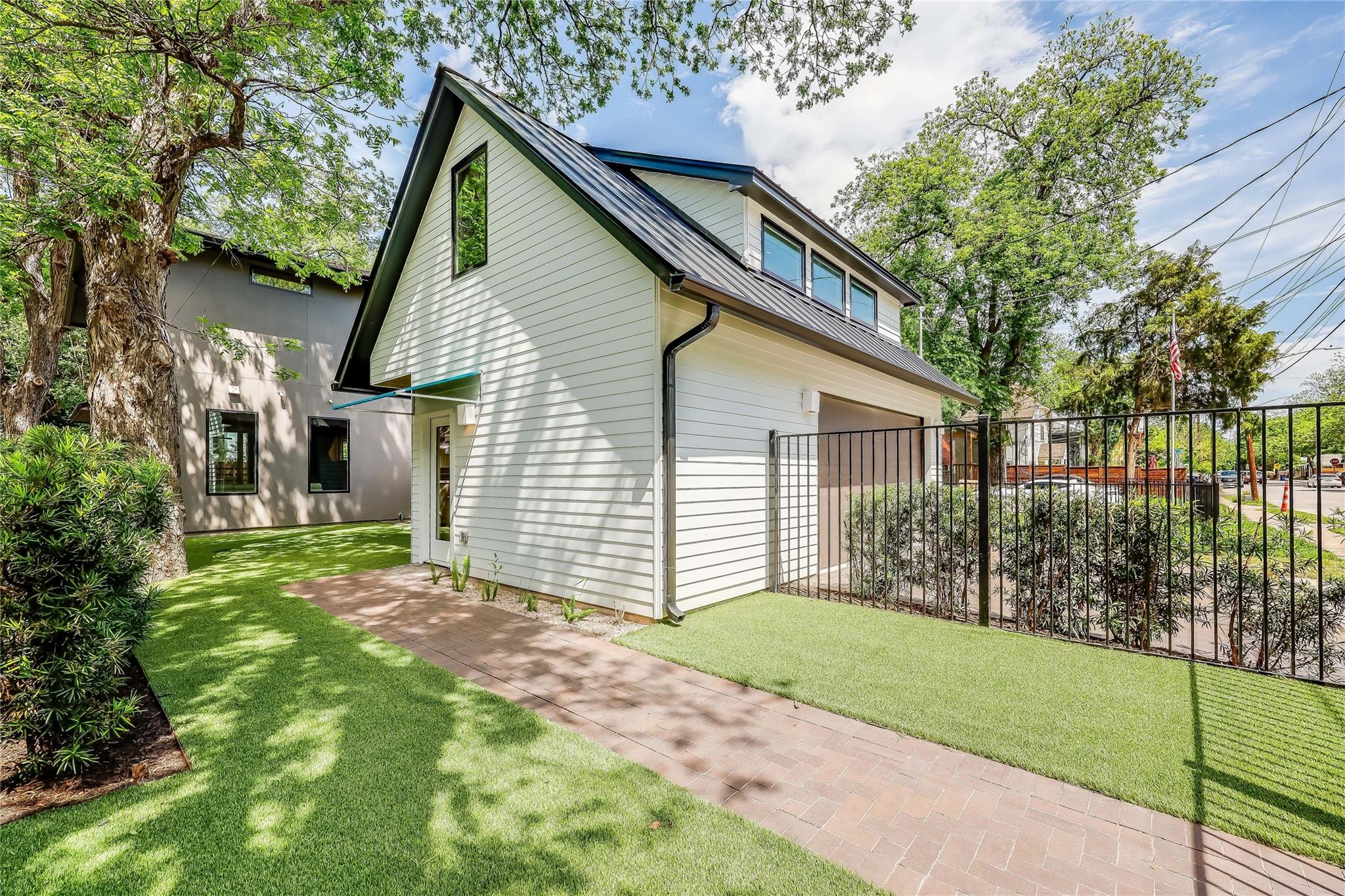 An exciting opportunity in the heart of the Holly Street District, this extraordinary modern transitional home features an open floor plan, designer finishes, and a location that can’t be beaten. A custom steel fence provides privacy and added security for this sanctuary in the vibrant east side of the city. Featuring an open living concept that provides flex options for your preferences and lifestyle, and an outdoor covered patio that feels like an extension of your living room overlooking the private always lush turf front yard. Three bedrooms and 2 full baths on the upper level, and a bedroom/study and 1 full bath down and a separate studio garage apartment. The primary retreat features a luxury bath with barn doors, a separate shower/tub, a double vanity, and a large walk-in closet. Atop of the 2 car garage sits a 500 sf studio apartment ideal as guest quarters, a home office, gym, or an income producing space with its own entrance off of Holly Street and private yard. Located just three blocks from Rainey Street and close to Whole Foods and Target. Walk or bike to Lady Bird Lake, Launderette, Justine’s and more Austin favorites.