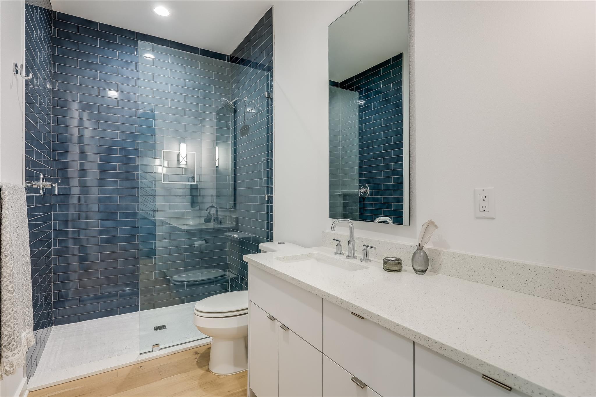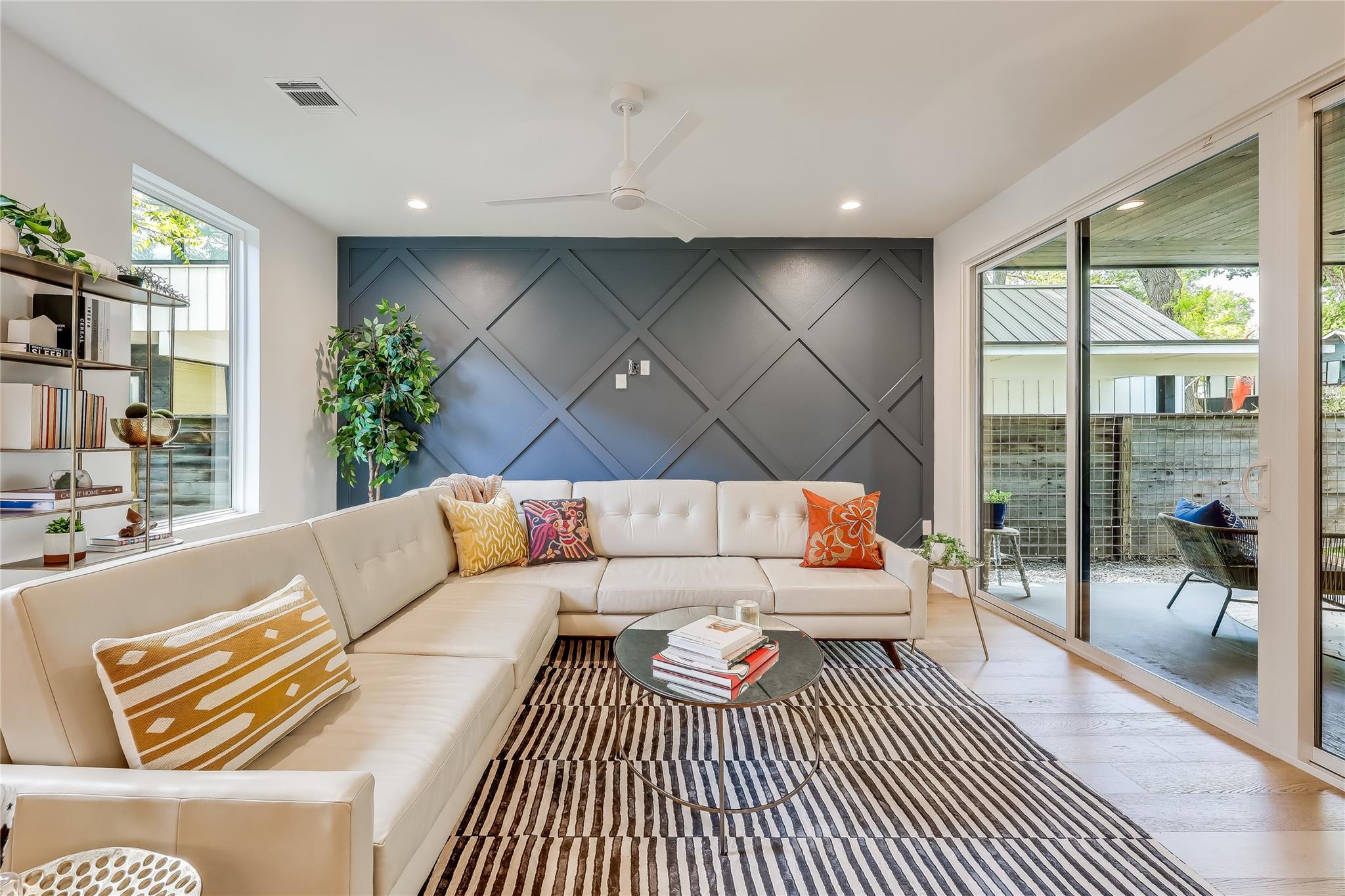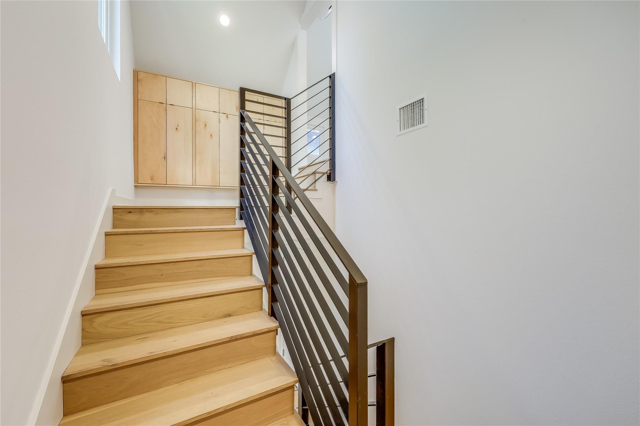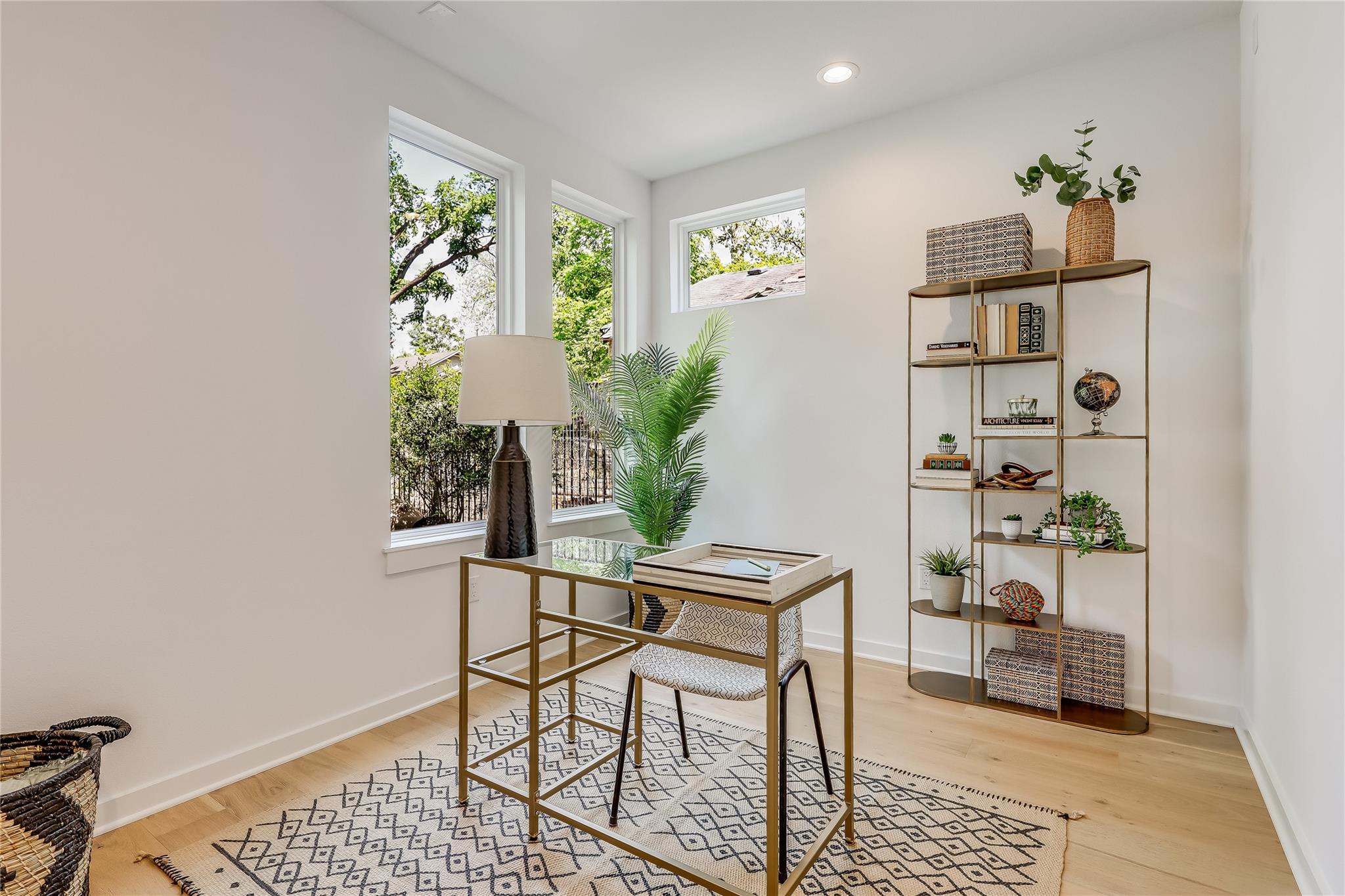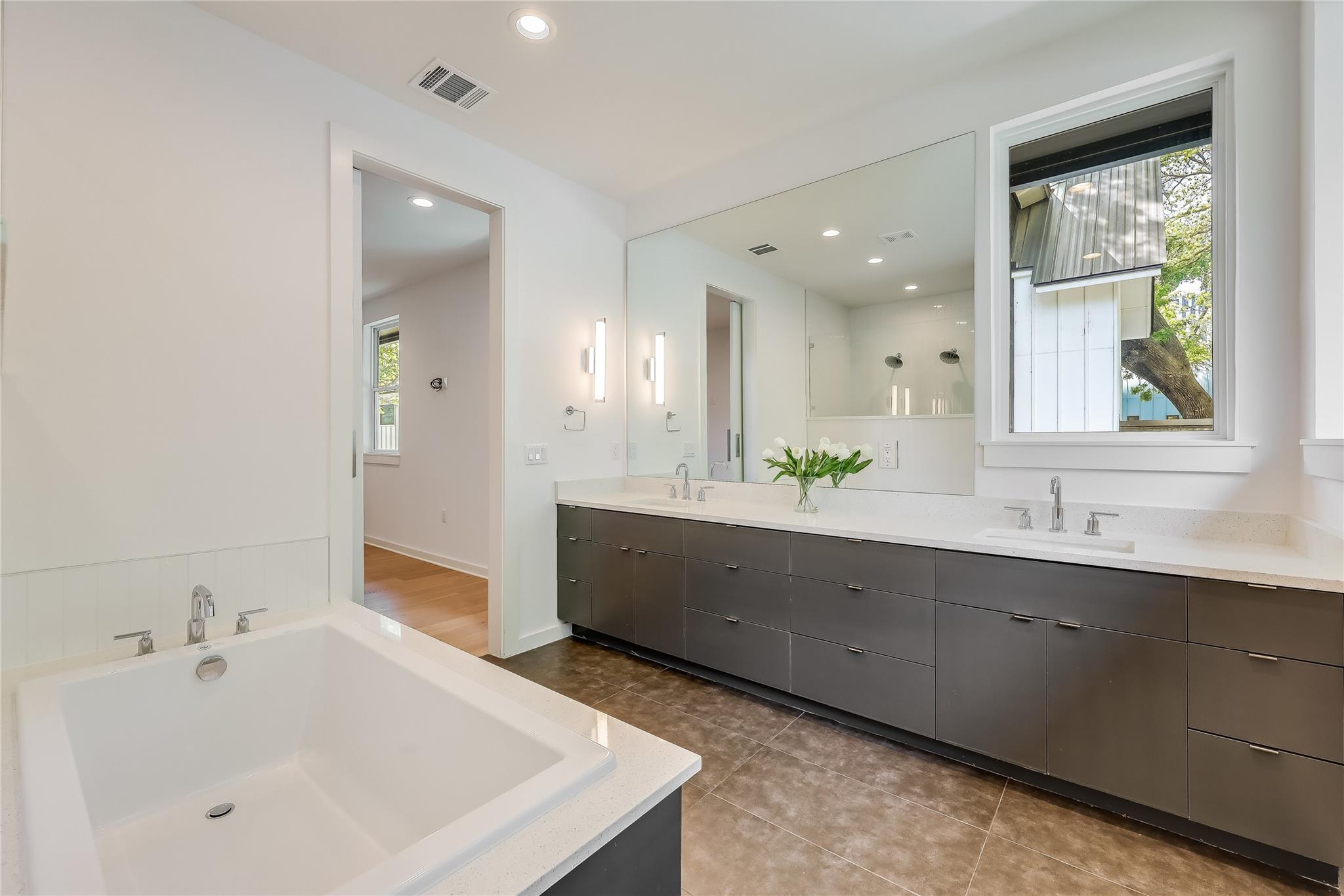 An exciting opportunity in the heart of the Holly Street District, this extraordinary modern transitional home features an open floor plan, designer finishes, and a location that can’t be beaten. A custom steel fence provides privacy and added security for this sanctuary in the vibrant east side of the city. Featuring an open living concept that provides flex options for your preferences and lifestyle, and an outdoor covered patio that feels like an extension of your living room overlooking the private always lush turf front yard. Three bedrooms and 2 full baths on the upper level, and a bedroom/study and 1 full bath down and a separate studio garage apartment. The primary retreat features a luxury bath with barn doors, a separate shower/tub, a double vanity, and a large walk-in closet. Atop of the 2 car garage sits a 500 sf studio apartment ideal as guest quarters, a home office, gym, or an income producing space with its own entrance off of Holly Street and private yard. Located just three blocks from Rainey Street and close to Whole Foods and Target. Walk or bike to Lady Bird Lake, Launderette, Justine’s and more Austin favorites.