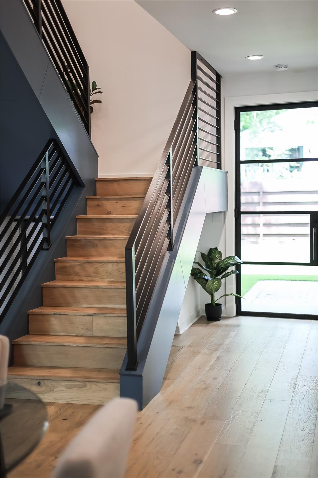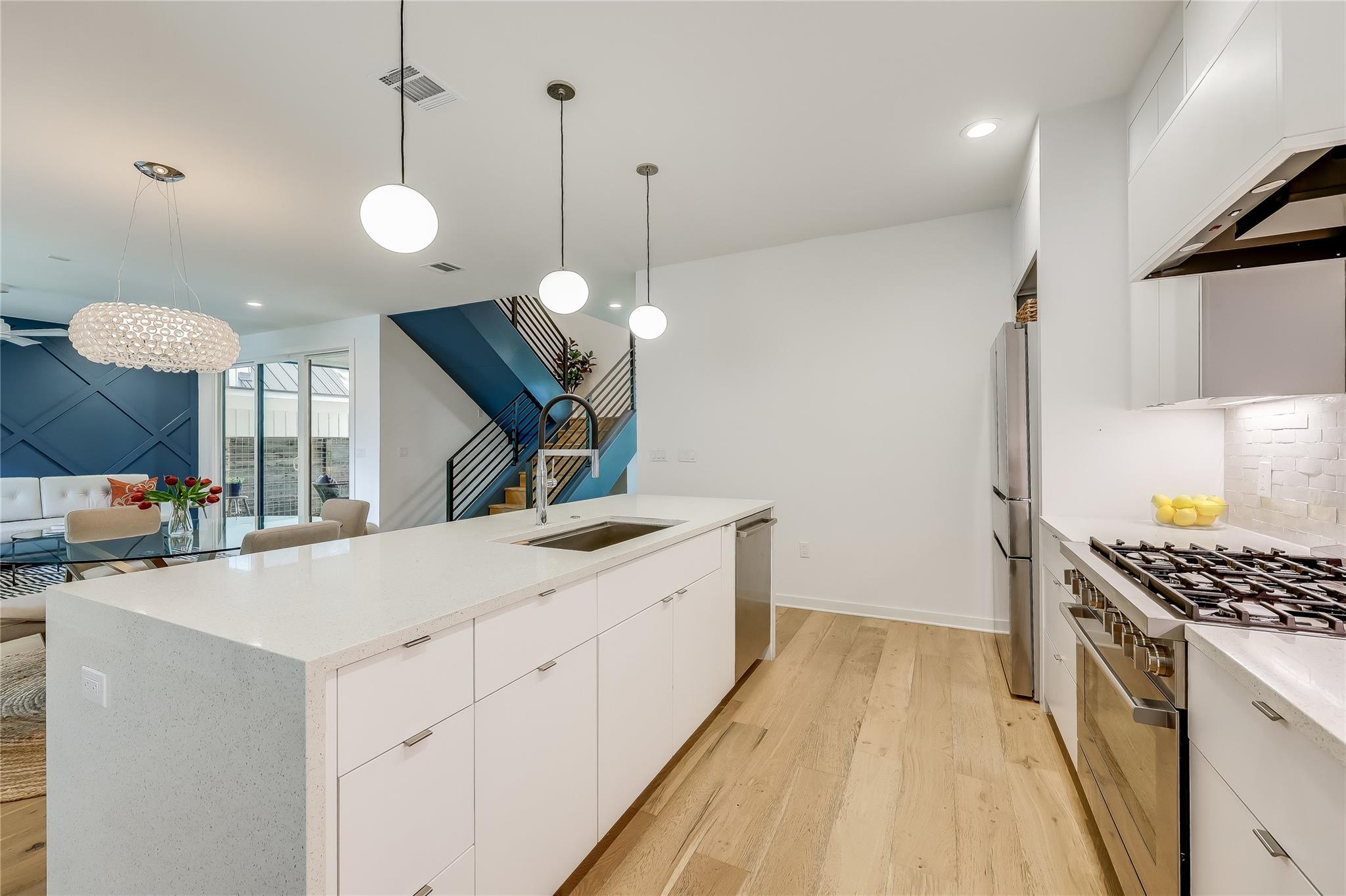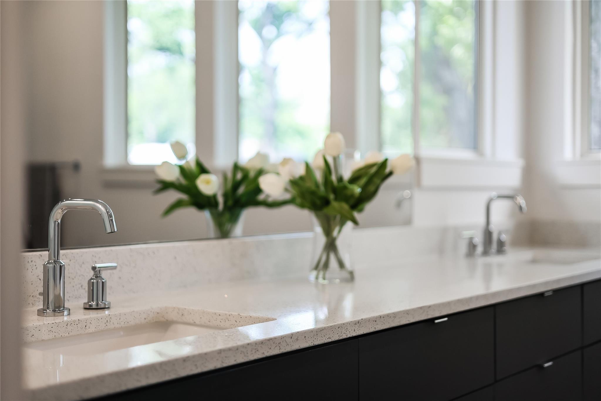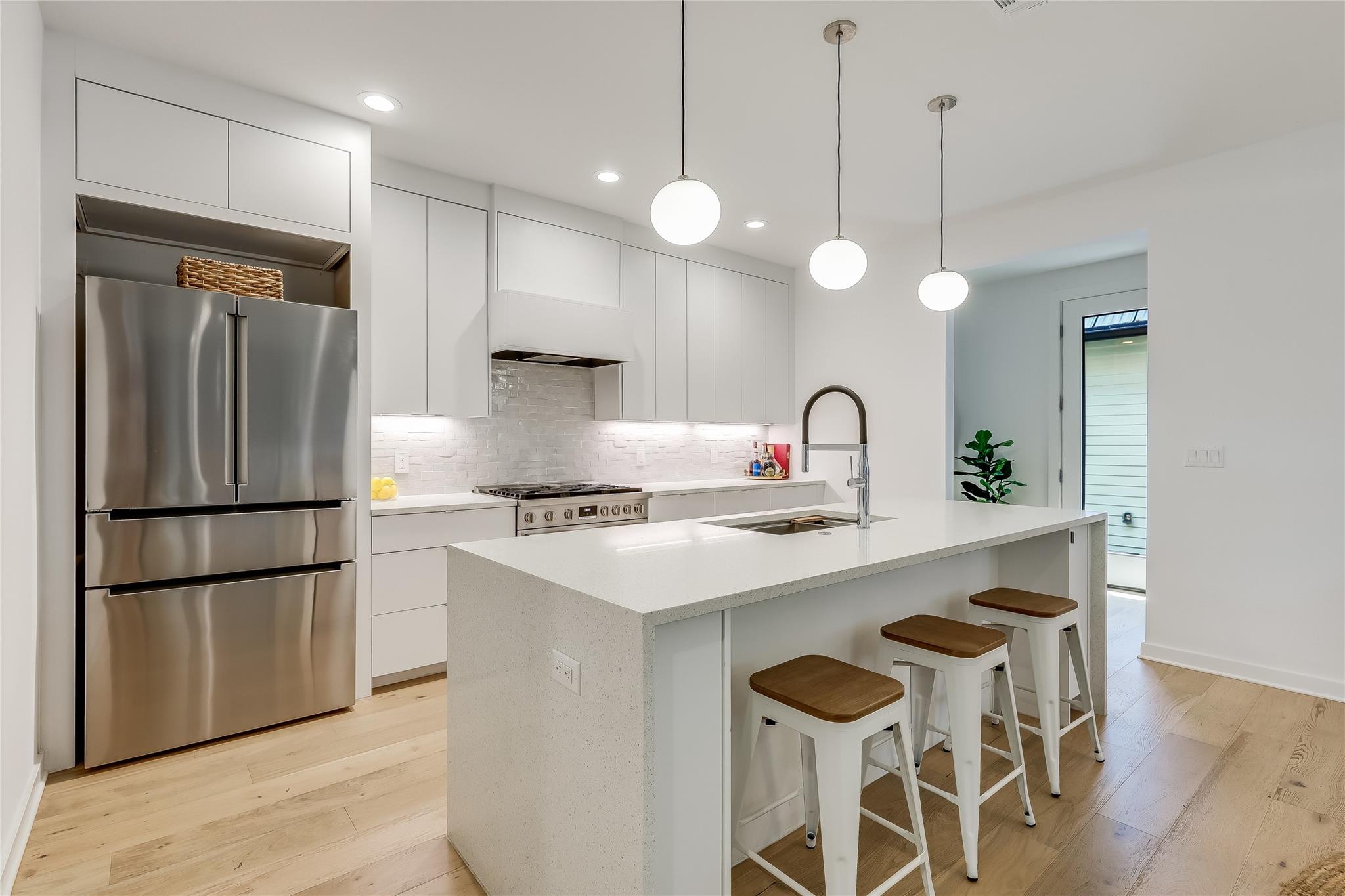 An exciting opportunity in the heart of the Holly Street District, this extraordinary modern transitional home features an open floor plan, designer finishes, and a location that can’t be beaten. A custom steel fence provides privacy and added security for this sanctuary in the vibrant east side of the city. Featuring an open living concept that provides flex options for your preferences and lifestyle, and an outdoor covered patio that feels like an extension of your living room overlooking the private always lush turf front yard. Three bedrooms and 2 full baths on the upper level, and a bedroom/study and 1 full bath down and a separate studio garage apartment. The primary retreat features a luxury bath with barn doors, a separate shower/tub, a double vanity, and a large walk-in closet. Atop of the 2 car garage sits a 500 sf studio apartment ideal as guest quarters, a home office, gym, or an income producing space with its own entrance off of Holly Street and private yard. Located just three blocks from Rainey Street and close to Whole Foods and Target. Walk or bike to Lady Bird Lake, Launderette, Justine’s and more Austin favorites.