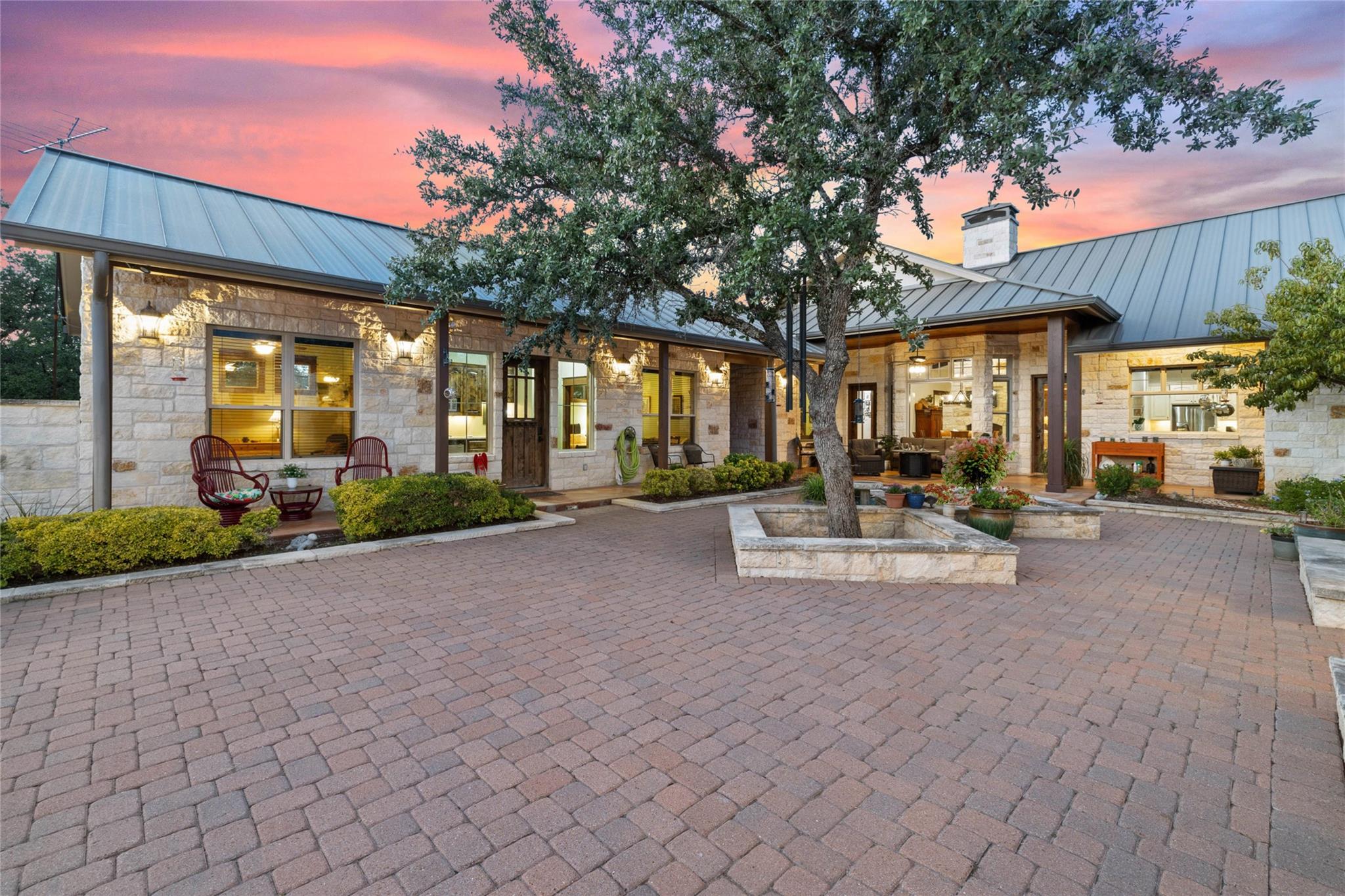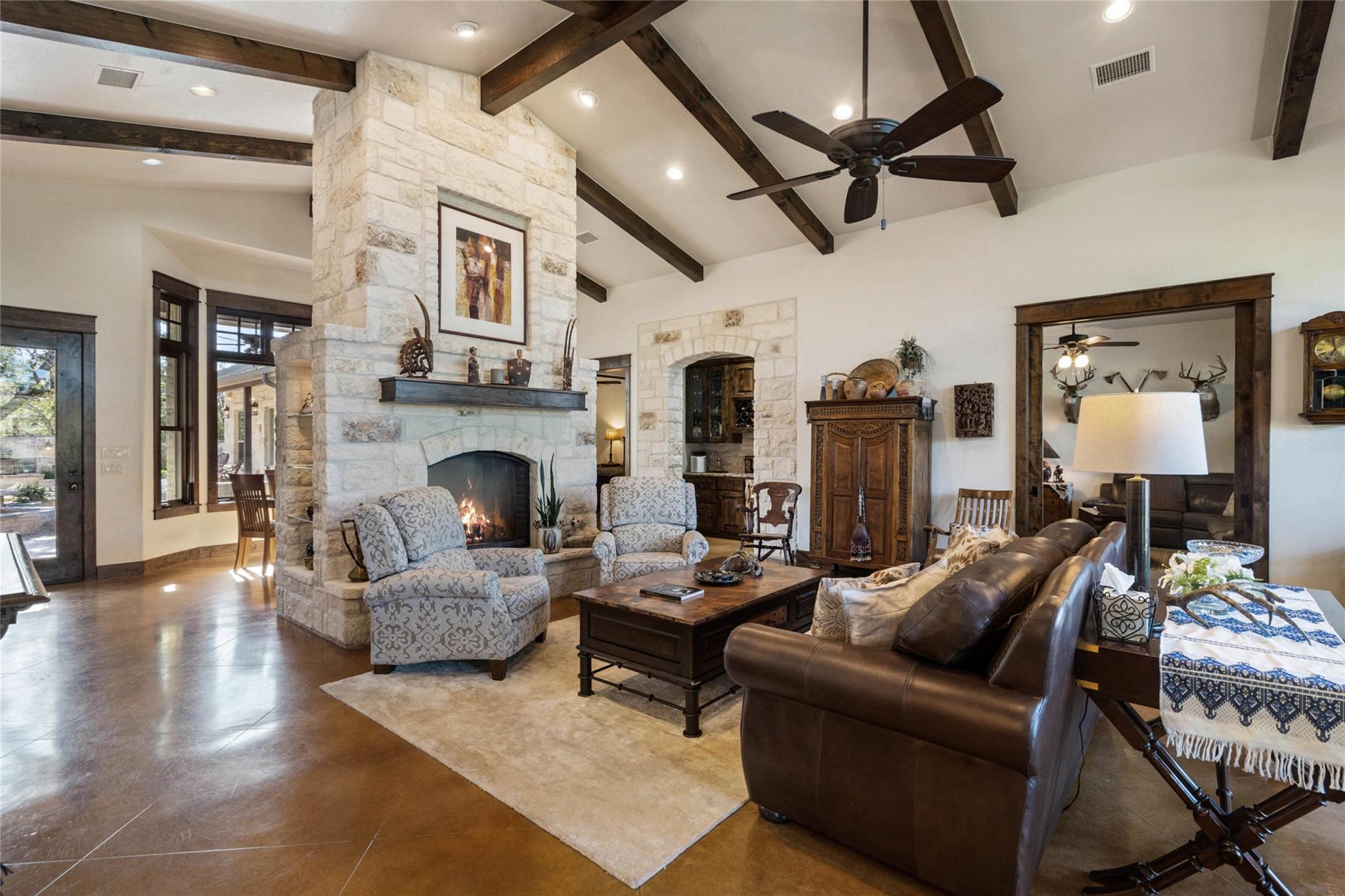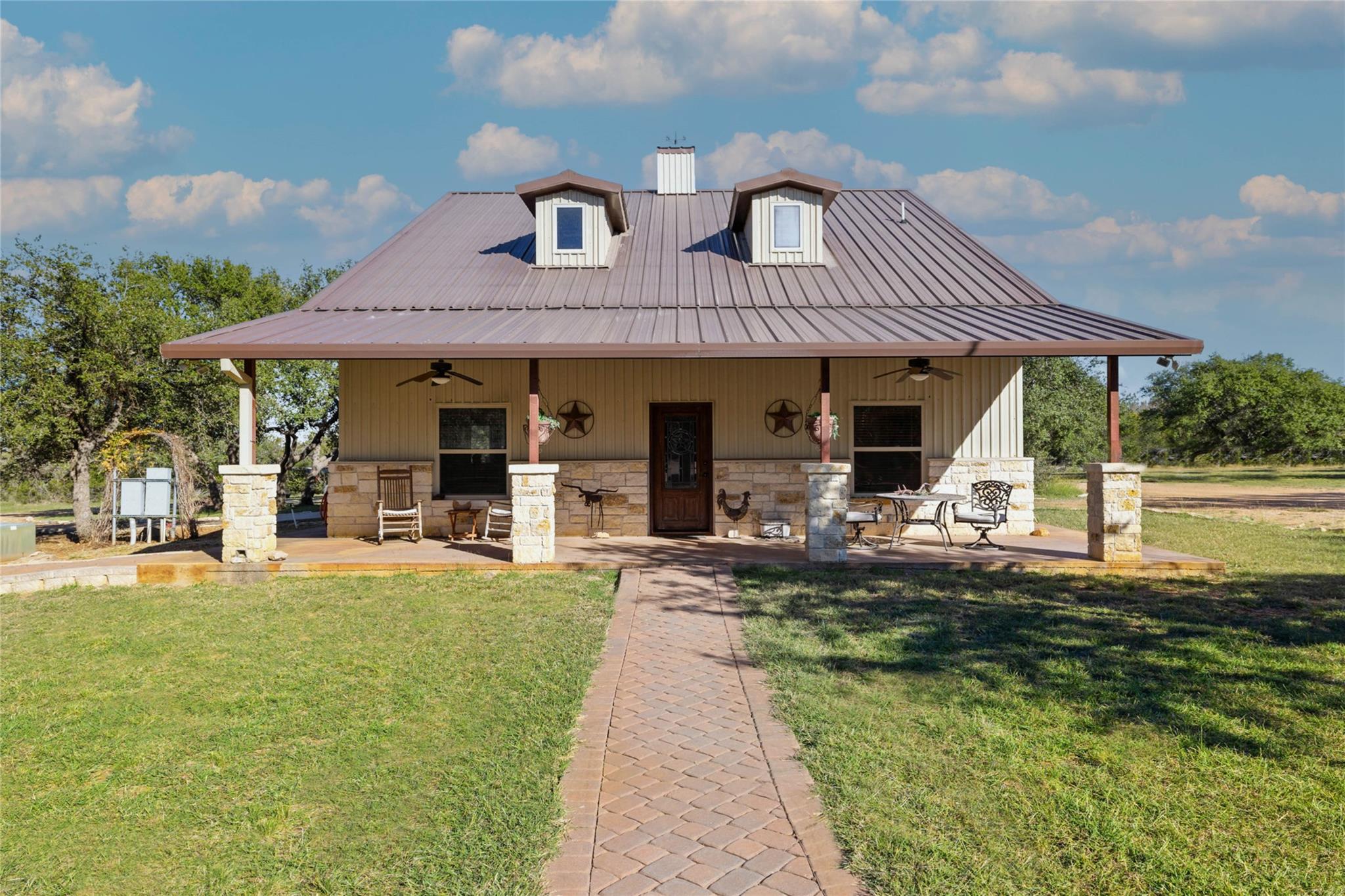 SONGBIRD HAVEN, a unique 25-acre compound that redefines luxury Hill Country living by offering a sumptuous main house, guesthouse, and barndominum. Situated in a gated ranch community, this serene retreat offers the convenience of being minutes away from local shopping & eateries. Through a grove of oaks SONGBIRD HAVEN reveals itself as an exceptional homestead, inviting you to explore its treasures and nearly 4000+/- sf of interior living space. The main house, a meticulously crafted masterpiece, features 2624+/-sqft with 2-beds and 2.5 baths. Its design exudes a timeless elegance, combining classic aesthetics with modern luxury. Every detail has been carefully considered to create an ambiance of sophistication and comfort that is sure to enchant the most discerning homeowner. Within the courtyard, a 651+/- sqft charming 2-bed, 2-bath guest casita provides an inviting haven for your cherished guests, ensuring they experience the warmth of Texan hospitality. SONGBIRD HAVEN is not merely a residence; it's a lifestyle. Step outside and you'll be captivated by the enchanting outdoor loggia. Outfitted for entertaining, this space beckons for relaxation. The property boasts an 2,160 +/- sqft barn that invites your imagination to soar. Beyond its doors, you'll discover a 720-sqft 1-bed, 1-bath luxurious apartment. SONGBIRD HAVEN lives up to its name, as a diverse community of native birds calls this property home. The park-like grounds are a testament to the artistry of land stewardship accentuated by a sparkling pond. A 30k gal rainwater system and well guarantees continuous and reliable water supply. Hunting is allowed for those who appreciate the sporting life. For those who yearn for adventure, multiple RV hookups available. This community offers access to a divine 7+/- acre lake. Whether you're searching for a weekend getaway or a primary Hill Country residence, this property is prepared to accommodate your journey. ADA Accessible & Wildlife Exempt. 1Hr to Austin.