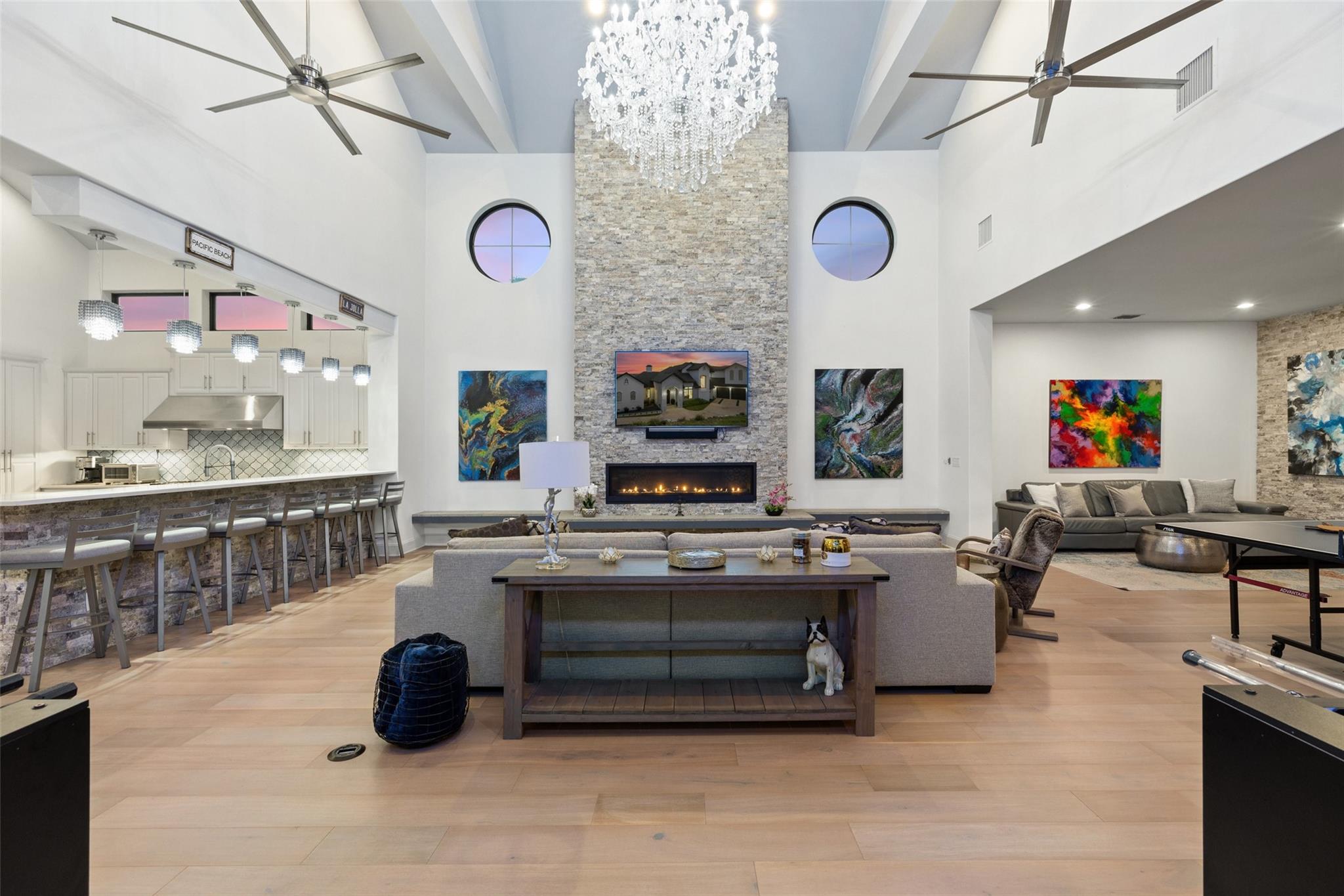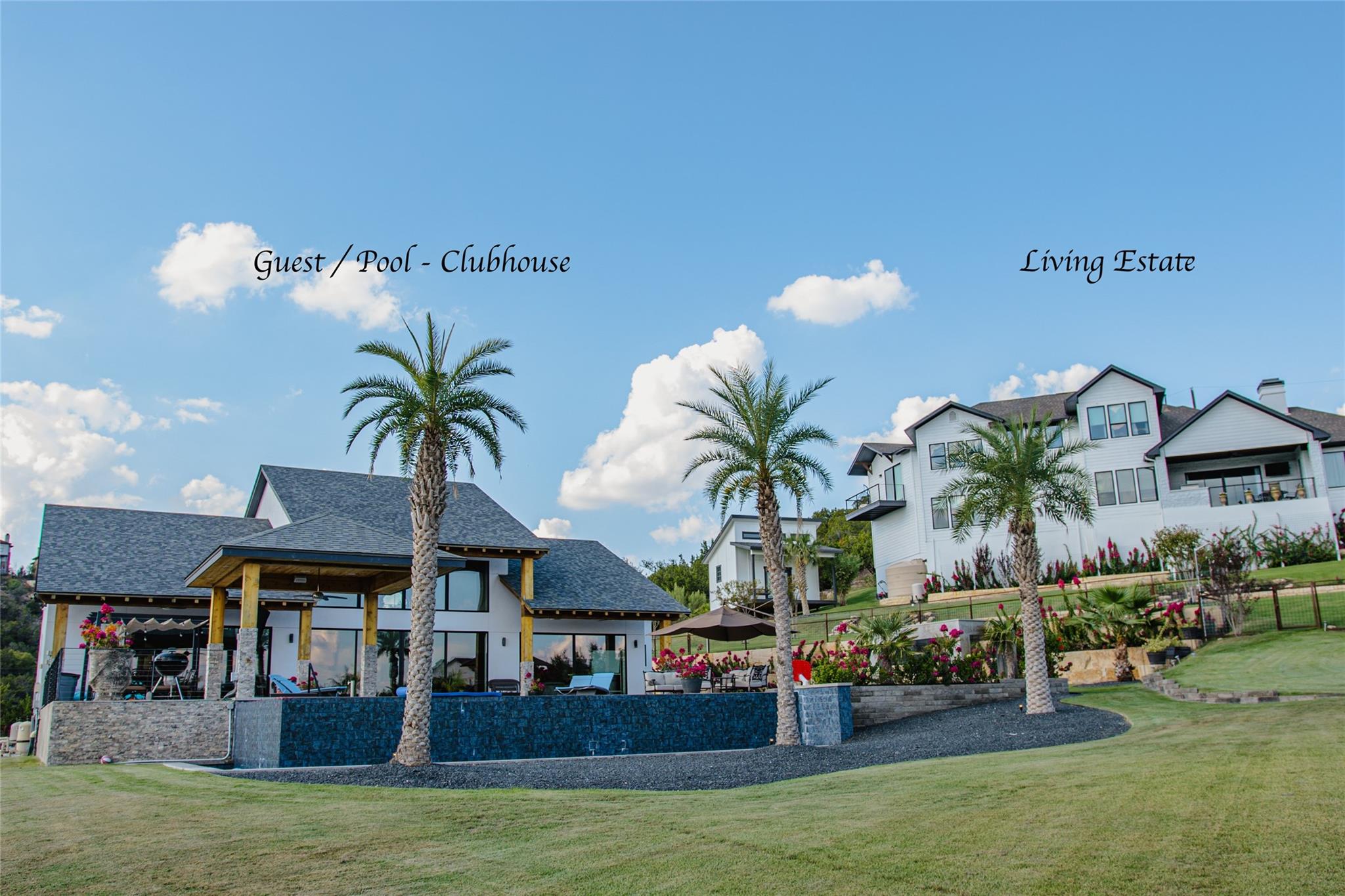 Parties. Family gatherings. Holidays. Events. Everyday living that’s anything but every day…With 4,000 sq.ft. in the main house, another 2,100 sq.ft. in the Guest/Clubhouse, a resort-style pool that puts most resorts to shame, nearly 1.5 acres of luxuriously landscaped tropical privacy & panoramic Hill Country views in every direction, the most ordinary moments become extraordinary at Little La Jolla … The Modern Farmhouse-styled main house offers open floorplan living, 5 spacious bedrooms (including two elegant primary suites with a steam sauna whirlpool tub with wall jets spray), 4½ baths, a hidden oversized appliance pantry and a true, big-screen home theatre with high-fidelity sound for movies and big games. Love to entertain? … Chefs can work their magic in the Clubhouse gourmet kitchen with an oversized island and Thermador appliances, including a built-in, recessed refrigerator, double ovens, double dishwashers, and a commercial sink…The wraparound bar seats 9…Guests will linger in the massive infinity-edge pool with its beach entry, a hot tub that holds 14, swim-up bar, 3-sided rain grotto, indoor/outdoor Sonos sound system and fully-equipped, sunken grilling cabana, complete with Alfresco gas grill with rotisserie, Green Egg, mini freezer and icemaker, surrounded by two patios, a beautiful ¾-acre fenced lawn great for fun and games for children and pets…Plus majestic palm trees and color-rich bougainvillea, with the added convenience of 3 separate parking areas for your guests…Custom-designed and finished in 2019…Separate she-shed with porch swing completed in 2020. Zoned R-6 rural, affording you certain freedoms you will appreciate. Imagine hosting weddings, bachelorette parties, family reunions, big anniversaries and very special birthdays. Or perhaps you’d prefer to keep it your own private Lakeway retreat.