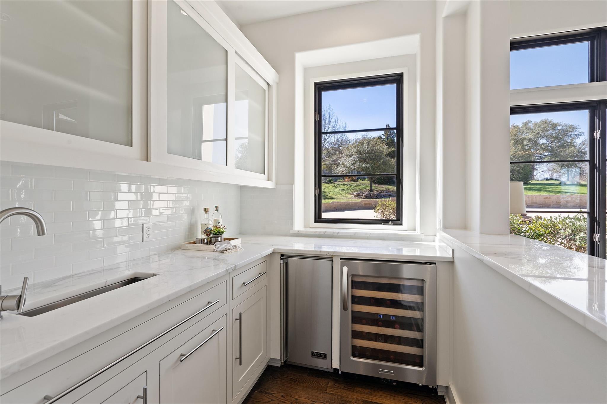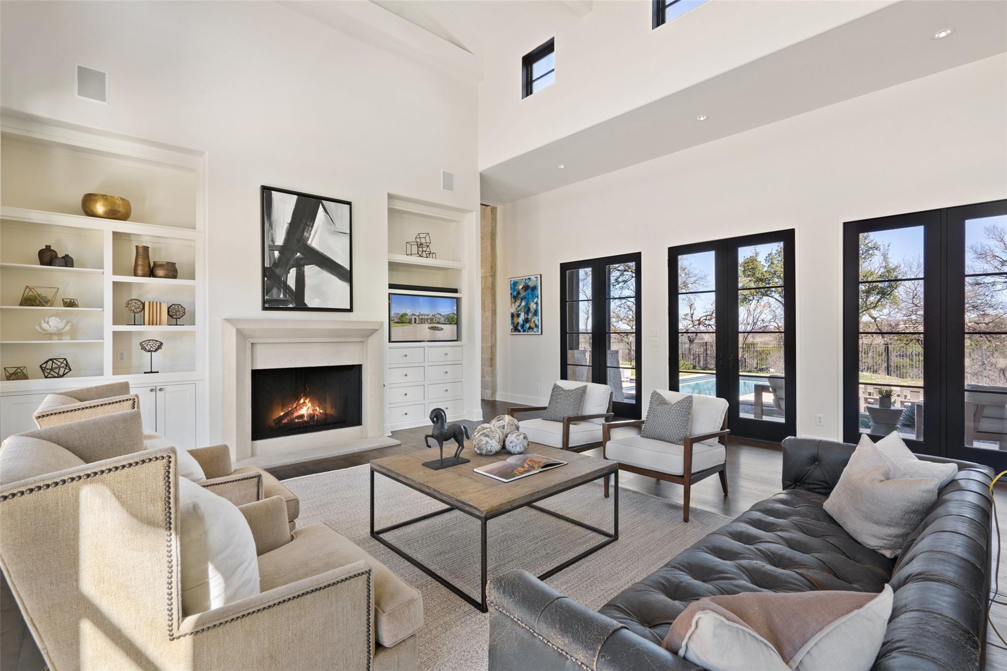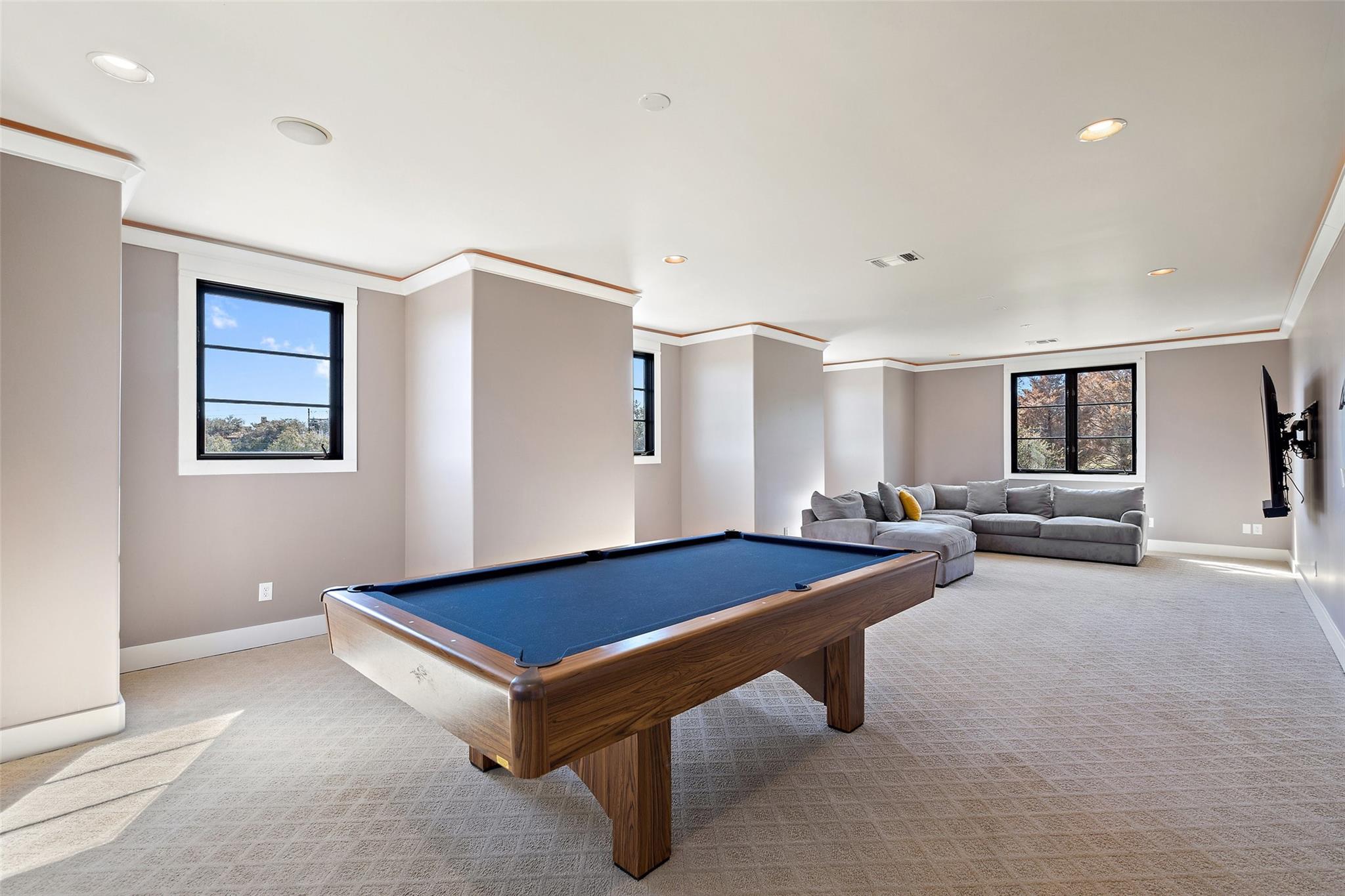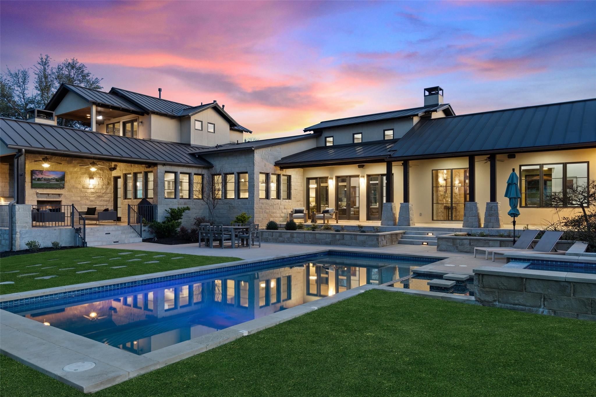 A luxurious estate in the prestigious Sierra Vista subdivision w/panoramic views! Resort-style living situated on 2+ acres allowing room for additional improvements to be added. A sprawling modern 5 bed, 5 1/2 bath boasts style & sophistication-includes private study. The exterior features sharp color contrast, eye-catching metal roof, & towering mature trees creating a picturesque setting. Stepping through the grand entrance you are greeted w/endless pool views, soaring ceilings, incredible chandeliers, & rich hardwoods. The living room provides the perfect place to create memories-vaulted & beamed ceiling, numerous oversized french doors leading to the outdoors, & a sleek fireplace flanked w/built-ins. An entertainers absolute dream! The gourmet kitchen has all the wow factors & is ready for the chef in your home–impressive island featuring quartz counters w/seating & prep-sink, top-of-the-line appliances, built-in expresso machine, double-oven 6 burner gas range, 3 dishwashers, warming drawers, & hidden fridge & freezer drawers. Various beverage refrigerators w/wet bars have been thoughtfully placed just off the kitchen & throughout the home. Escape to the private owners’ wing for rest and relaxation & soak up the gorgeous pool views-the ensuite offers a spa like setting, floating dual sink vanity, walk-in shower w/ four rainheads, deep soaking tub with tile surround, & a massive walk-in closet w/dedicated washer & dryer. Three secondary bedrooms all complete w/stylish private ensuites, ceiling fans, & access to the secondary living space featuring a built-in study area. Upstairs, you will be thrilled w/the massive game room, second-story balcony, & additional bedroom w/bathroom–perfect for guests! Outside, the backyard oasis has all the bells & whistles to be enjoyed year around-covered wrap around patio w/fireplace, contemporary custom pool/spa combo featuring, meticulous landscaping, & expansive green belt views. To access disclosures: https://wkf.ms/3UX0jin
