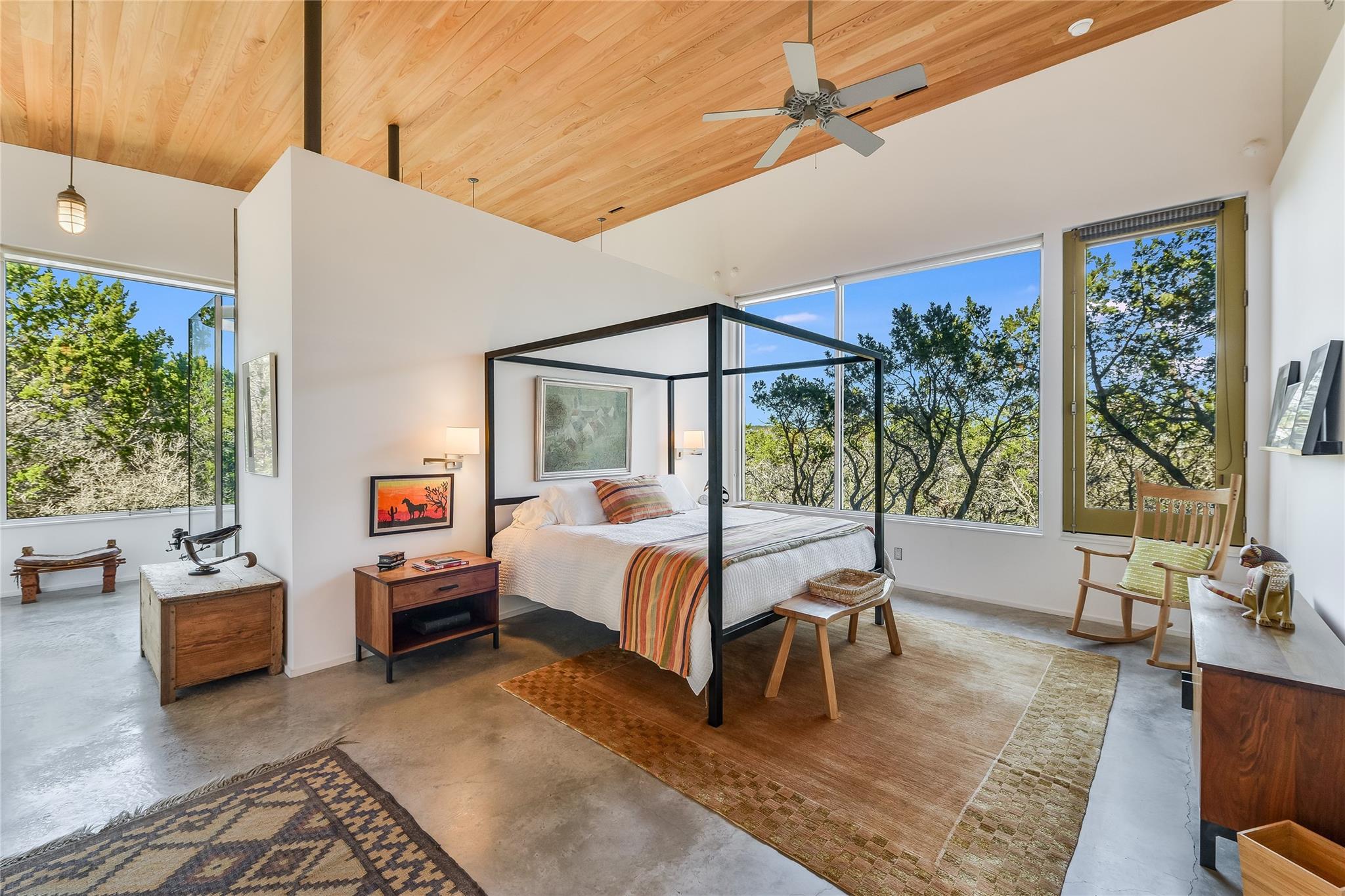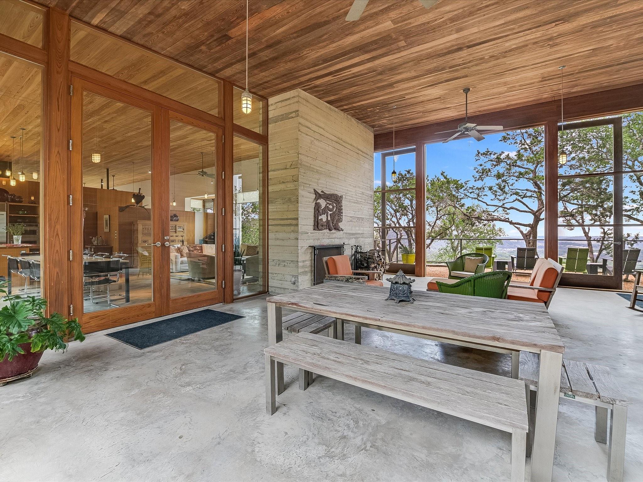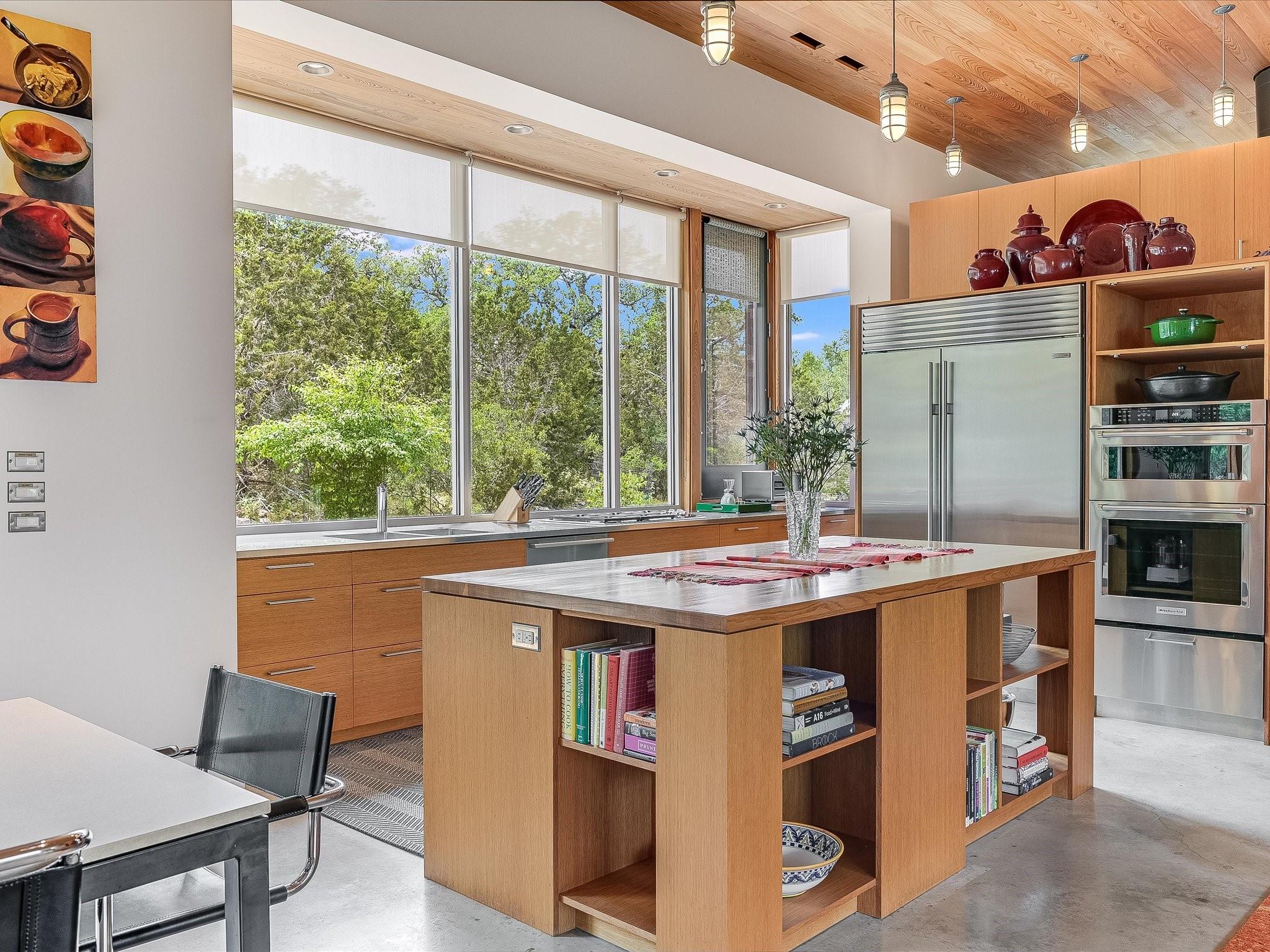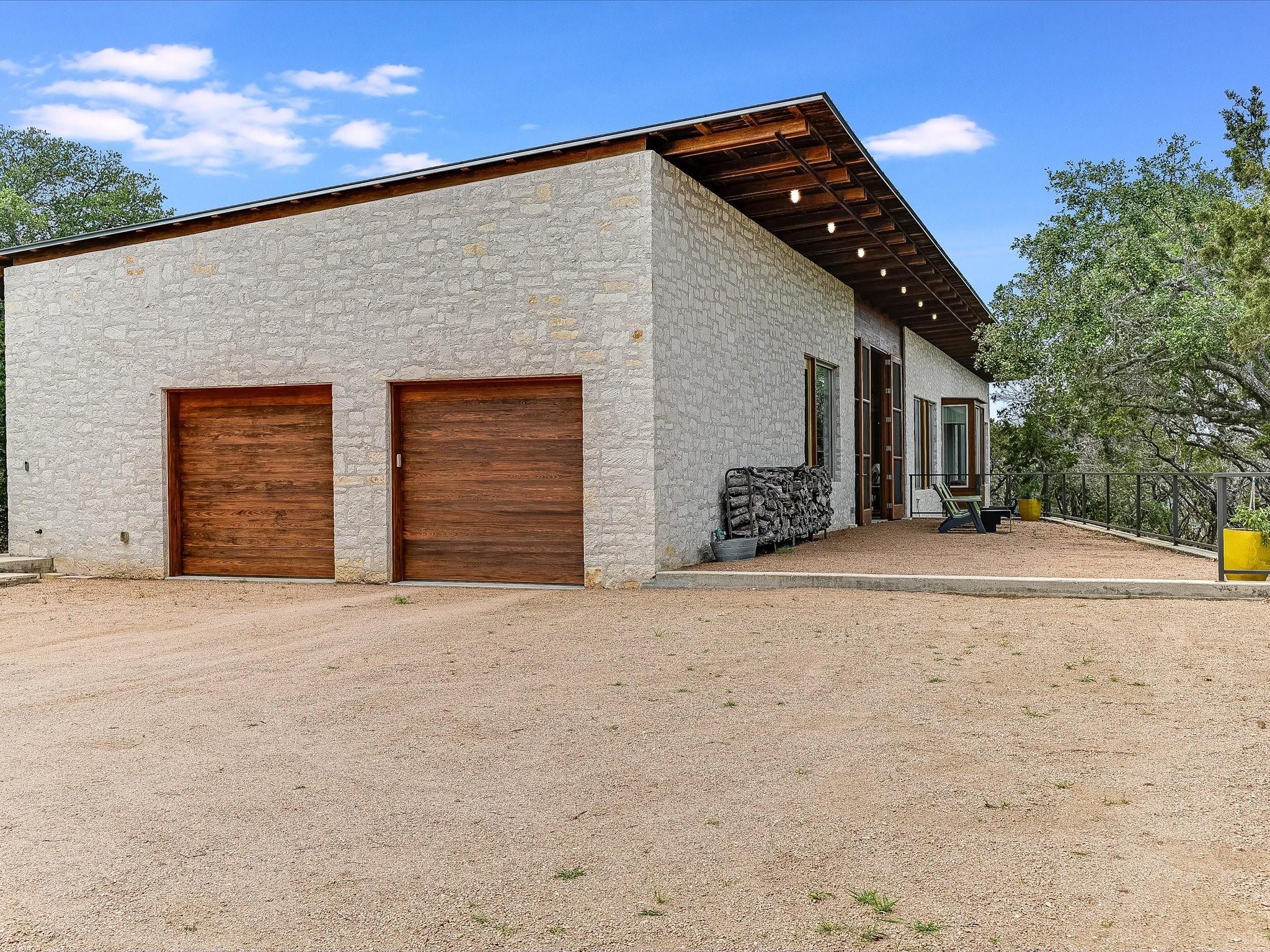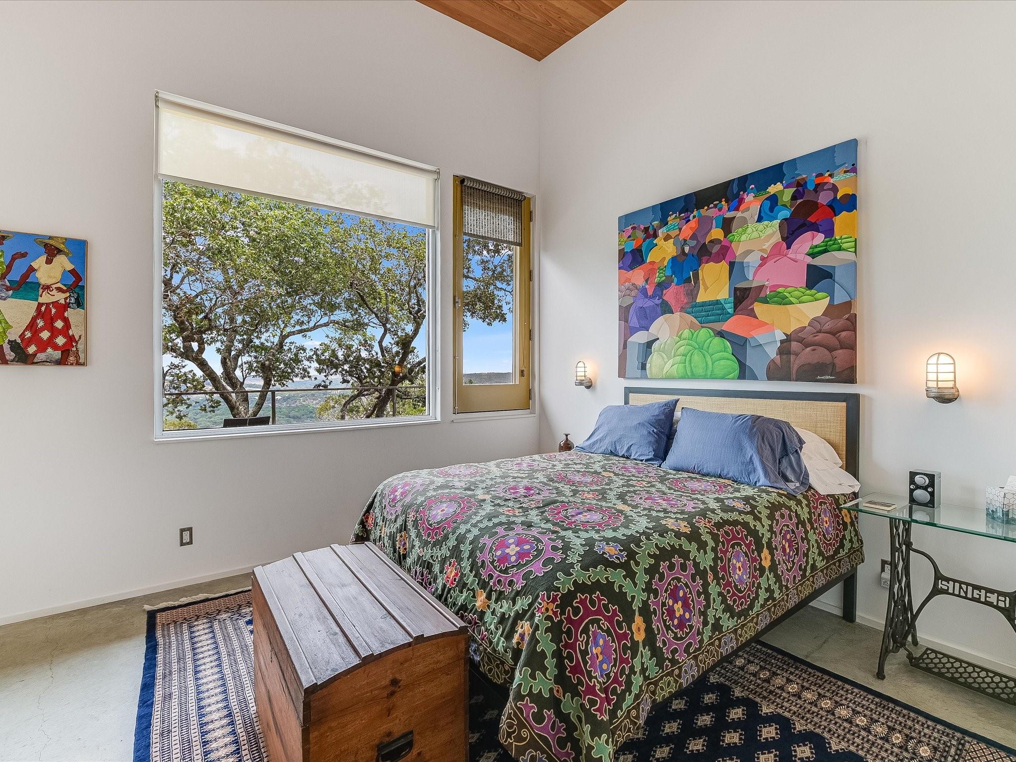 Fabulous architecture by Mell Lawrence, AIA; truly a work of art hidden in nature. An airy openness from very high ceilings, fantastic windows and beautiful materials. Ceilings are cypress; woodwork is rift-sawn white oak. Dogtrot design… main house has a large primary suite with study AND a library AND a wine cellar. Guest wing has two bedrooms + bath. The wings are connected by a huge breezeway screened porch with fireplace, sited to catch the prevailing southeast winds that flow up the hillside. Complete privacy from neighbors, but just 6 miles from Wimberley in one of the area’s most desirable neighborhoods – Red Hawk Road. Three platted lots; the house sits at the edge of a mesa on the easternmost lot... a guest house sits on the middle lot, and the westernmost lot is vacant. A cedar trail takes you through the woods down to a cliff above Lone Man Creek, with a lovely stone-walled terrace sited for views up and down the creek, a great place for a picnic or a glass of wine. Property comes with a private access easement on an adjacent jeep road, taking you to the same terrace. 20,000 gallon rainwater system for all household needs; water for guest house is from a well (well water is also piped to main house for irrigation). Whole-house propane generator will keep house running for days if there's ever a power loss. Large 2-car garage with workshop room, plus a car charger. A unique, special property featuring high-end design, quality, seclusion, beauty, and quietude. All this, AND: wildlife exemption to keep taxes LOW!!