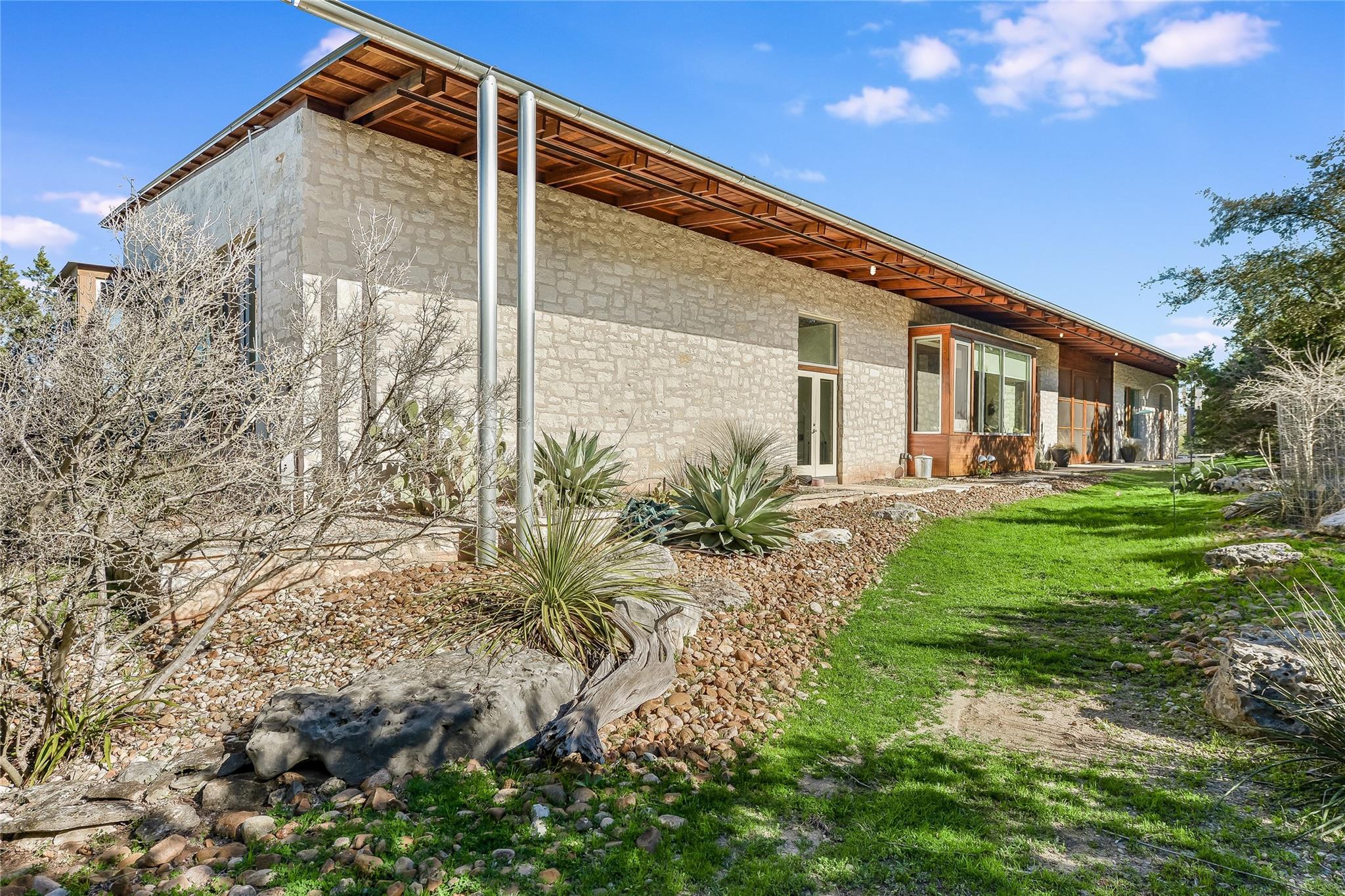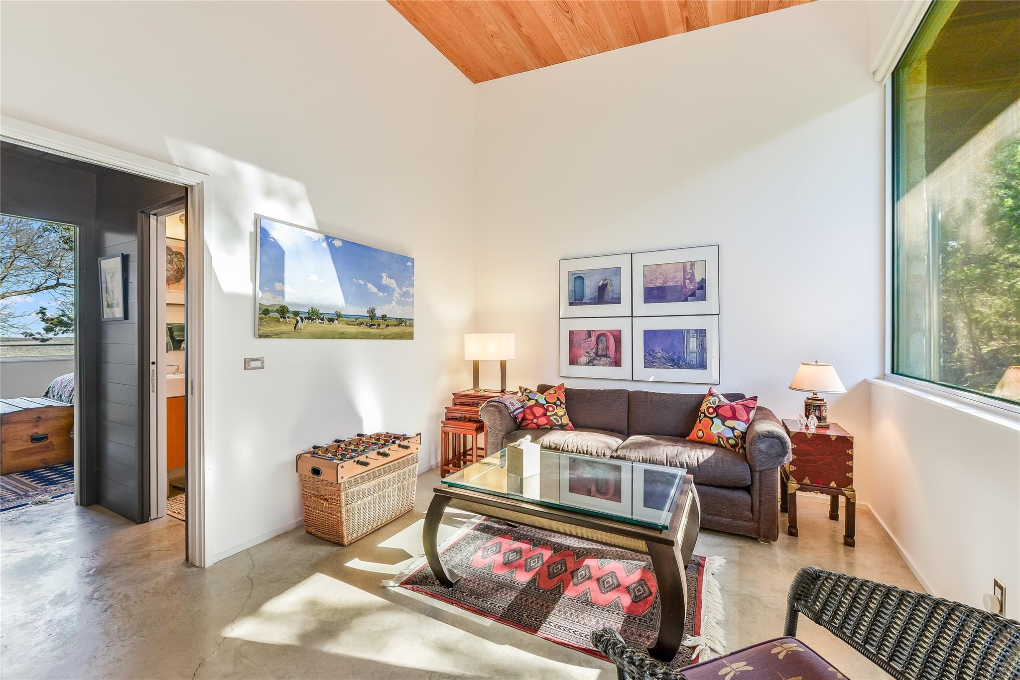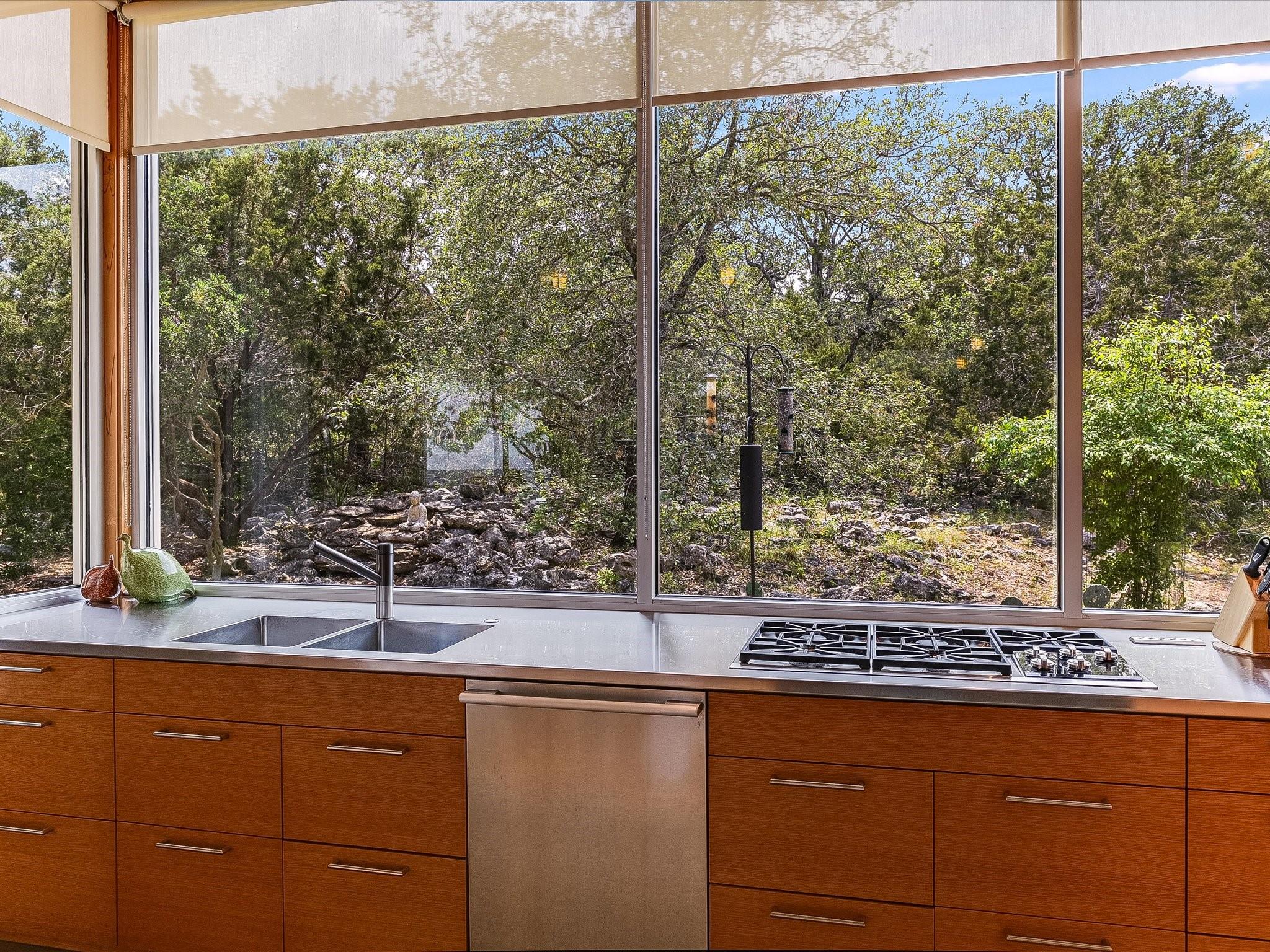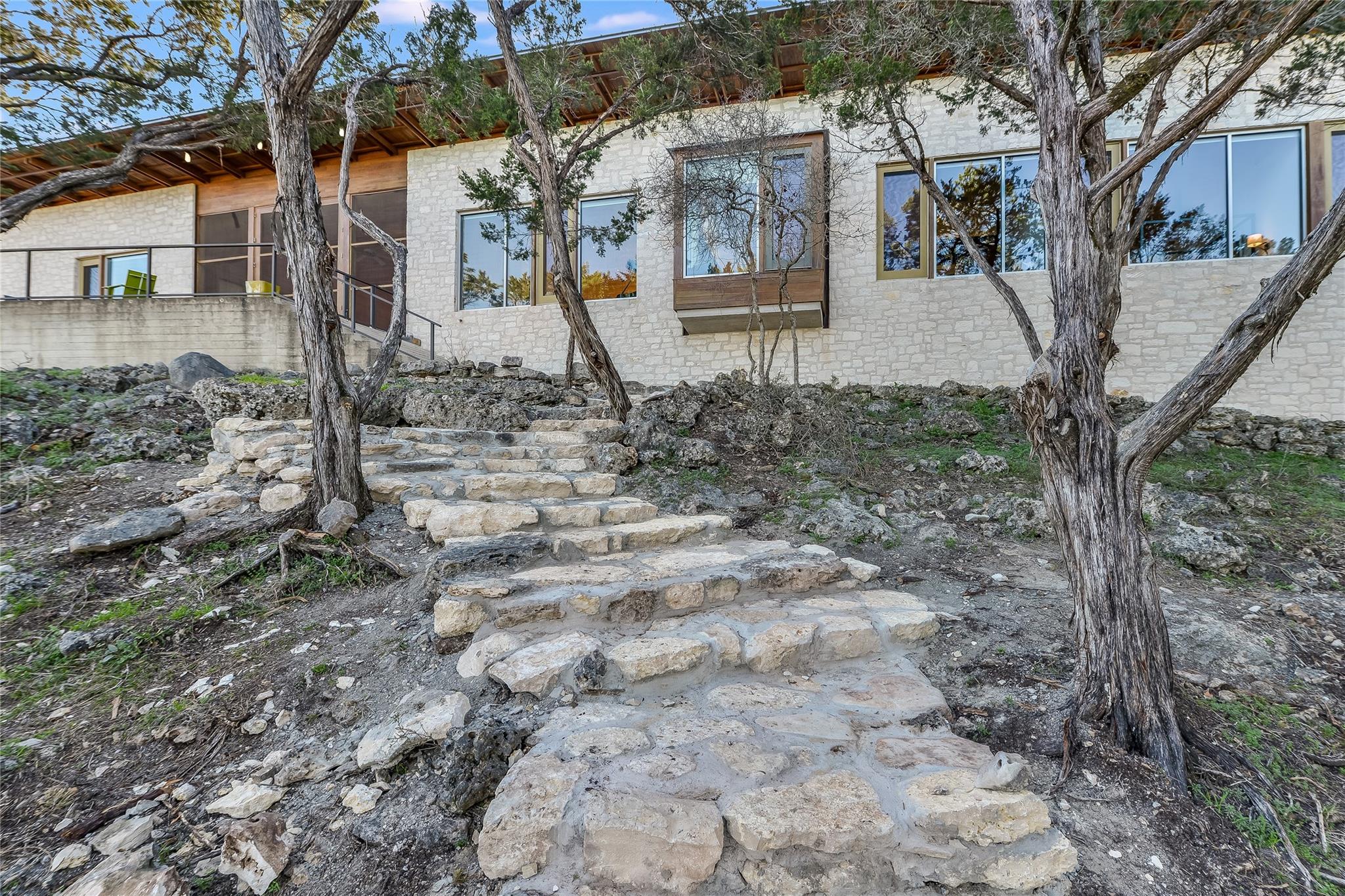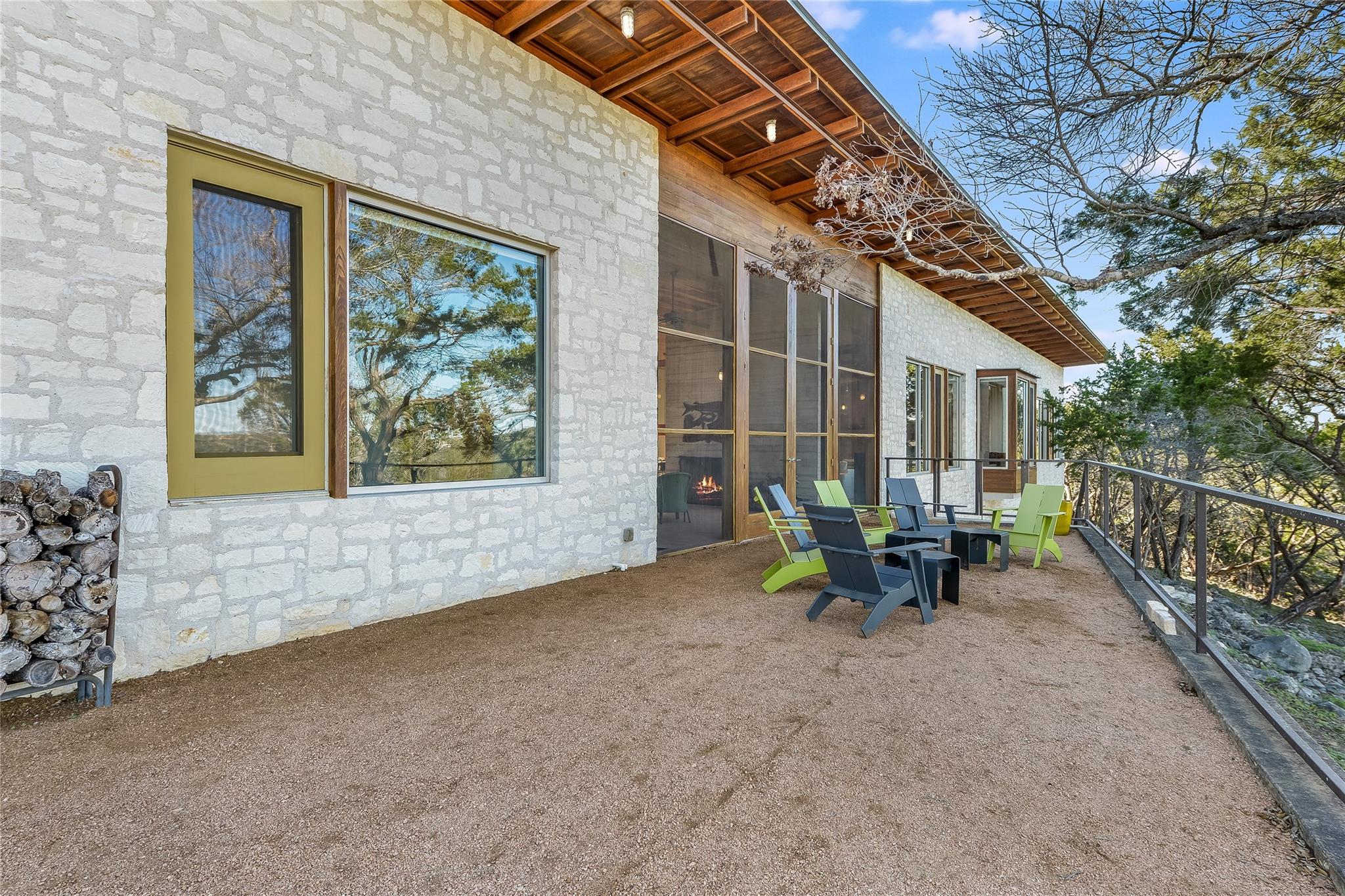 Fabulous architecture by Mell Lawrence, AIA; truly a work of art hidden in nature. An airy openness from very high ceilings, fantastic windows and beautiful materials. Ceilings are cypress; woodwork is rift-sawn white oak. Dogtrot design… main house has a large primary suite with study AND a library AND a wine cellar. Guest wing has two bedrooms + bath. The wings are connected by a huge breezeway screened porch with fireplace, sited to catch the prevailing southeast winds that flow up the hillside. Complete privacy from neighbors, but just 6 miles from Wimberley in one of the area’s most desirable neighborhoods – Red Hawk Road. Three platted lots; the house sits at the edge of a mesa on the easternmost lot... a guest house sits on the middle lot, and the westernmost lot is vacant. A cedar trail takes you through the woods down to a cliff above Lone Man Creek, with a lovely stone-walled terrace sited for views up and down the creek, a great place for a picnic or a glass of wine. Property comes with a private access easement on an adjacent jeep road, taking you to the same terrace. 20,000 gallon rainwater system for all household needs; water for guest house is from a well (well water is also piped to main house for irrigation). Whole-house propane generator will keep house running for days if there's ever a power loss. Large 2-car garage with workshop room, plus a car charger. A unique, special property featuring high-end design, quality, seclusion, beauty, and quietude. All this, AND: wildlife exemption to keep taxes LOW!!