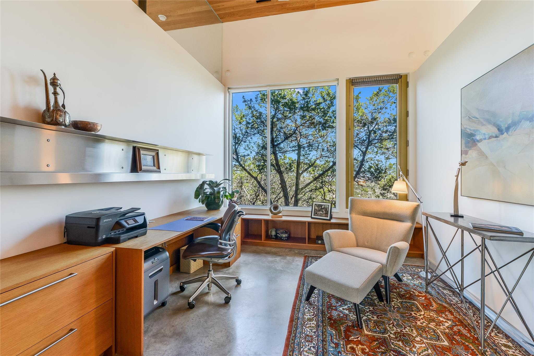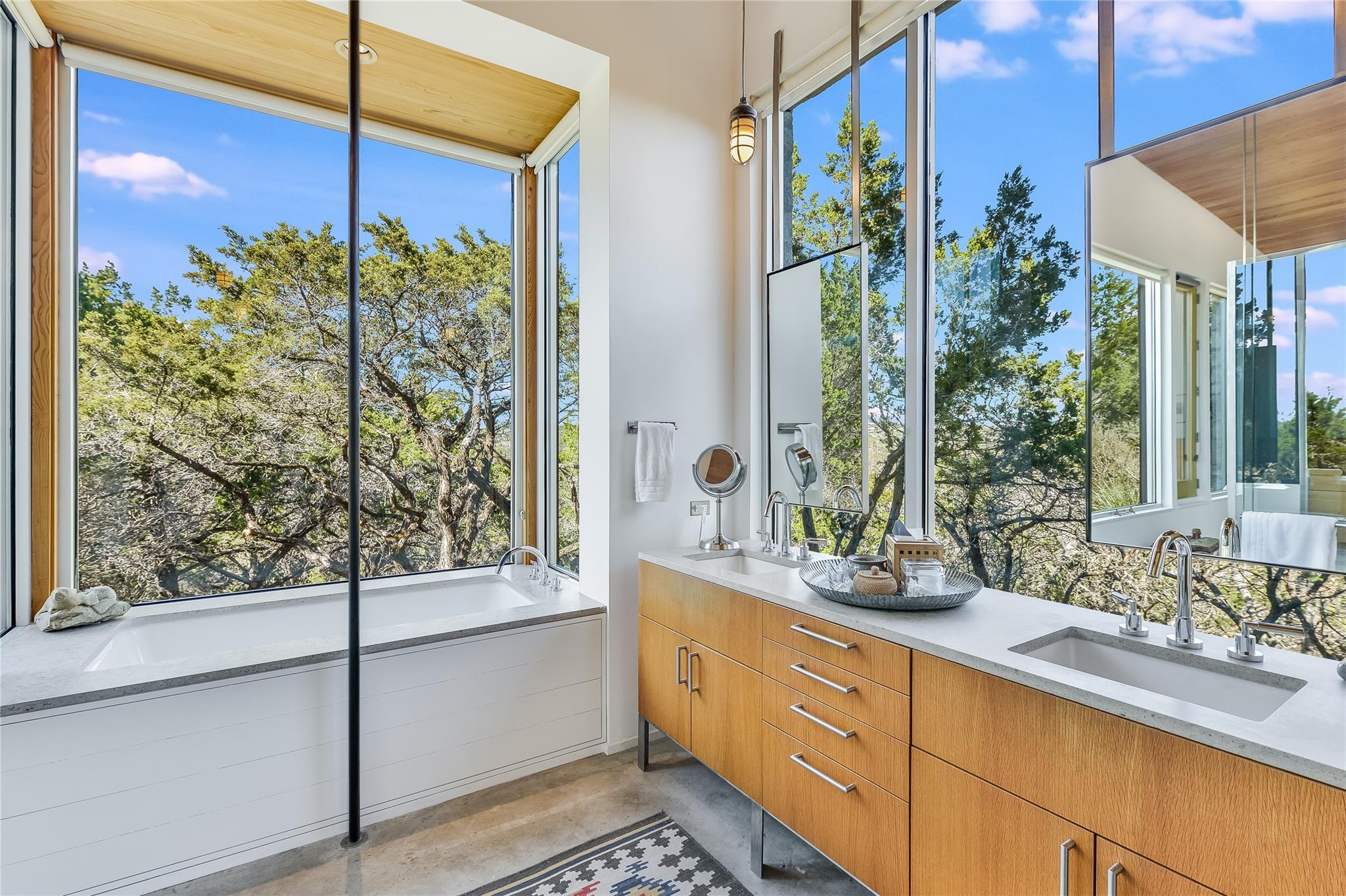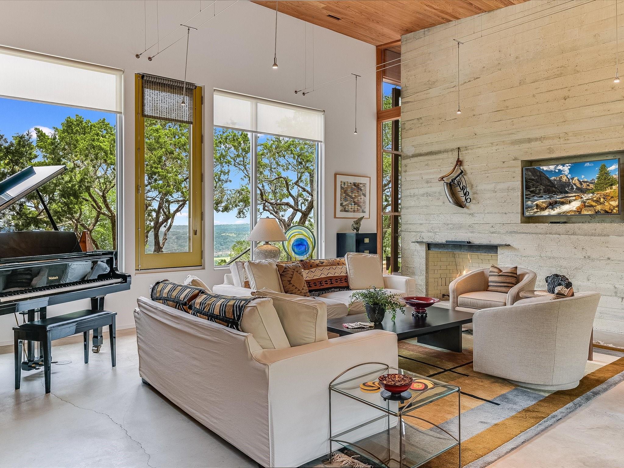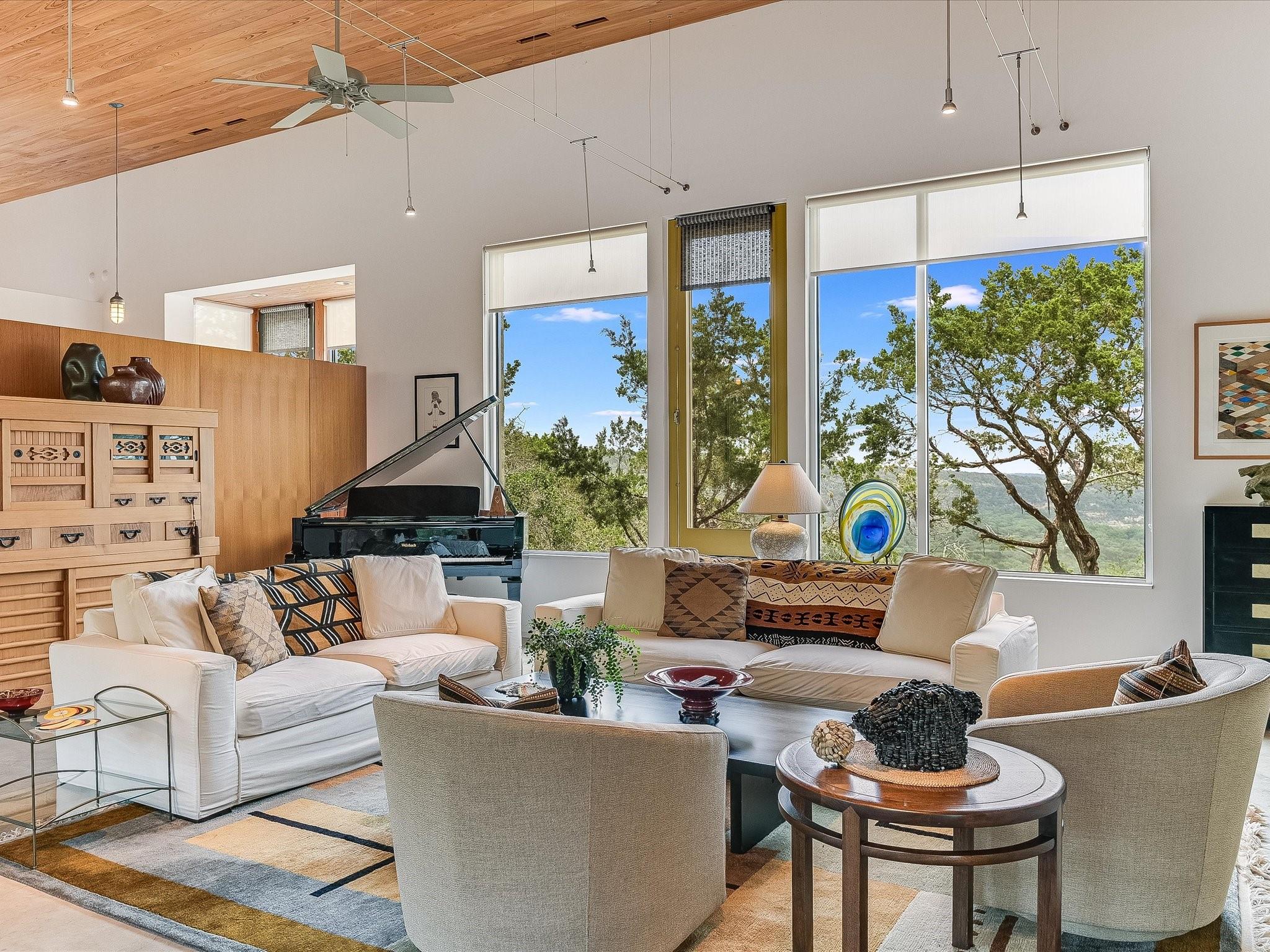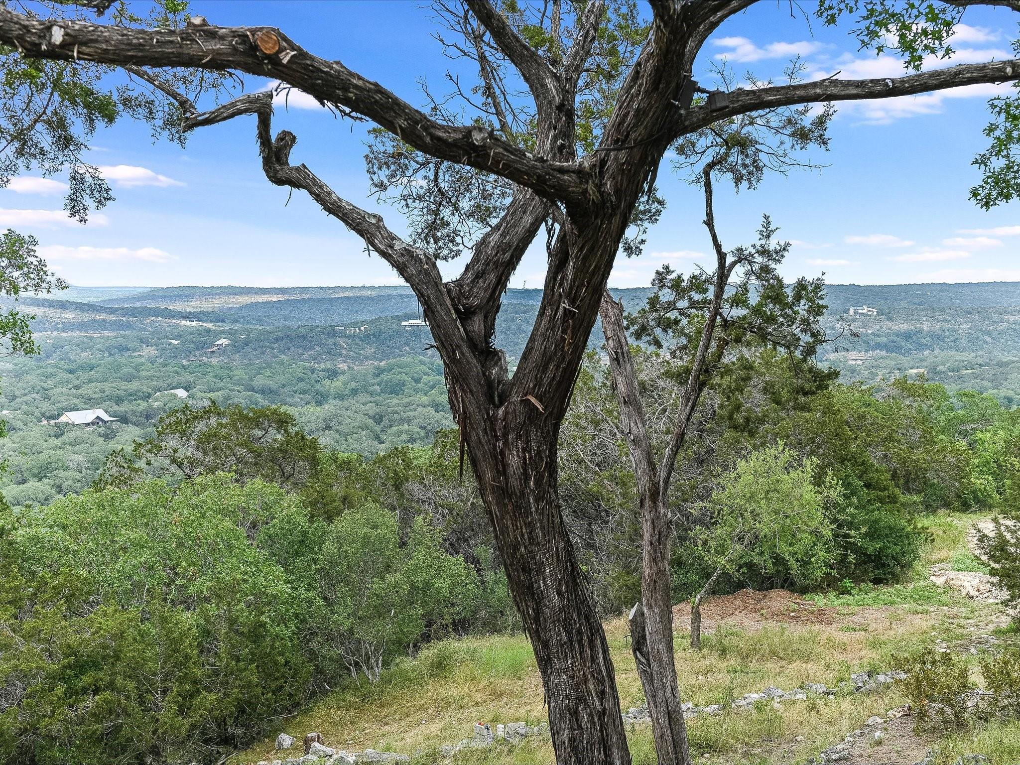 Fabulous architecture by Mell Lawrence, AIA; truly a work of art hidden in nature. An airy openness from very high ceilings, fantastic windows and beautiful materials. Ceilings are cypress; woodwork is rift-sawn white oak. Dogtrot design… main house has a large primary suite with study AND a library AND a wine cellar. Guest wing has two bedrooms + bath. The wings are connected by a huge breezeway screened porch with fireplace, sited to catch the prevailing southeast winds that flow up the hillside. Complete privacy from neighbors, but just 6 miles from Wimberley in one of the area’s most desirable neighborhoods – Red Hawk Road. Three platted lots; the house sits at the edge of a mesa on the easternmost lot... a guest house sits on the middle lot, and the westernmost lot is vacant. A cedar trail takes you through the woods down to a cliff above Lone Man Creek, with a lovely stone-walled terrace sited for views up and down the creek, a great place for a picnic or a glass of wine. Property comes with a private access easement on an adjacent jeep road, taking you to the same terrace. 20,000 gallon rainwater system for all household needs; water for guest house is from a well (well water is also piped to main house for irrigation). Whole-house propane generator will keep house running for days if there's ever a power loss. Large 2-car garage with workshop room, plus a car charger. A unique, special property featuring high-end design, quality, seclusion, beauty, and quietude. All this, AND: wildlife exemption to keep taxes LOW!!
