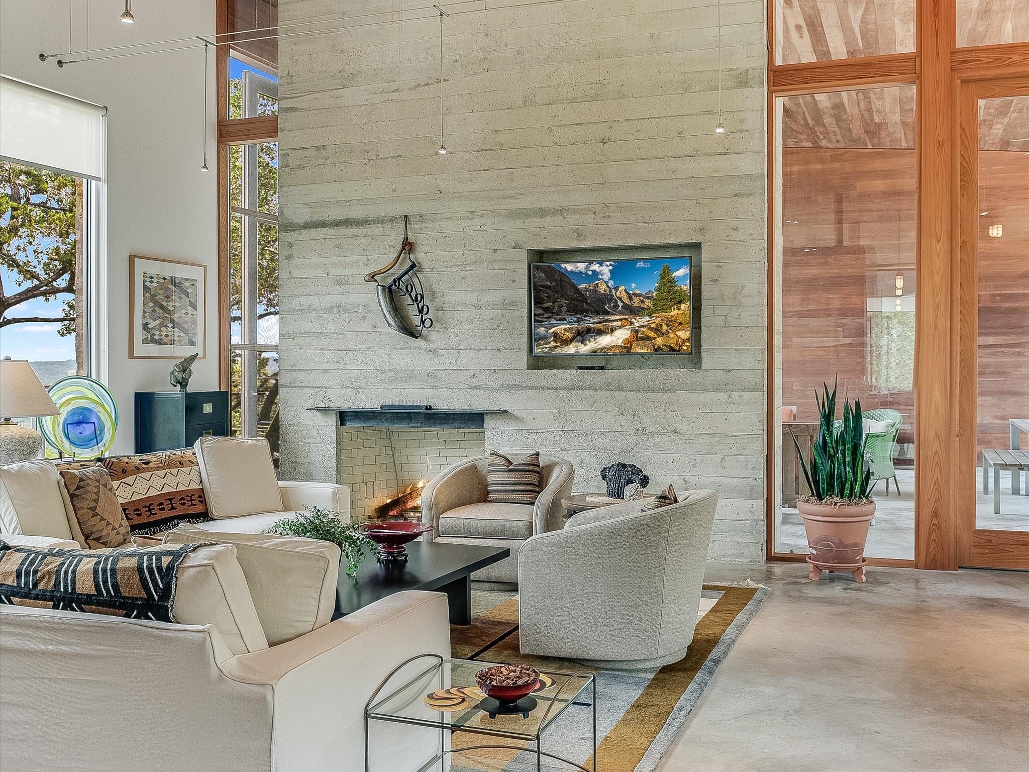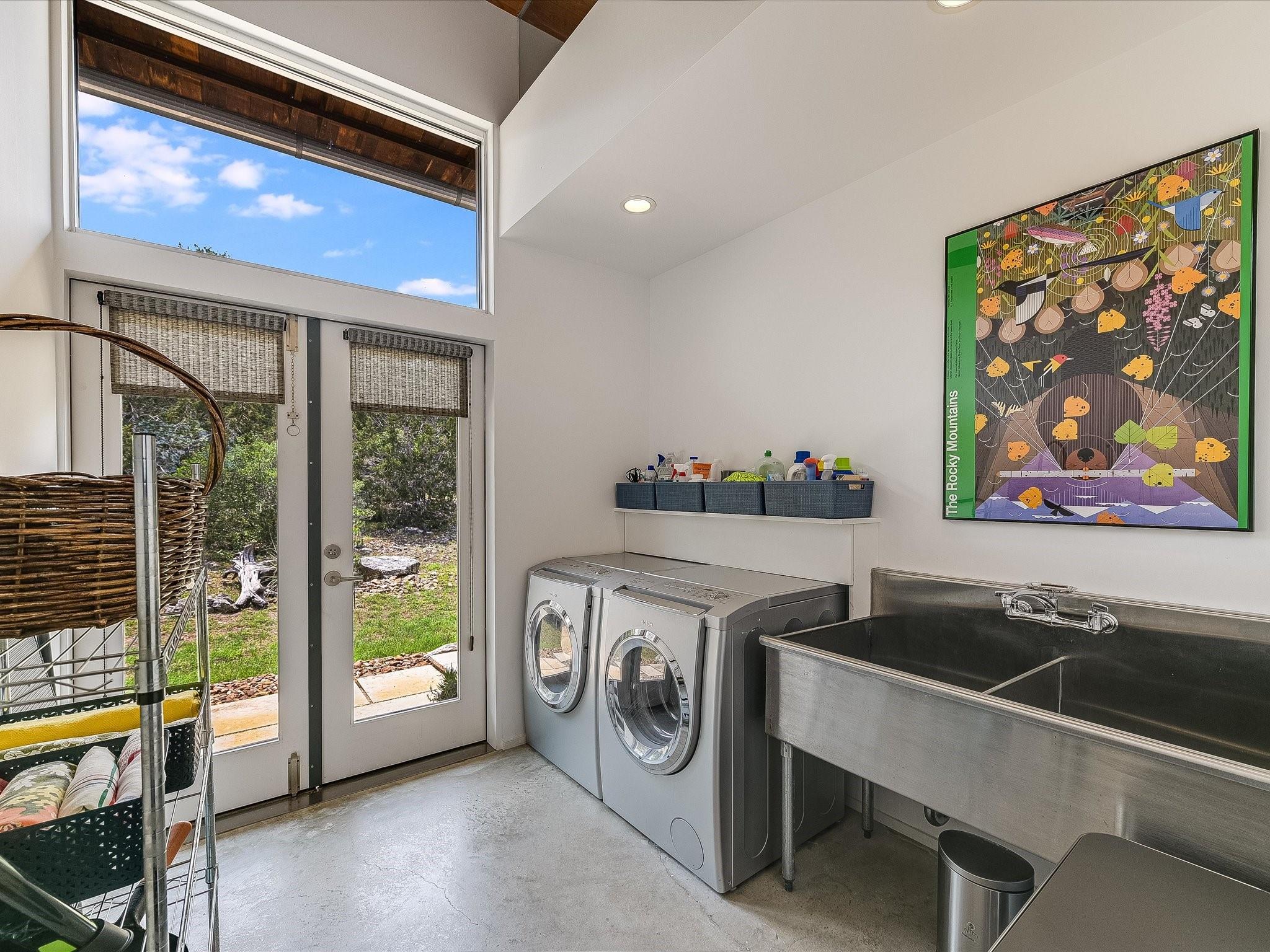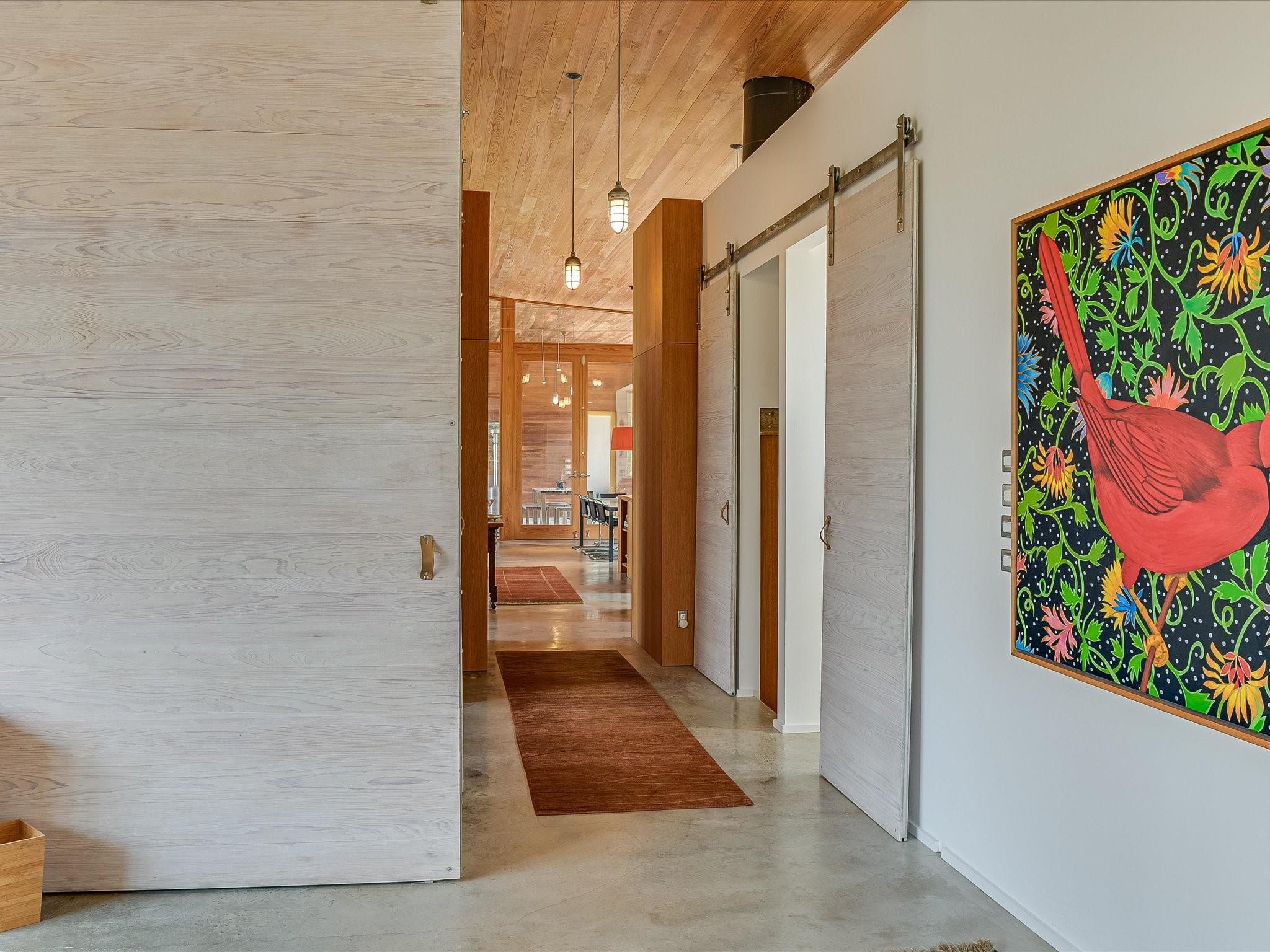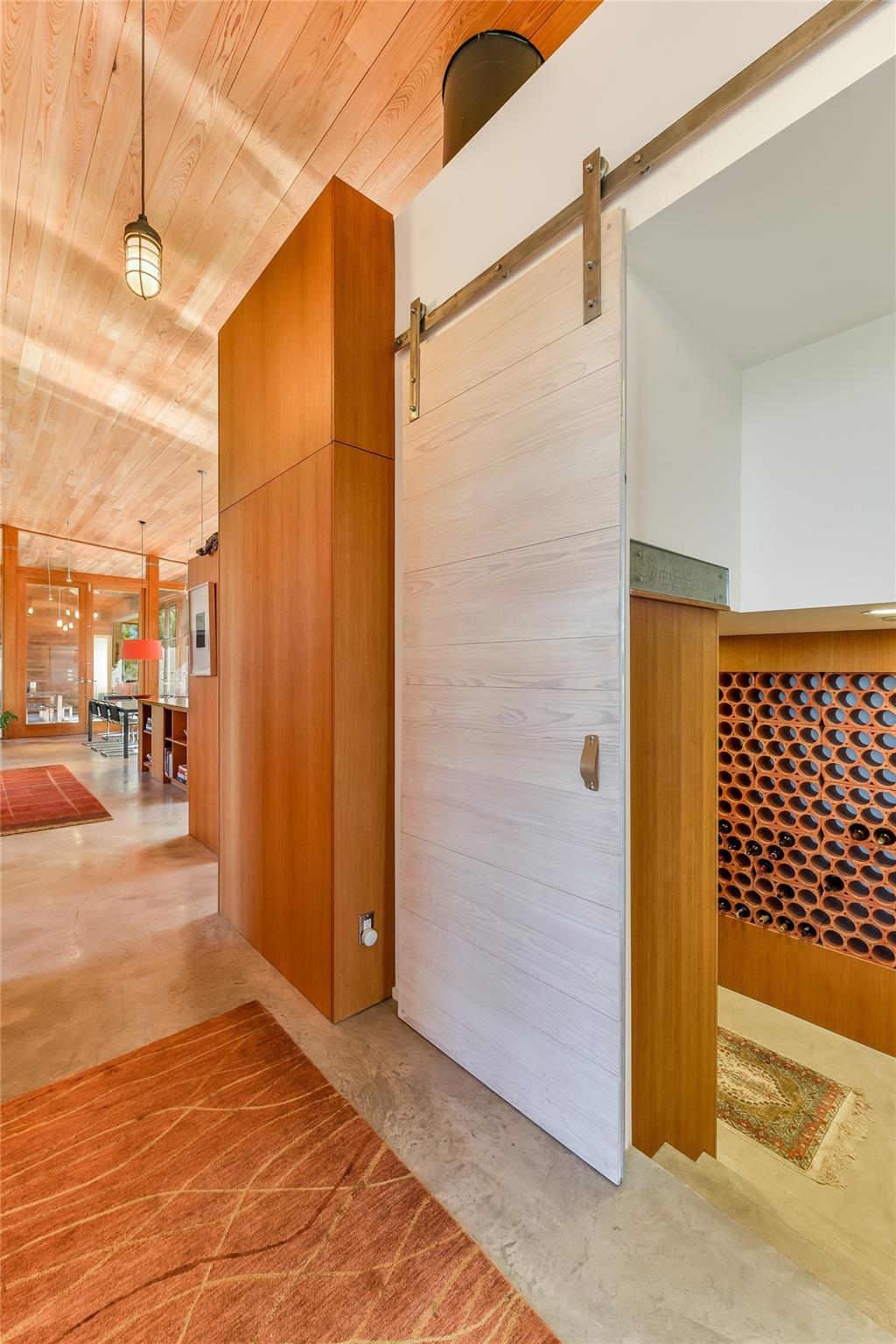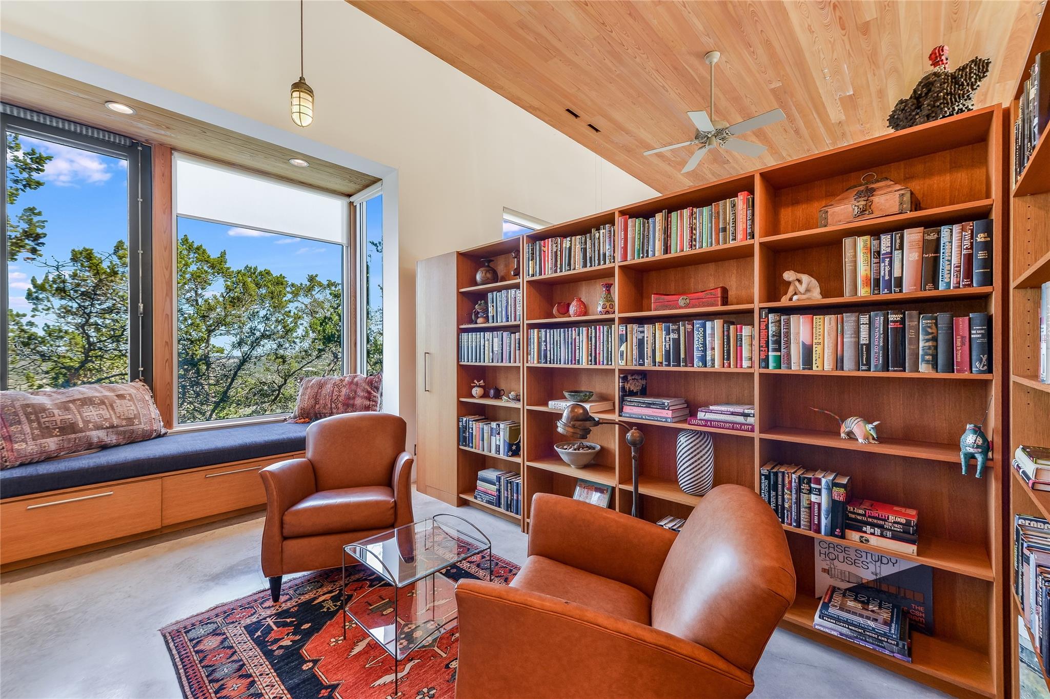 Fabulous architecture by Mell Lawrence, AIA; truly a work of art hidden in nature. An airy openness from very high ceilings, fantastic windows and beautiful materials. Ceilings are cypress; woodwork is rift-sawn white oak. Dogtrot design… main house has a large primary suite with study AND a library AND a wine cellar. Guest wing has two bedrooms + bath. The wings are connected by a huge breezeway screened porch with fireplace, sited to catch the prevailing southeast winds that flow up the hillside. Complete privacy from neighbors, but just 6 miles from Wimberley in one of the area’s most desirable neighborhoods – Red Hawk Road. Three platted lots; the house sits at the edge of a mesa on the easternmost lot... a guest house sits on the middle lot, and the westernmost lot is vacant. A cedar trail takes you through the woods down to a cliff above Lone Man Creek, with a lovely stone-walled terrace sited for views up and down the creek, a great place for a picnic or a glass of wine. Property comes with a private access easement on an adjacent jeep road, taking you to the same terrace. 20,000 gallon rainwater system for all household needs; water for guest house is from a well (well water is also piped to main house for irrigation). Whole-house propane generator will keep house running for days if there's ever a power loss. Large 2-car garage with workshop room, plus a car charger. A unique, special property featuring high-end design, quality, seclusion, beauty, and quietude. All this, AND: wildlife exemption to keep taxes LOW!!