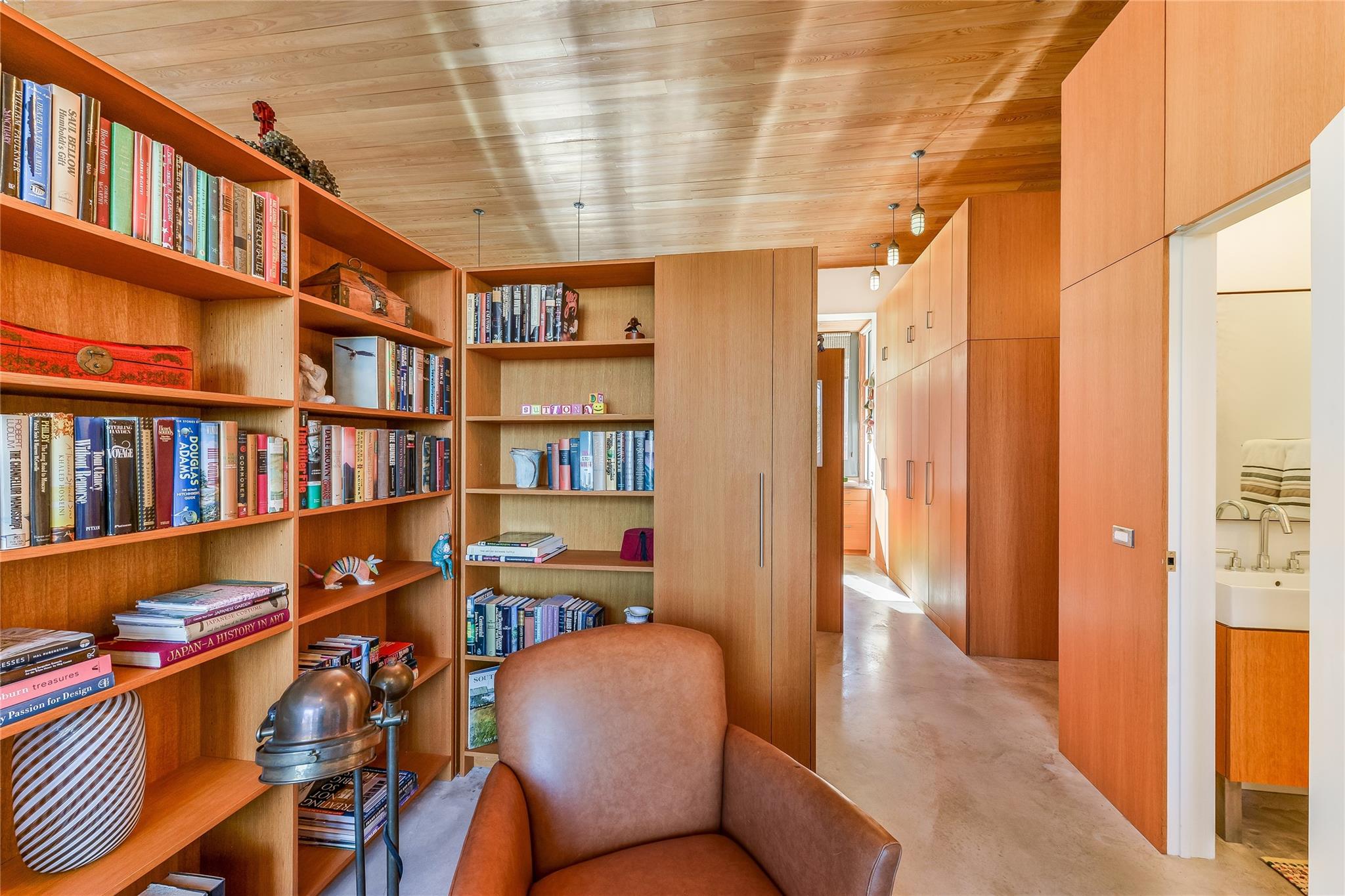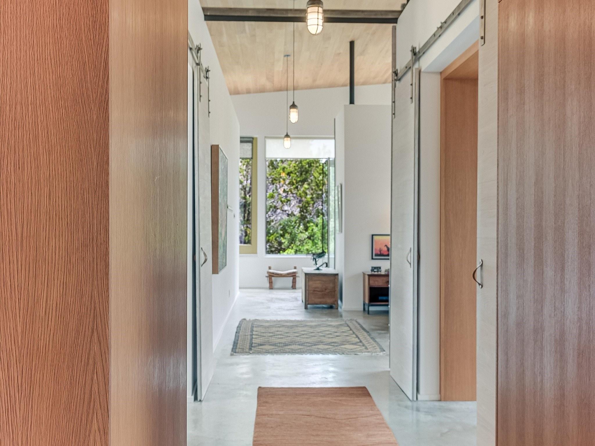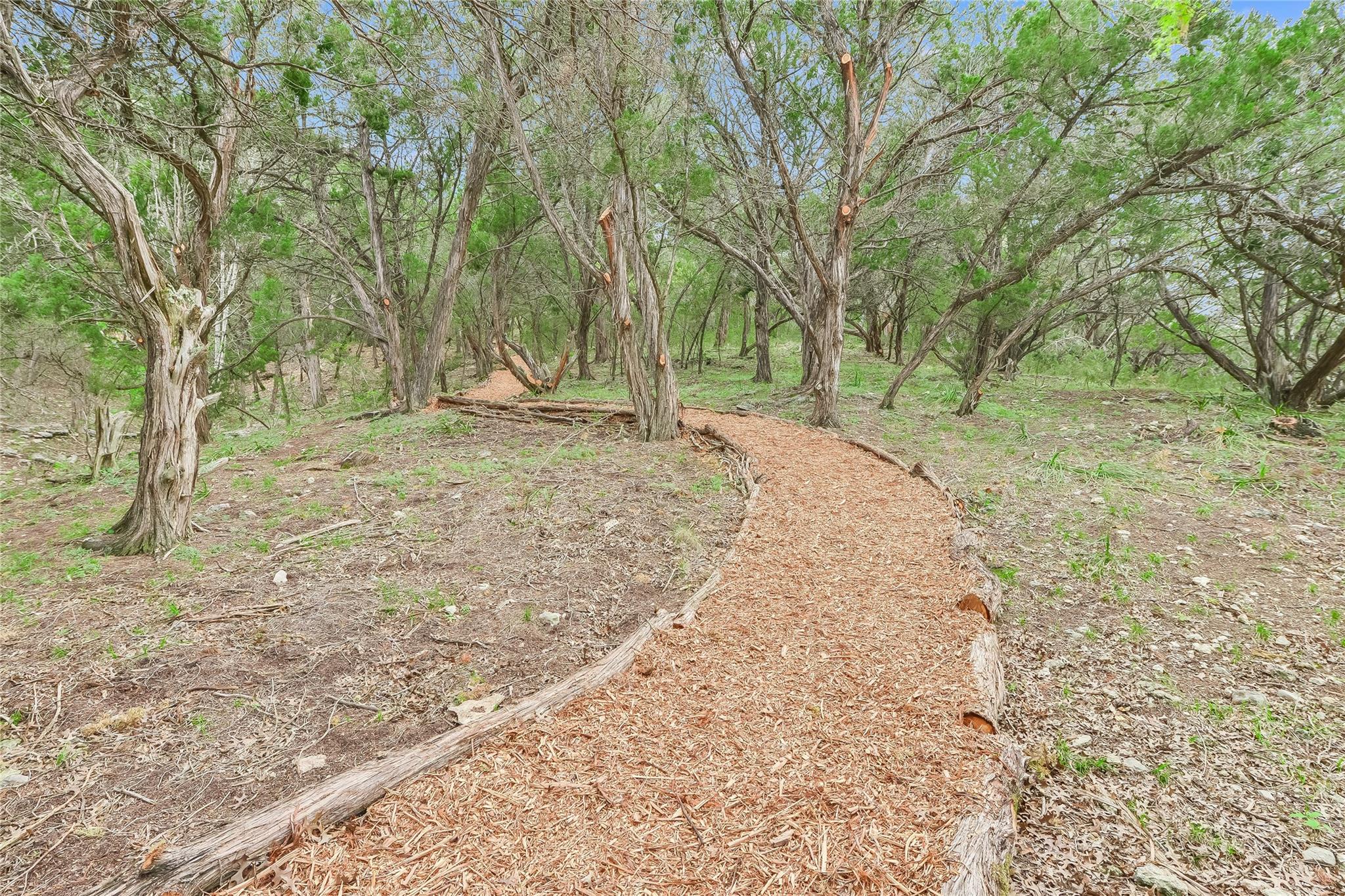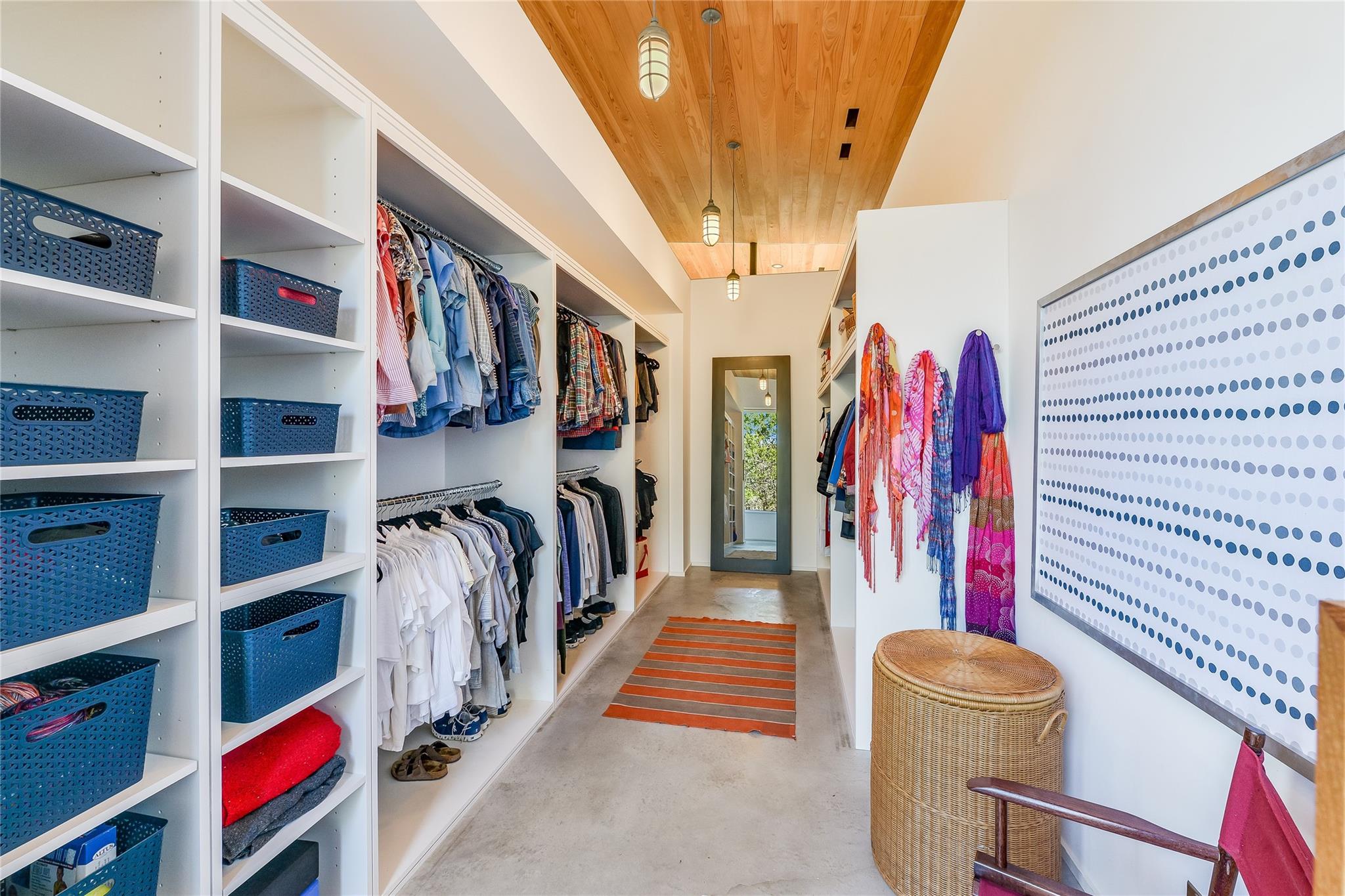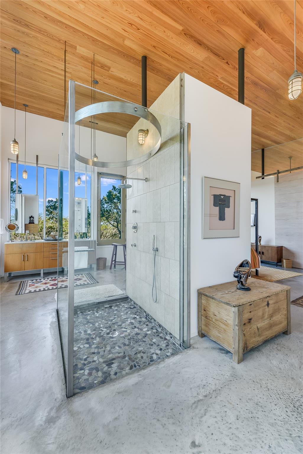 Fabulous architecture by Mell Lawrence, AIA; truly a work of art hidden in nature. An airy openness from very high ceilings, fantastic windows and beautiful materials. Ceilings are cypress; woodwork is rift-sawn white oak. Dogtrot design… main house has a large primary suite with study AND a library AND a wine cellar. Guest wing has two bedrooms + bath. The wings are connected by a huge breezeway screened porch with fireplace, sited to catch the prevailing southeast winds that flow up the hillside. Complete privacy from neighbors, but just 6 miles from Wimberley in one of the area’s most desirable neighborhoods – Red Hawk Road. Three platted lots; the house sits at the edge of a mesa on the easternmost lot... a guest house sits on the middle lot, and the westernmost lot is vacant. A cedar trail takes you through the woods down to a cliff above Lone Man Creek, with a lovely stone-walled terrace sited for views up and down the creek, a great place for a picnic or a glass of wine. Property comes with a private access easement on an adjacent jeep road, taking you to the same terrace. 20,000 gallon rainwater system for all household needs; water for guest house is from a well (well water is also piped to main house for irrigation). Whole-house propane generator will keep house running for days if there's ever a power loss. Large 2-car garage with workshop room, plus a car charger. A unique, special property featuring high-end design, quality, seclusion, beauty, and quietude. All this, AND: wildlife exemption to keep taxes LOW!!