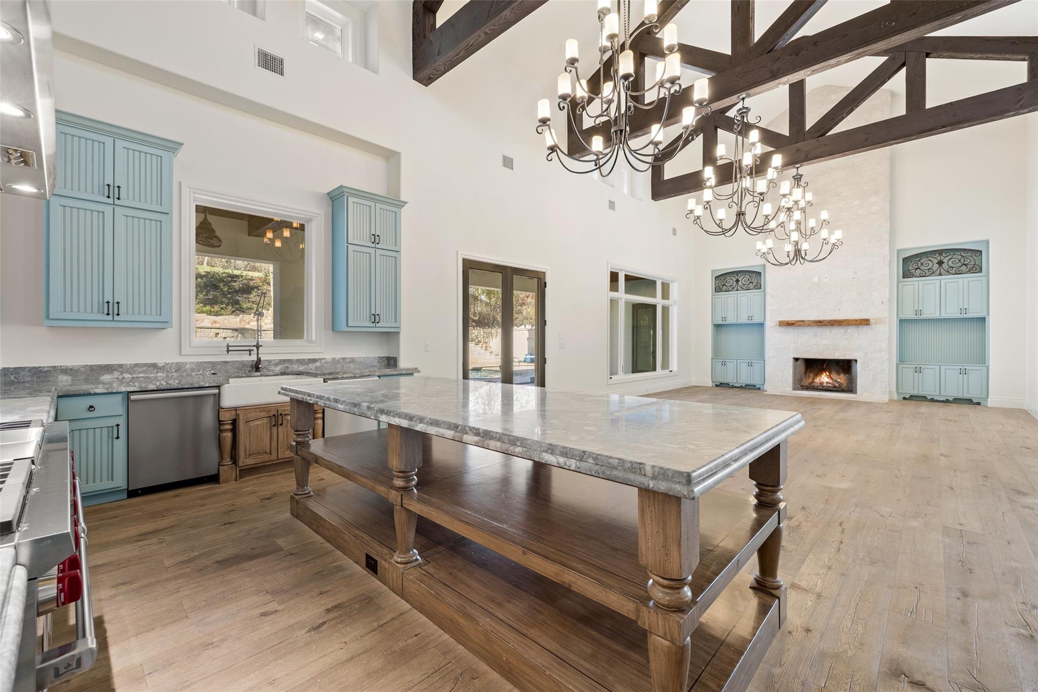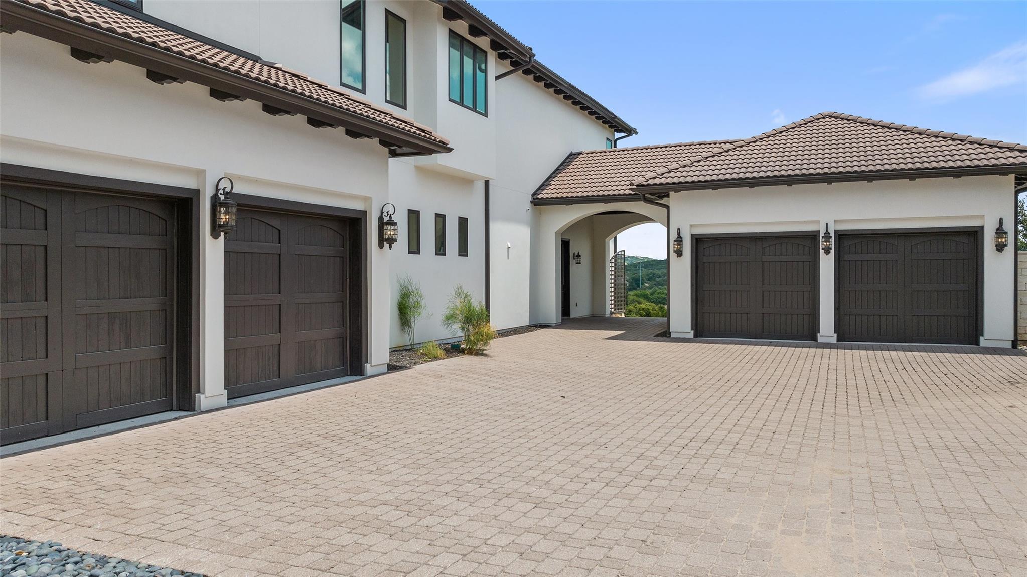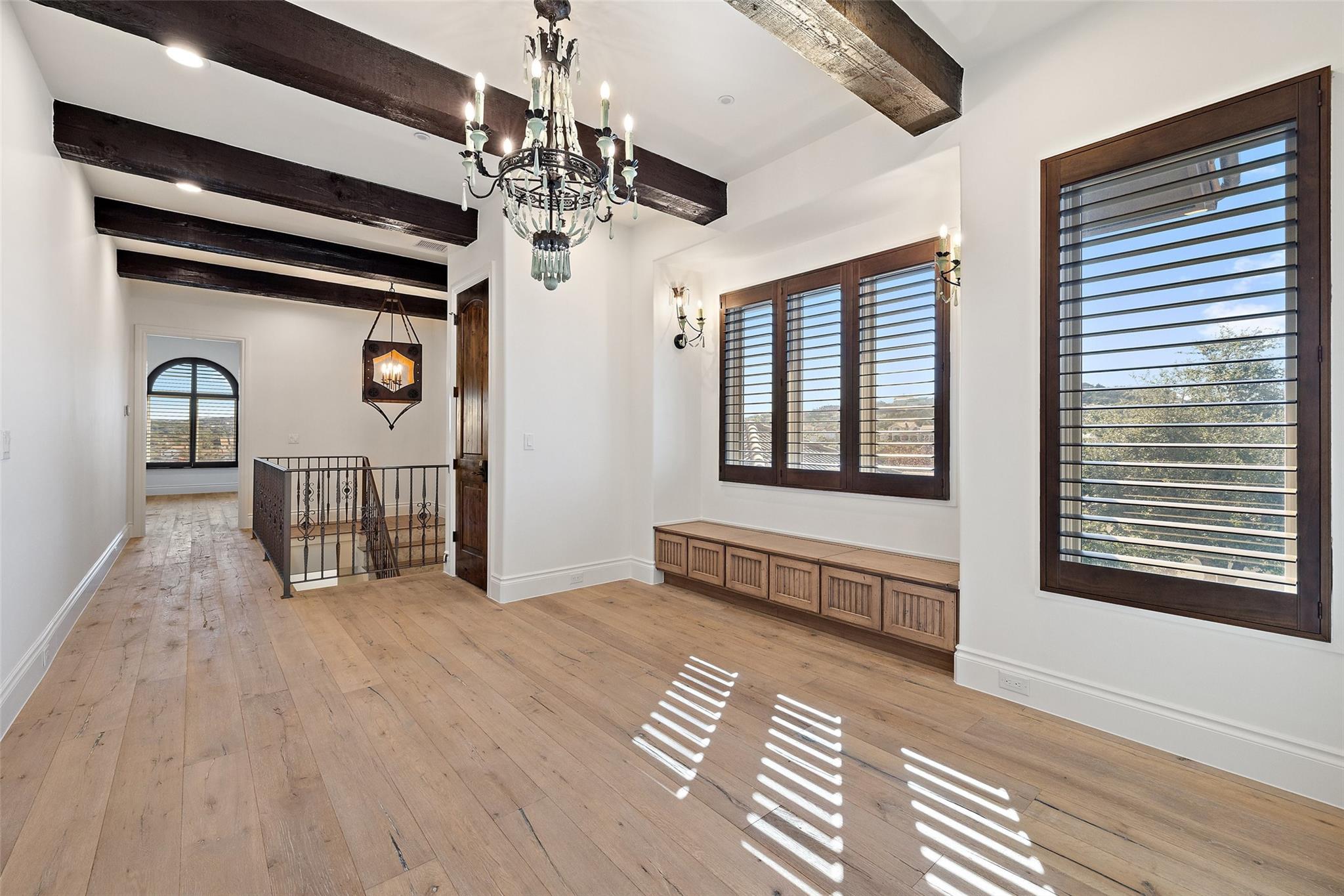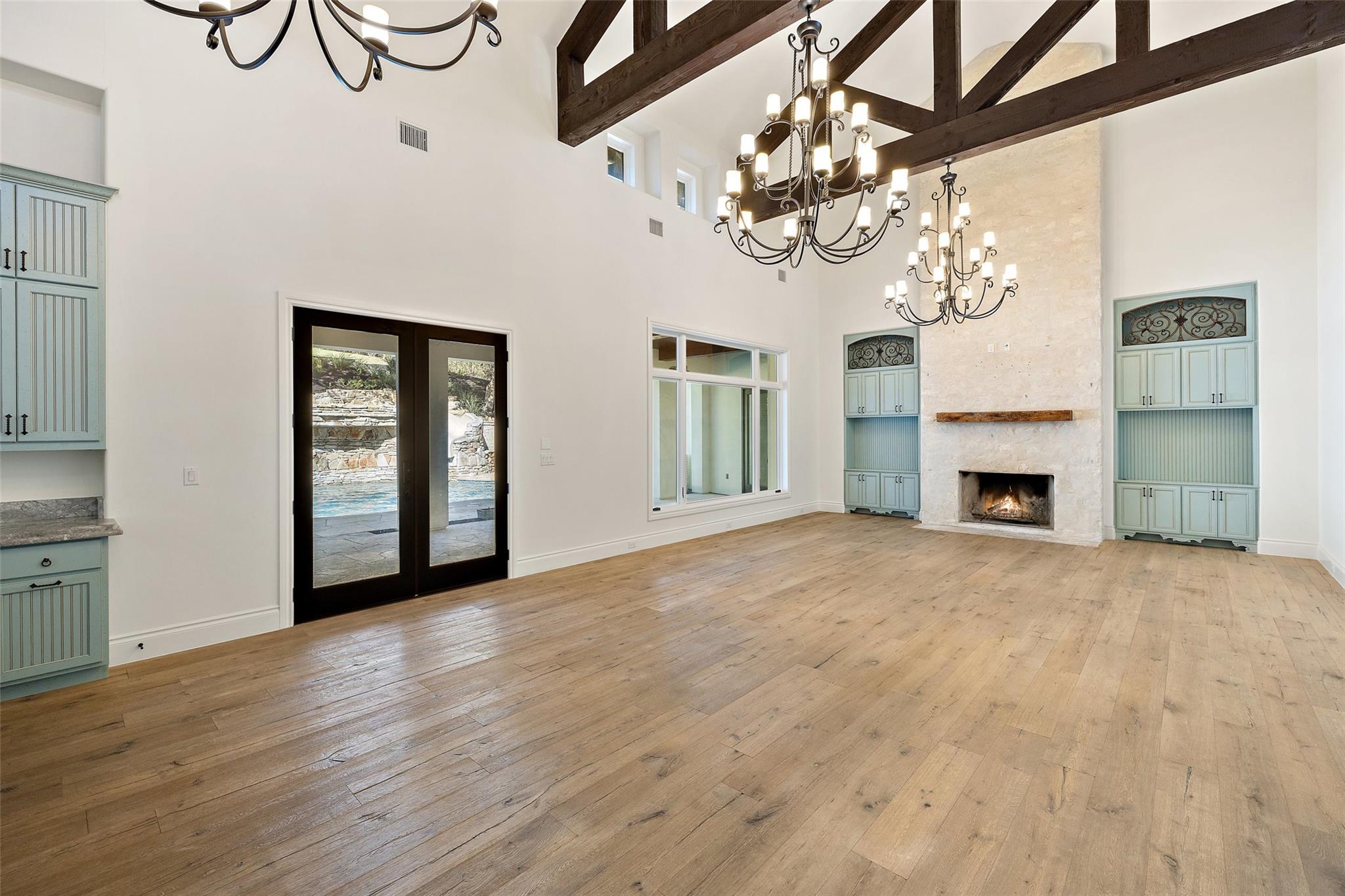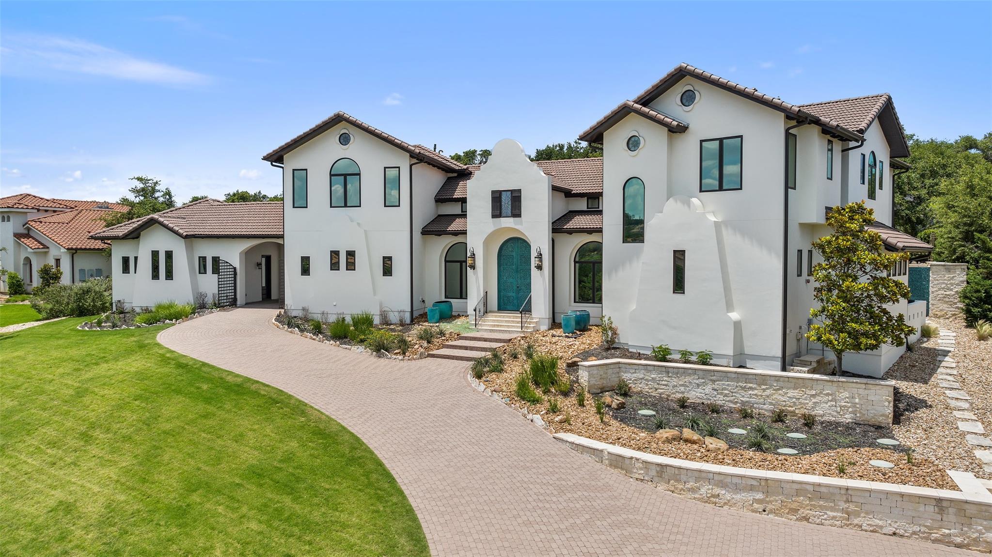 This Mediterranean-style Seven Oaks home is thoughtfully designed for the ultimate indoor-outdoor lifestyle. The terraced backyard oasis is perfect for entertaining with a sports court, inground trampoline, tether ball, and outdoor shower. The 15-ft deep swimming pool is a destination for all ages with a waterfall feature, a jumping ledge, a rope swing, a waterslide, and a diving board. Twenty-four-foot ceilings with striking wood trusses and arched doorways adorn the interior. Oversized windows feature custom plantation shutters. The great room is anchored at one end by a ceiling-height fireplace, while a chef’s kitchen graces the other, with an island and a butler’s pantry with walk-in storage and ice maker. Designer appliances include a 60” Wolf range with 6 burners and a griddle/grill, double Wolf ovens, two Miele dishwashers, and a Sub-Zero fridge. Your primary suite is a sanctuary with a fireplace and an expansive spa bath featuring a custom dressing room, a soaking tub, a frameless glass shower, and two vanities. This home includes luxuries for everyone, including a playroom with a bunk set-up and fire pole and a dog room nestled under the stairs. This 6,600+SF home’s upstairs layout makes for effortless multigenerational living. Two private staircases lead to separate wings; one offers two large bedrooms connected by a Jack and Jill bathroom, and the other offers two oversized bedroom suites. The home is set back off the street with an extended paver driveway, giving you the utmost privacy, with a hidden four-car garage and porte-cochere side entry. Seven Oaks is a quiet enclave in Westlake with large, custom homes on lots of at least an acre. You’ll enjoy a little elbow room and one foot in the Hill Country, with proximity to great schools (Eanes ISD), Bee Caves Road, and 360. Lake Travis and Downtown Austin are less than 30 minutes away.