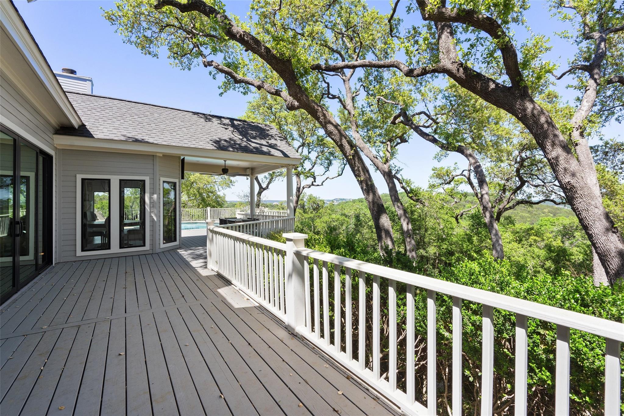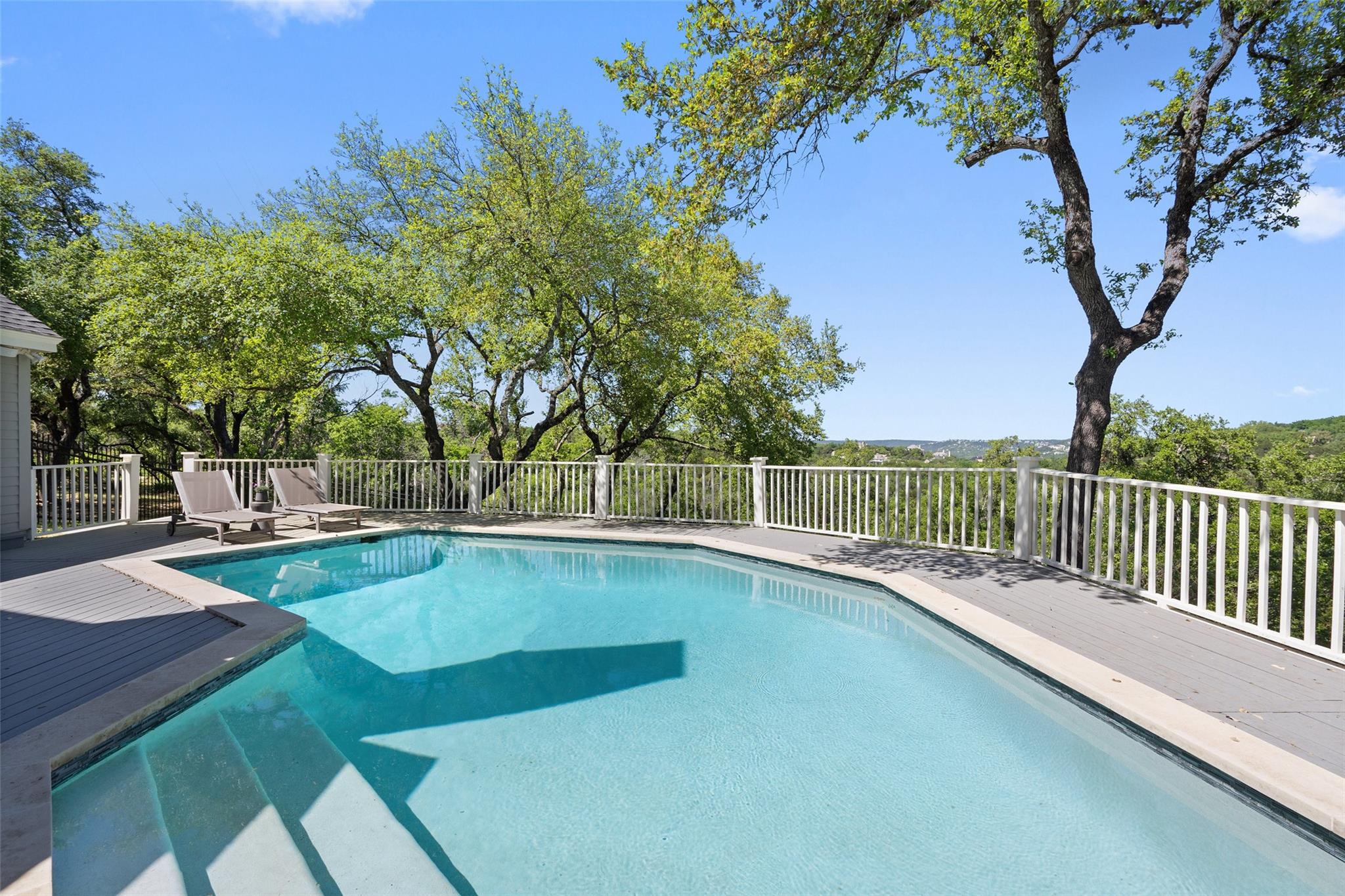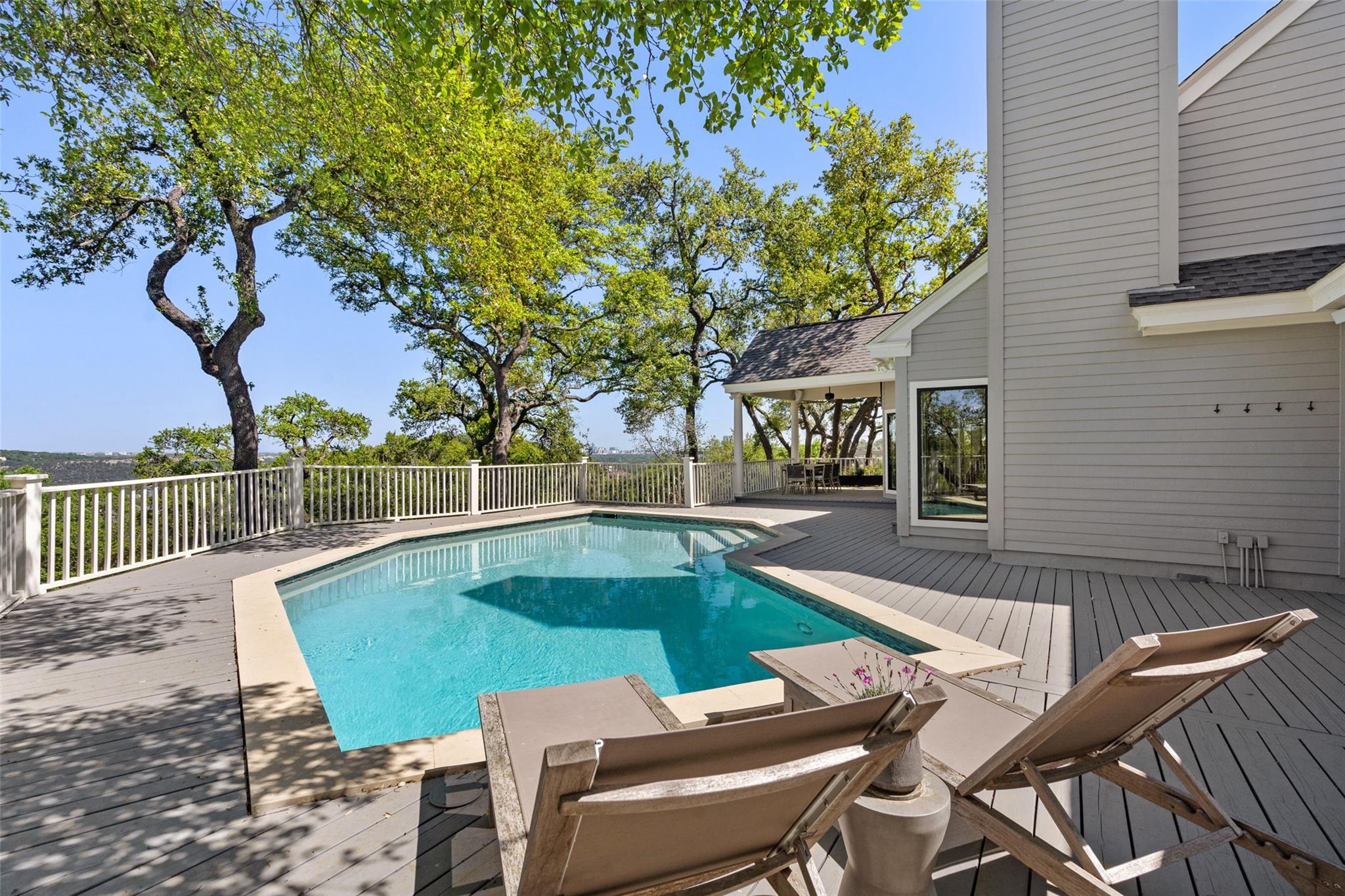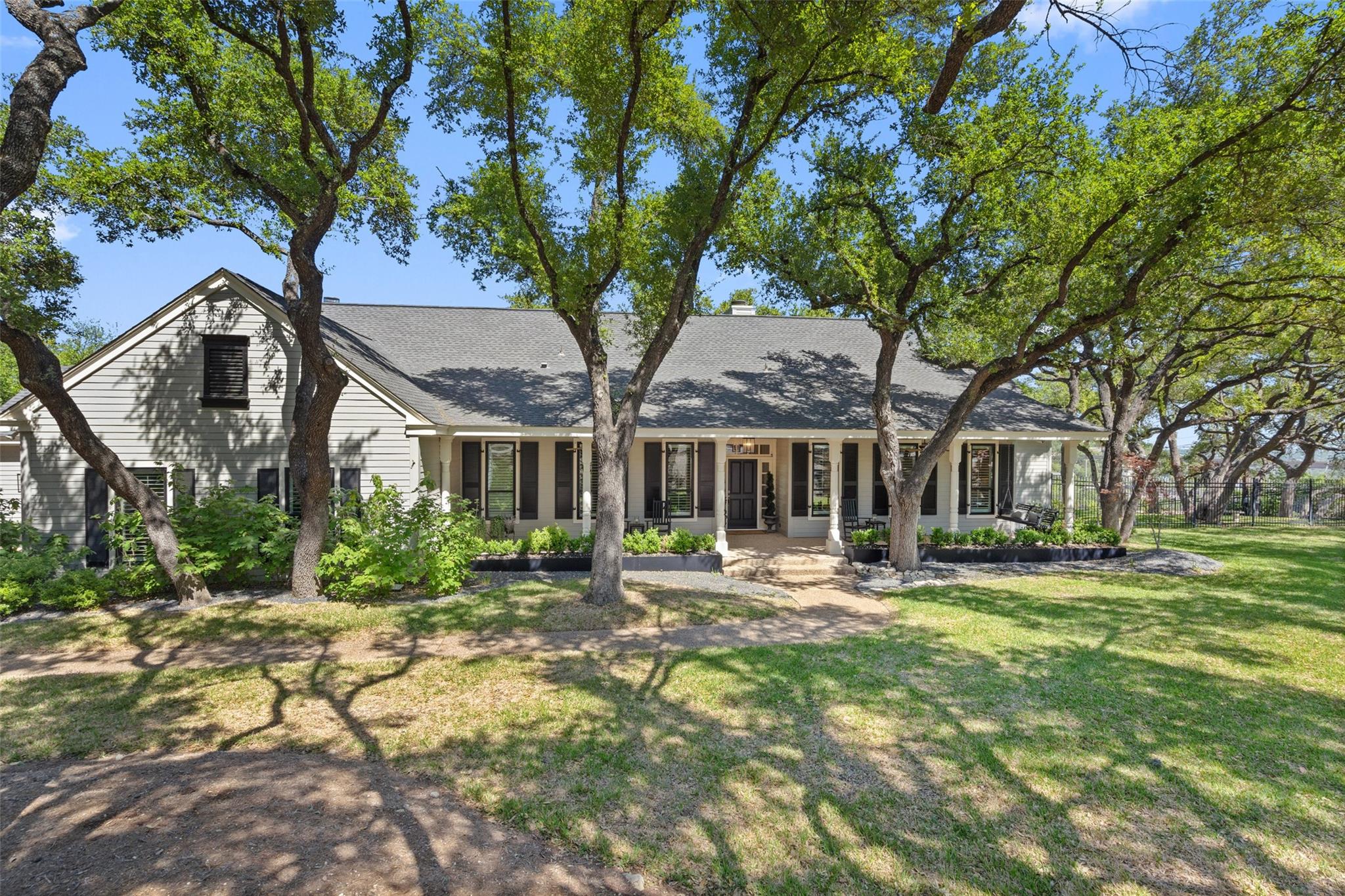 Escape to your own personal retreat, a single-level sanctuary with abundant space and exceptional views. Spanning 3,045 square feet on 1.5 acres, this home offers peace and privacy with panoramic vistas that stretch to the downtown skyline. As you approach the property, the home appears from beneath the shade of well-manicured oak trees among native landscaping. On the front porch, a gently swaying swing beckons and a well-appointed front entry invites you in for rest and relaxation. Inside, the interior is centered on a sizable living room and family room, each with tall windows and inspiring views of the outdoors. Designed for elevated entertaining, the living room includes a built-in bar with floor-to-ceiling cabinets and wine storage. Just beyond, the gourmet kitchen features modern cabinets, designer lighting and luxurious countertops including a large central island. The home also includes a large study for work, reading or quiet contemplation. Each room is immaculately finished and updated for an effortless move-in experience. With three bedrooms on one level, this home is designed to easily accommodate a family or visiting guests. The primary suite is the main attraction, with a dedicated fireplace and seating area, two walk-in closets designed by California Closets and a large primary bathroom clad in Carrara marble. The two additional bedrooms also offer walk-in closets and spectacular views of the grounds or the valley below. On the home’s covered back patio–accessible from the living room, breakfast nook or primary suite–you feel both serenity and a sense of place. Take in far-reaching views of the canyons and hilltops, Westlake and the lights of downtown Austin. Or relax in the pool, recently remodeled and surrounded by tall trees to create total privacy. Featuring refined finishes, luxurious amenities and even its own potable water well and irrigation system, this home is your chance to turn each day into an adventurous, indulgent escape.