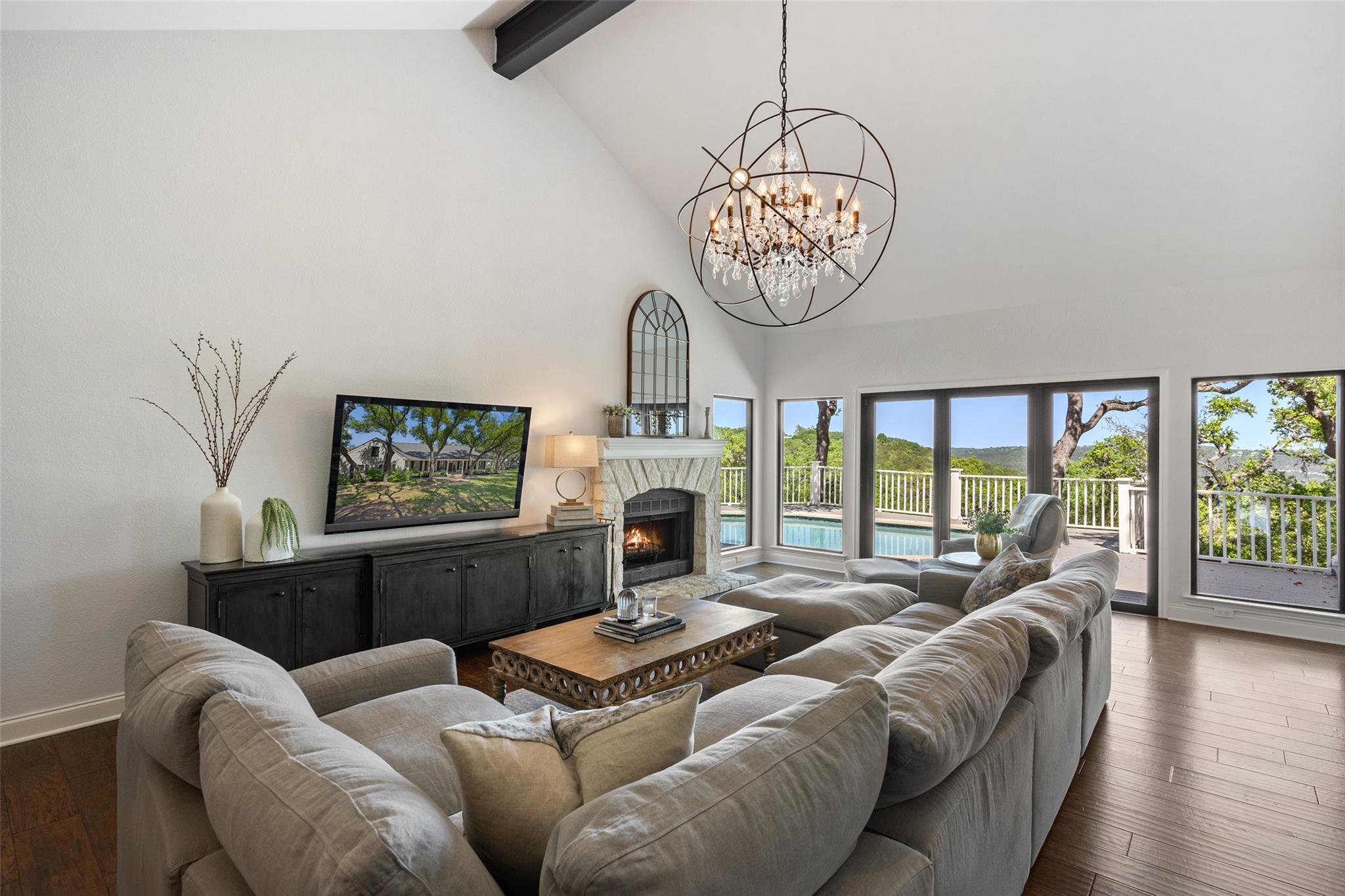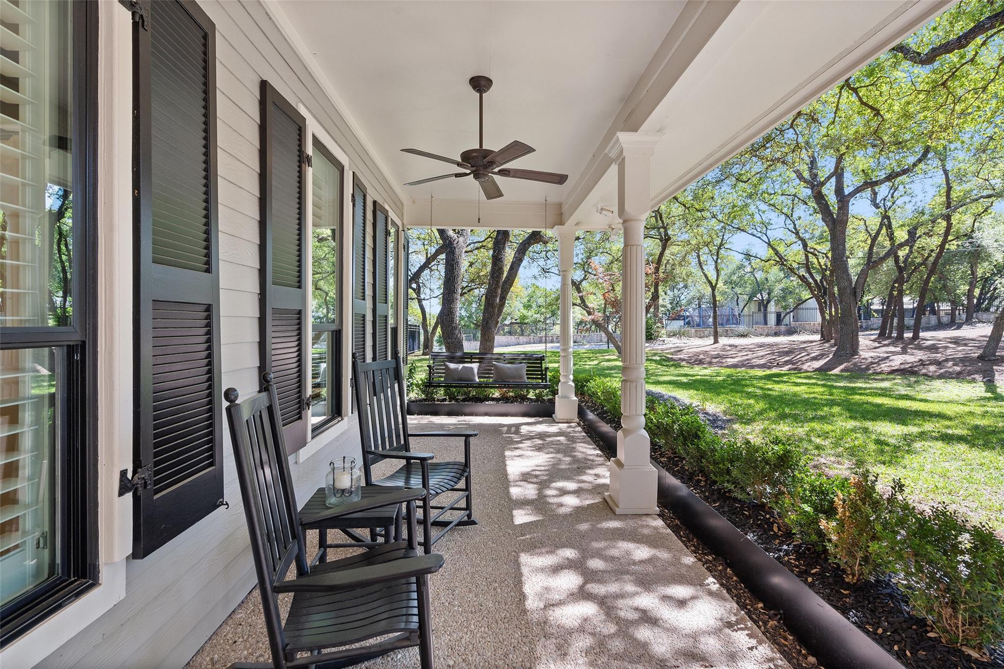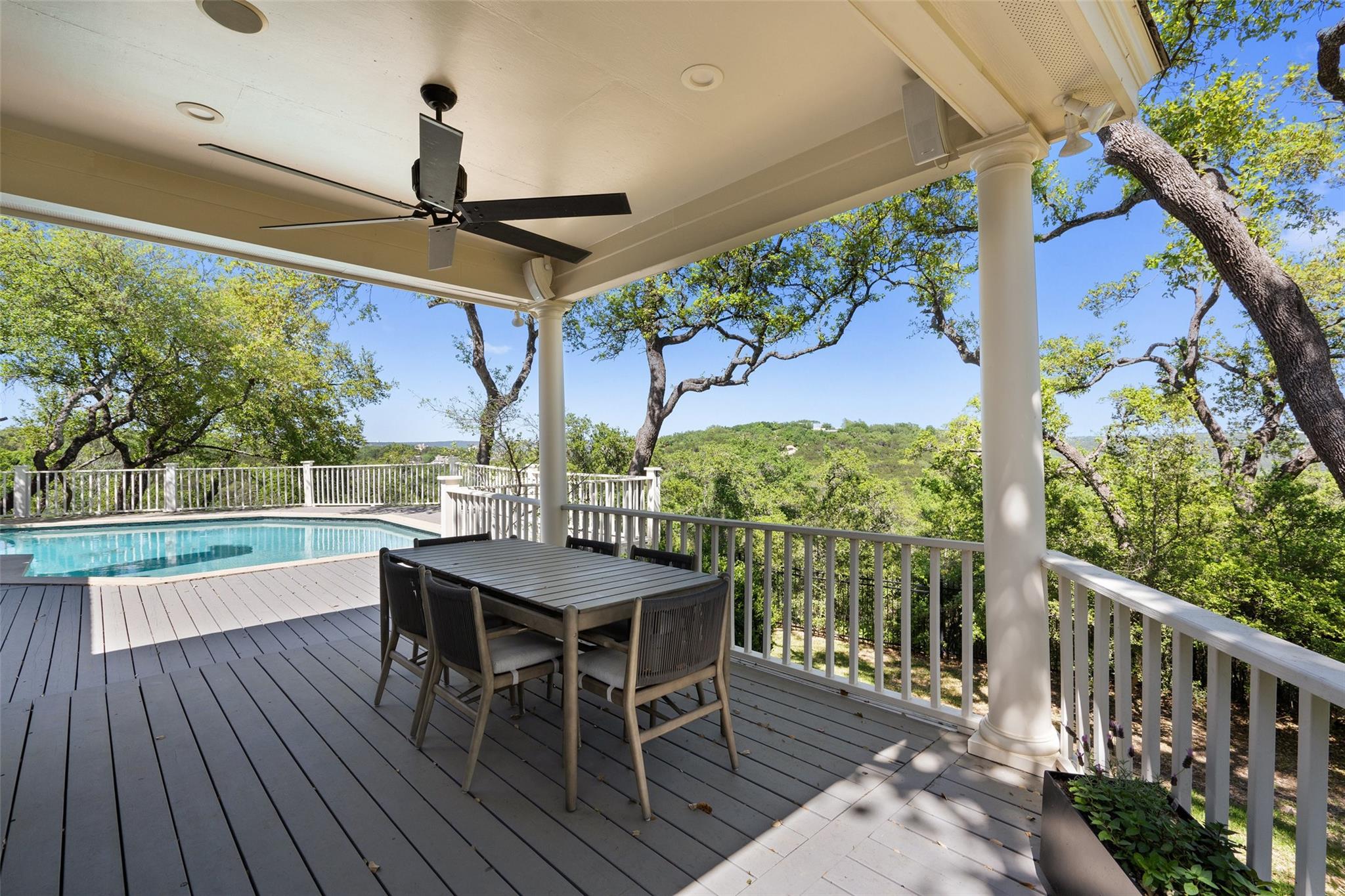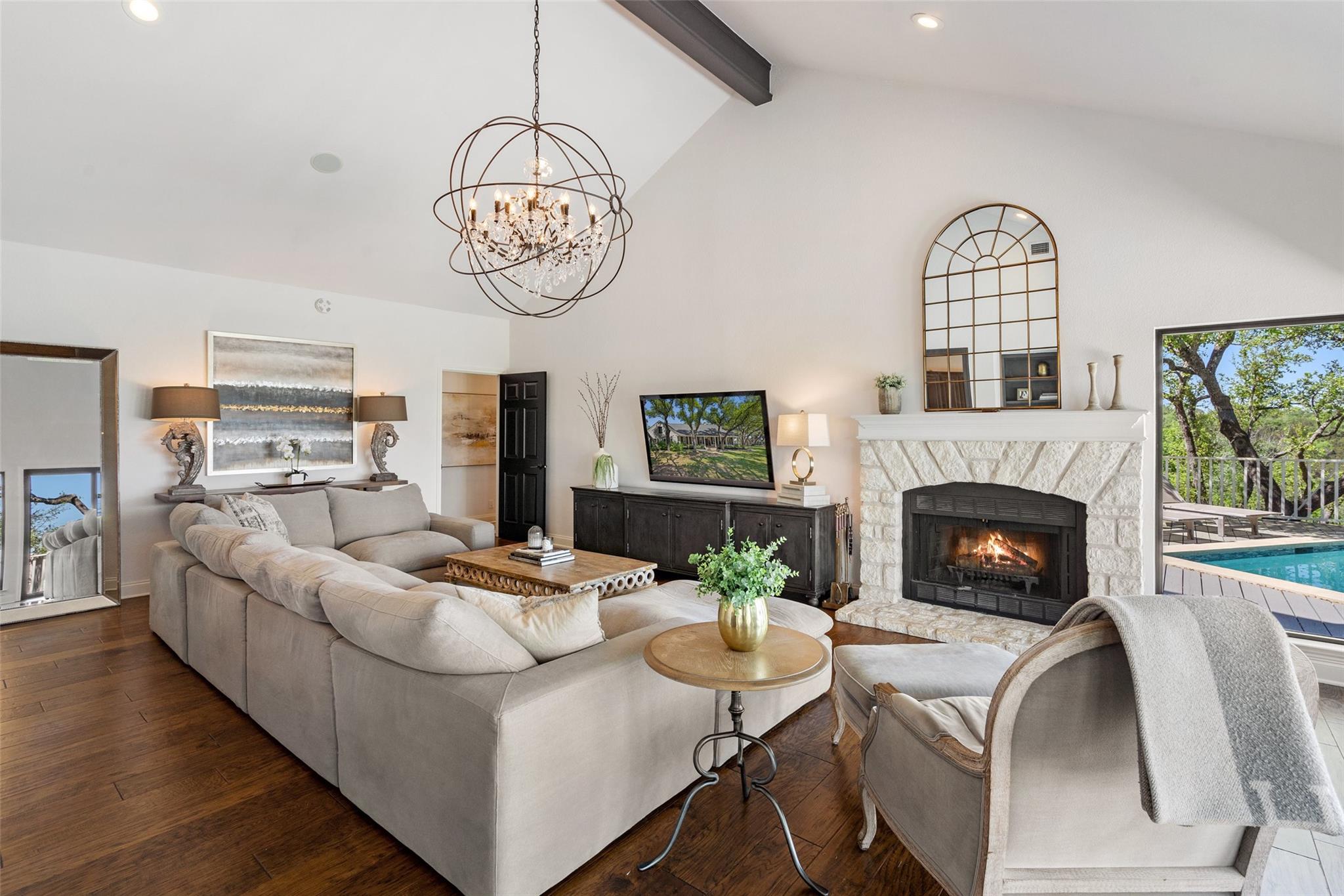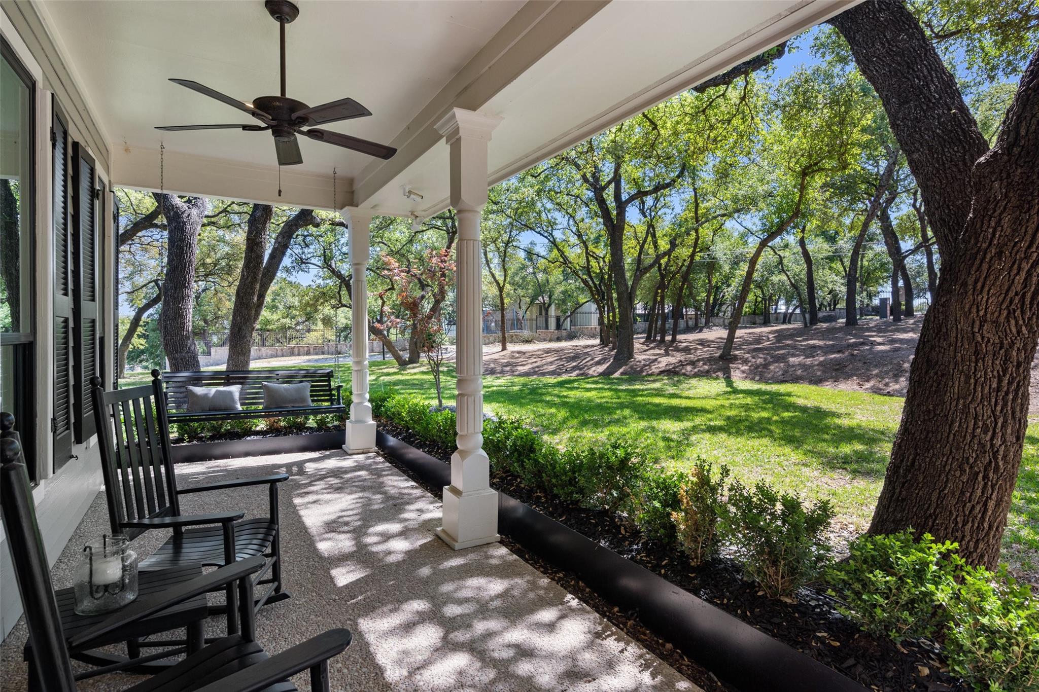Escape to your own personal retreat, a single-level sanctuary with abundant space and exceptional views. Spanning 3,045 square feet on 1.5 acres, this home offers peace and privacy with panoramic vistas that stretch to the downtown skyline. As you approach the property, the home appears from beneath the shade of well-manicured oak trees among native landscaping. On the front porch, a gently swaying swing beckons and a well-appointed front entry invites you in for rest and relaxation. Inside, the interior is centered on a sizable living room and family room, each with tall windows and inspiring views of the outdoors. Designed for elevated entertaining, the living room includes a built-in bar with floor-to-ceiling cabinets and wine storage. Just beyond, the gourmet kitchen features modern cabinets, designer lighting and luxurious countertops including a large central island. The home also includes a large study for work, reading or quiet contemplation. Each room is immaculately finished and updated for an effortless move-in experience. With three bedrooms on one level, this home is designed to easily accommodate a family or visiting guests. The primary suite is the main attraction, with a dedicated fireplace and seating area, two walk-in closets designed by California Closets and a large primary bathroom clad in Carrara marble. The two additional bedrooms also offer walk-in closets and spectacular views of the grounds or the valley below. On the home’s covered back patio–accessible from the living room, breakfast nook or primary suite–you feel both serenity and a sense of place. Take in far-reaching views of the canyons and hilltops, Westlake and the lights of downtown Austin. Or relax in the pool, recently remodeled and surrounded by tall trees to create total privacy. Featuring refined finishes, luxurious amenities and even its own potable water well and irrigation system, this home is your chance to turn each day into an adventurous, indulgent escape.