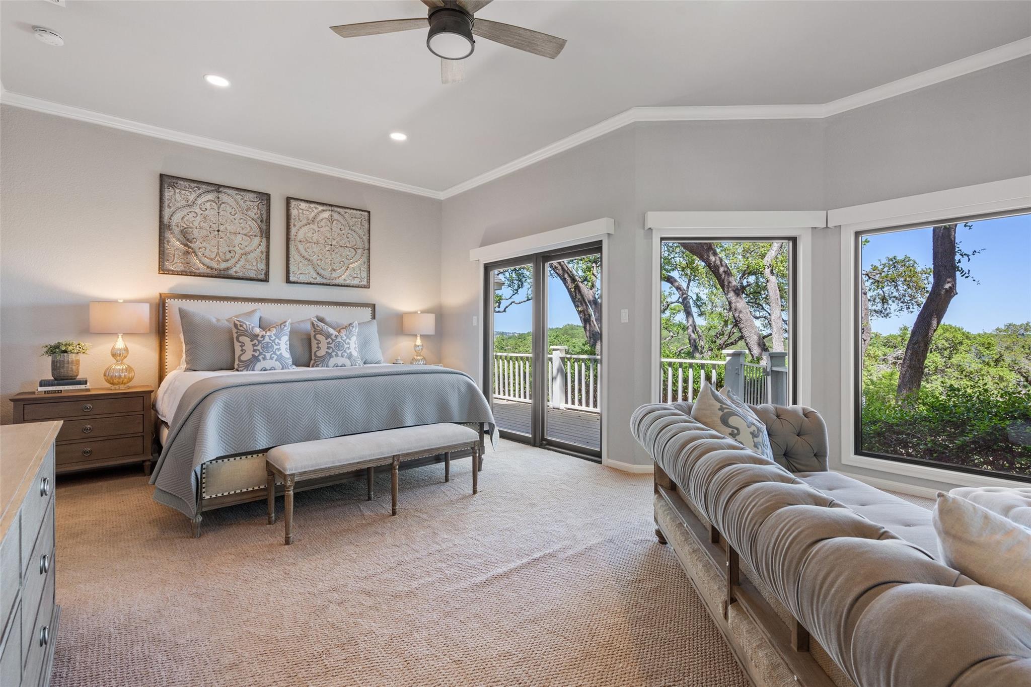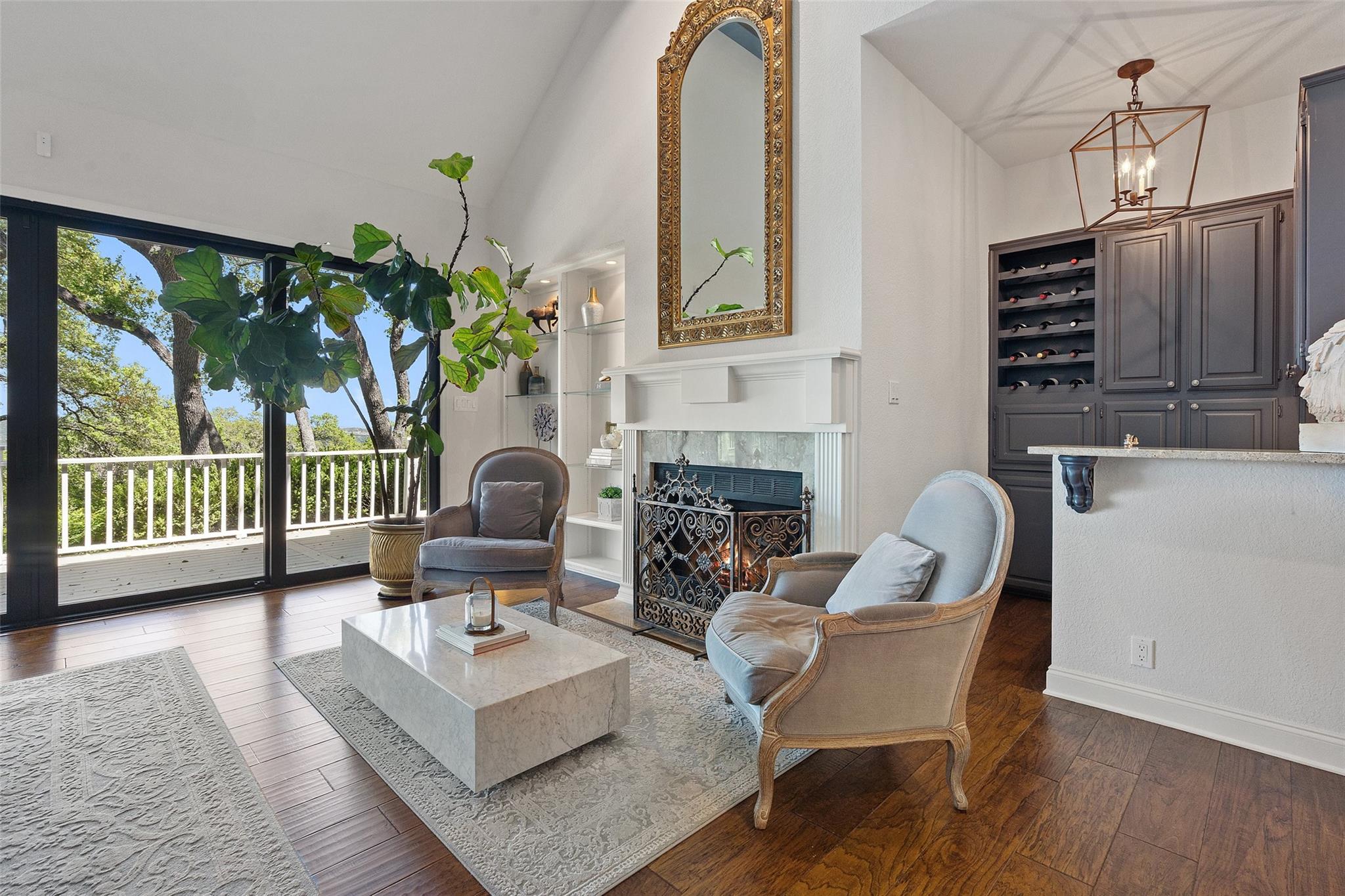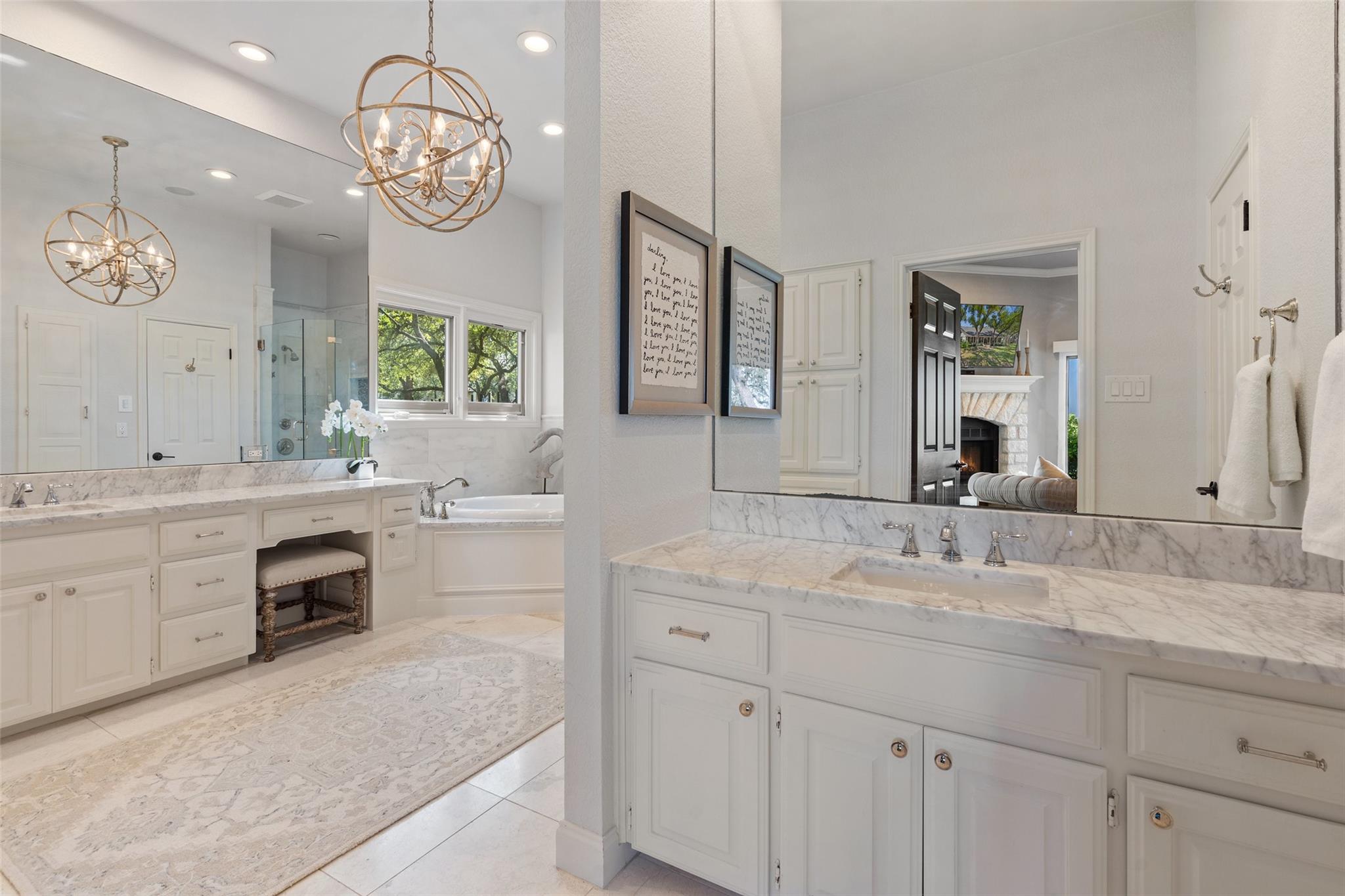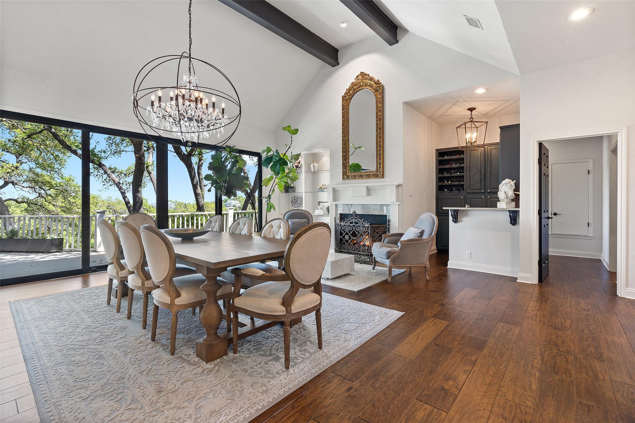 Escape to your own personal retreat, a single-level sanctuary with abundant space and exceptional views. Spanning 3,045 square feet on 1.5 acres, this home offers peace and privacy with panoramic vistas that stretch to the downtown skyline. As you approach the property, the home appears from beneath the shade of well-manicured oak trees among native landscaping. On the front porch, a gently swaying swing beckons and a well-appointed front entry invites you in for rest and relaxation. Inside, the interior is centered on a sizable living room and family room, each with tall windows and inspiring views of the outdoors. Designed for elevated entertaining, the living room includes a built-in bar with floor-to-ceiling cabinets and wine storage. Just beyond, the gourmet kitchen features modern cabinets, designer lighting and luxurious countertops including a large central island. The home also includes a large study for work, reading or quiet contemplation. Each room is immaculately finished and updated for an effortless move-in experience. With three bedrooms on one level, this home is designed to easily accommodate a family or visiting guests. The primary suite is the main attraction, with a dedicated fireplace and seating area, two walk-in closets designed by California Closets and a large primary bathroom clad in Carrara marble. The two additional bedrooms also offer walk-in closets and spectacular views of the grounds or the valley below. On the home’s covered back patio–accessible from the living room, breakfast nook or primary suite–you feel both serenity and a sense of place. Take in far-reaching views of the canyons and hilltops, Westlake and the lights of downtown Austin. Or relax in the pool, recently remodeled and surrounded by tall trees to create total privacy. Featuring refined finishes, luxurious amenities and even its own potable water well and irrigation system, this home is your chance to turn each day into an adventurous, indulgent escape.
