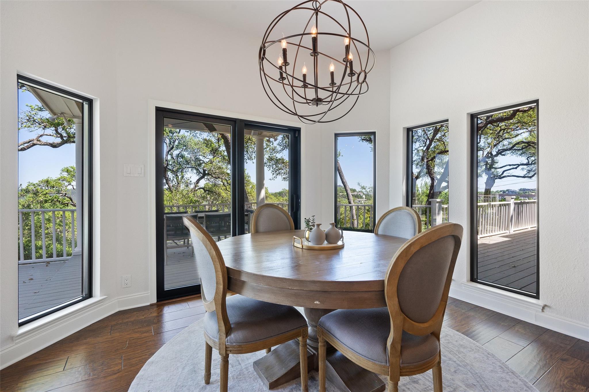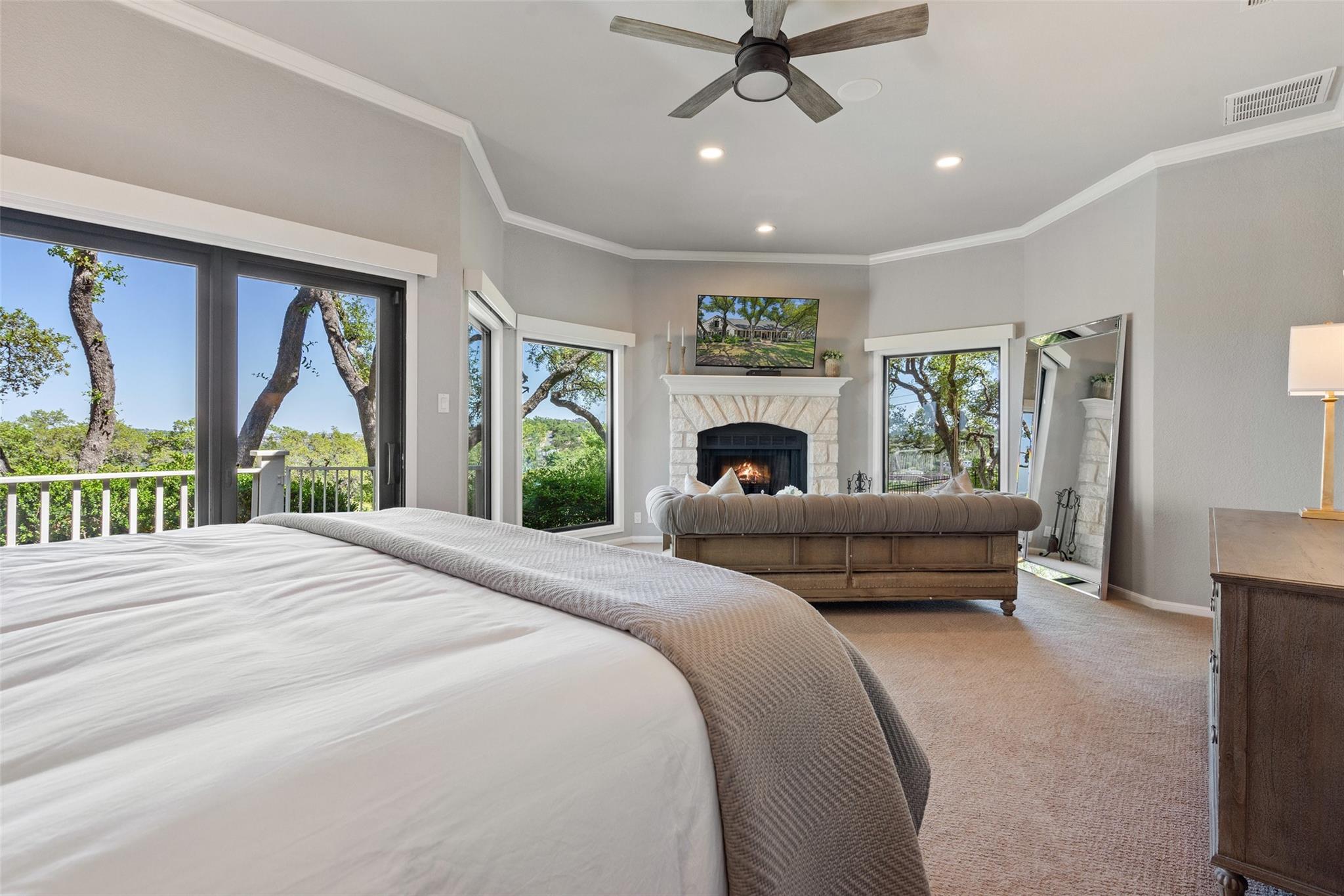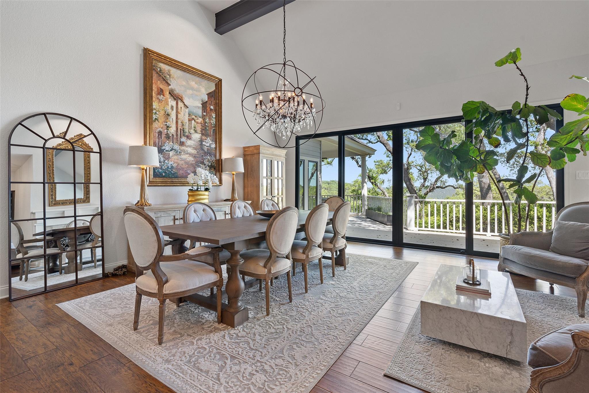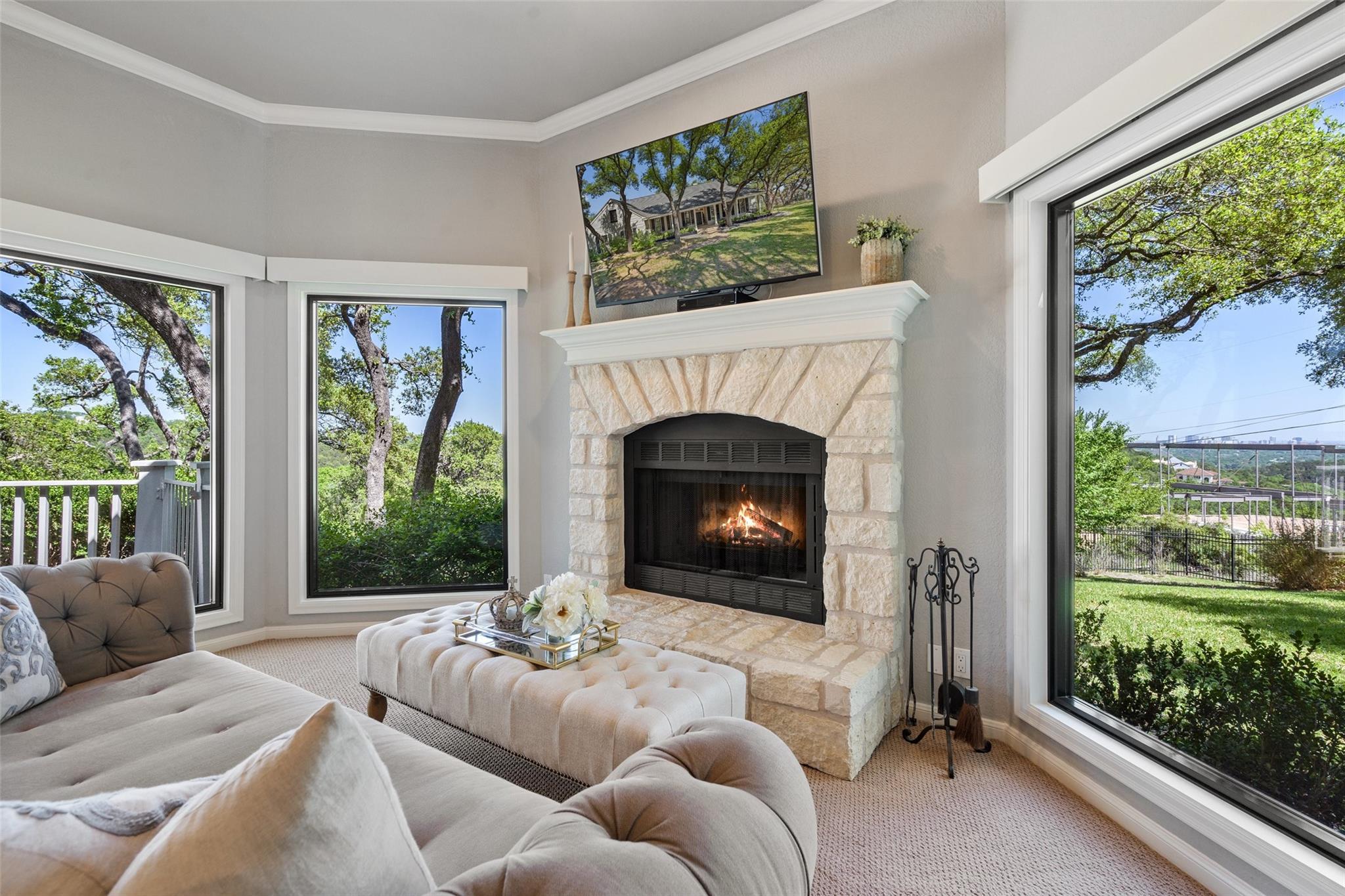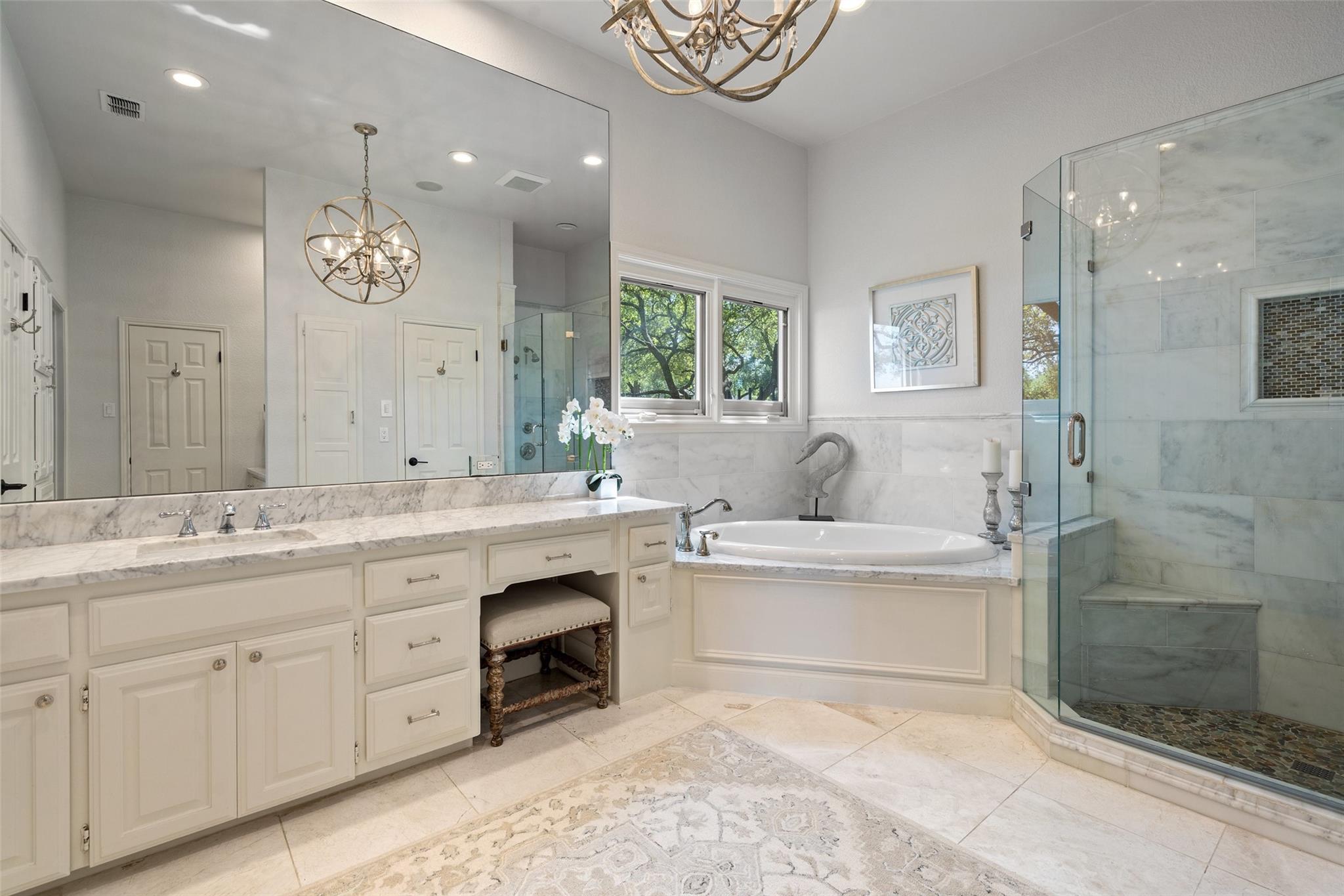 Escape to your own personal retreat, a single-level sanctuary with abundant space and exceptional views. Spanning 3,045 square feet on 1.5 acres, this home offers peace and privacy with panoramic vistas that stretch to the downtown skyline. As you approach the property, the home appears from beneath the shade of well-manicured oak trees among native landscaping. On the front porch, a gently swaying swing beckons and a well-appointed front entry invites you in for rest and relaxation. Inside, the interior is centered on a sizable living room and family room, each with tall windows and inspiring views of the outdoors. Designed for elevated entertaining, the living room includes a built-in bar with floor-to-ceiling cabinets and wine storage. Just beyond, the gourmet kitchen features modern cabinets, designer lighting and luxurious countertops including a large central island. The home also includes a large study for work, reading or quiet contemplation. Each room is immaculately finished and updated for an effortless move-in experience. With three bedrooms on one level, this home is designed to easily accommodate a family or visiting guests. The primary suite is the main attraction, with a dedicated fireplace and seating area, two walk-in closets designed by California Closets and a large primary bathroom clad in Carrara marble. The two additional bedrooms also offer walk-in closets and spectacular views of the grounds or the valley below. On the home’s covered back patio–accessible from the living room, breakfast nook or primary suite–you feel both serenity and a sense of place. Take in far-reaching views of the canyons and hilltops, Westlake and the lights of downtown Austin. Or relax in the pool, recently remodeled and surrounded by tall trees to create total privacy. Featuring refined finishes, luxurious amenities and even its own potable water well and irrigation system, this home is your chance to turn each day into an adventurous, indulgent escape.
