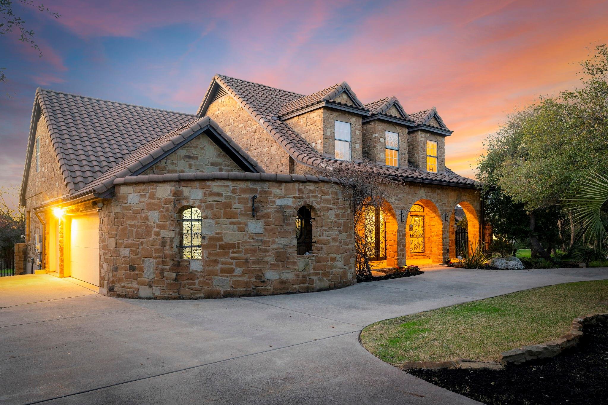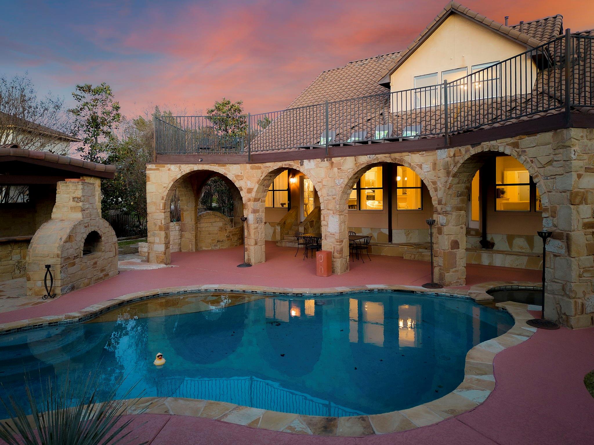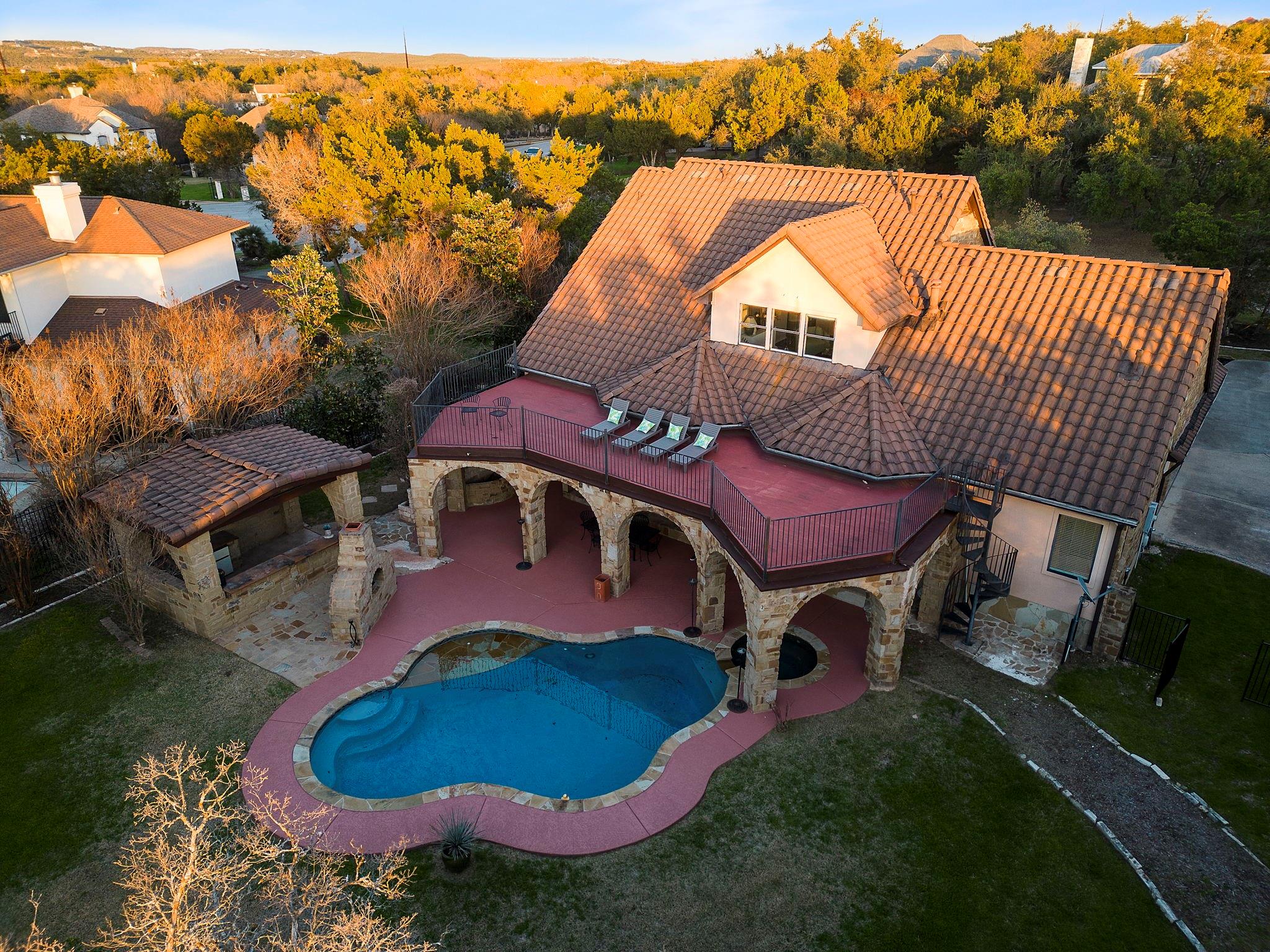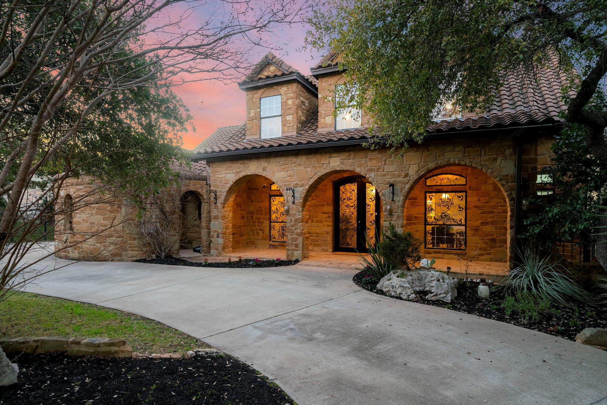 Spectacular luxury estate in West Austin’s prestigious Sterling Acres community. Stunning high-end community with coveted Eanes ISD schools. This breathtaking estate is situated on a sprawling, tree-filled, 1-acre lot and comes complete with an entertainer’s backyard oasis including an in-ground pool & spa, outdoor kitchen pavilion, covered Tuscan porch, terrace with epic sunset views, a custom-built gazebo, and more. Timeless curb appeal with exquisite Tuscan-style architectural design, full stone masonry, a storybook-style tiled roof, circular front drive, arching covered front entry with an enclosed courtyard, and side-facing 3-car garage. Step inside this expansive 3,623 sq ft luxury home to find the perfect marriage of classical elegance and modern design. This home provides 5 bedrooms, 3.5 baths, plus a dedicated home office, formal dining, bonus 2nd floor living area, and a luminous open floor plan for the main living area and gourmet kitchen. Featuring beautifully maintained, wood-look vinyl flooring, elegant crown molding, recessed lighting, a fireplace, sophisticated built-ins, tasteful modern finishes, and intricate ironwork on the doors & railings. Amazing designer kitchen with updated SS appliances including built-in double ovens plus an oversized entertainer’s island. Enjoy a secluded main floor owner’s suite with a spa-like ensuite bath boasting handmade tile floors. The star of the show is the spectacular backyard oasis with a majestic in-ground pool & spa and panoramic, tree-filled hill country sunset views. A sprawling grassy yard area stretches beyond the pool area, surrounded by soaring shade trees. There is also a secluded, custom-built gazebo at the back of the property where you can enjoy breathtaking vistas. Superb EANES ISD schools include Valley View Elem, West Ridge MLS, and Westlake HS. Low tax rate (1.45 for 2023). Easy 12-mile commute to Downtown Austin. Schedule a showing today and make this one-of-a-kind Tuscan-style estate your own!