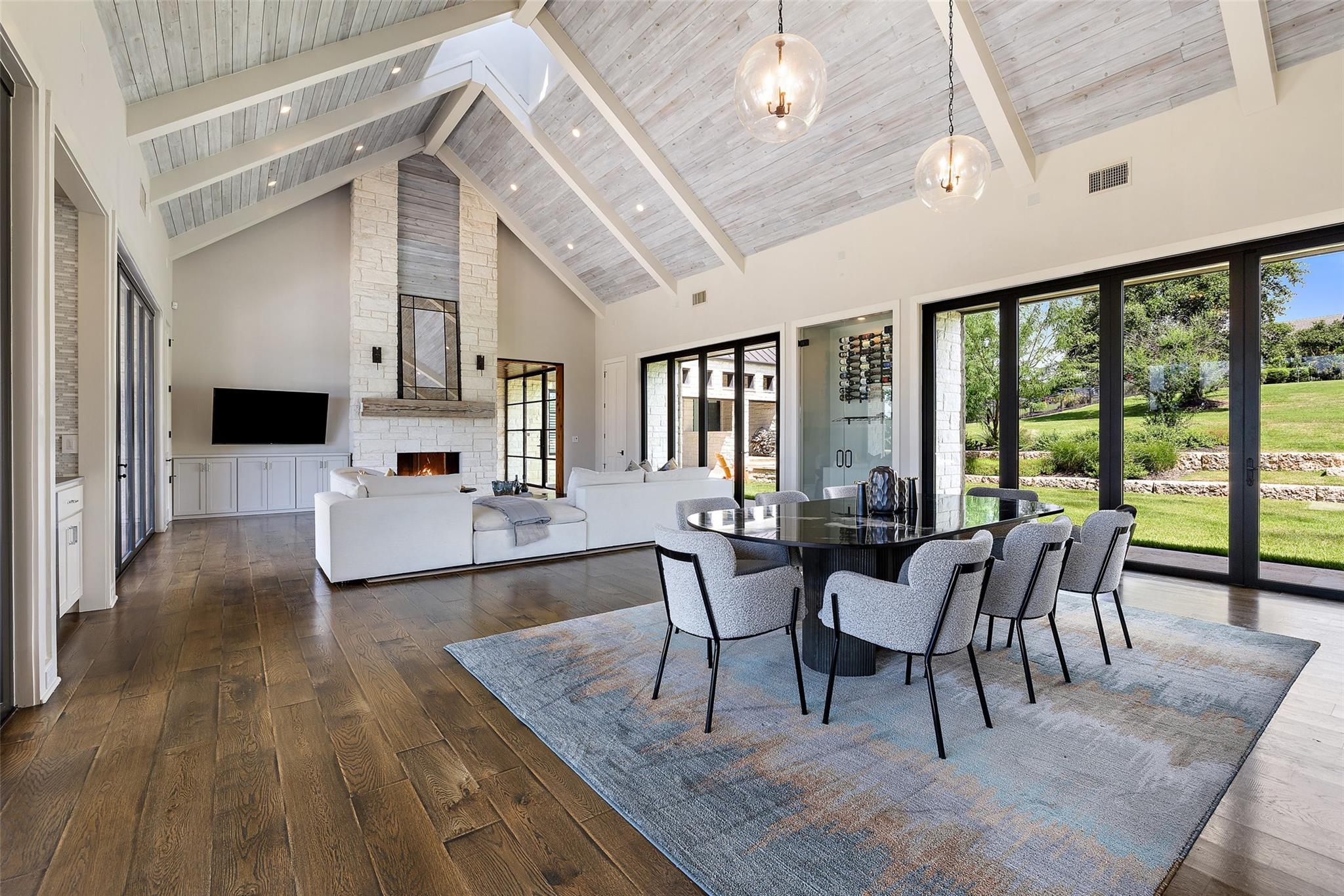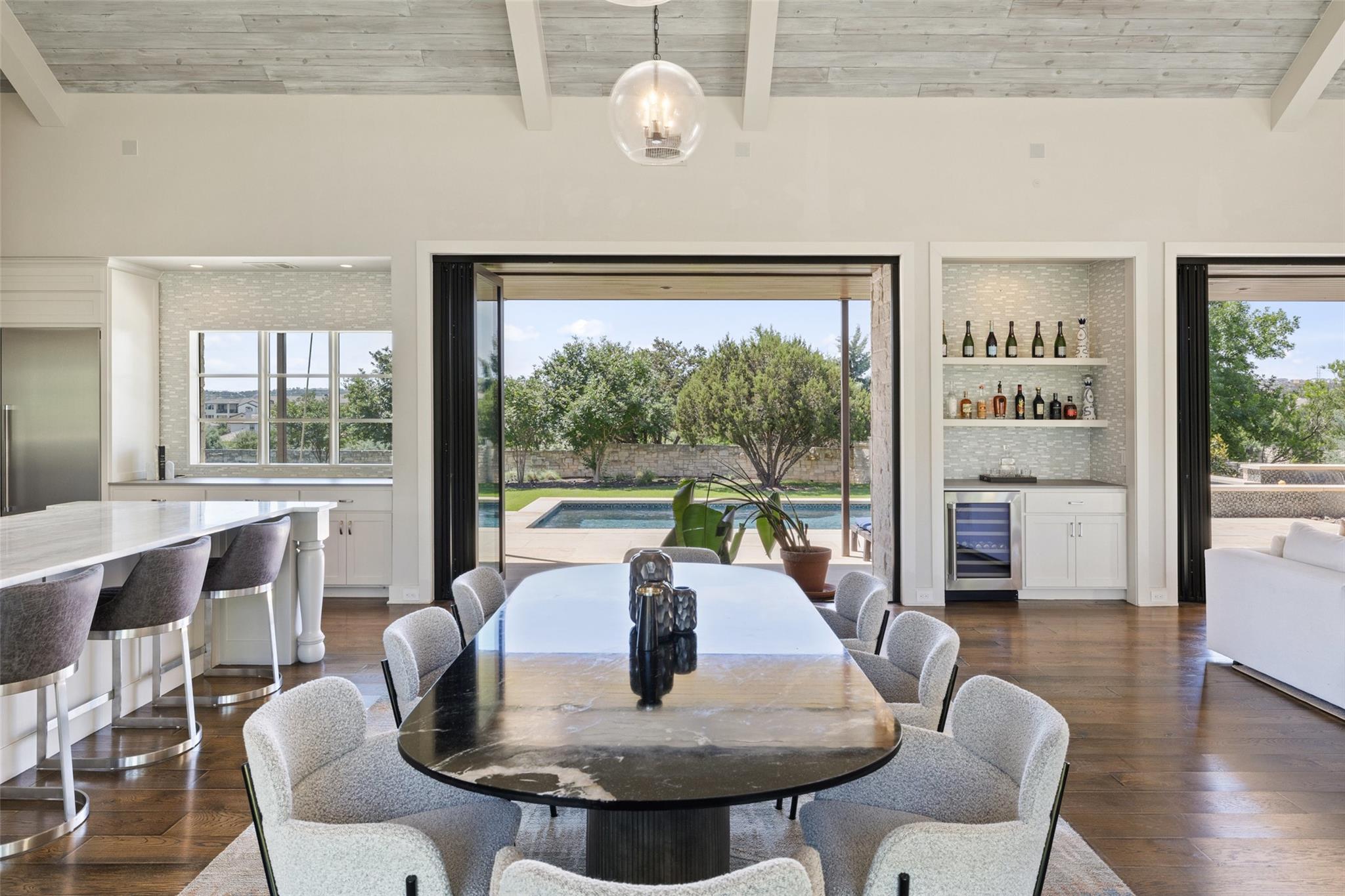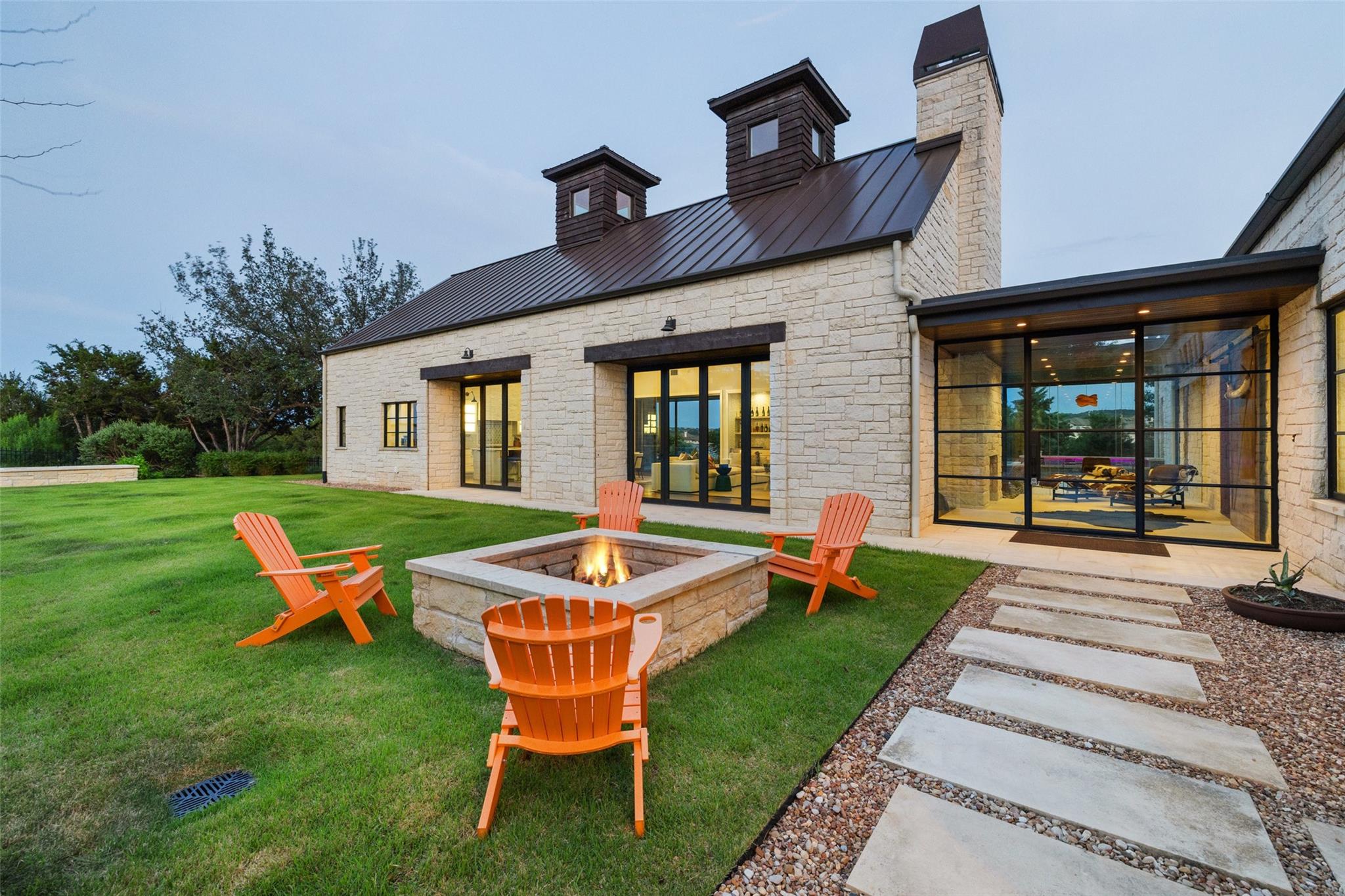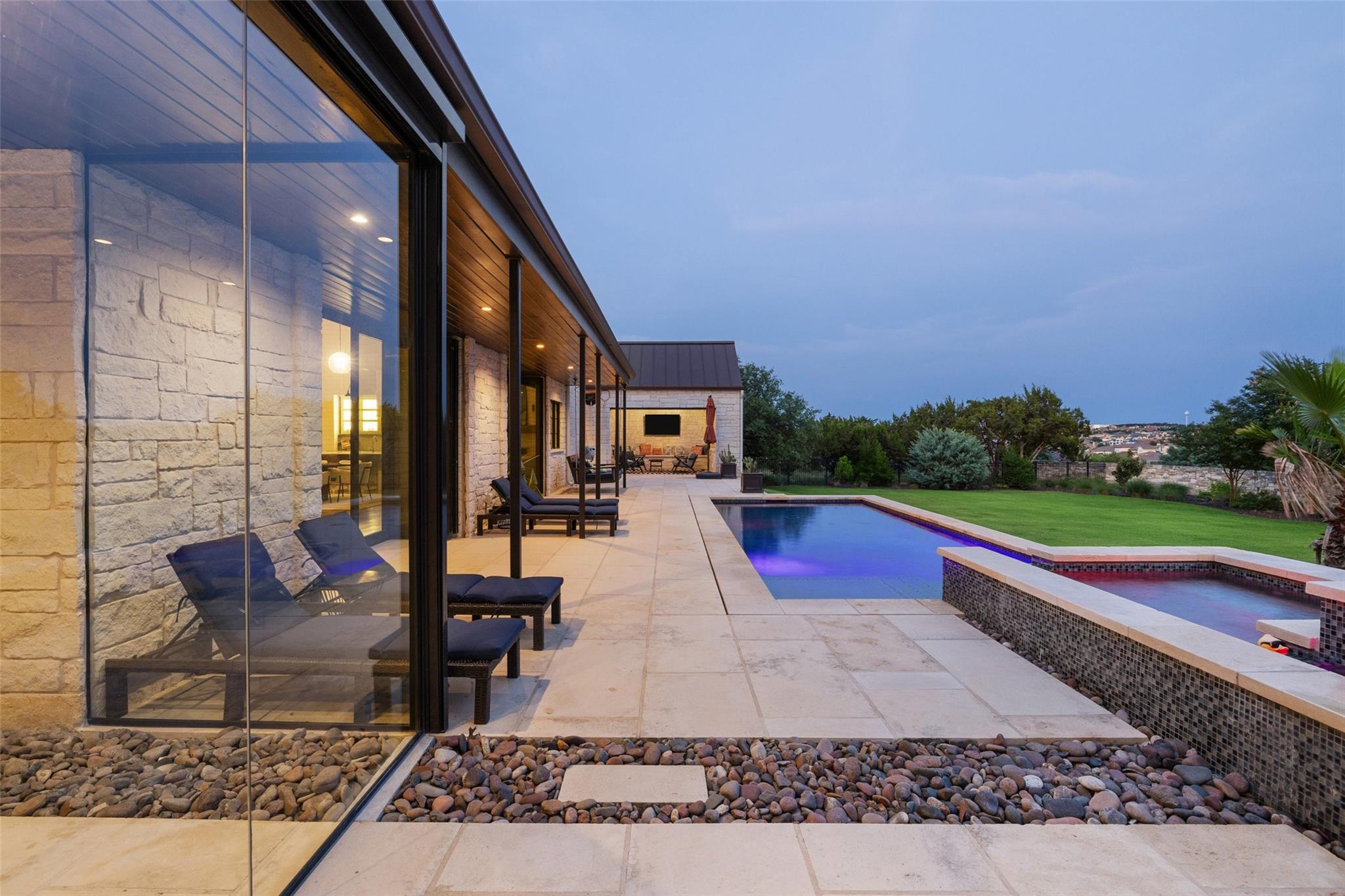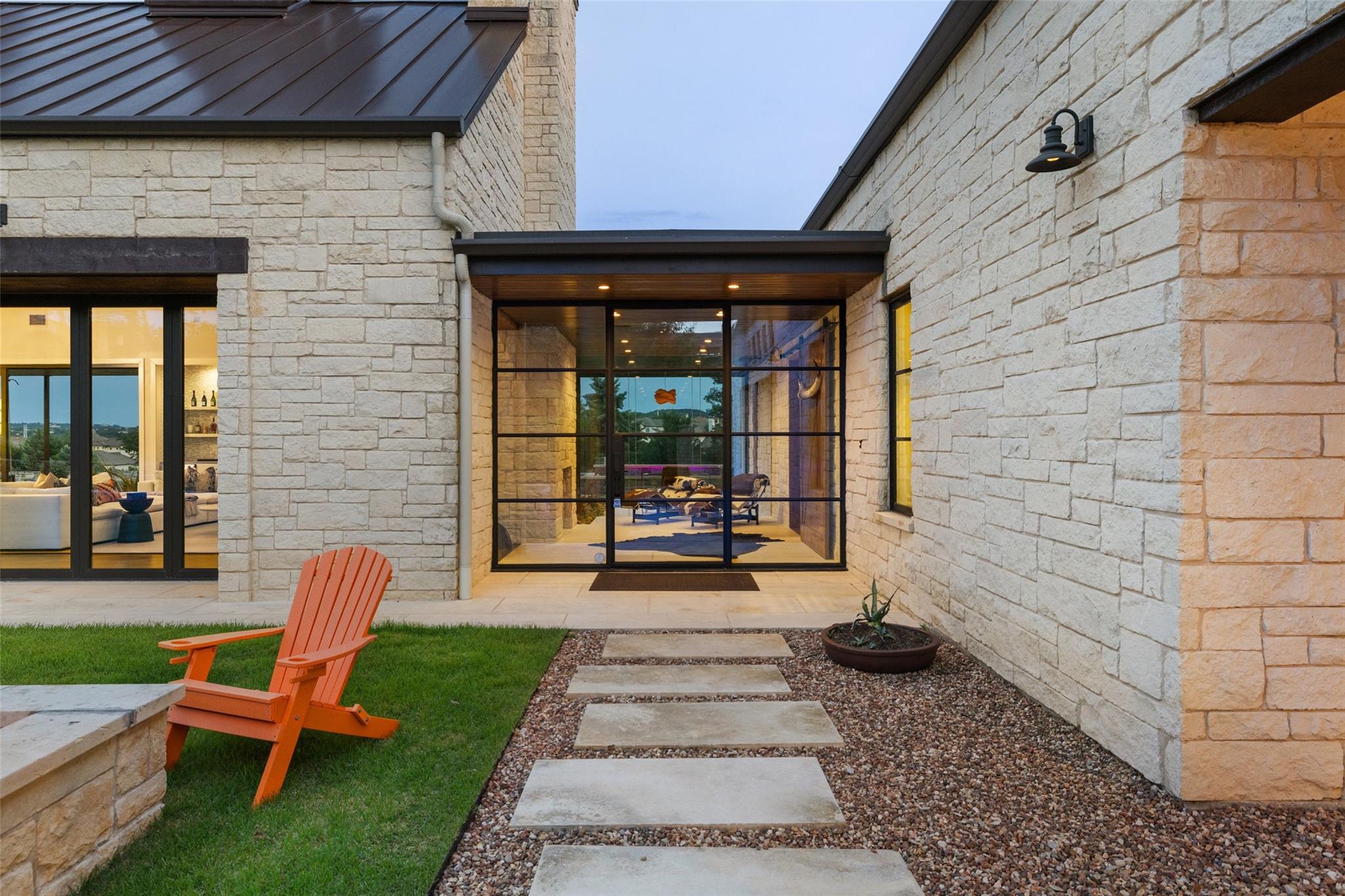Located in the prestigious Peninsula at Rough Hollow, this modern farmhouse is located on a lush 1.176 acre lot. This one story home is the epitome of indoor/outdoor living at its finest. Upon entering the private courtyard through oversized barn doors, you have the main house on the right and guest house on the left. The show stopping entrance to the main house captivates you with floor to ceiling windows and inviting fireplace. Your spacious great room, dining room and kitchen area feature soaring vaulted ceilings, multiple built in wet bar areas, wine room & more. The chef's kitchen features an oversized center island, state of the art appliances and walk in pantry. Open the accordion glass doors to enjoy a back yard oasis featuring multiple lounge areas, negative edge pool & spa, covered outdoor kitchen with fireplace and oversized yard that can easily fit a pickle ball court, putting green or basketball court - truly an entertainers dream. Overlooking the beautiful back yard is a glass office with floor to ceiling glass and hill country views. The spacious primary suite features a unique day bed and storage spanning the back wall. Natural light fills the primary ensuite with his & her sinks, claw foot tub and large seamless glass shower with outdoor access. Through the ensuite you will find a large custom closet and laundry room. The detached casita features a full bathroom, perfect for a mother-in-law suite, au pair, home office or gym. The modern floor to ceiling windows combined with the natural Texas stone create this beautiful private retreat in the Hill Country and is just 45 minutes to Downtown Austin & ABIA. Spanning 3 miles of Lake Travis shoreline you can enjoy all of the Rough Hollow amenities including 22 miles of hiking/biking trails, access to the Yacht Club & Marina, state of the art fitness & community center. To read more about Rough Hollow amenities visit: https://roughhollowlakeway.com/amenities/.
