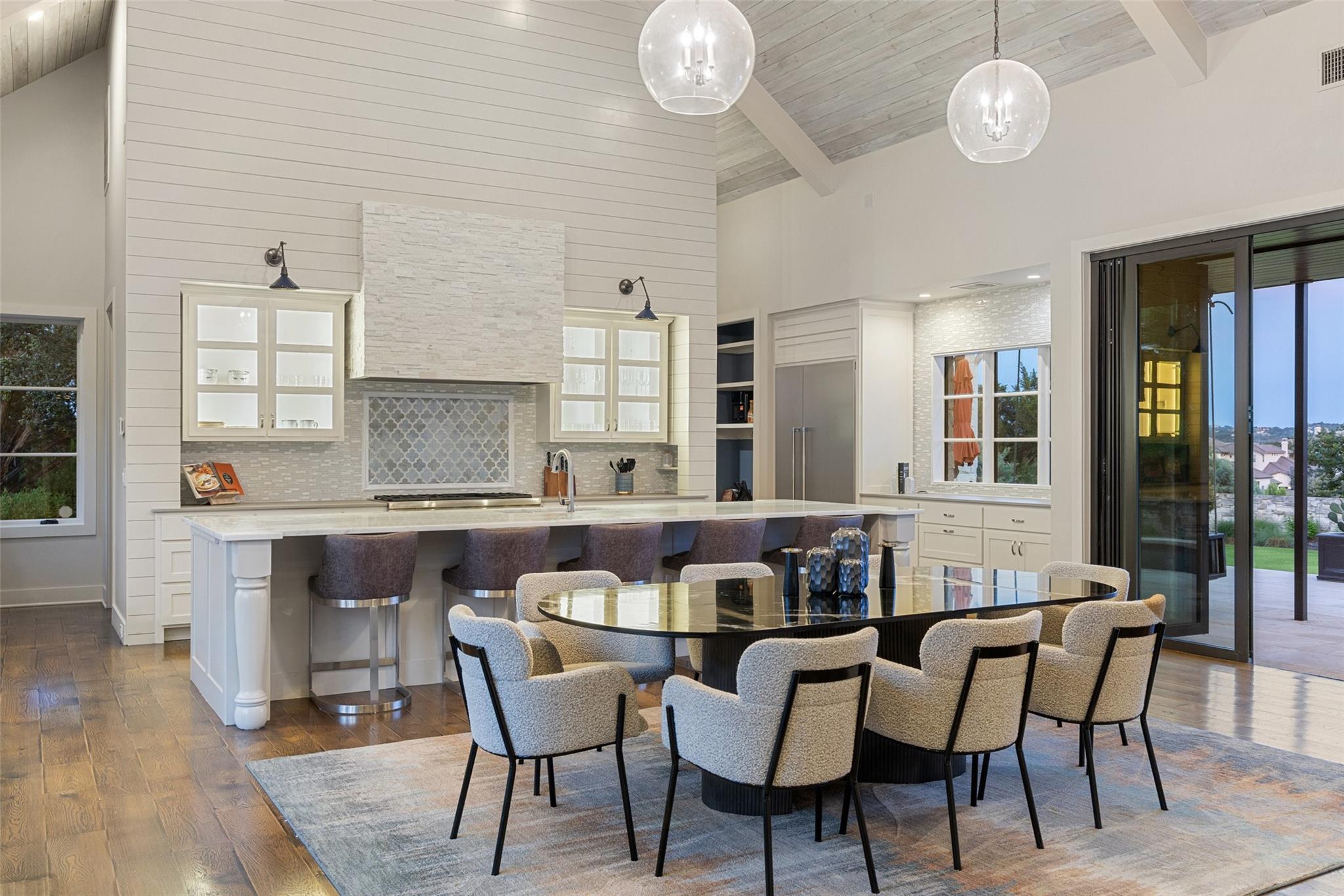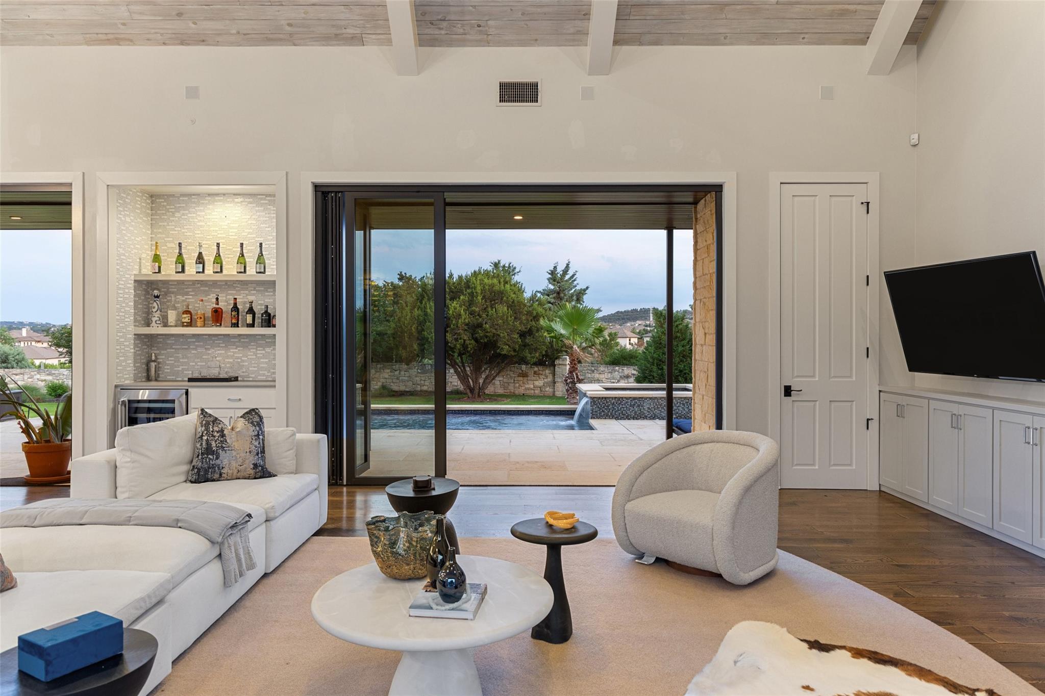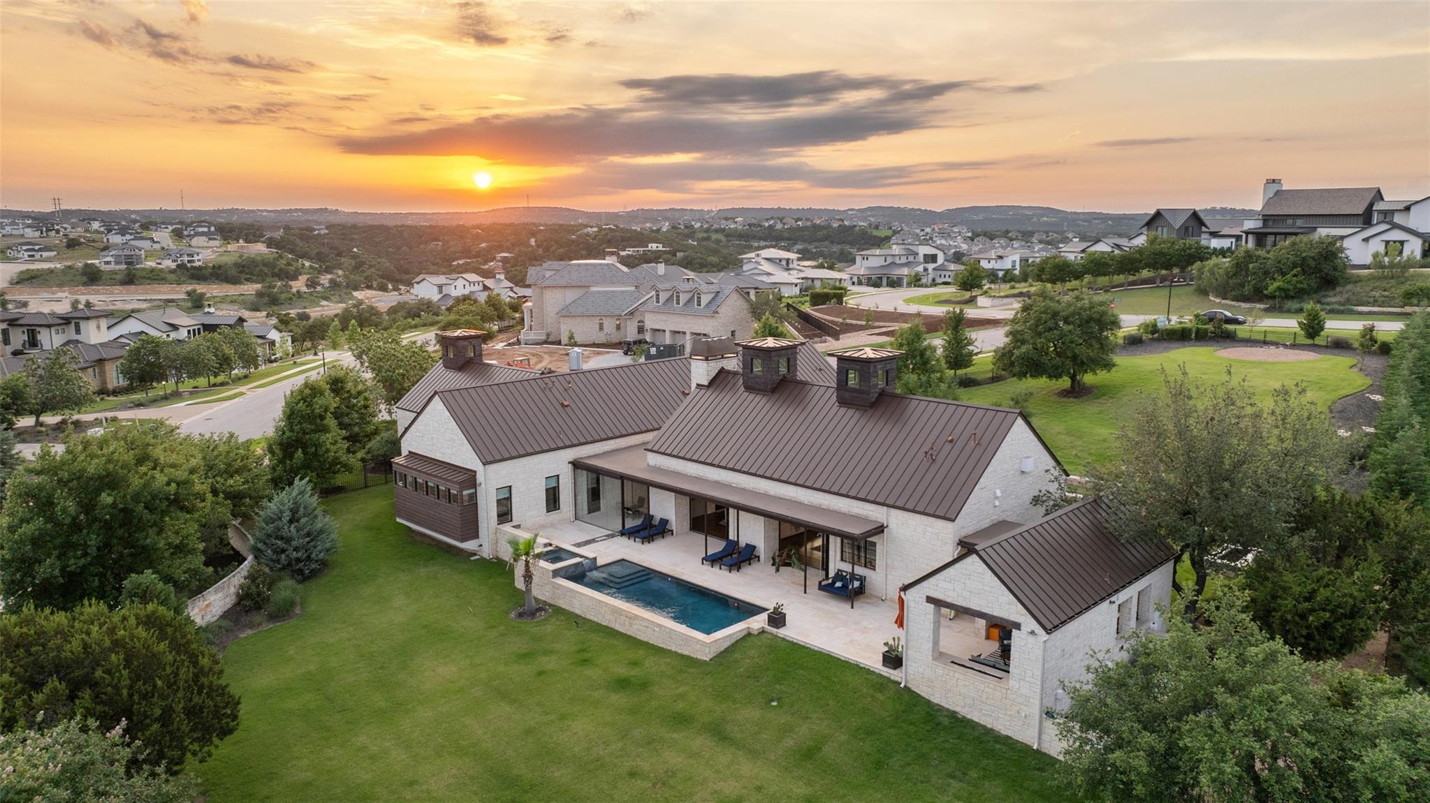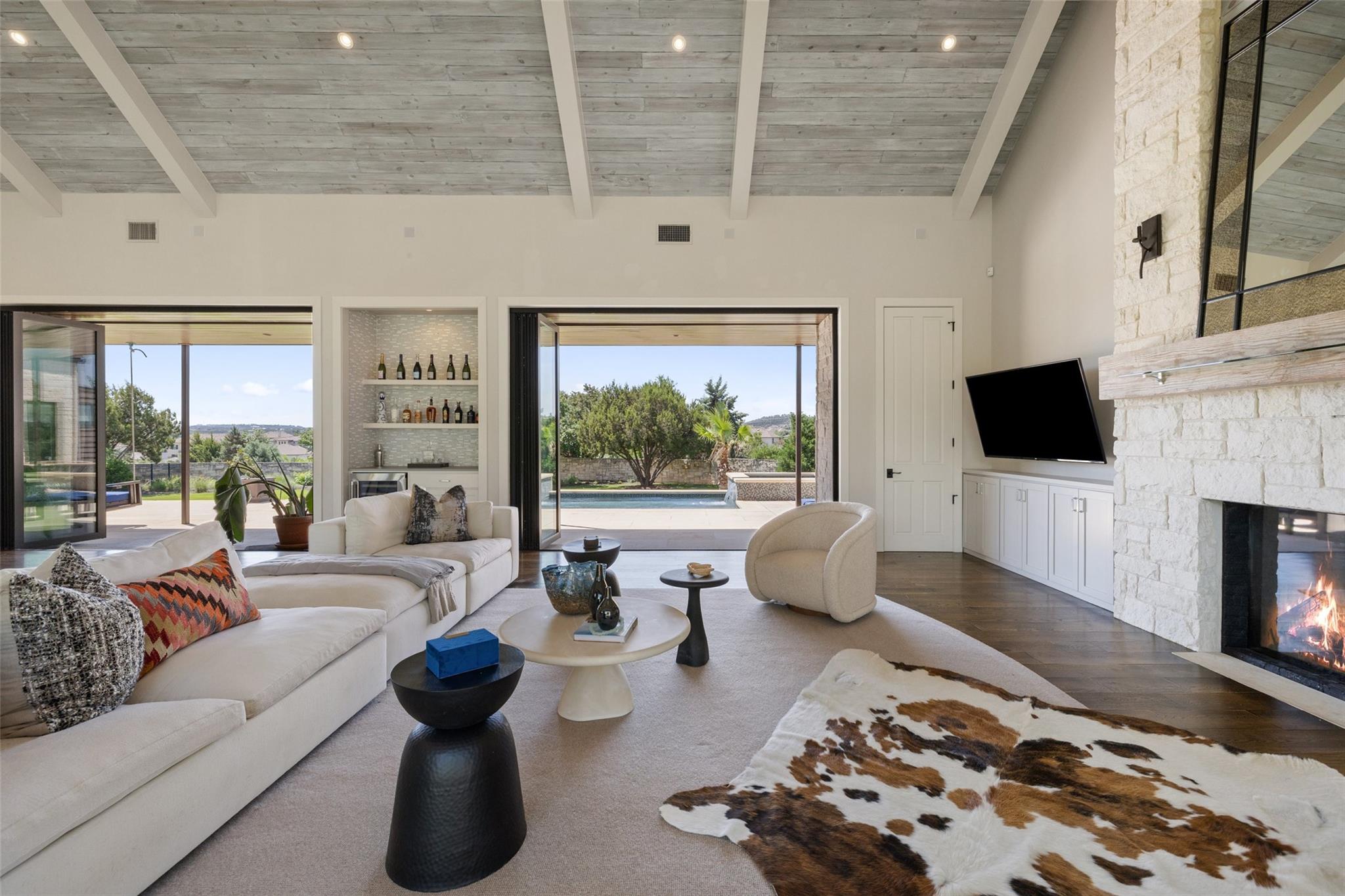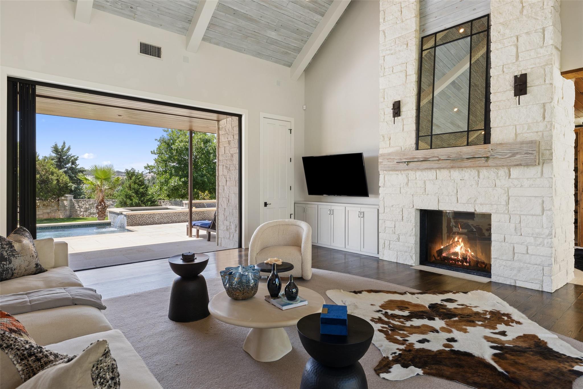 Located in the prestigious Peninsula at Rough Hollow, this modern farmhouse is located on a lush 1.176 acre lot. This one story home is the epitome of indoor/outdoor living at its finest. Upon entering the private courtyard through oversized barn doors, you have the main house on the right and guest house on the left. The show stopping entrance to the main house captivates you with floor to ceiling windows and inviting fireplace. Your spacious great room, dining room and kitchen area feature soaring vaulted ceilings, multiple built in wet bar areas, wine room & more. The chef's kitchen features an oversized center island, state of the art appliances and walk in pantry. Open the accordion glass doors to enjoy a back yard oasis featuring multiple lounge areas, negative edge pool & spa, covered outdoor kitchen with fireplace and oversized yard that can easily fit a pickle ball court, putting green or basketball court - truly an entertainers dream. Overlooking the beautiful back yard is a glass office with floor to ceiling glass and hill country views. The spacious primary suite features a unique day bed and storage spanning the back wall. Natural light fills the primary ensuite with his & her sinks, claw foot tub and large seamless glass shower with outdoor access. Through the ensuite you will find a large custom closet and laundry room. The detached casita features a full bathroom, perfect for a mother-in-law suite, au pair, home office or gym. The modern floor to ceiling windows combined with the natural Texas stone create this beautiful private retreat in the Hill Country and is just 45 minutes to Downtown Austin & ABIA. Spanning 3 miles of Lake Travis shoreline you can enjoy all of the Rough Hollow amenities including 22 miles of hiking/biking trails, access to the Yacht Club & Marina, state of the art fitness & community center. To read more about Rough Hollow amenities visit: https://roughhollowlakeway.com/amenities/.