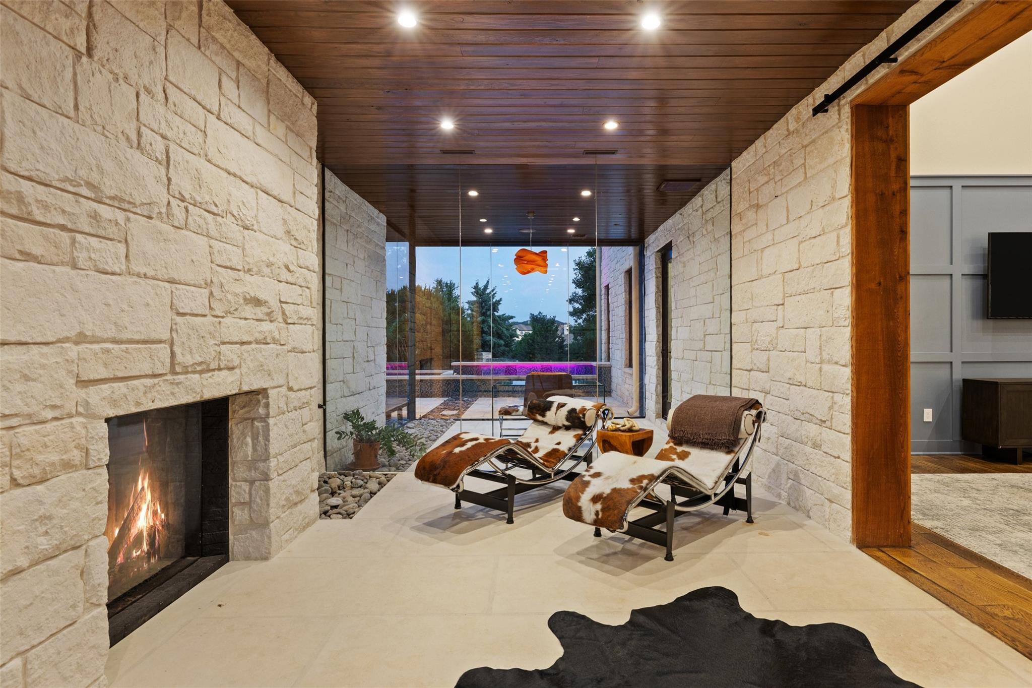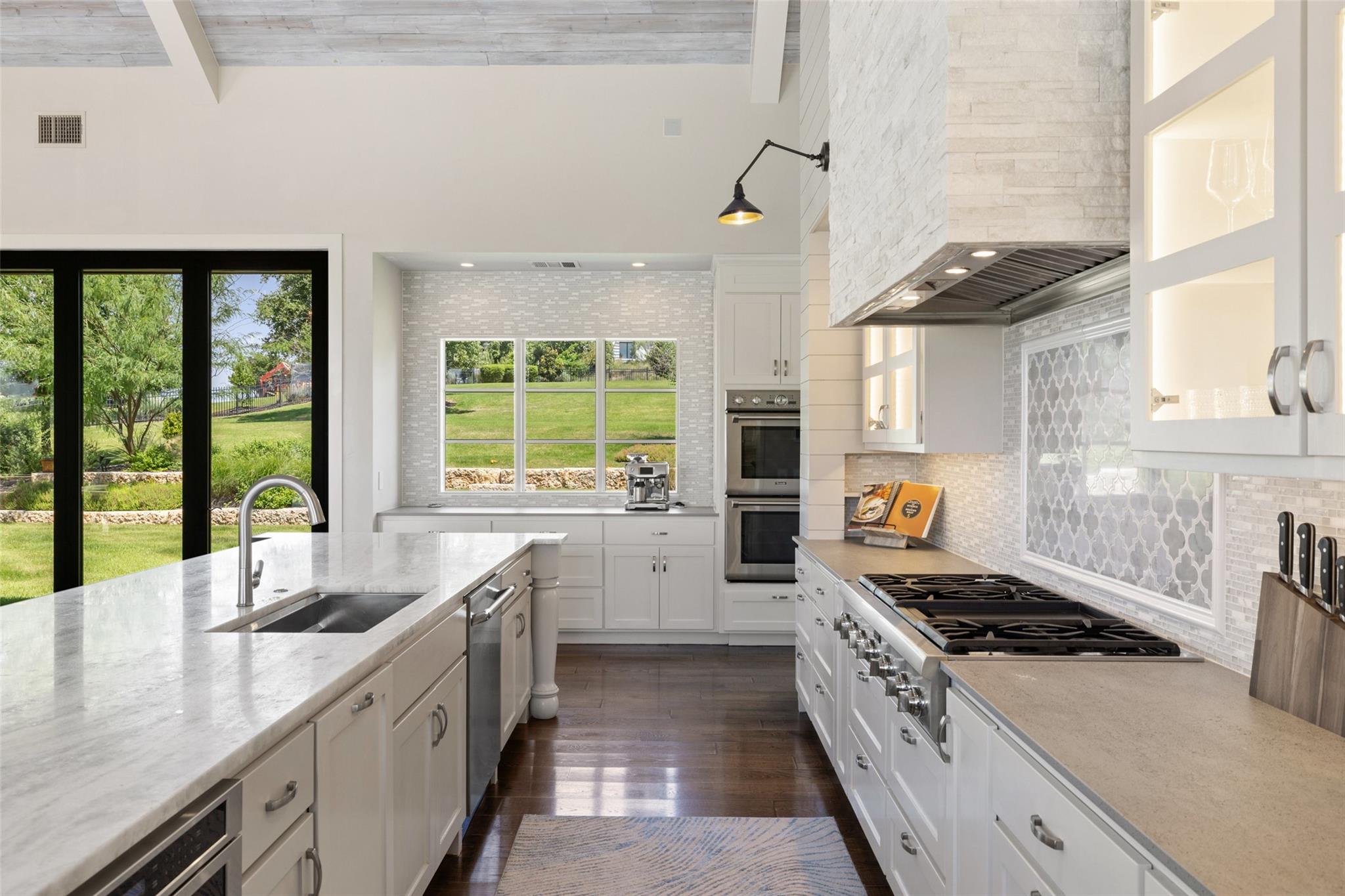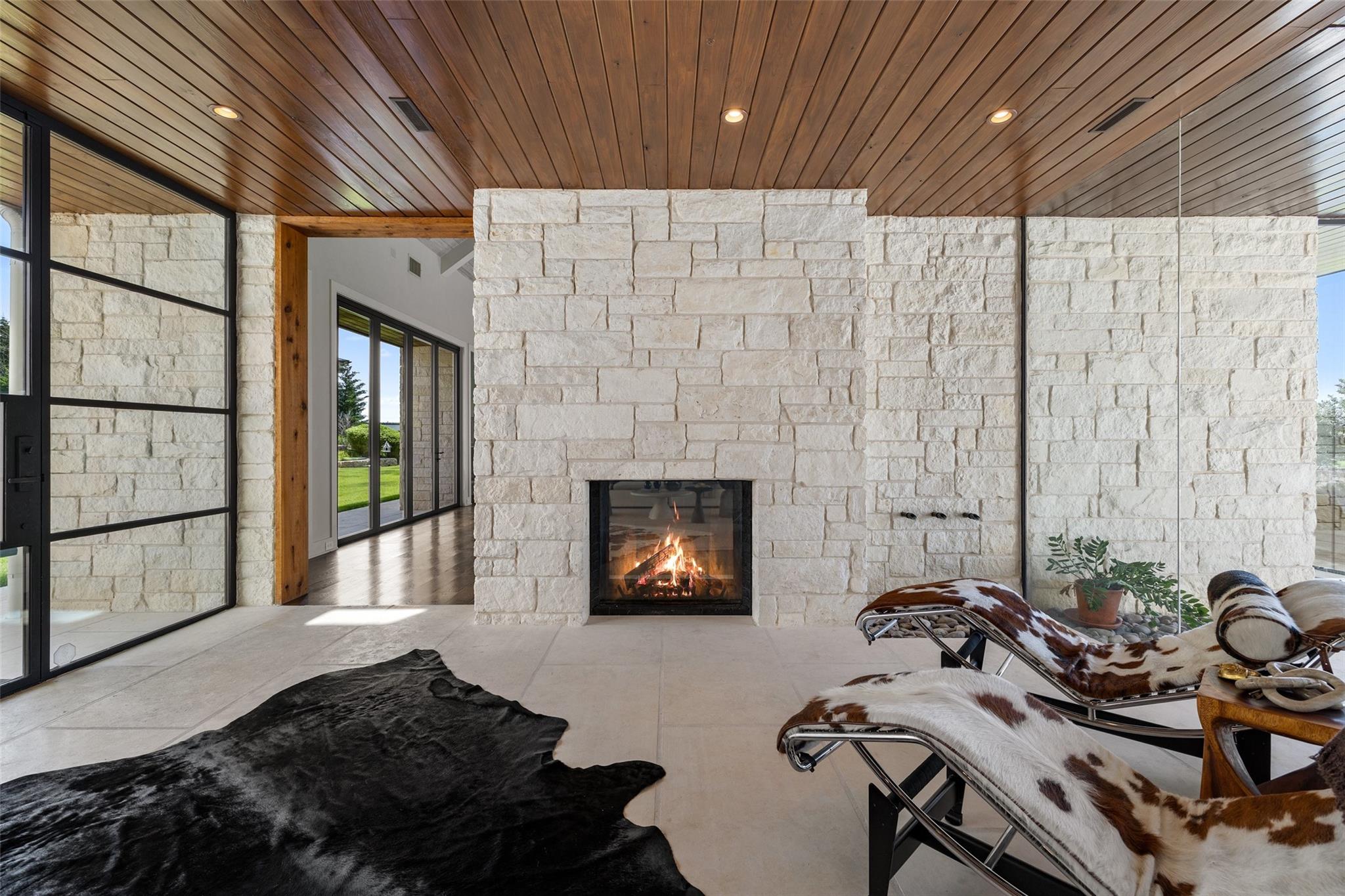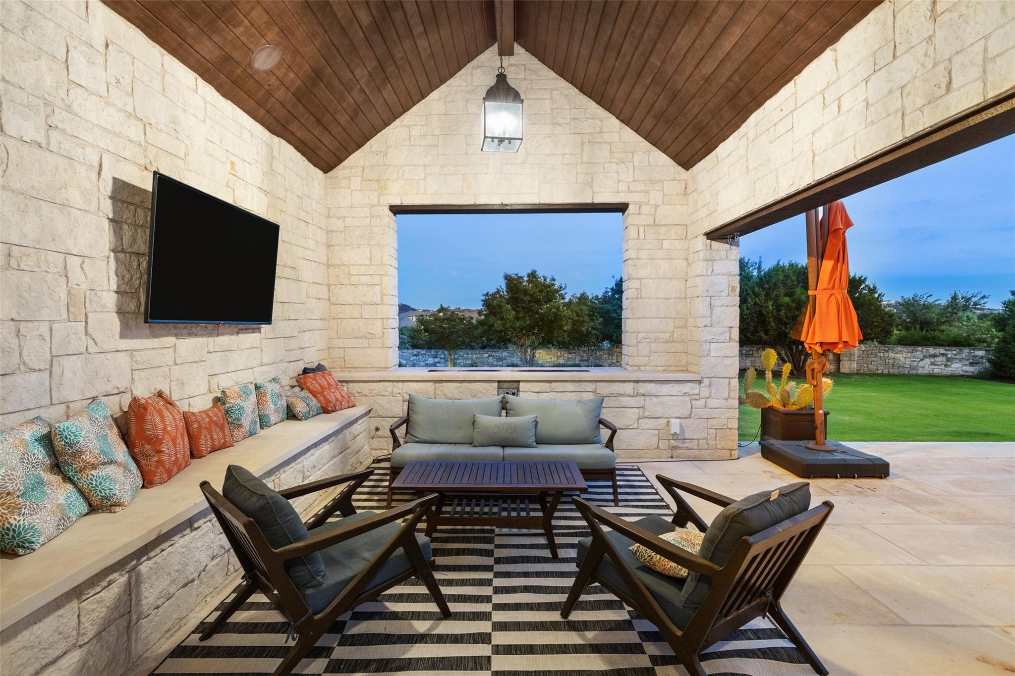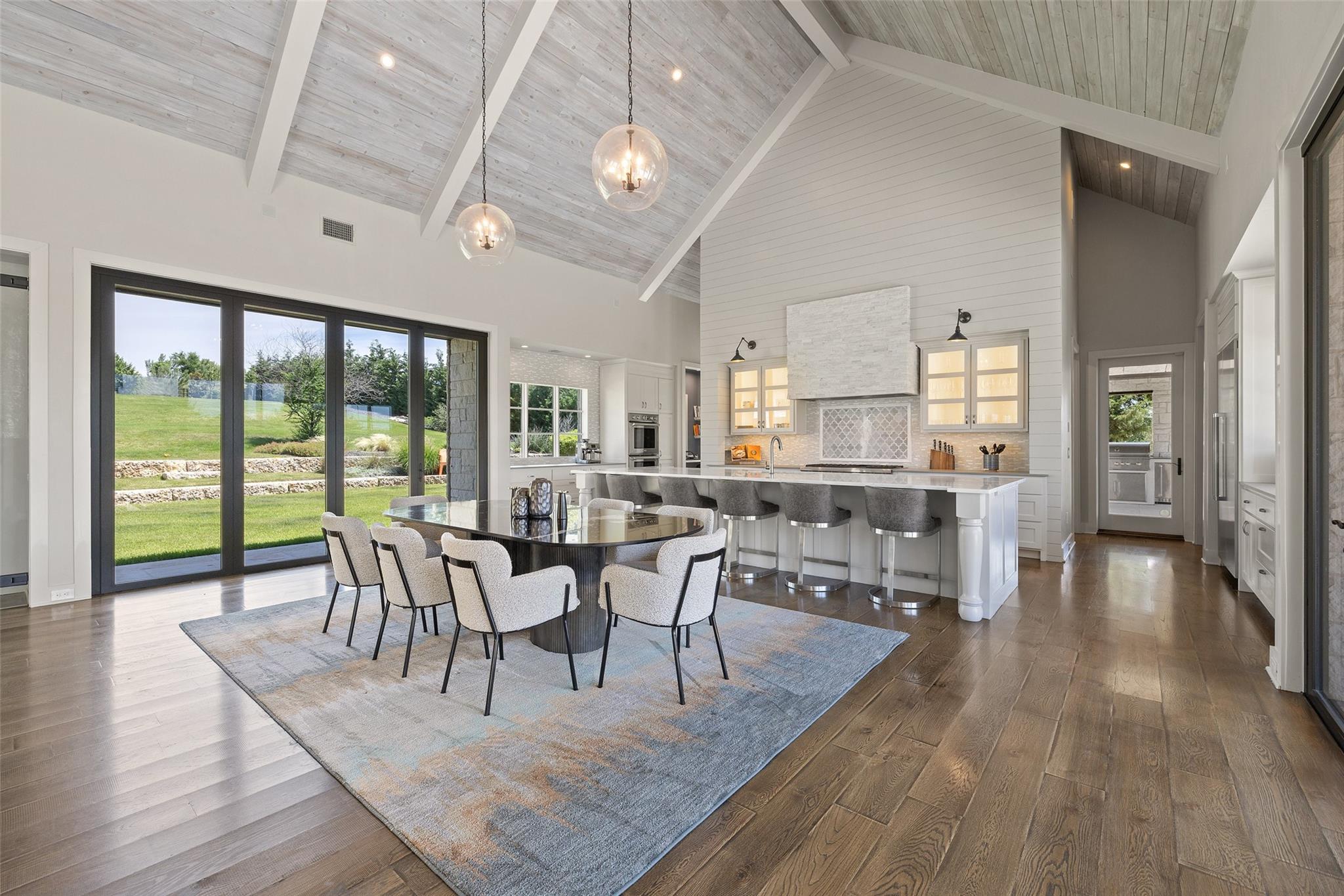 Located in the prestigious Peninsula at Rough Hollow, this modern farmhouse is located on a lush 1.176 acre lot. This one story home is the epitome of indoor/outdoor living at its finest. Upon entering the private courtyard through oversized barn doors, you have the main house on the right and guest house on the left. The show stopping entrance to the main house captivates you with floor to ceiling windows and inviting fireplace. Your spacious great room, dining room and kitchen area feature soaring vaulted ceilings, multiple built in wet bar areas, wine room & more. The chef's kitchen features an oversized center island, state of the art appliances and walk in pantry. Open the accordion glass doors to enjoy a back yard oasis featuring multiple lounge areas, negative edge pool & spa, covered outdoor kitchen with fireplace and oversized yard that can easily fit a pickle ball court, putting green or basketball court - truly an entertainers dream. Overlooking the beautiful back yard is a glass office with floor to ceiling glass and hill country views. The spacious primary suite features a unique day bed and storage spanning the back wall. Natural light fills the primary ensuite with his & her sinks, claw foot tub and large seamless glass shower with outdoor access. Through the ensuite you will find a large custom closet and laundry room. The detached casita features a full bathroom, perfect for a mother-in-law suite, au pair, home office or gym. The modern floor to ceiling windows combined with the natural Texas stone create this beautiful private retreat in the Hill Country and is just 45 minutes to Downtown Austin & ABIA. Spanning 3 miles of Lake Travis shoreline you can enjoy all of the Rough Hollow amenities including 22 miles of hiking/biking trails, access to the Yacht Club & Marina, state of the art fitness & community center. To read more about Rough Hollow amenities visit: https://roughhollowlakeway.com/amenities/.