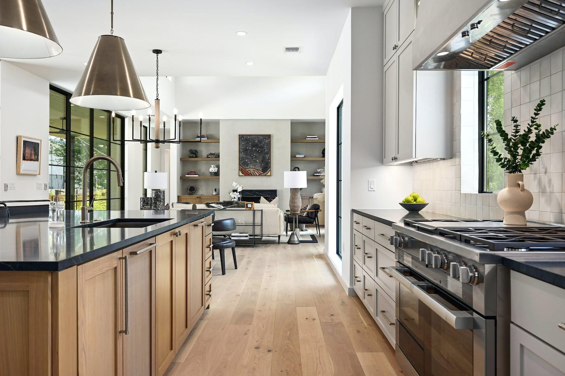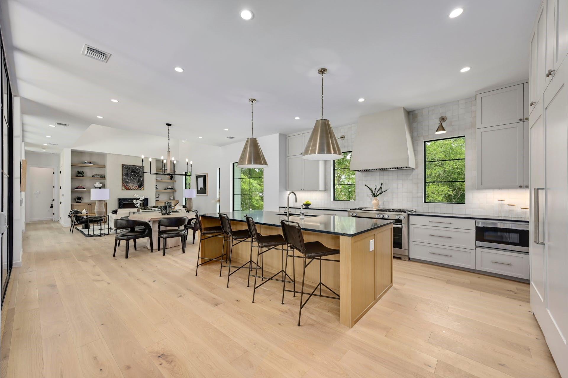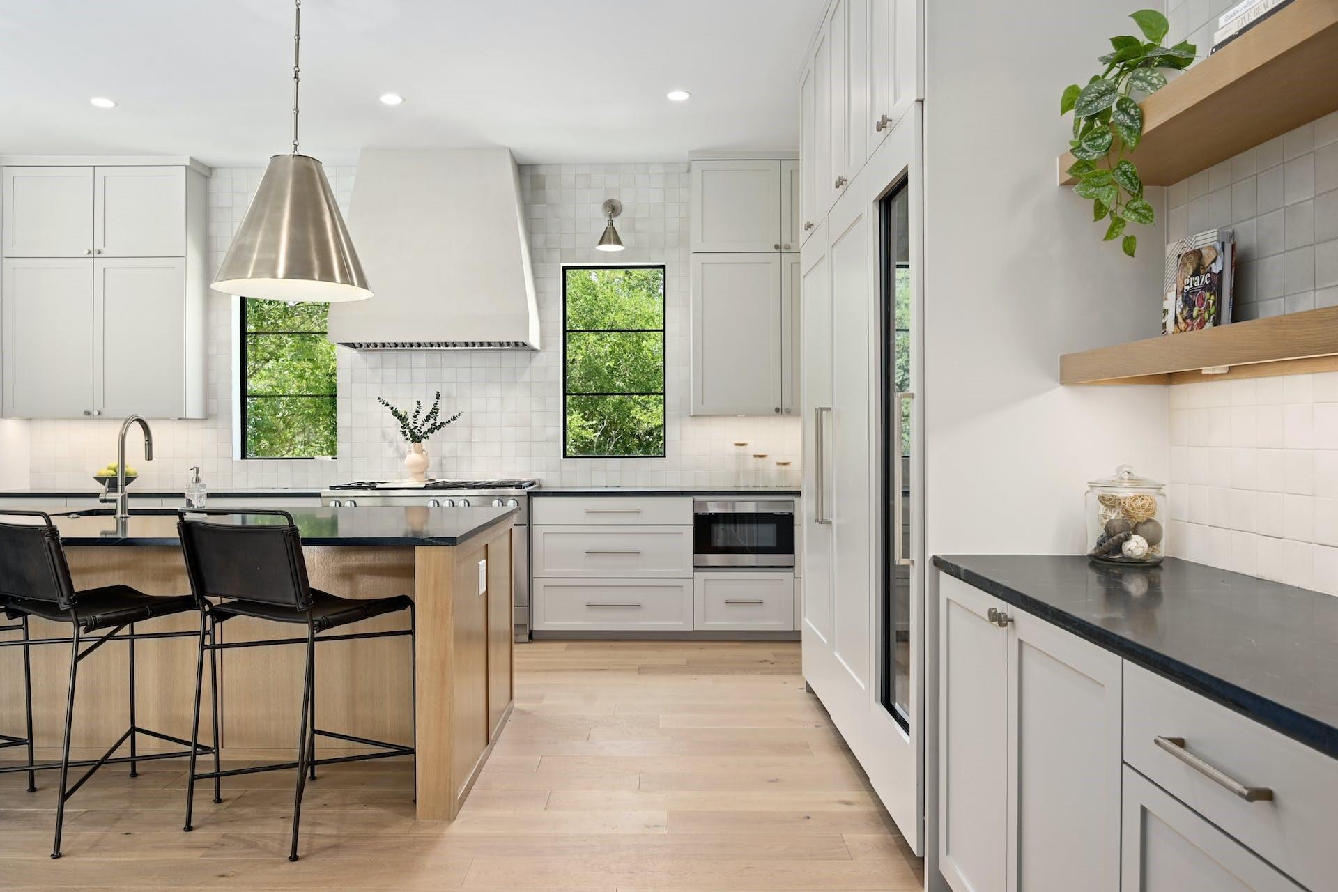 Experience refined, modern luxury with the warmth of traditional interiors in this new home by renowned builder, Moazami Homes. *6.5% fixed rate available. The exterior of the residence is comprised of locally sourced limestone with a custom slurry that extends into the foyer with a tongue and groove ceiling. The gourmet kitchen offers Miele appliances including a 48-inch dual fuel range with steam (double ovens, 6 burners, and a griddle), a full-height wine fridge, black soapstone countertops, a 10 ft island, a microwave drawer, custom soft-close cabinetry, handmade tile backsplash, a smooth plaster hood, and a butler’s pantry. Additional high-end finishes include Marvin windows, Western sliding door systems, French oak floors, and a masonry fireplace with smooth plaster.