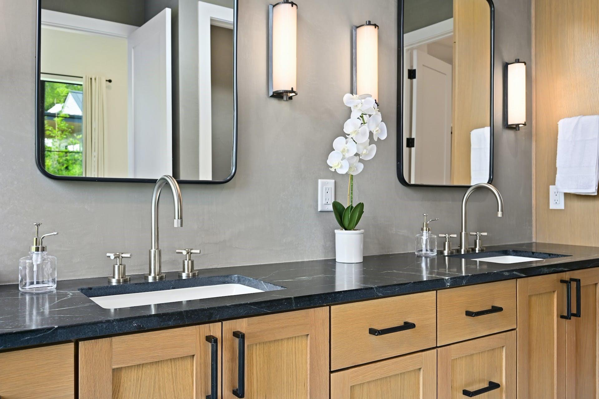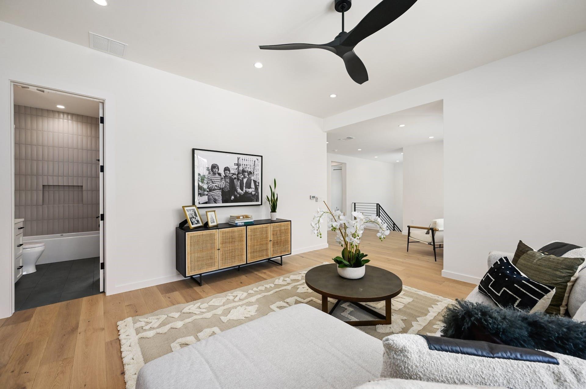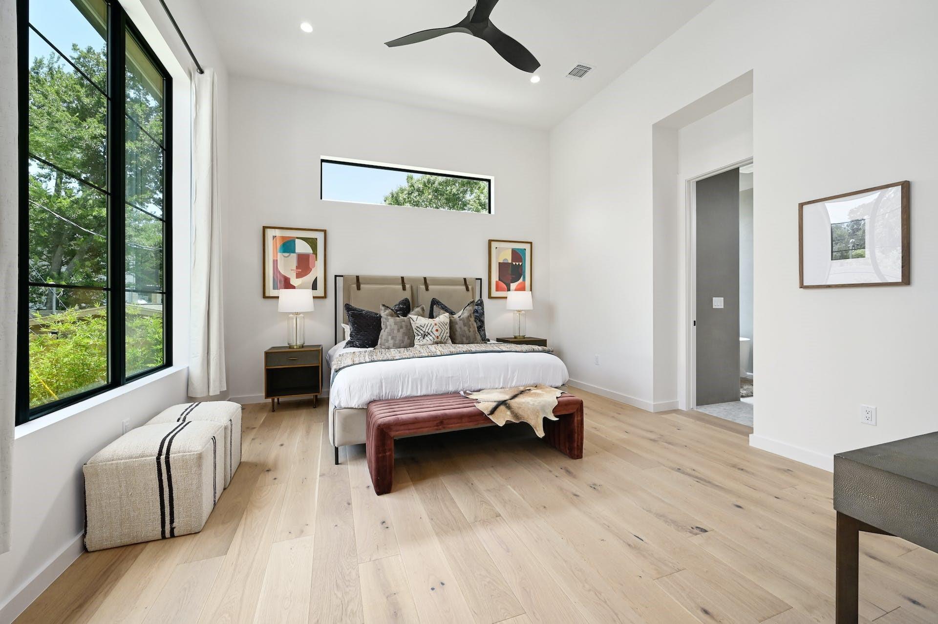 The thoughtfully designed 3900 square foot residence on a corner lot has 4 oversized bedrooms (master and guest on main), 4.5 bathrooms, a media room, two offices, a laundry, a mud room, and a library/sitting room. The owner's retreat has soaring ceilings, large windows, and a spacious walk-in closet with built-in dressers. The primary bathroom features smooth plaster walls, black soapstone countertops, marble tile floors, a soaking tub, and double vanities.