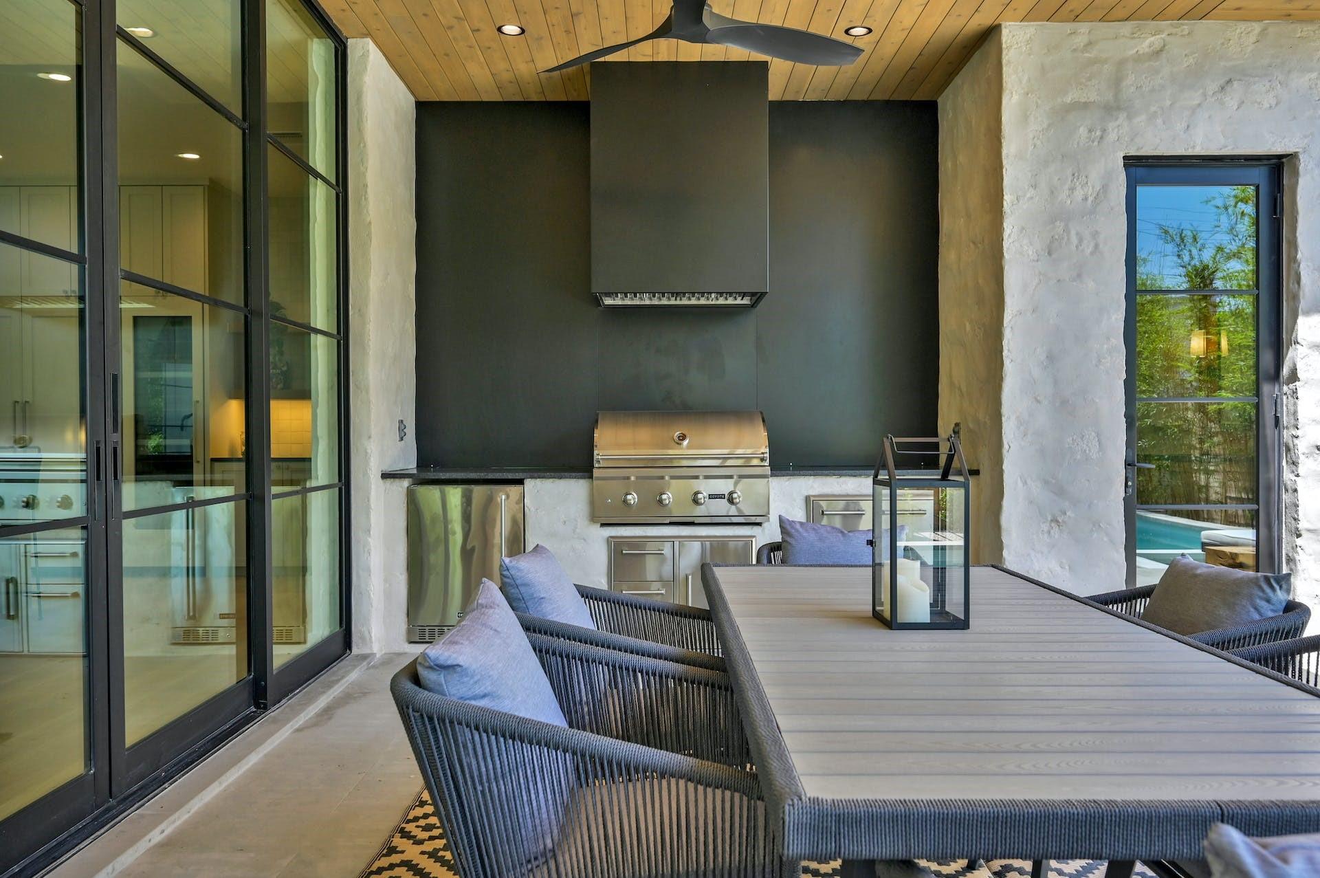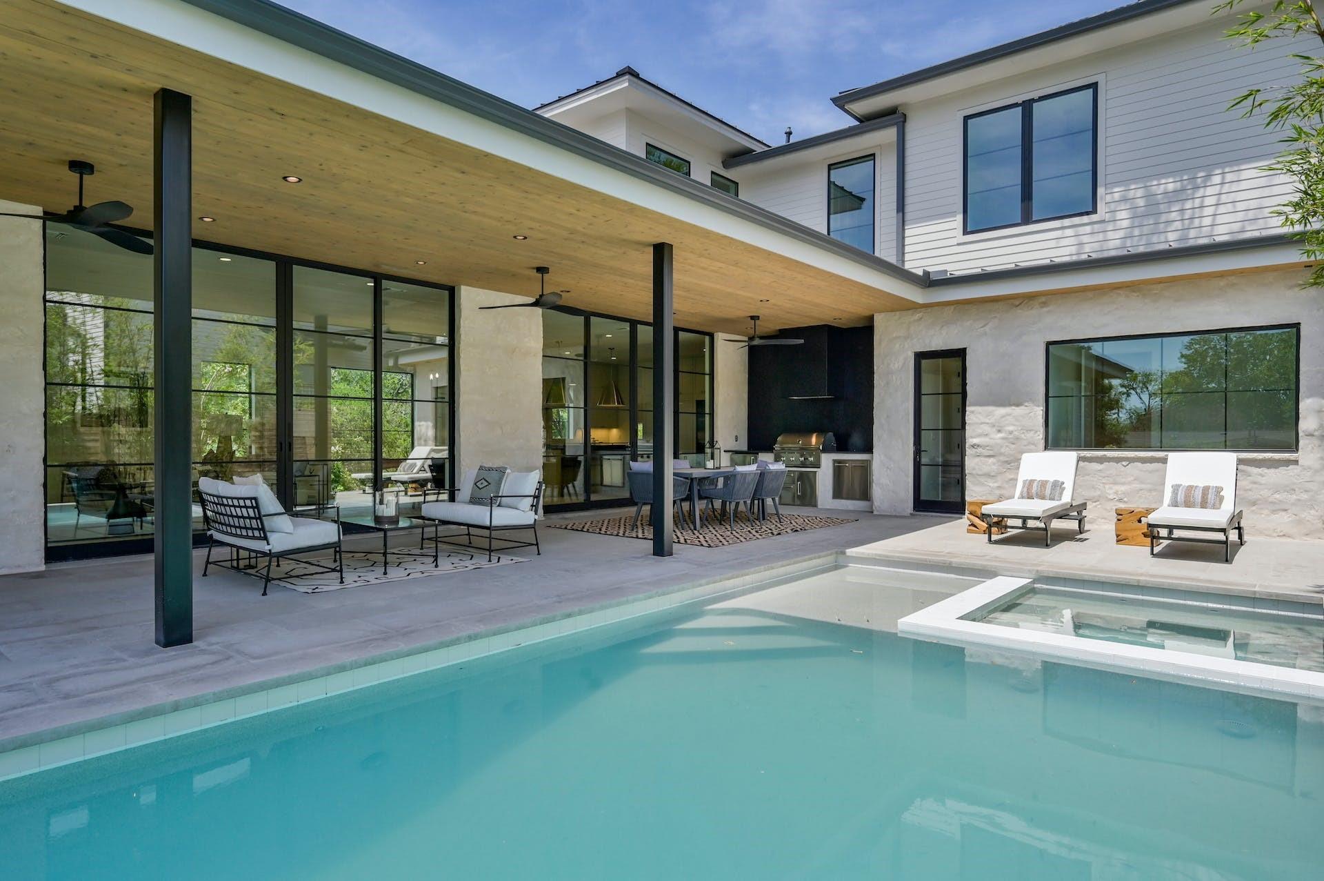 This home features an amazing outdoor experience which includes an enormous covered rear patio, custom outdoor kitchen with grill and refrigerator as well as a stunning heated pool and spa.