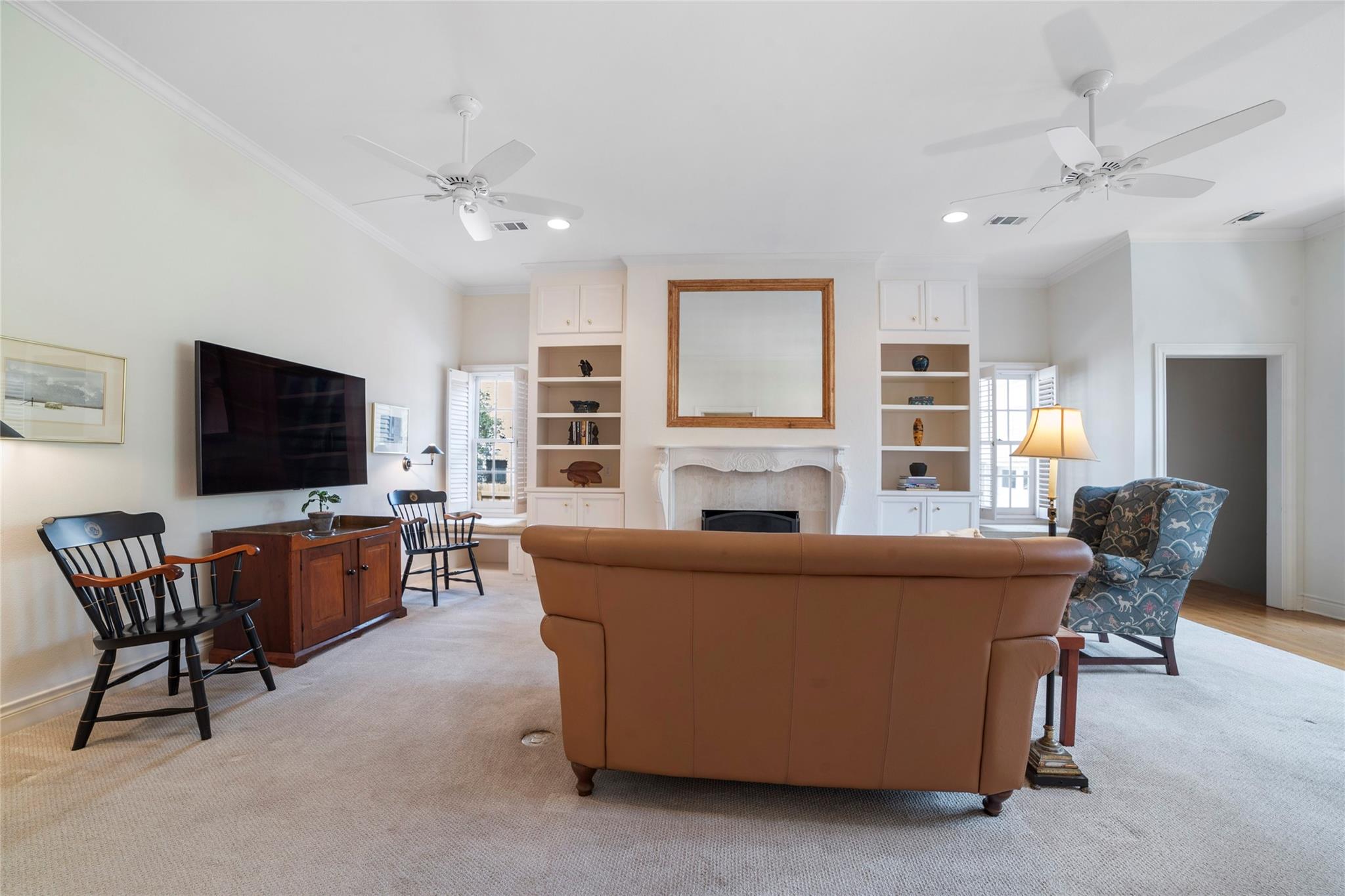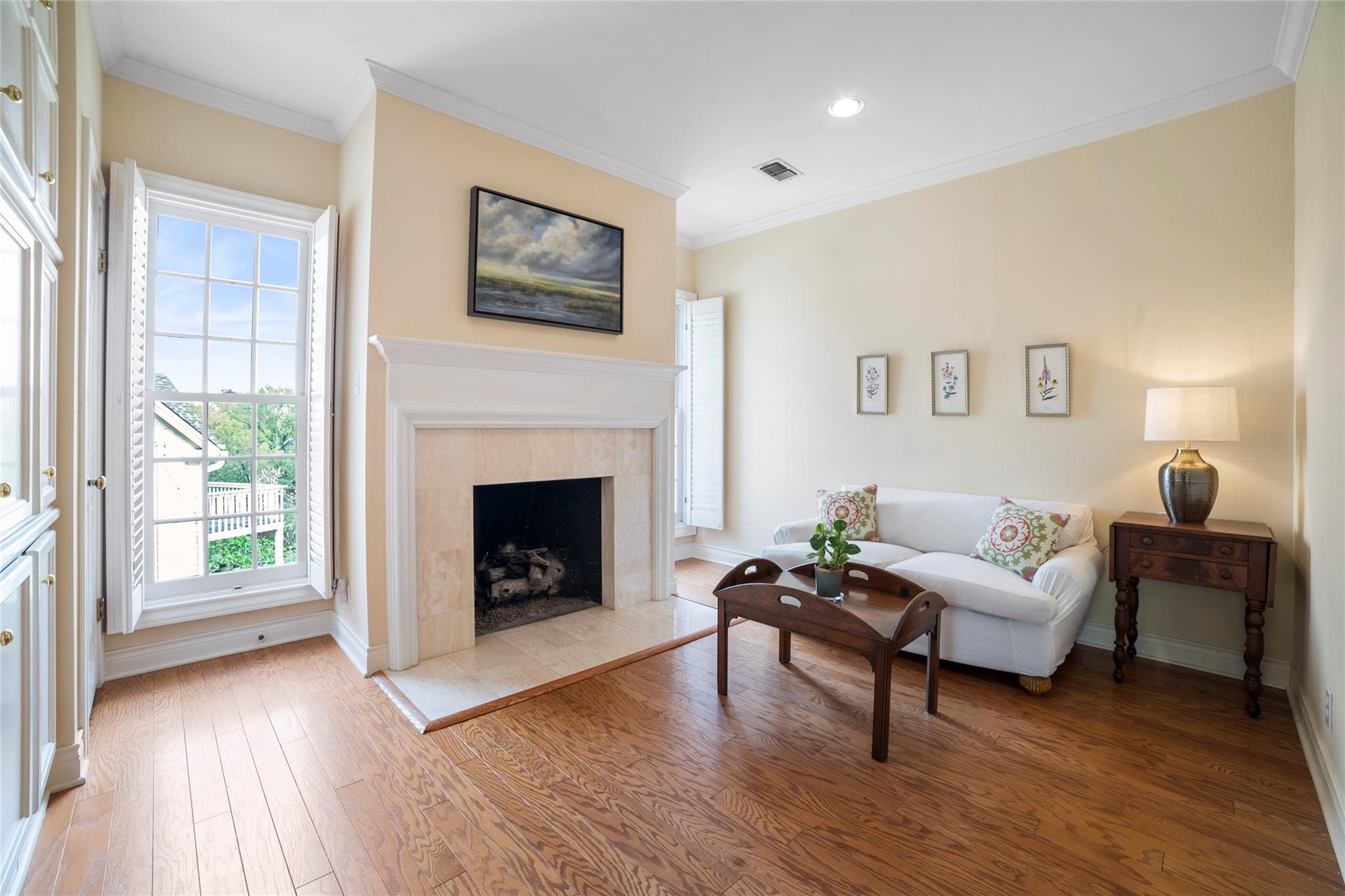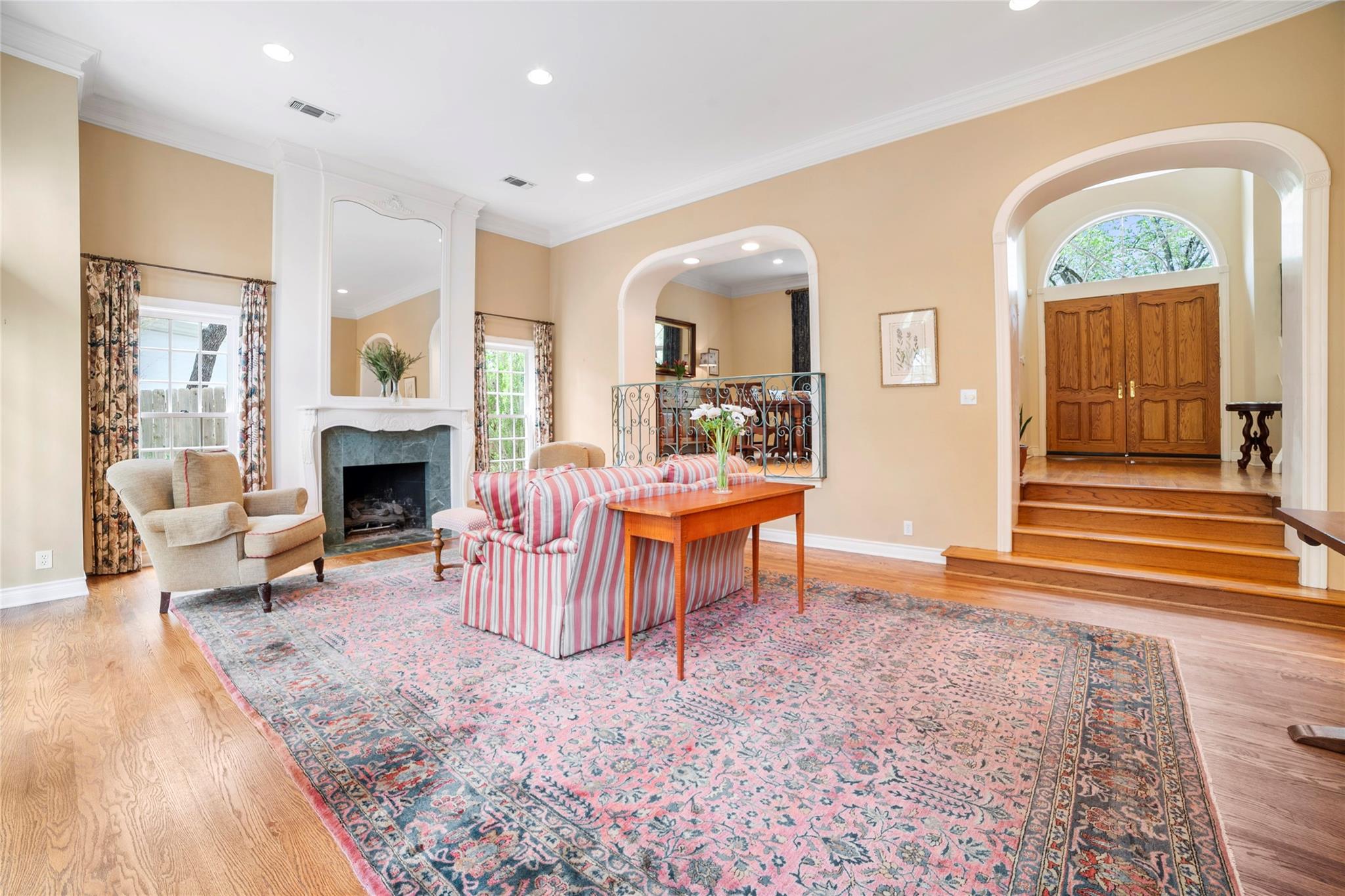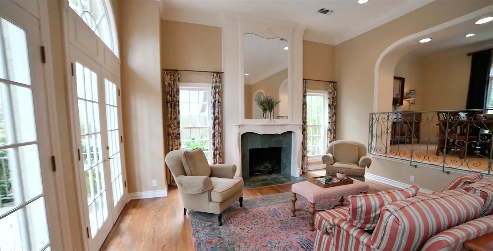 Spanning 4,081 square feet, the residence boasts three bedrooms, three full baths, two half baths, and dual living spaces, each adorned with inviting fireplaces. The thoughtful layout includes ample room for expansion, hinting at the possibility of an additional bedroom or flex room above the garage. Natural light floods the interior through expansive windows and French doors, highlighting custom details such as cased, arched doorways; hardwood floors; Plantation shutters and elegant crown molding.
