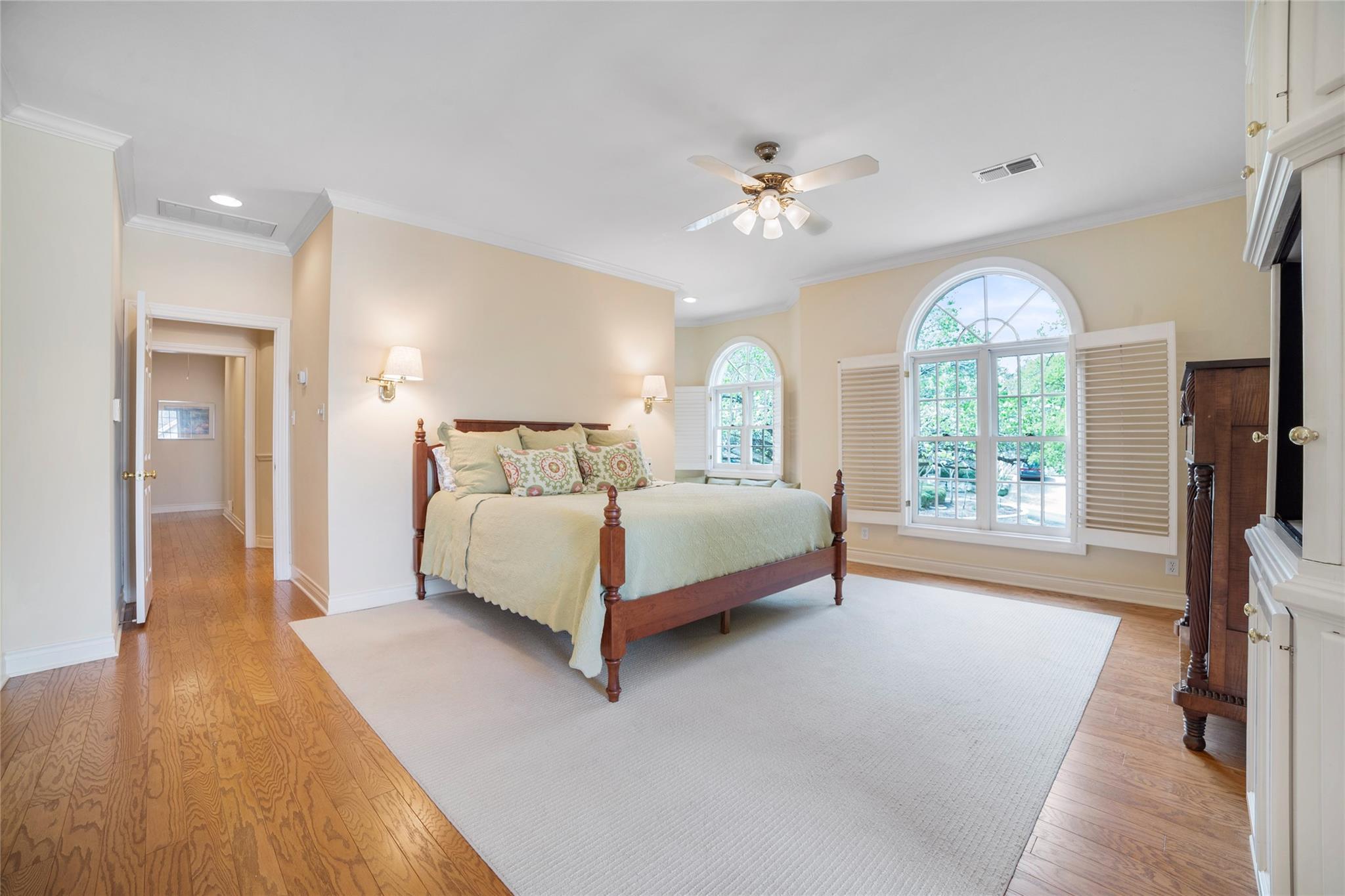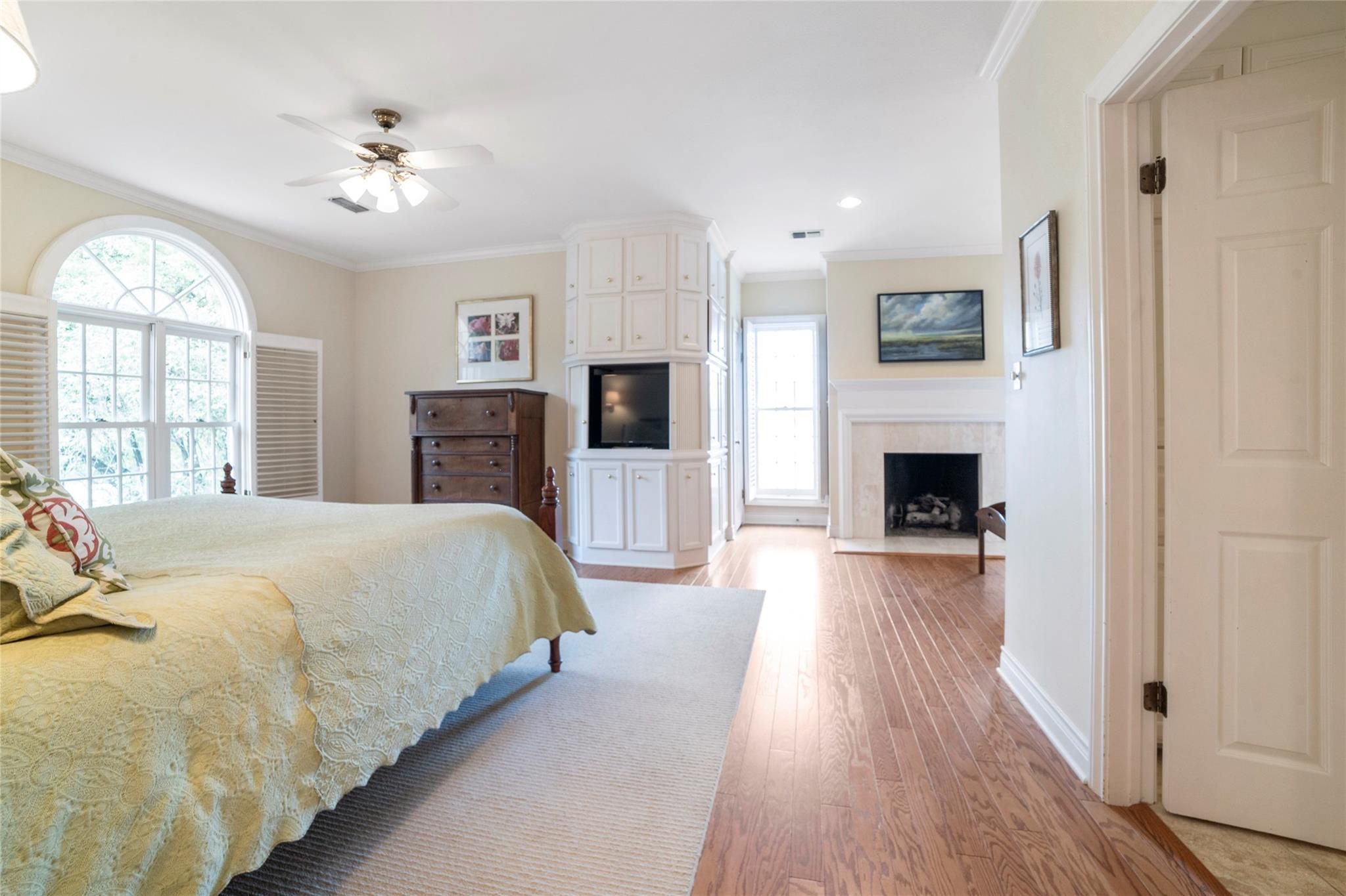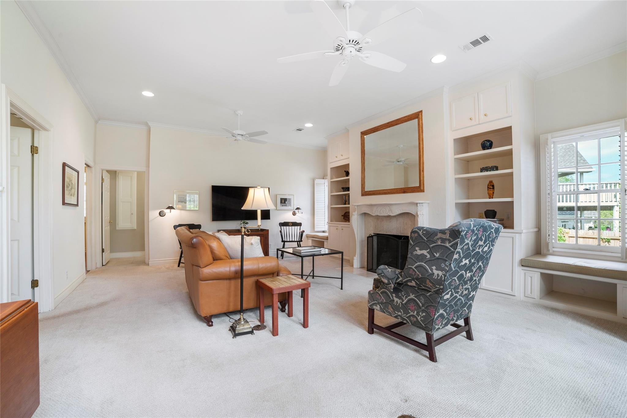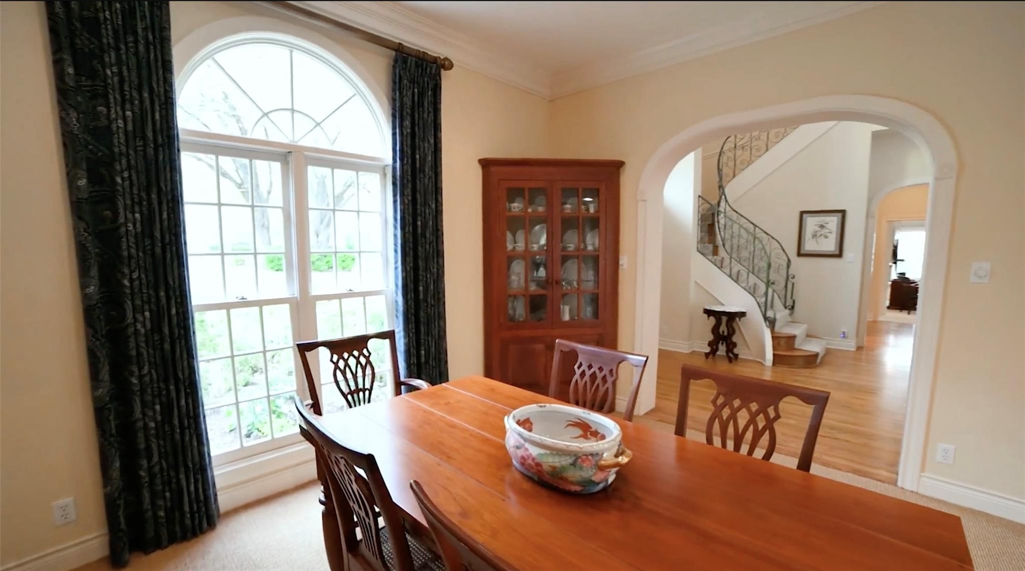 Spanning 4,081 square feet, the residence boasts three bedrooms, three full baths, two half baths, and dual living spaces, each adorned with inviting fireplaces. The thoughtful layout includes ample room for expansion, hinting at the possibility of an additional bedroom or flex room above the garage. Natural light floods the interior through expansive windows and French doors, highlighting custom details such as cased, arched doorways; hardwood floors; Plantation shutters and elegant crown molding.