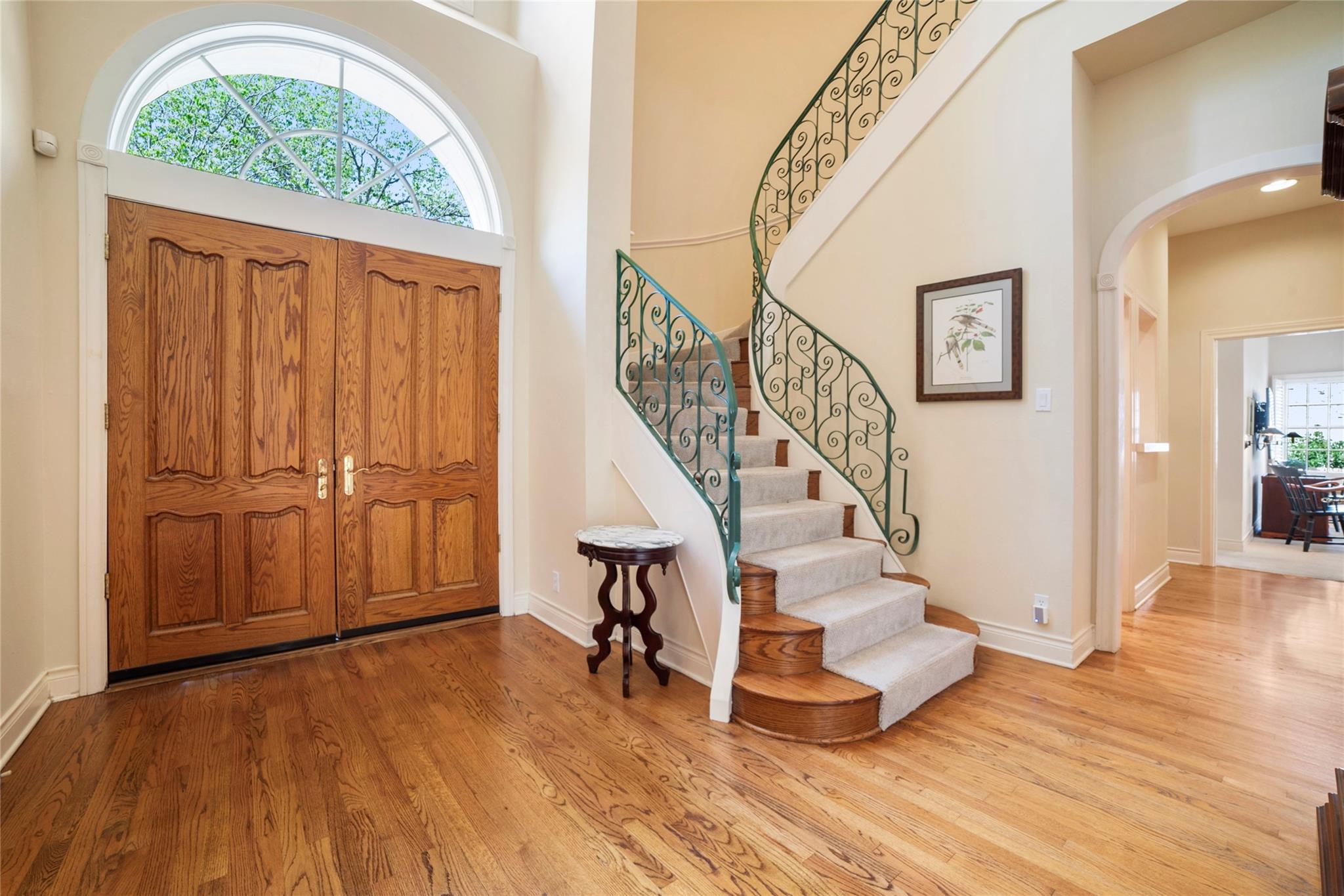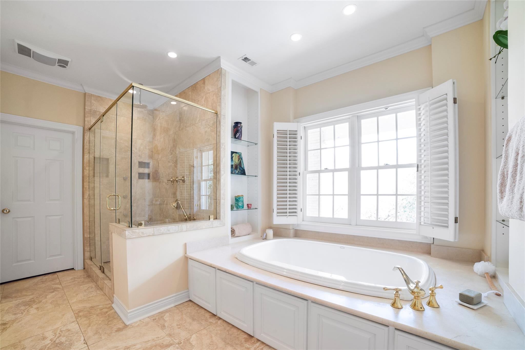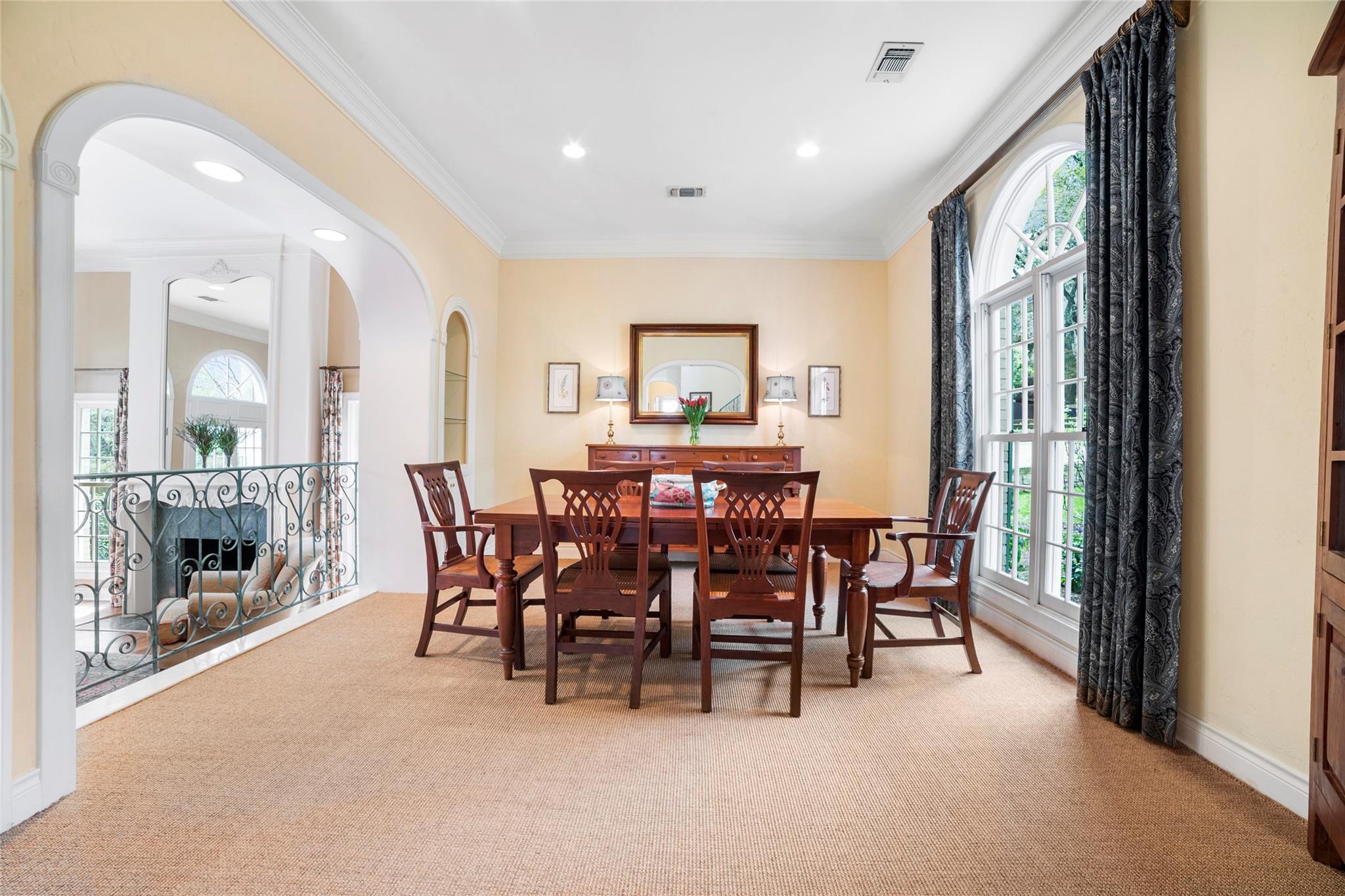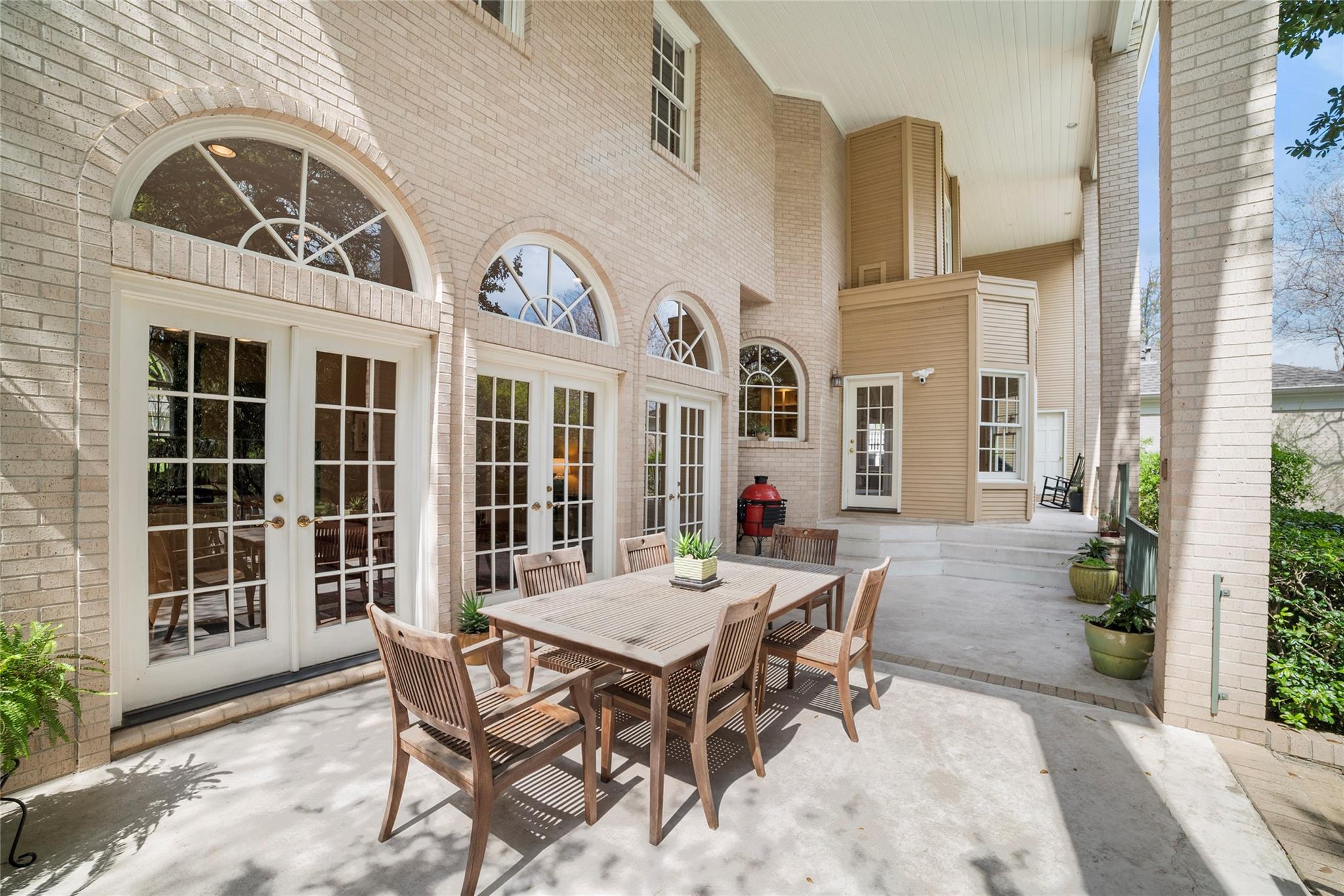 Spanning 4,081 square feet, the residence boasts three bedrooms, three full baths, two half baths, and dual living spaces, each adorned with inviting fireplaces. The thoughtful layout includes ample room for expansion, hinting at the possibility of an additional bedroom or flex room above the garage. Natural light floods the interior through expansive windows and French doors, highlighting custom details such as cased, arched doorways; hardwood floors; Plantation shutters and elegant crown molding.