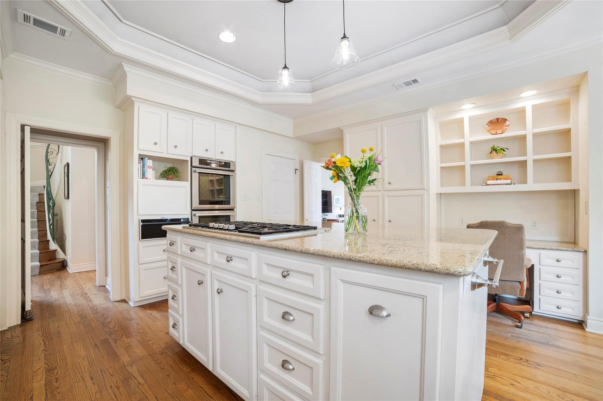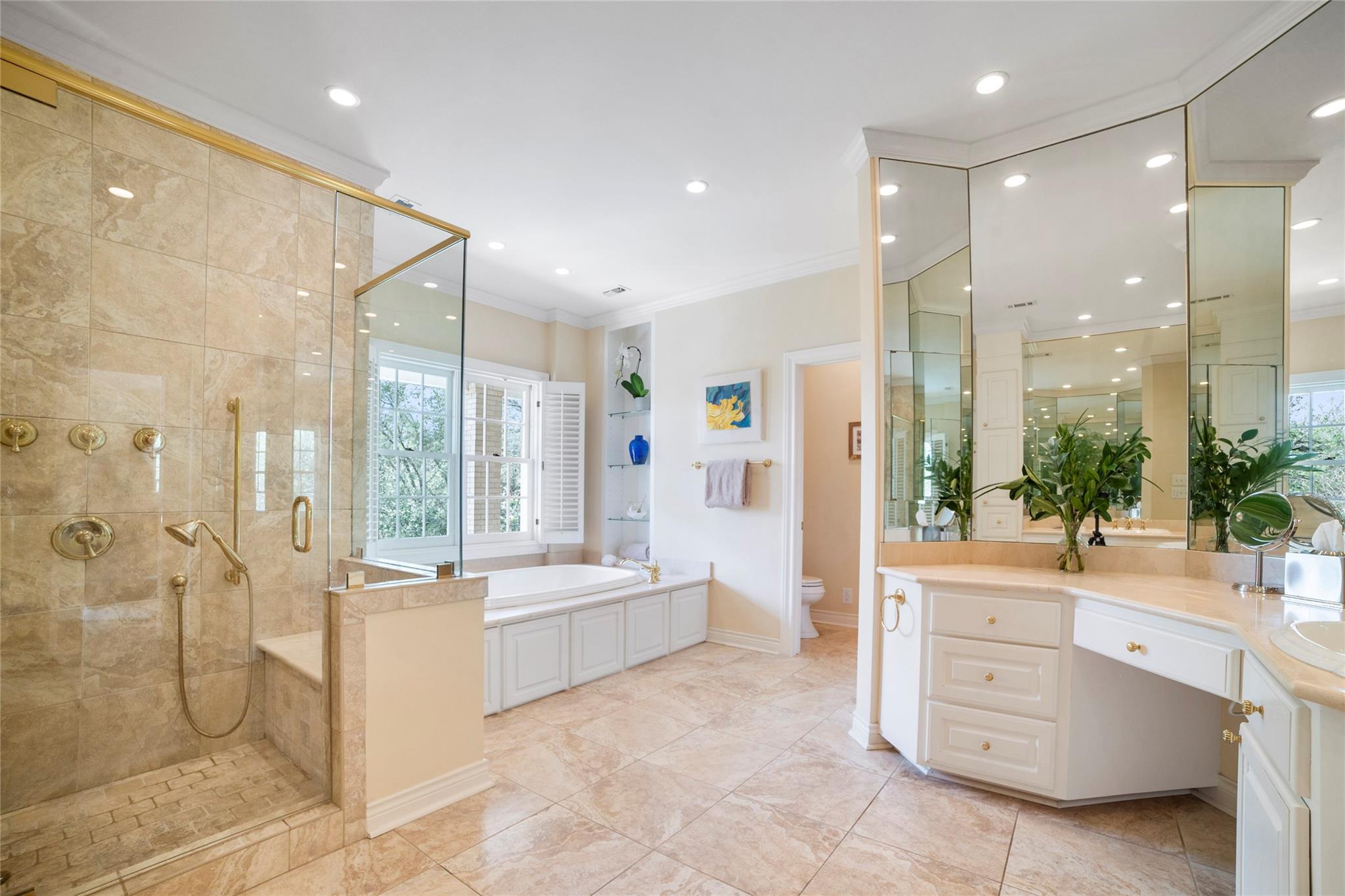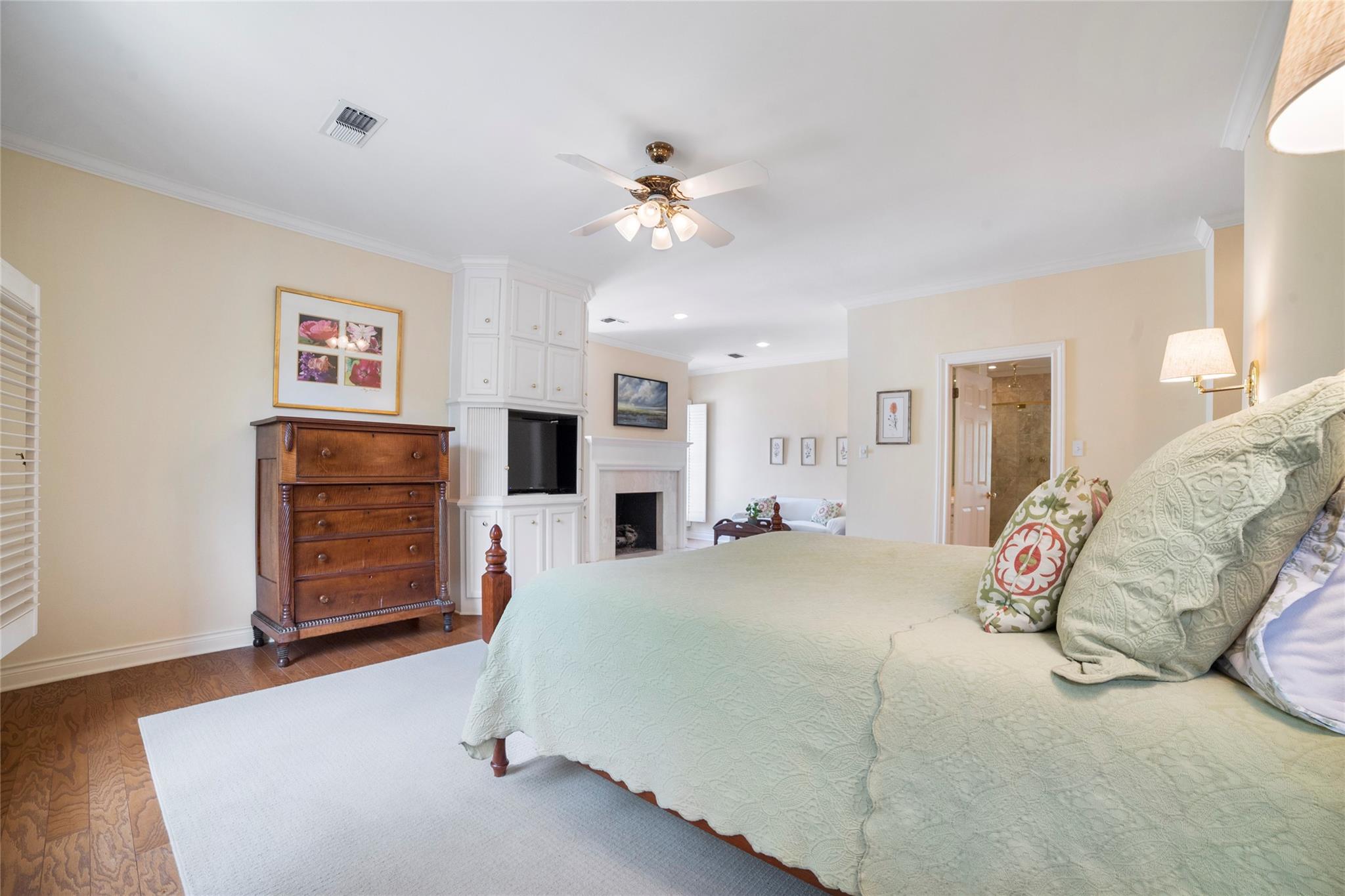 Chef’s kitchen features a large Quartz island as a focal point appealing to those who enjoy culinary pursuits as well as a 5 burner gas cooktop, double ovens, a warming drawer, cozy breakfast nook and built-in desk for keeping the home running smoothly. A well-appointed Butler's pantry/bar area bridges the kitchen dining and living areas, enhancing the home's entertainment flow. The primary suite stands as a testament to luxury and relaxation, featuring a fireplace, study, sitting area, and an opulent ensuite bathroom with a walk-in shower and soaking tub.