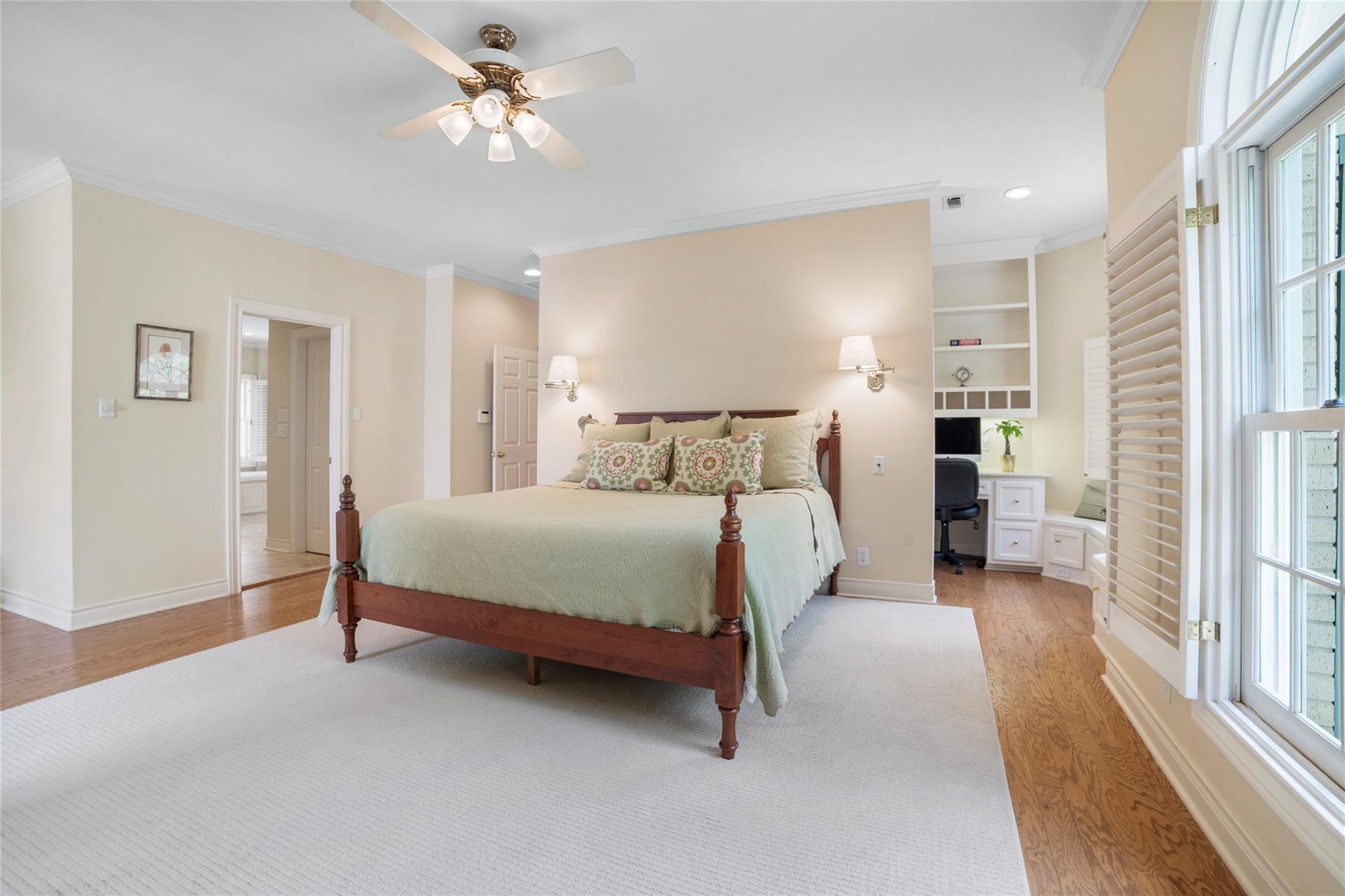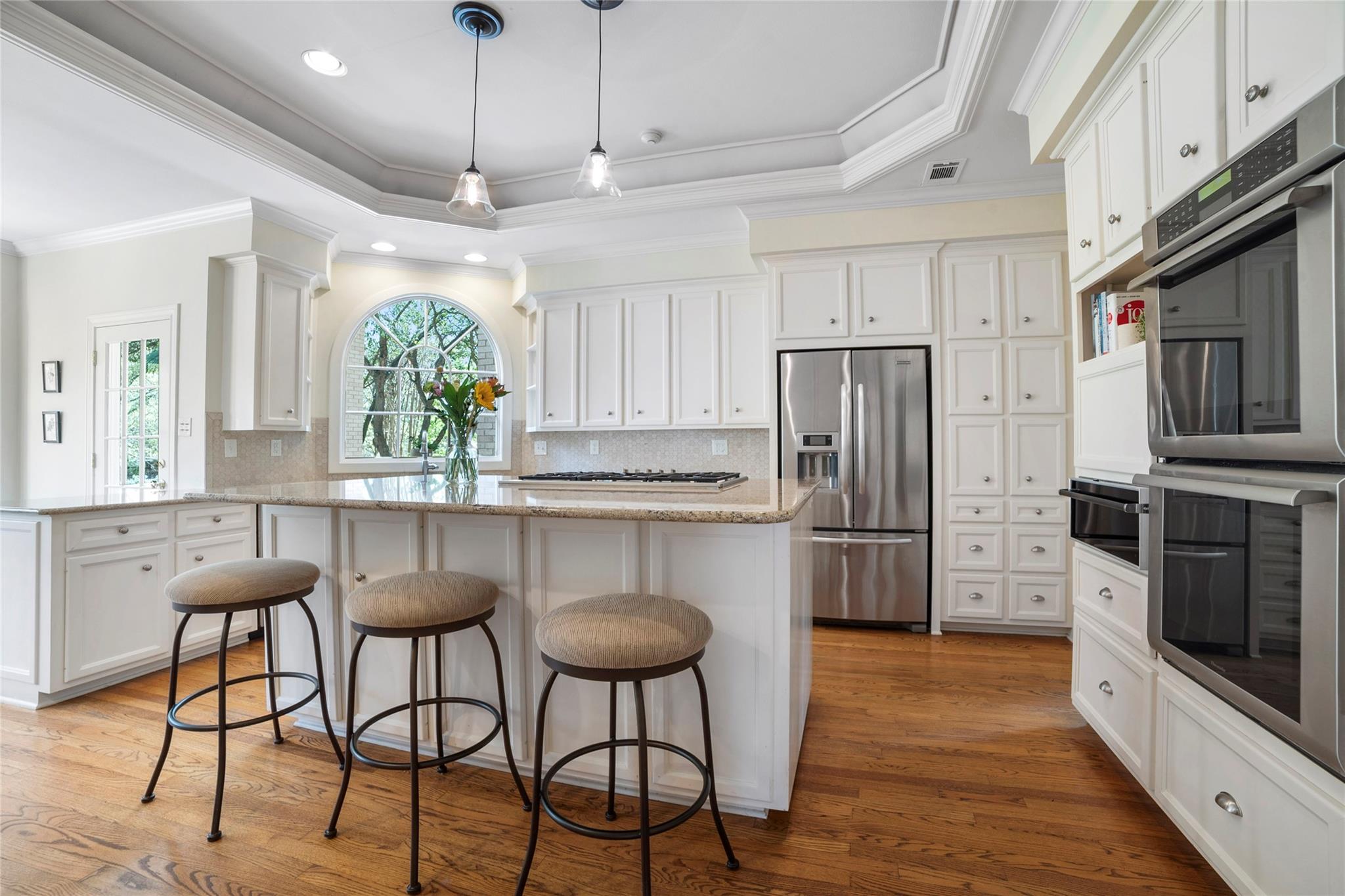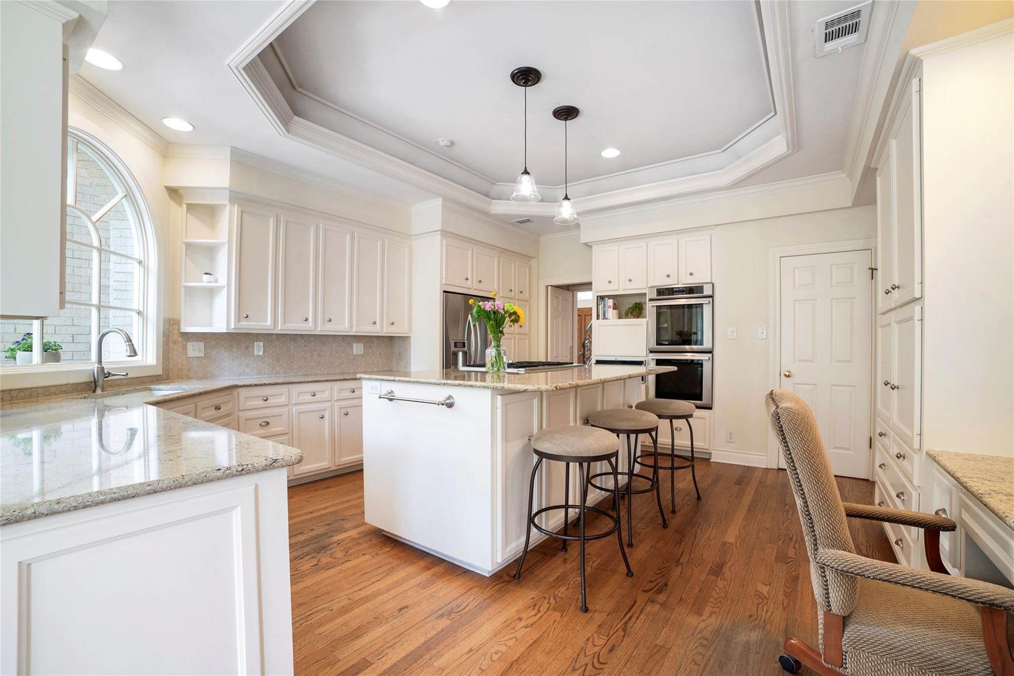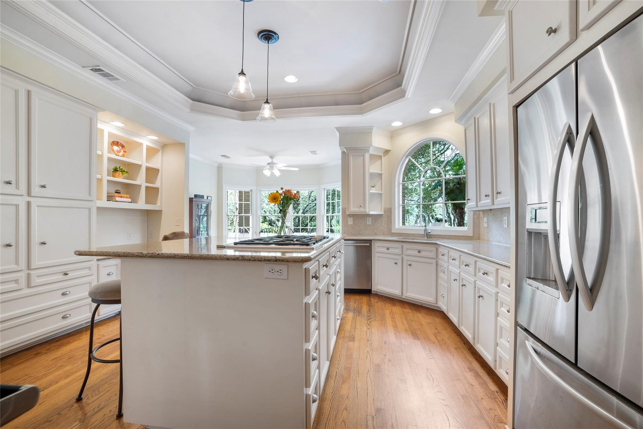 Chef’s kitchen features a large Quartz island as a focal point appealing to those who enjoy culinary pursuits as well as a 5 burner gas cooktop, double ovens, a warming drawer, cozy breakfast nook and built-in desk for keeping the home running smoothly. A well-appointed Butler's pantry/bar area bridges the kitchen dining and living areas, enhancing the home's entertainment flow. The primary suite stands as a testament to luxury and relaxation, featuring a fireplace, study, sitting area, and an opulent ensuite bathroom with a walk-in shower and soaking tub.