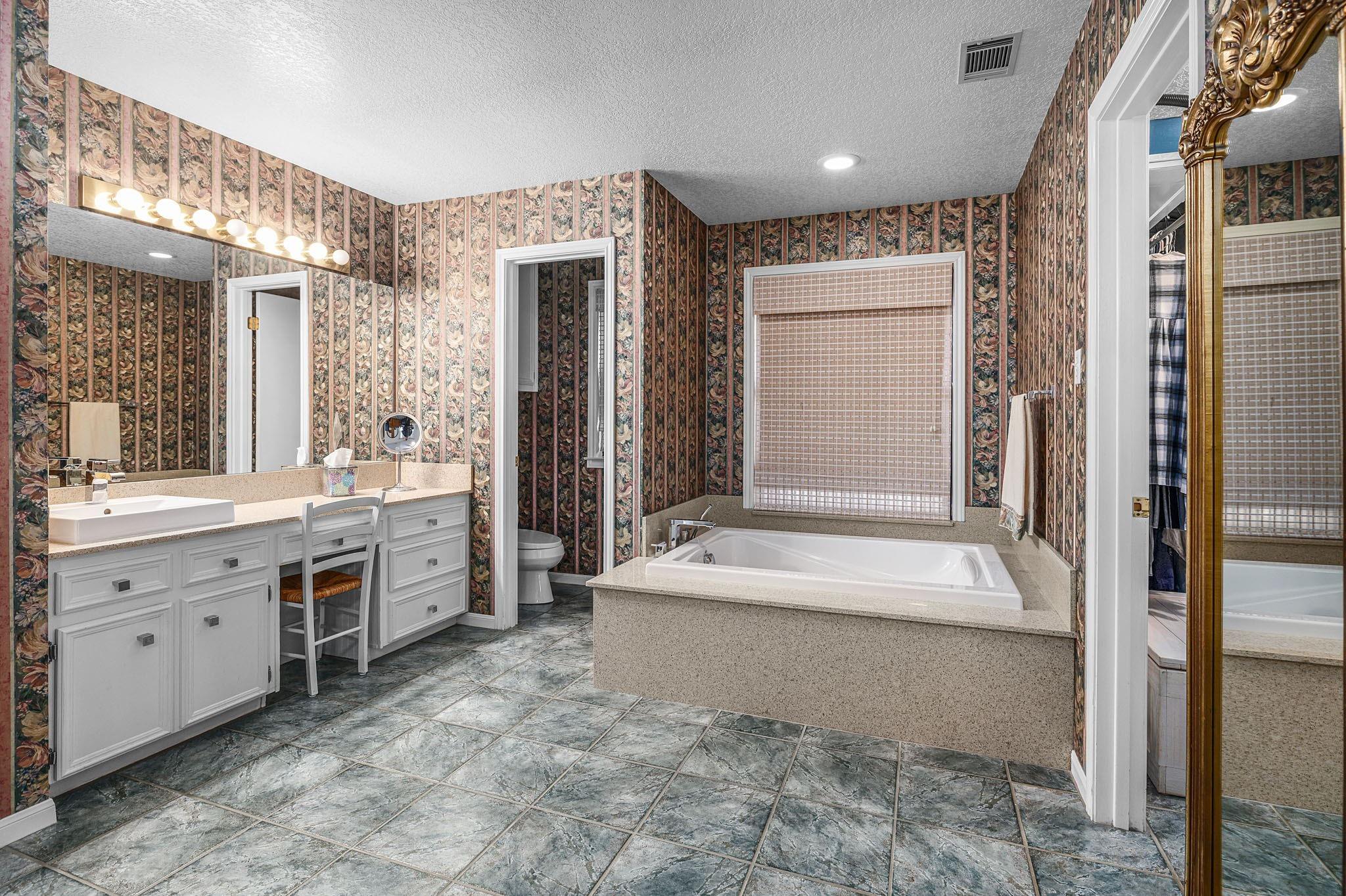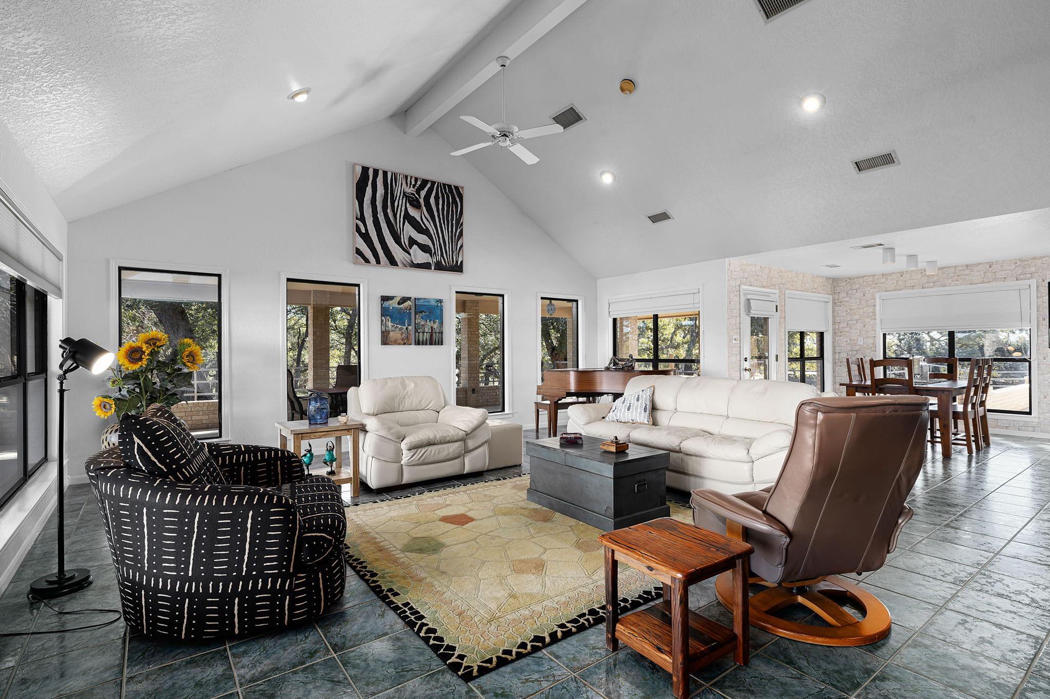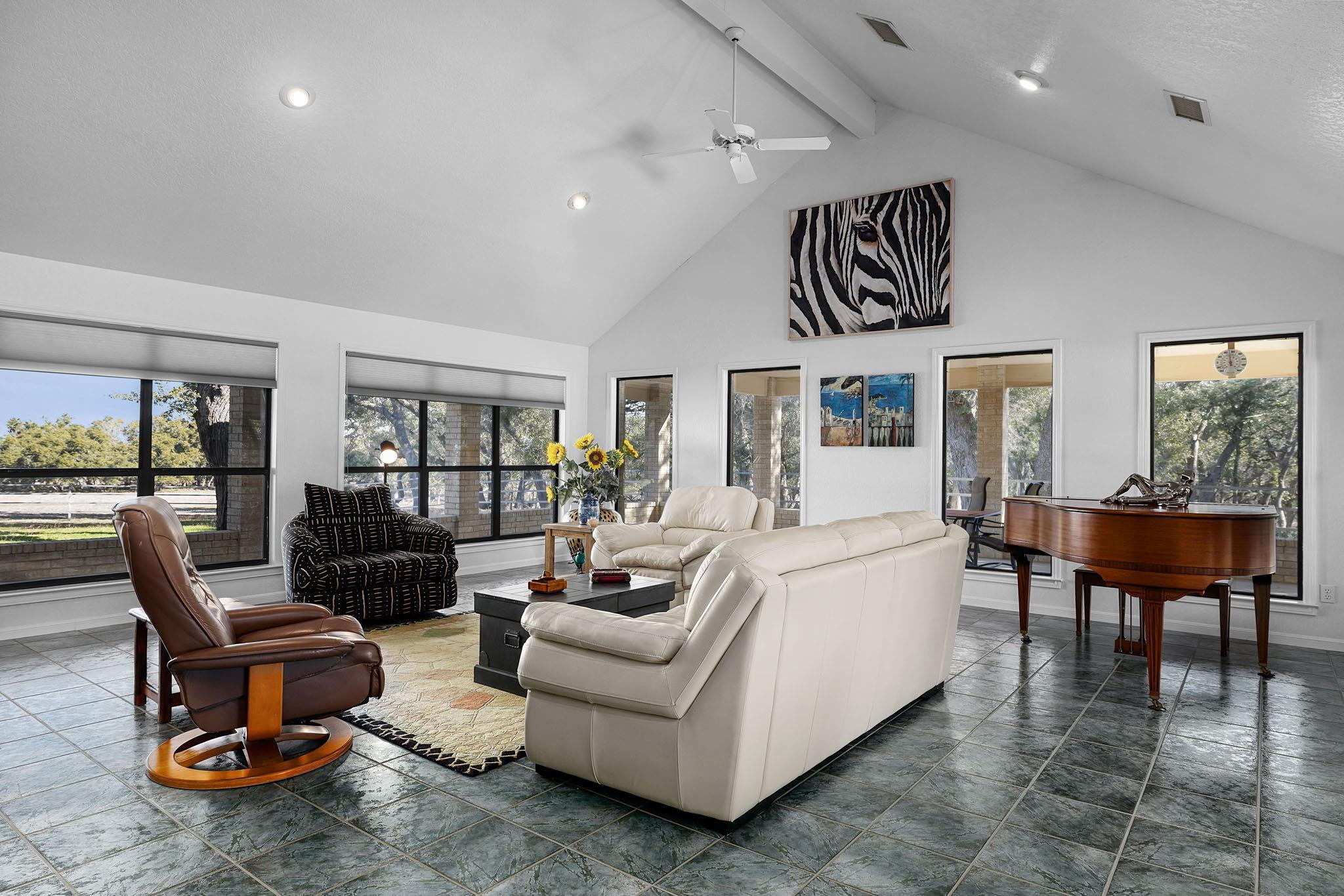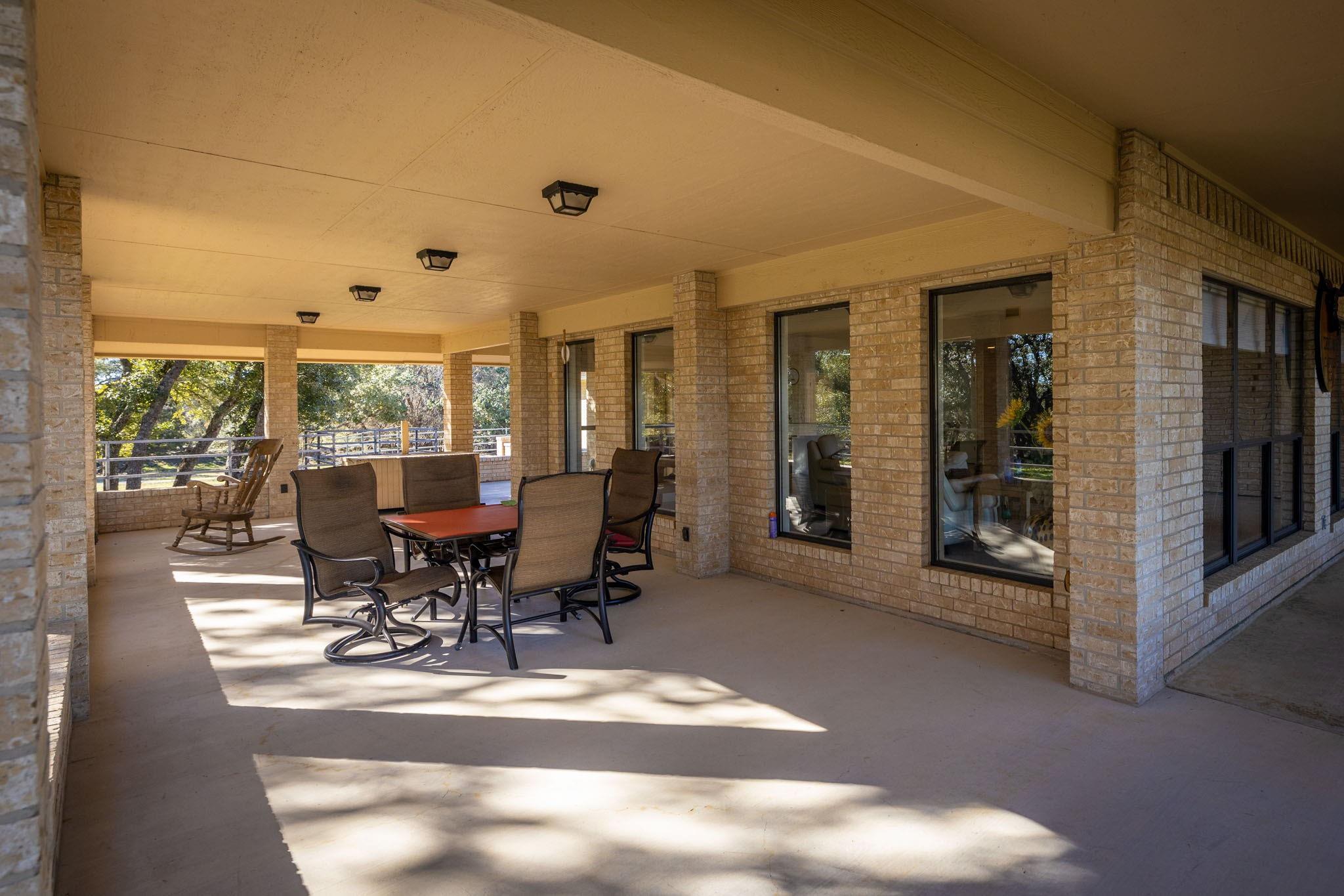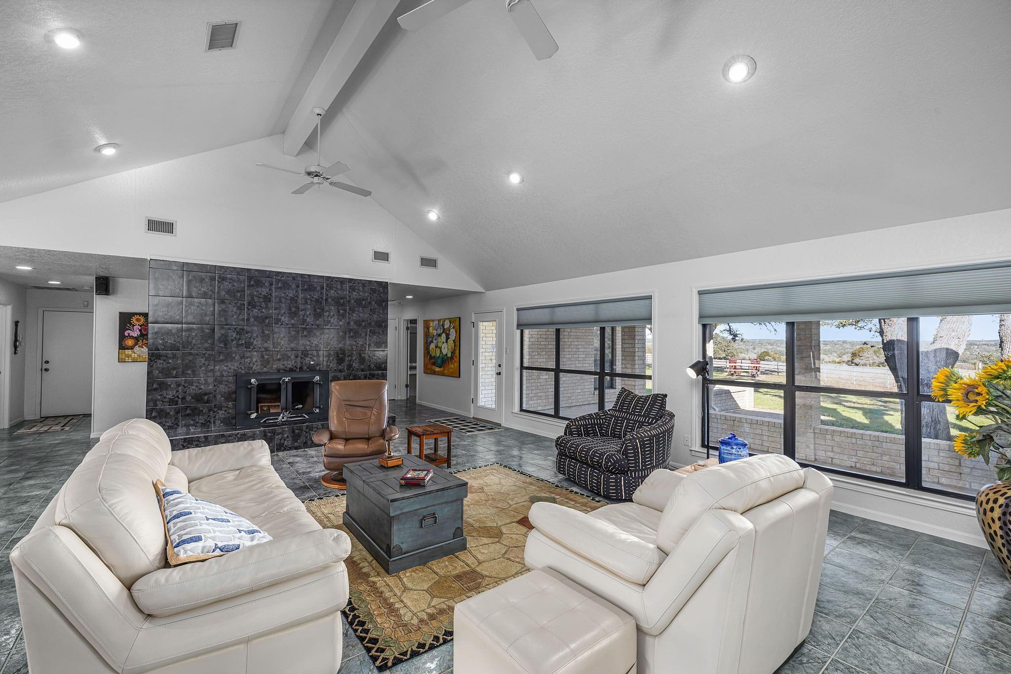 Owned by the same couple for 35 years. The pride of ownership is evident. Every detail, the personal attention, and the dedicated stewardship makes this a legacy property. Meticulously maintained land & homes. Park-like 34 acres manicured with no cactus and cleared of under brush. 2 water wells, 2 septics, 2 houses, excellent ranch fencing, stunning oaks, all weather roads throughout and hill country views from the 1110 feet elevation homesite. The main home is all brick, no carpet, all Italian tile floors, 600+/- sqft of covered porch and high ceilings. The wood burning fireplace has separate ducting to fully heat the house. The open floor plan is flooded with natural light from all the walls of windows. Additionally, there is a Satterwhite log cabin guest house with its own well and septic, full length covered porch all nestled within beautiful oaks.